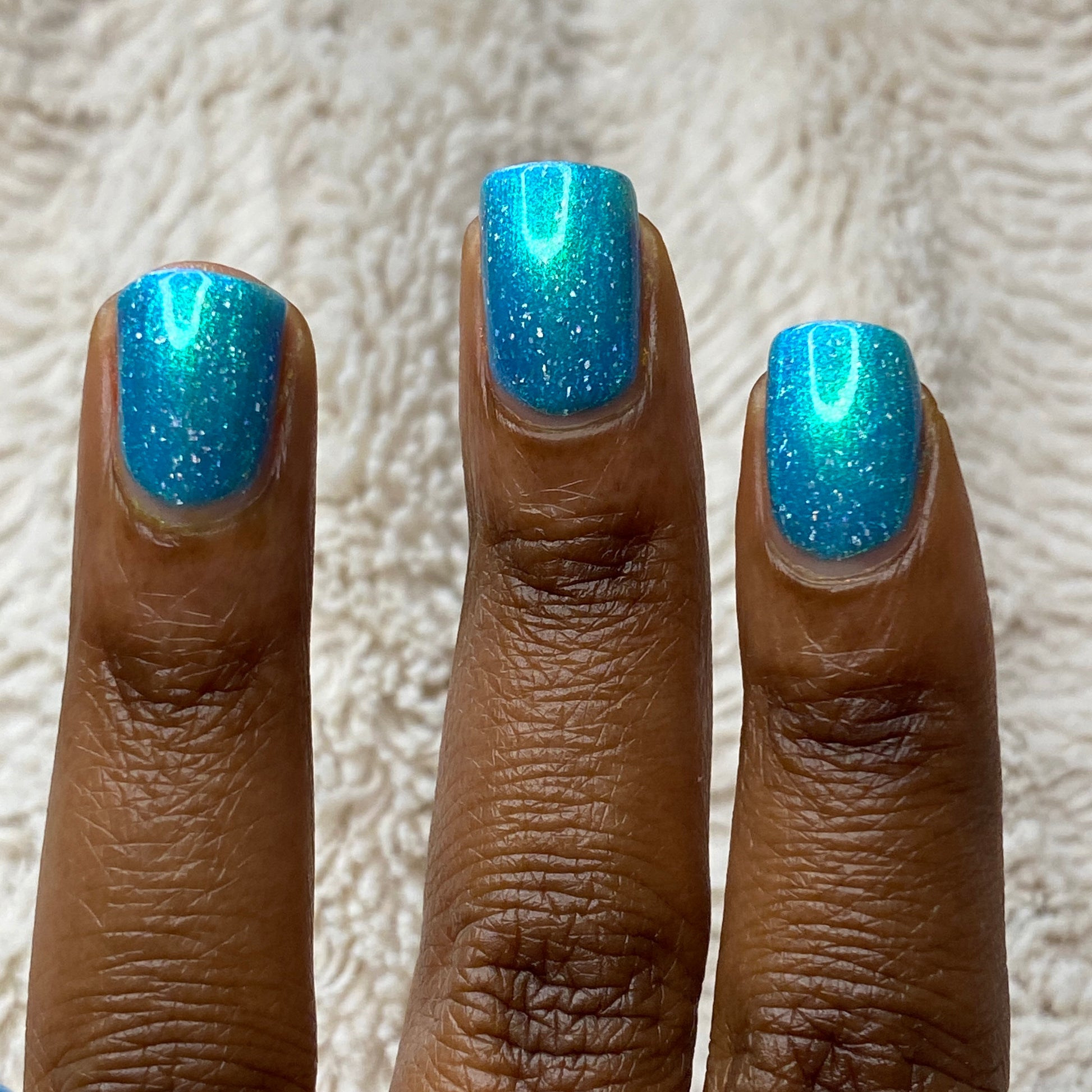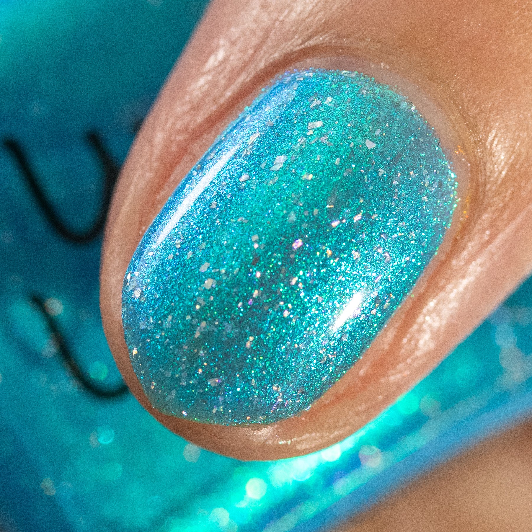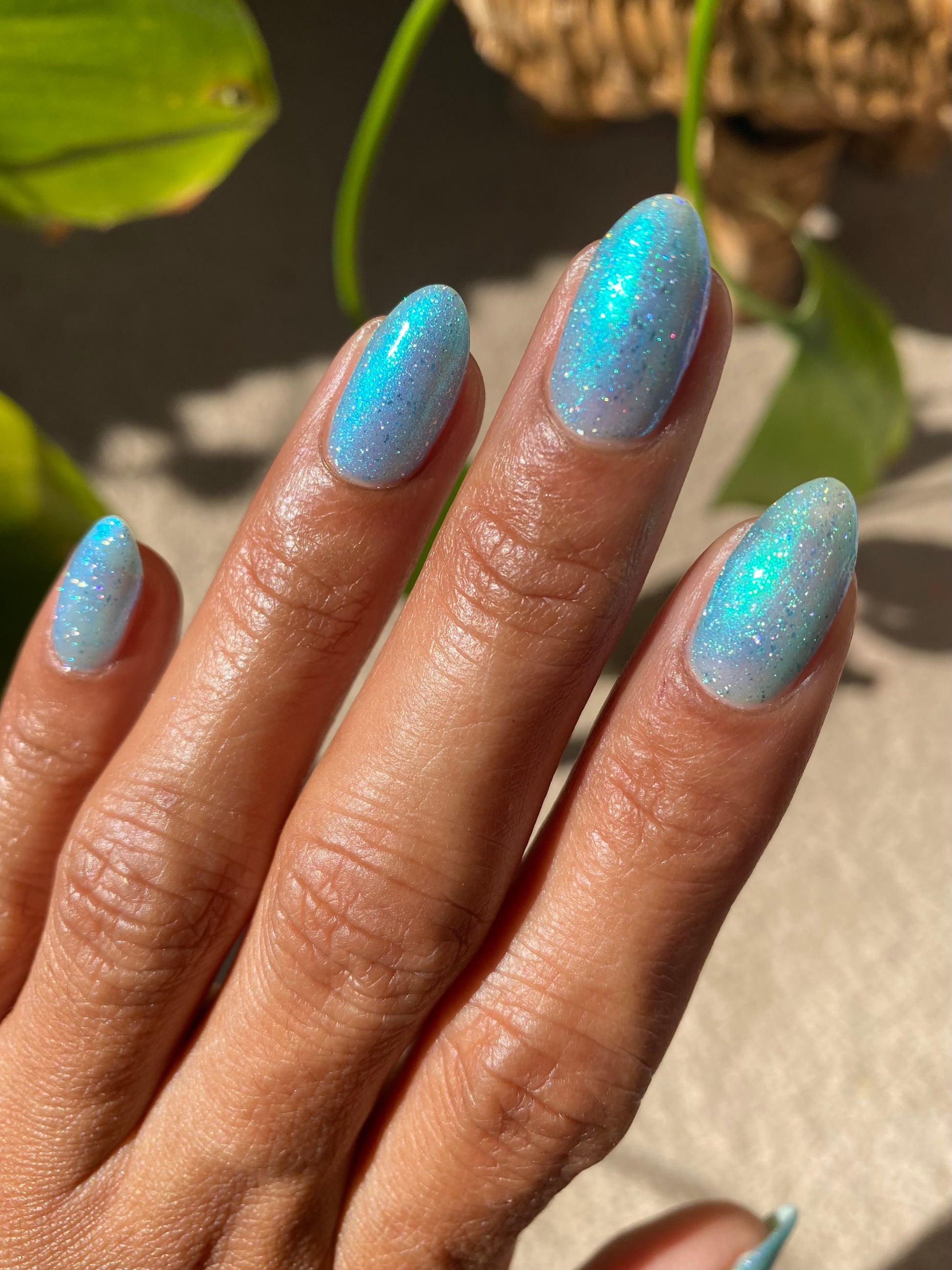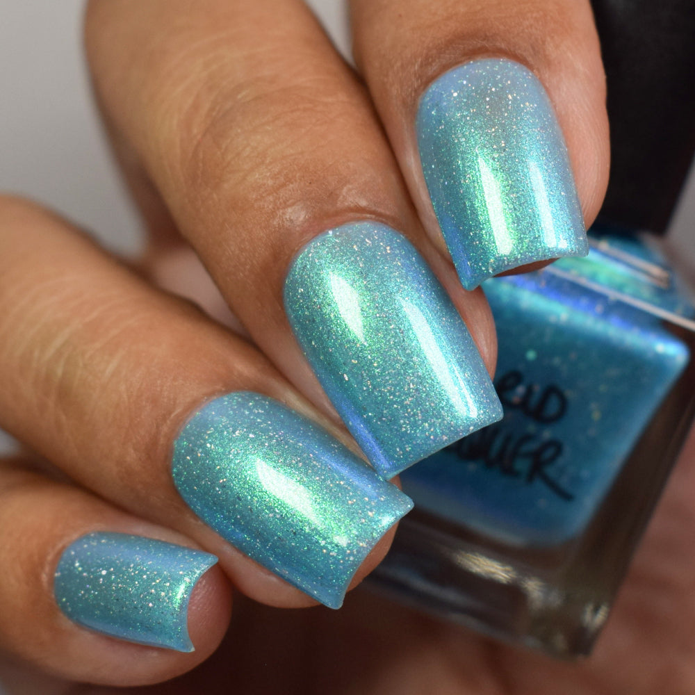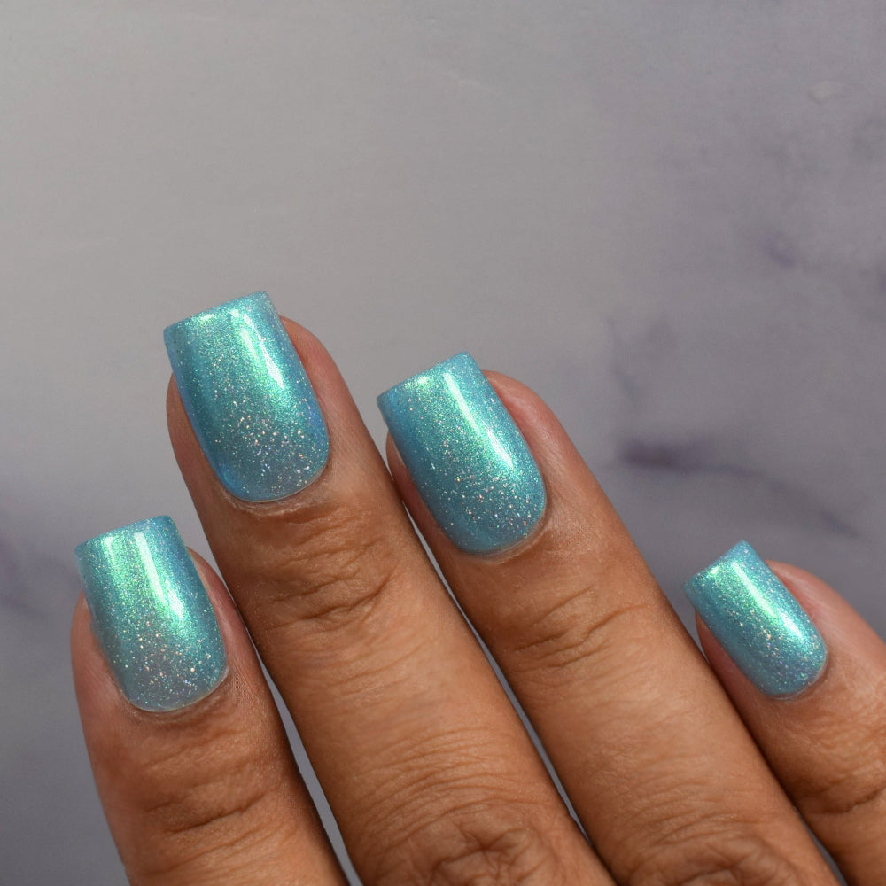 A cerulean crelly base with green to blue shimmer and micro holographic flakes