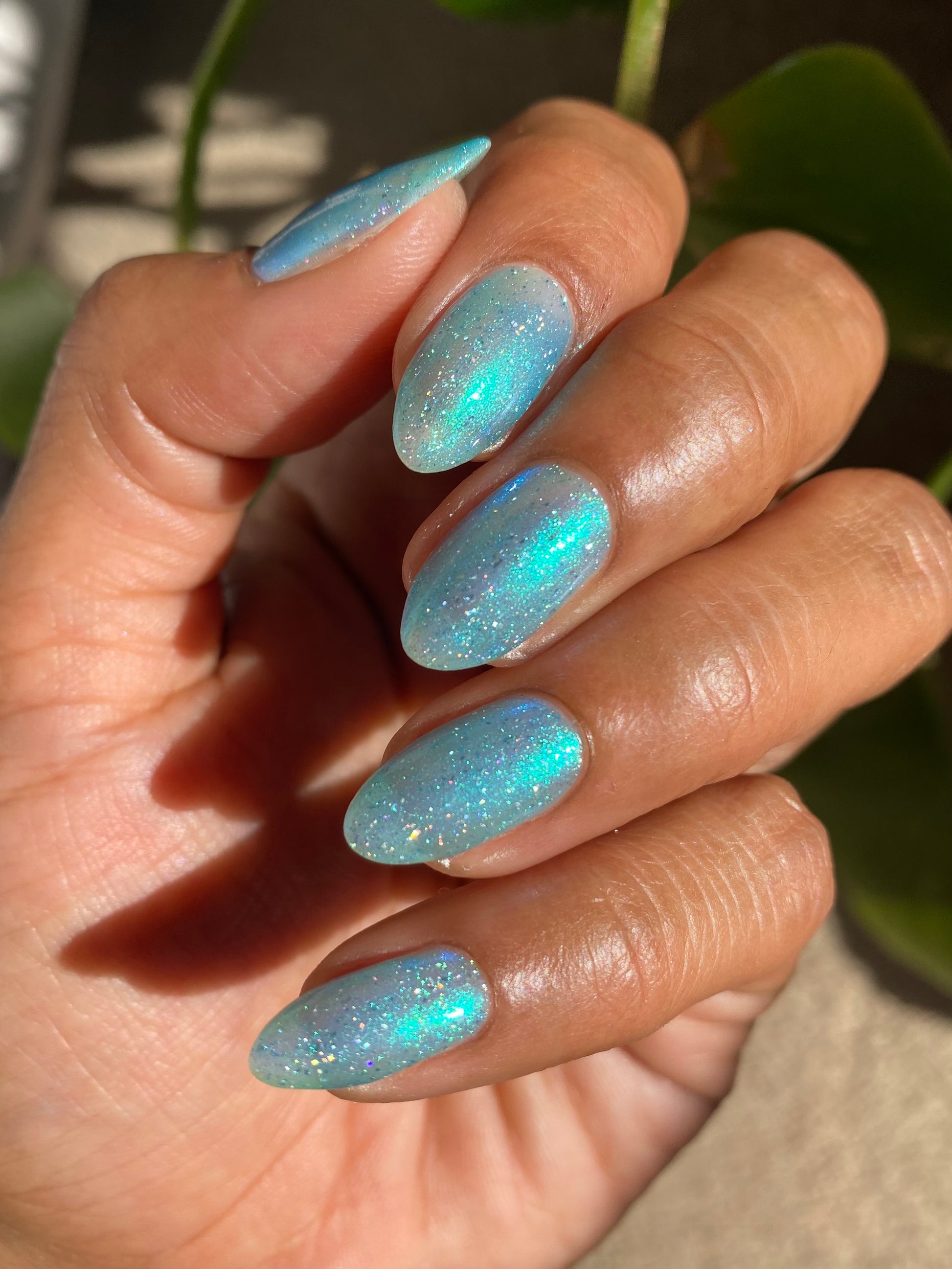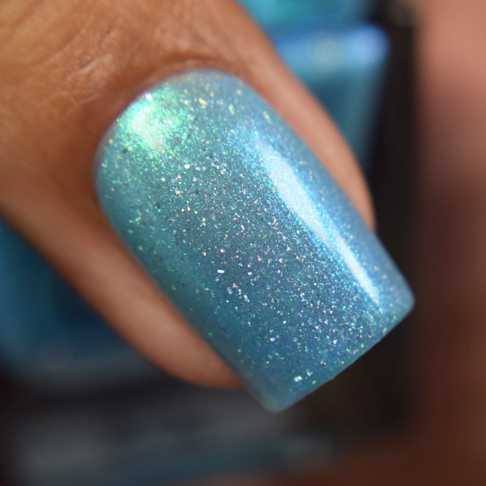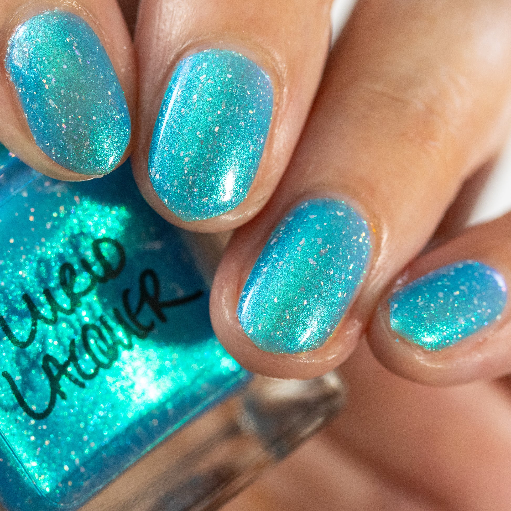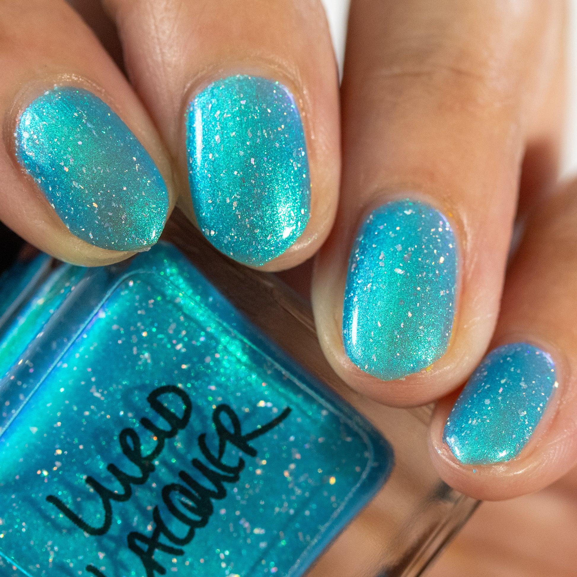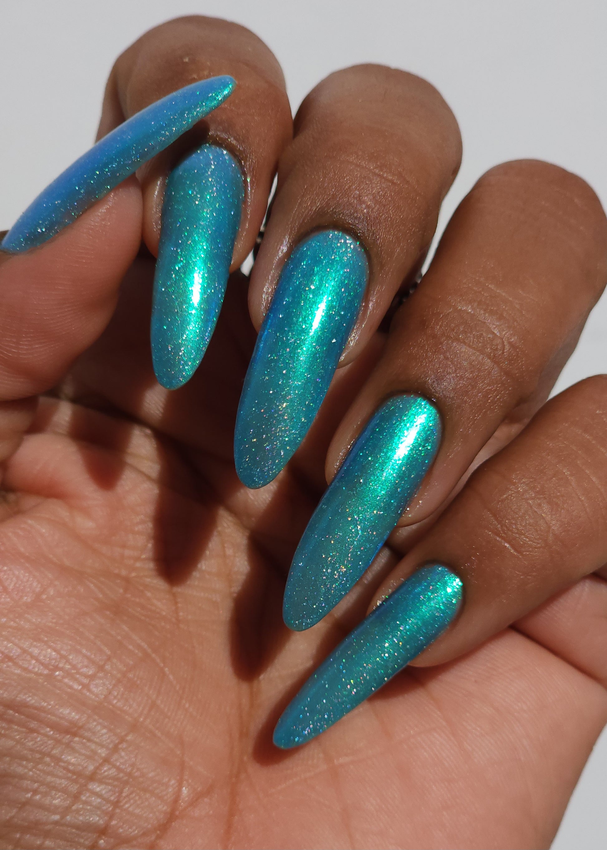 A cerulean crelly base with green to blue shimmer and micro holographic flakes