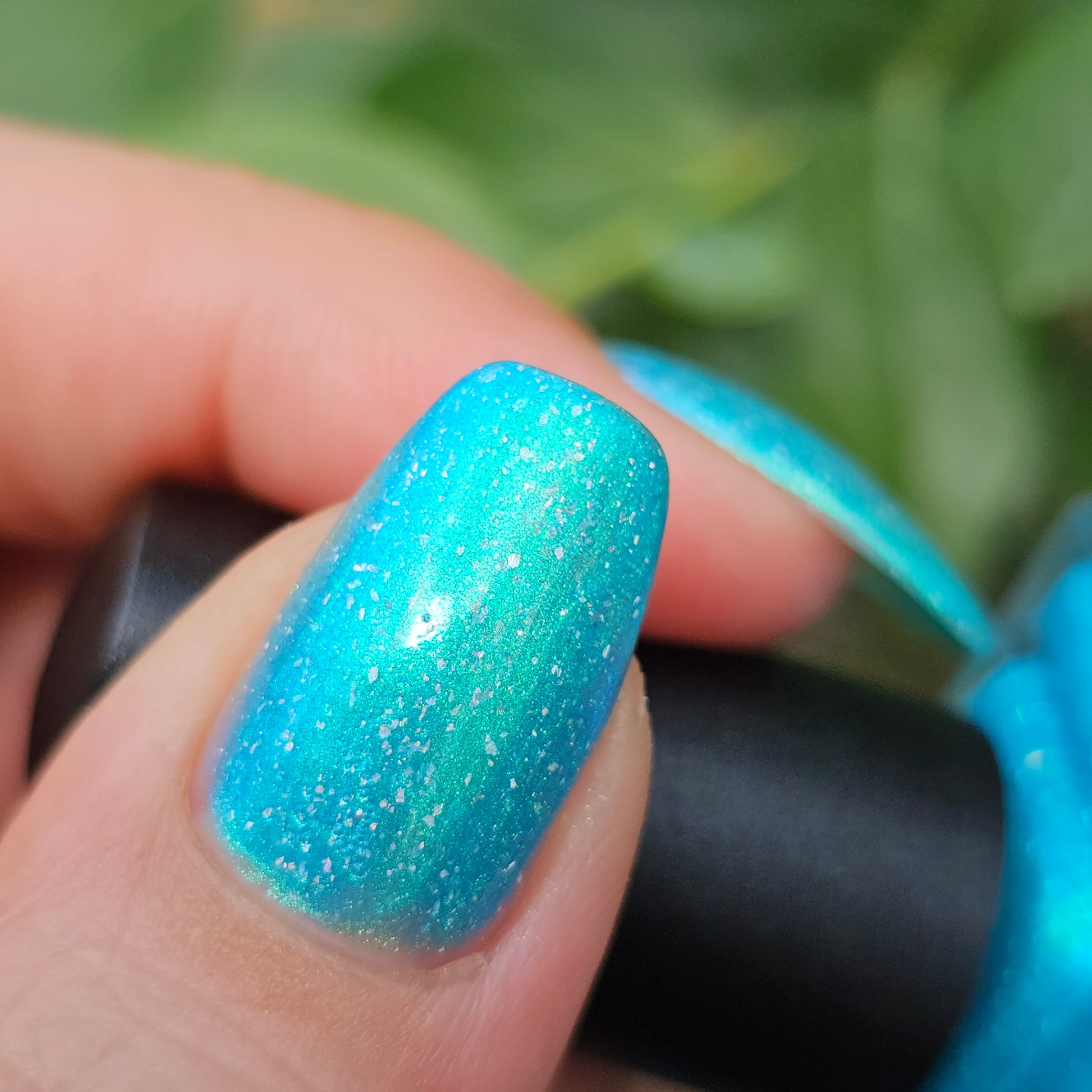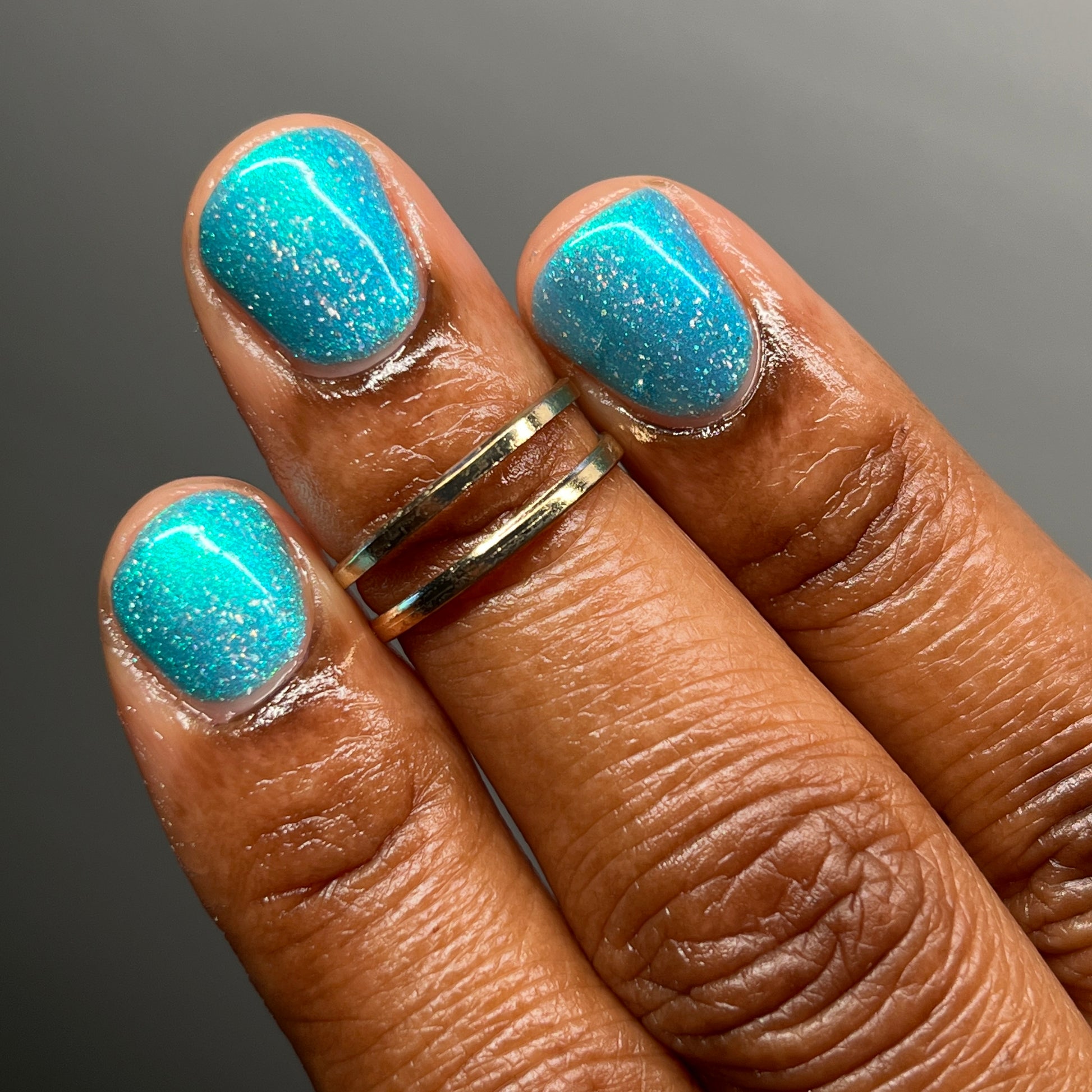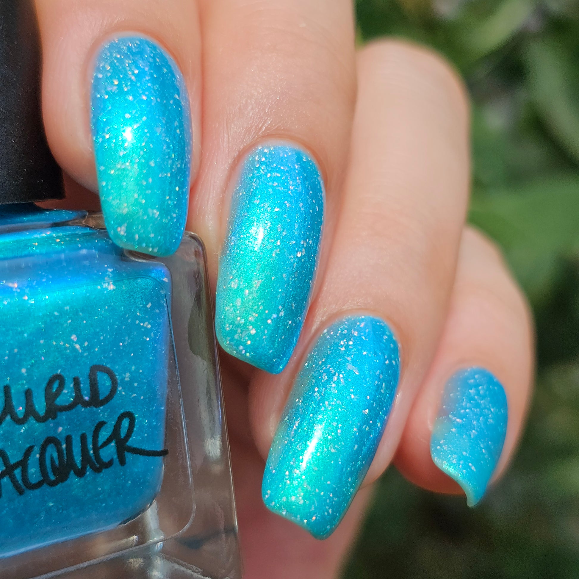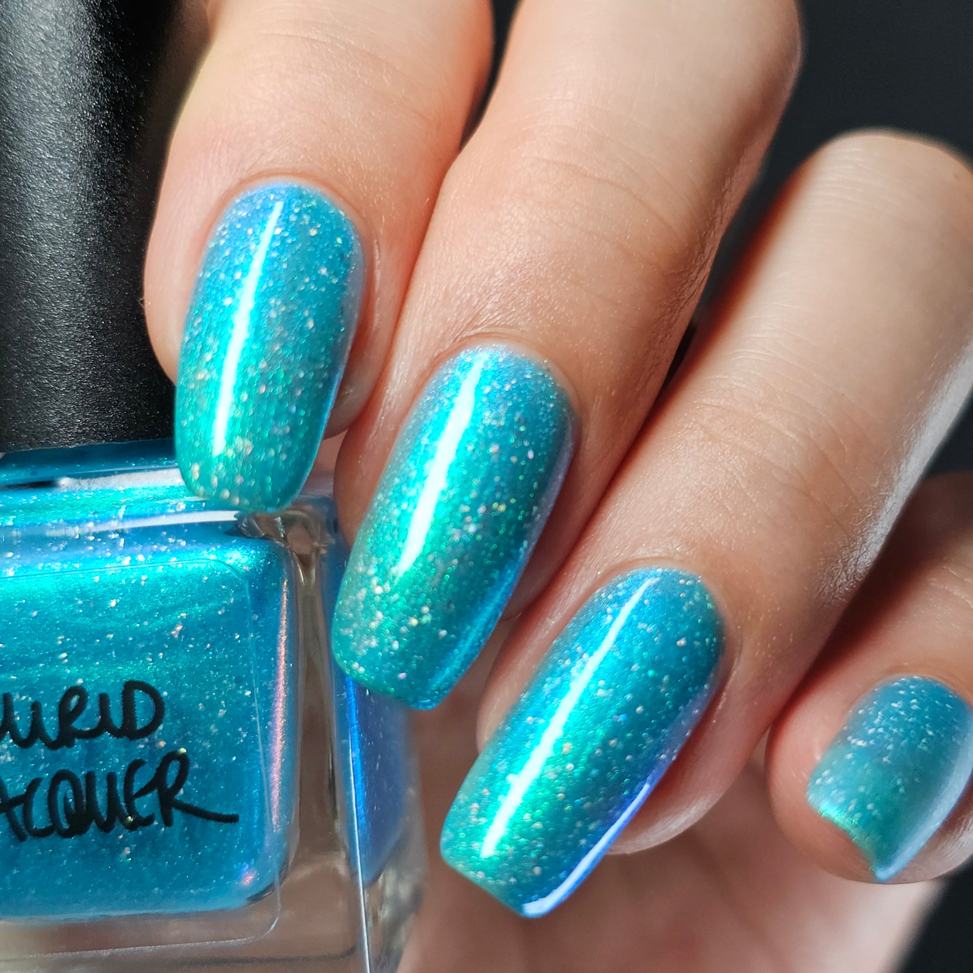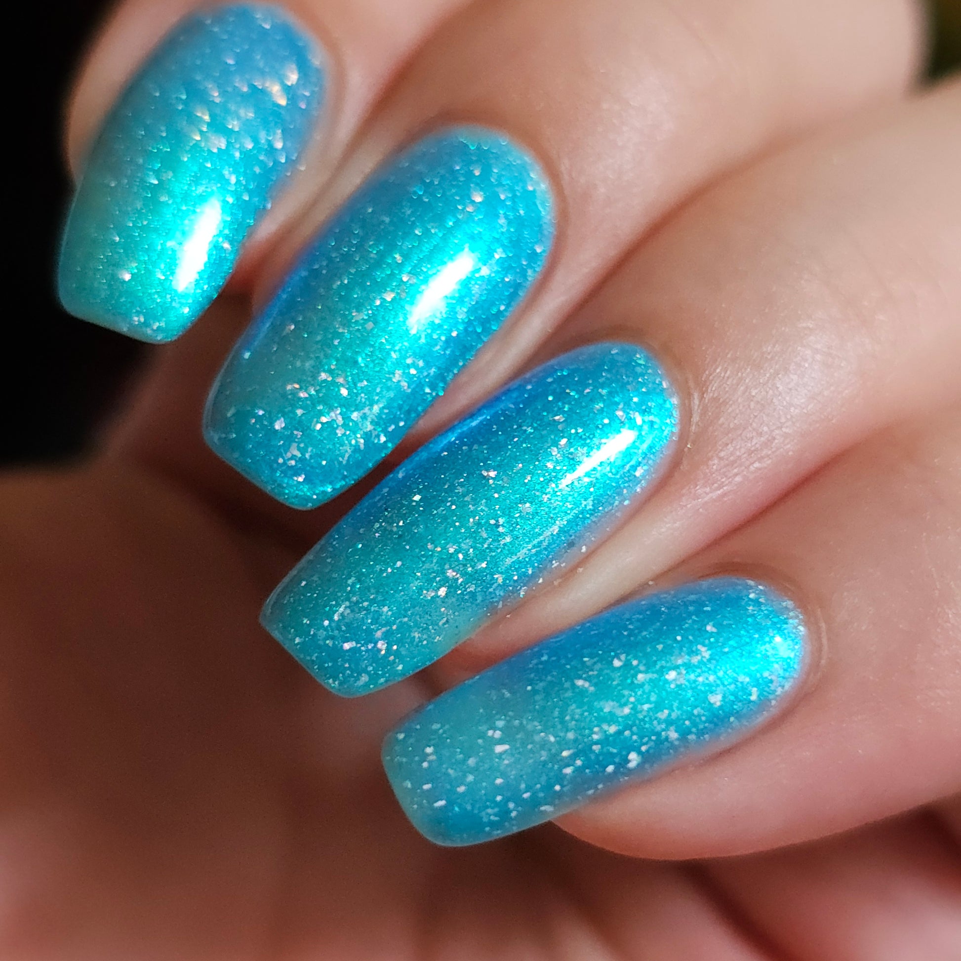 A cerulean crelly base with green to blue shimmer and micro holographic flakes