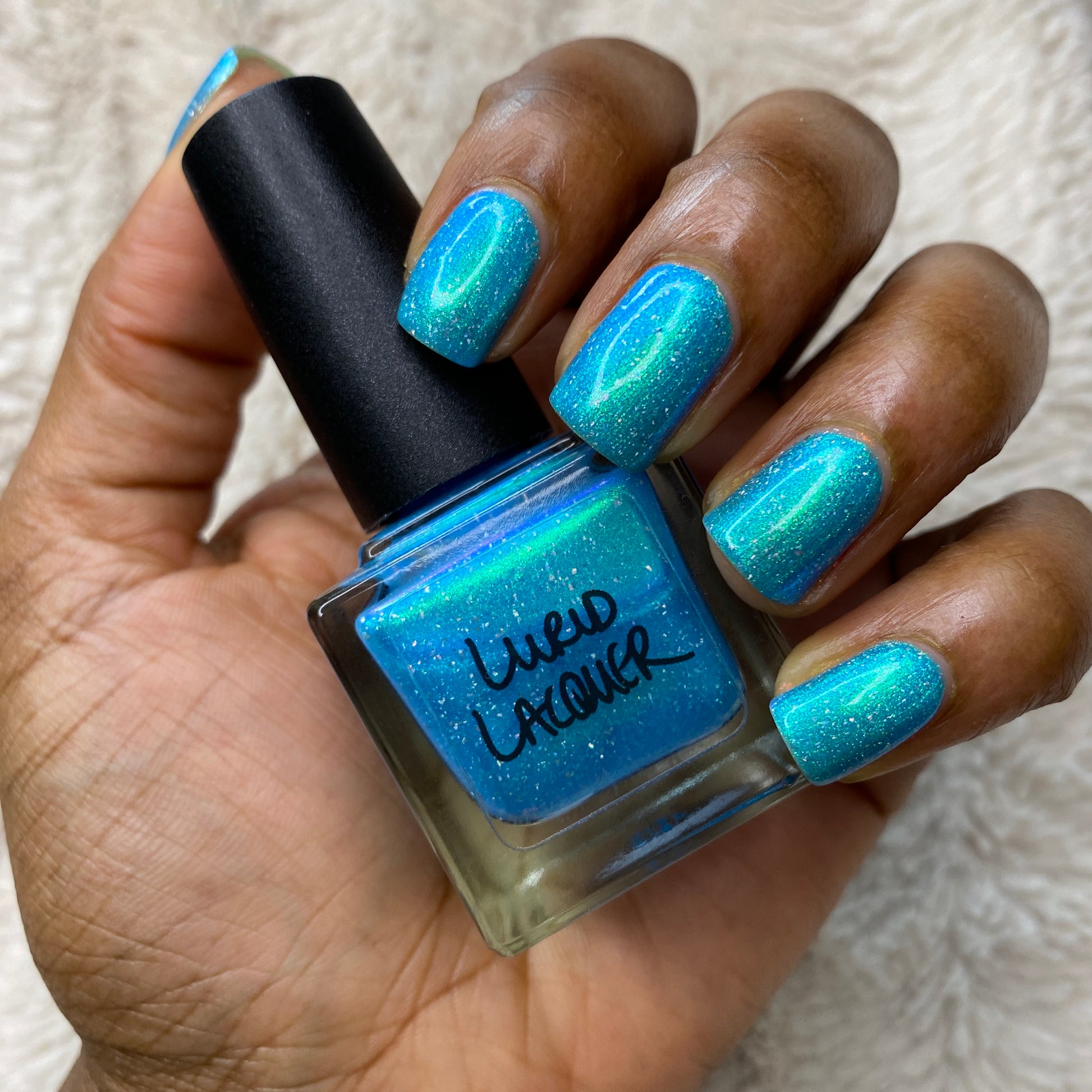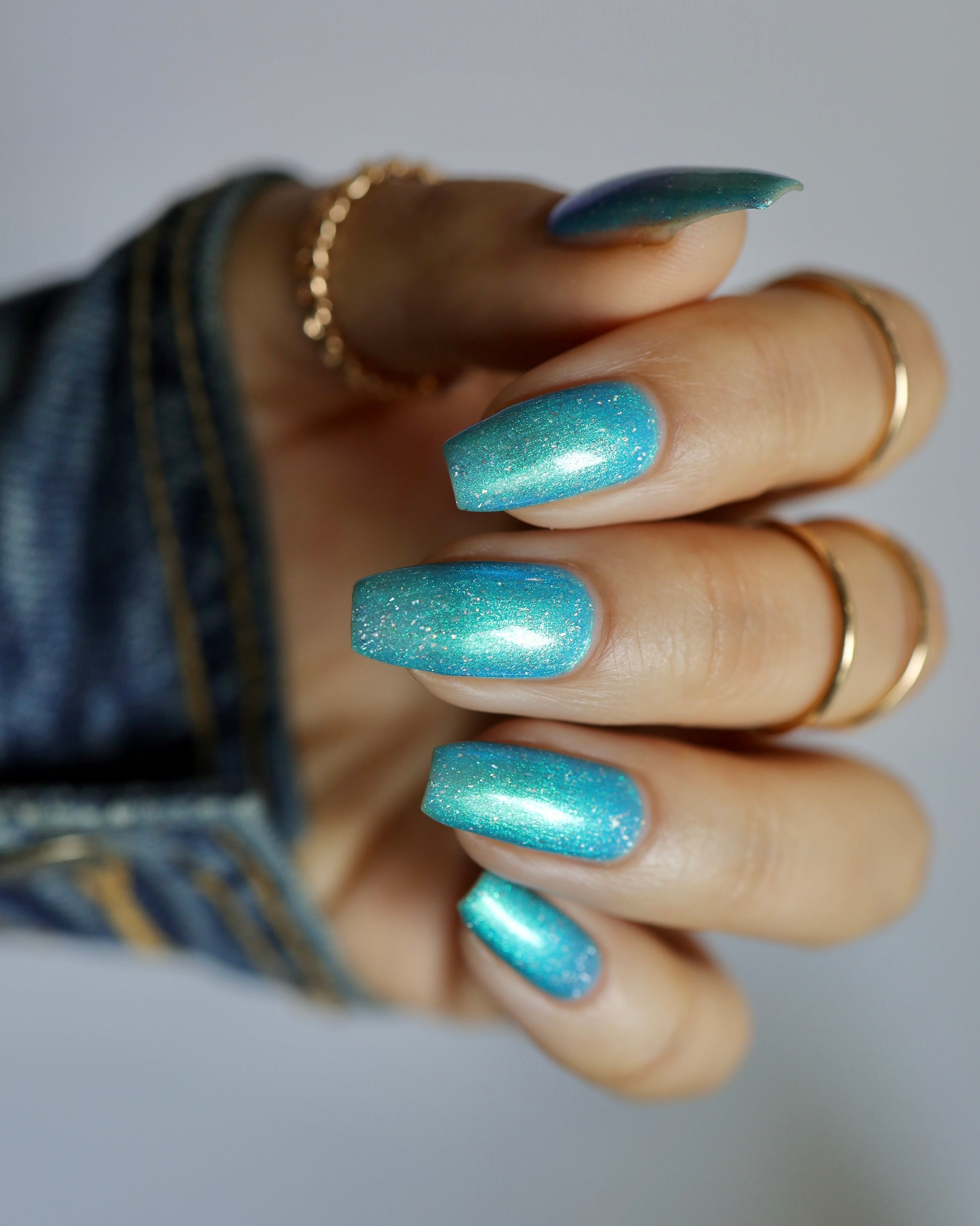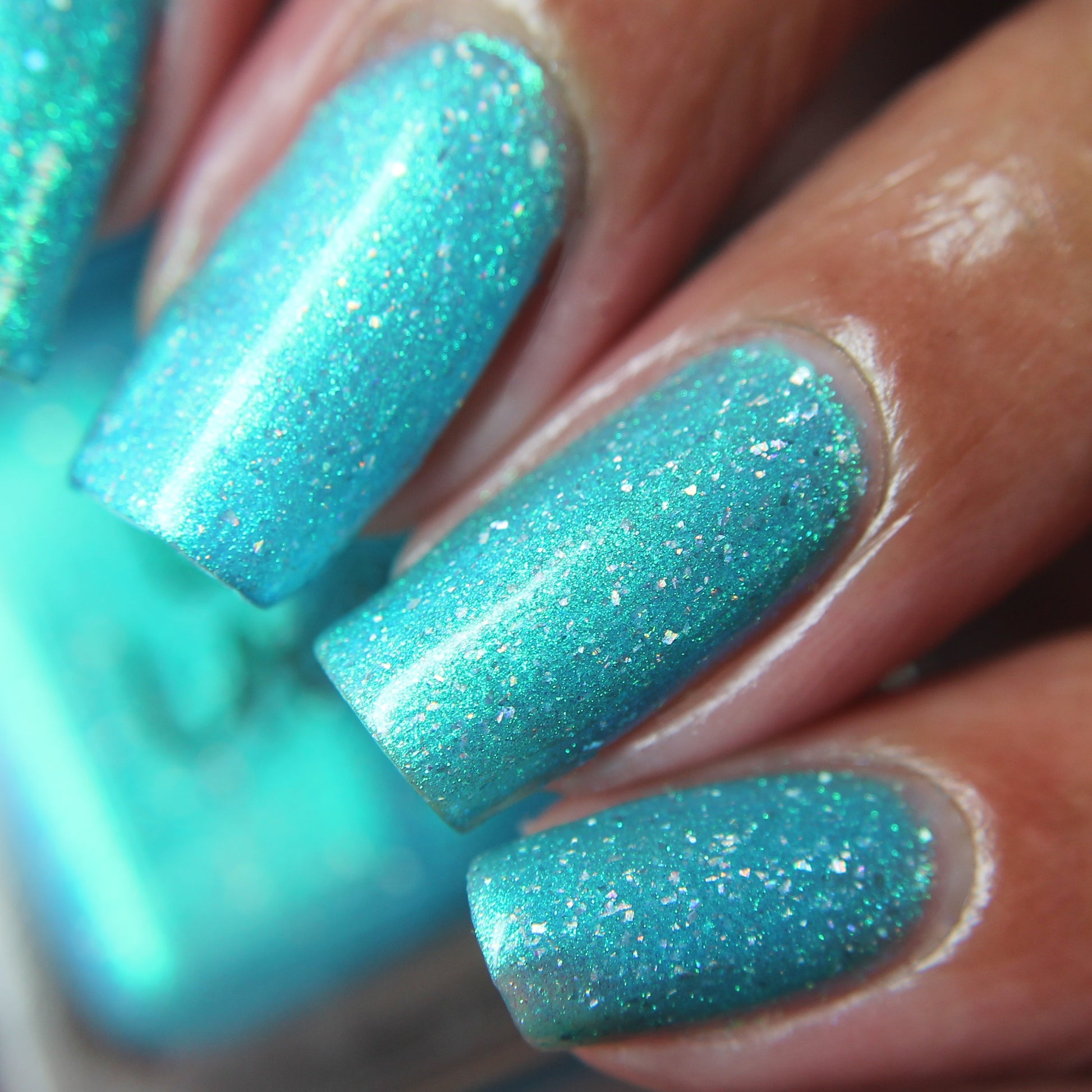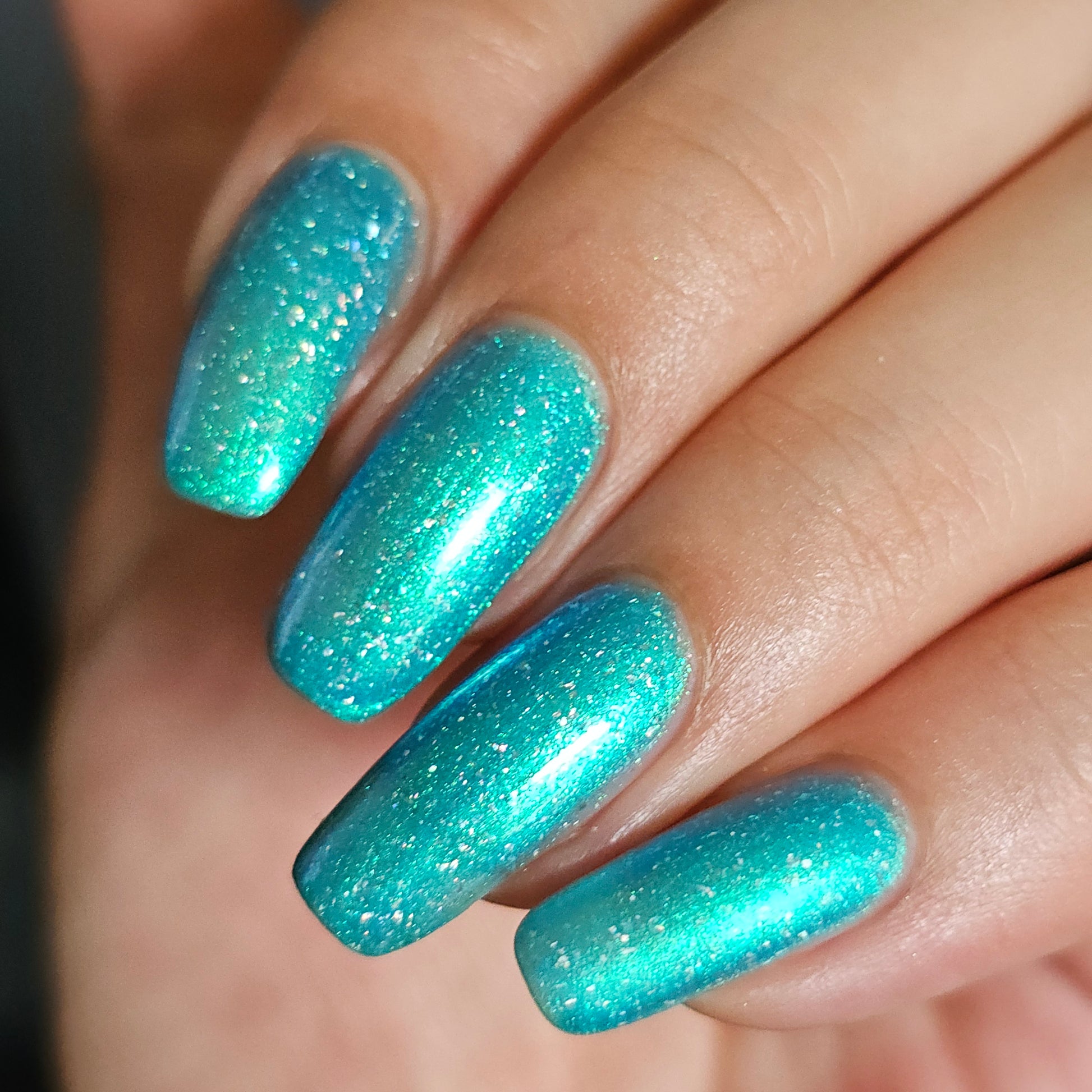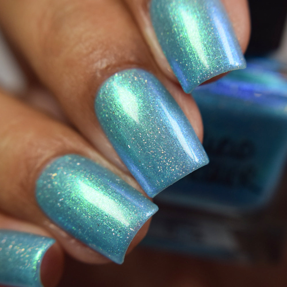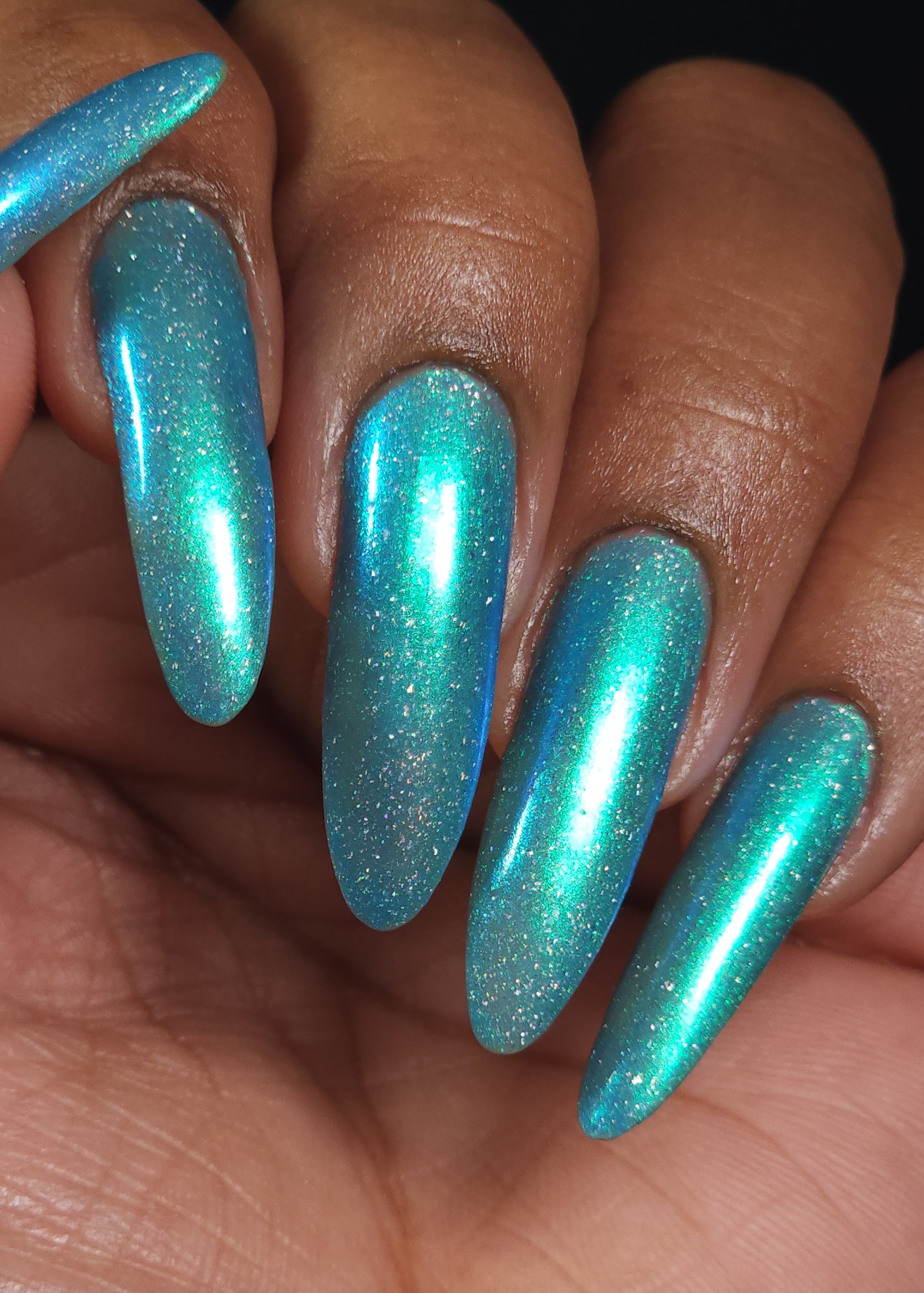 A cerulean crelly base with green to blue shimmer and micro holographic flakes