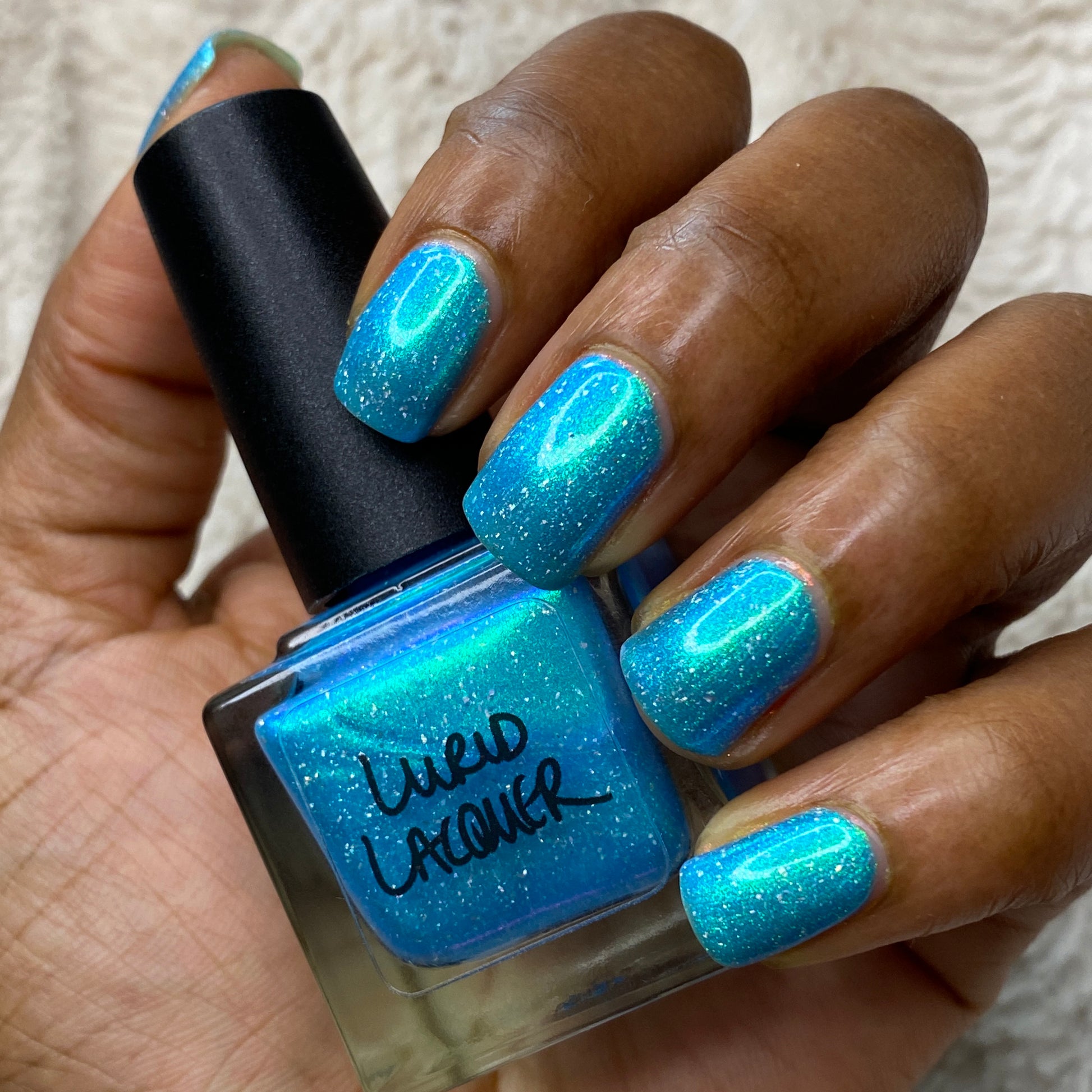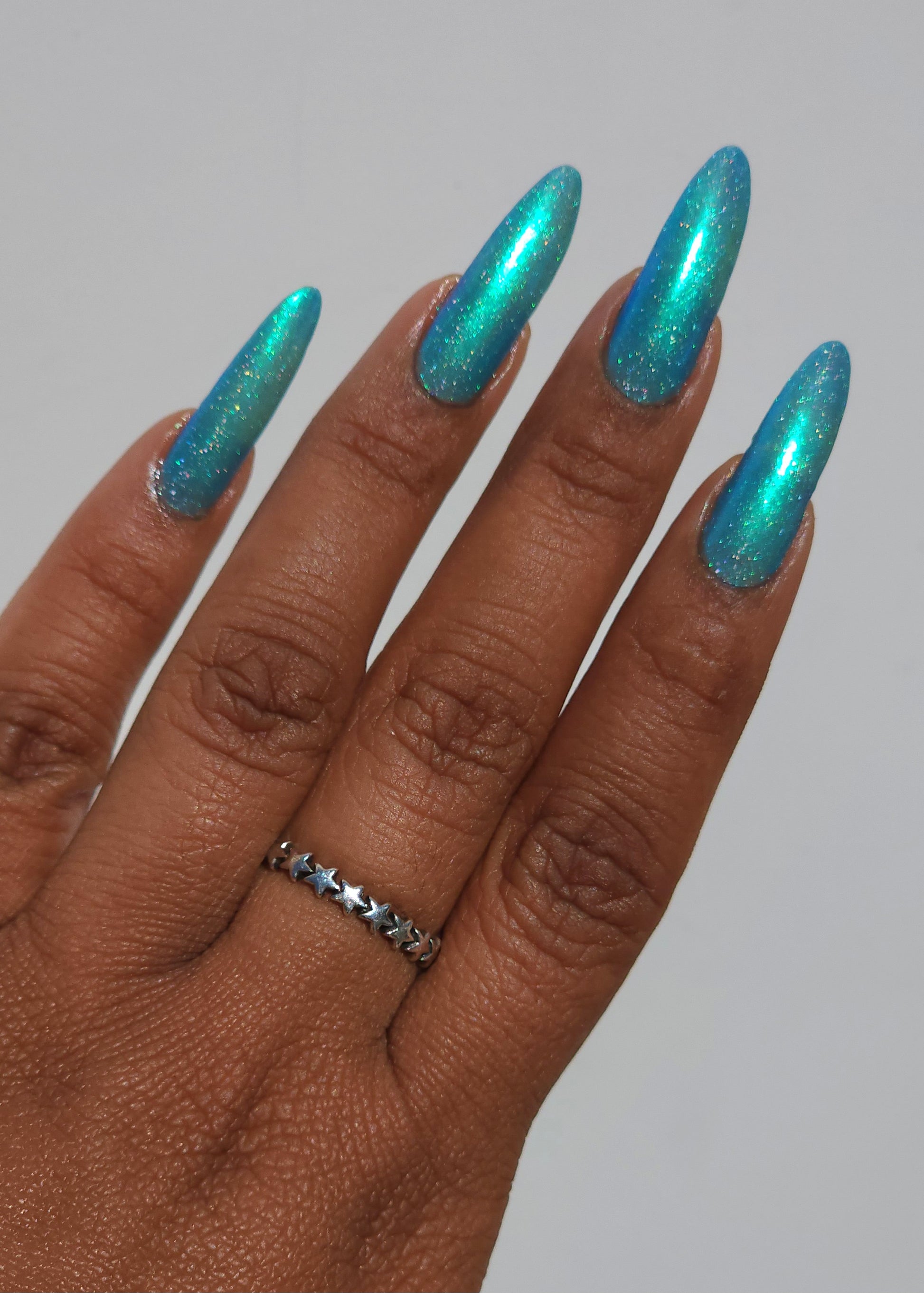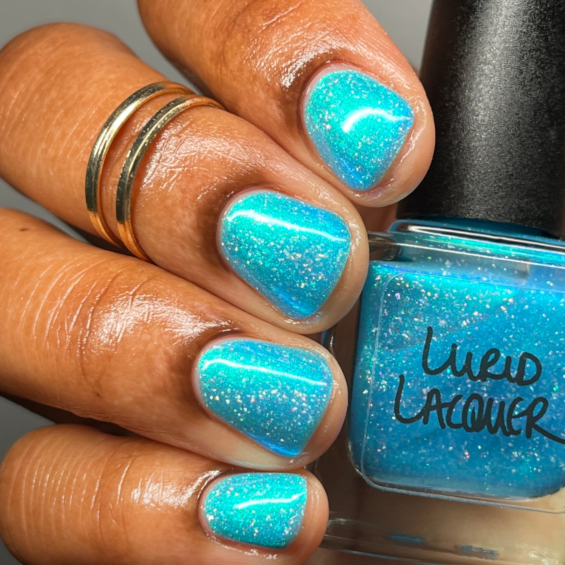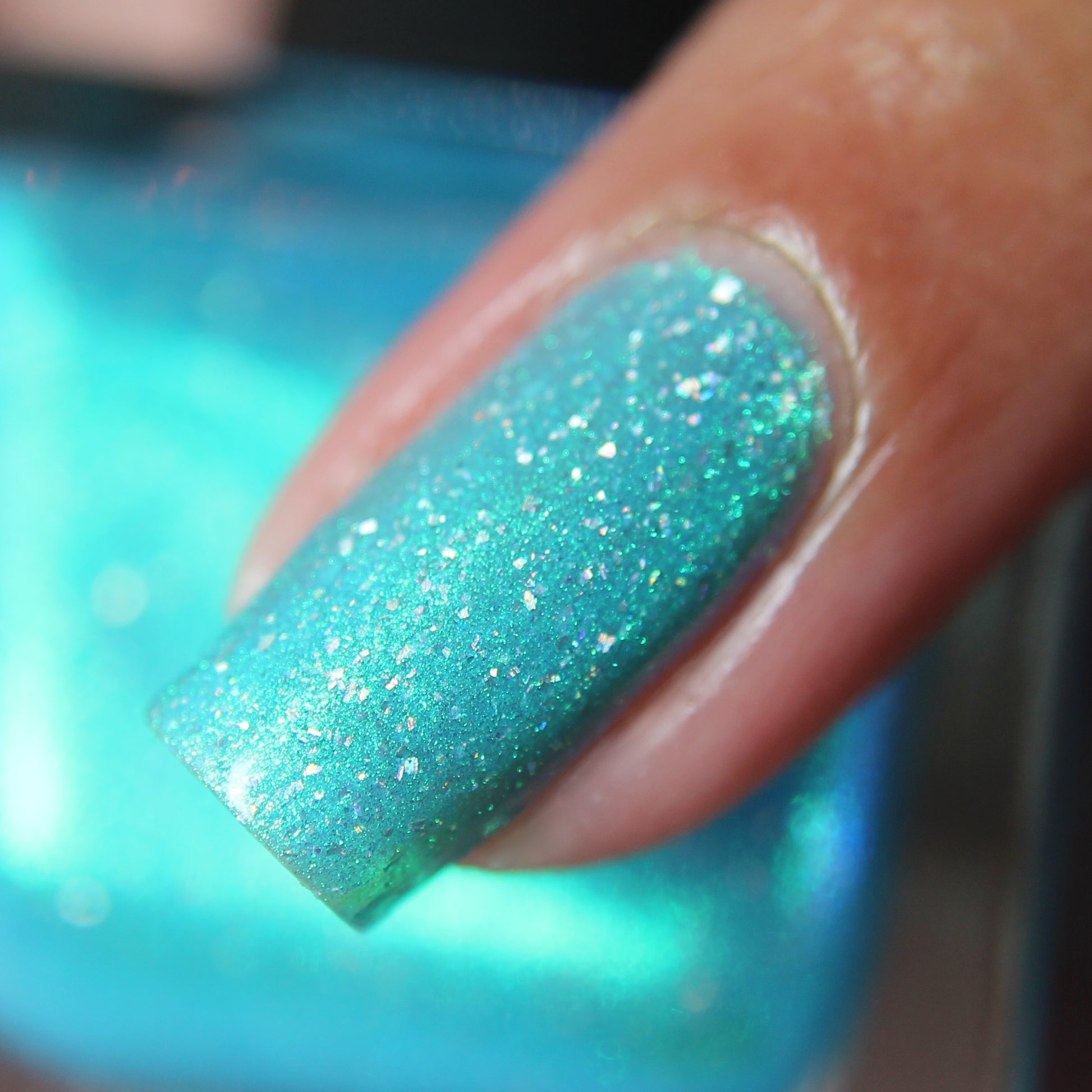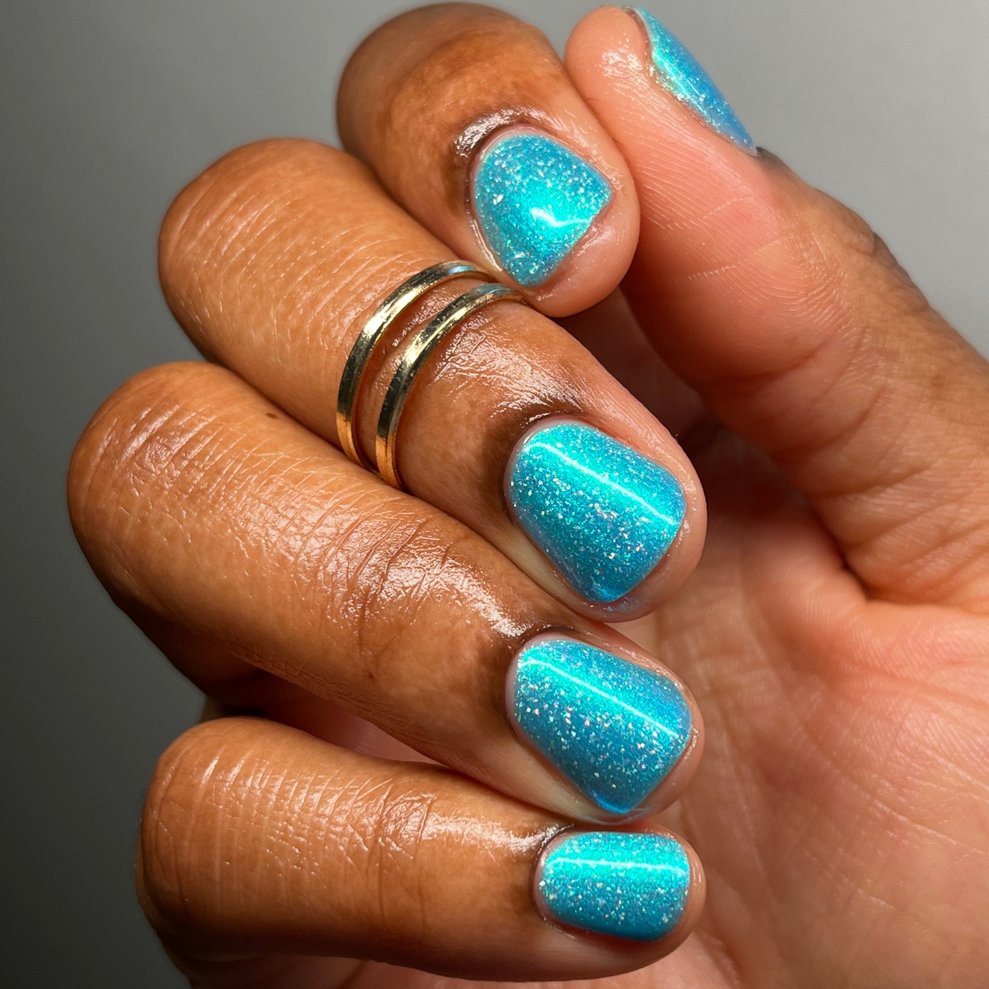 A cerulean crelly base with green to blue shimmer and micro holographic flakes