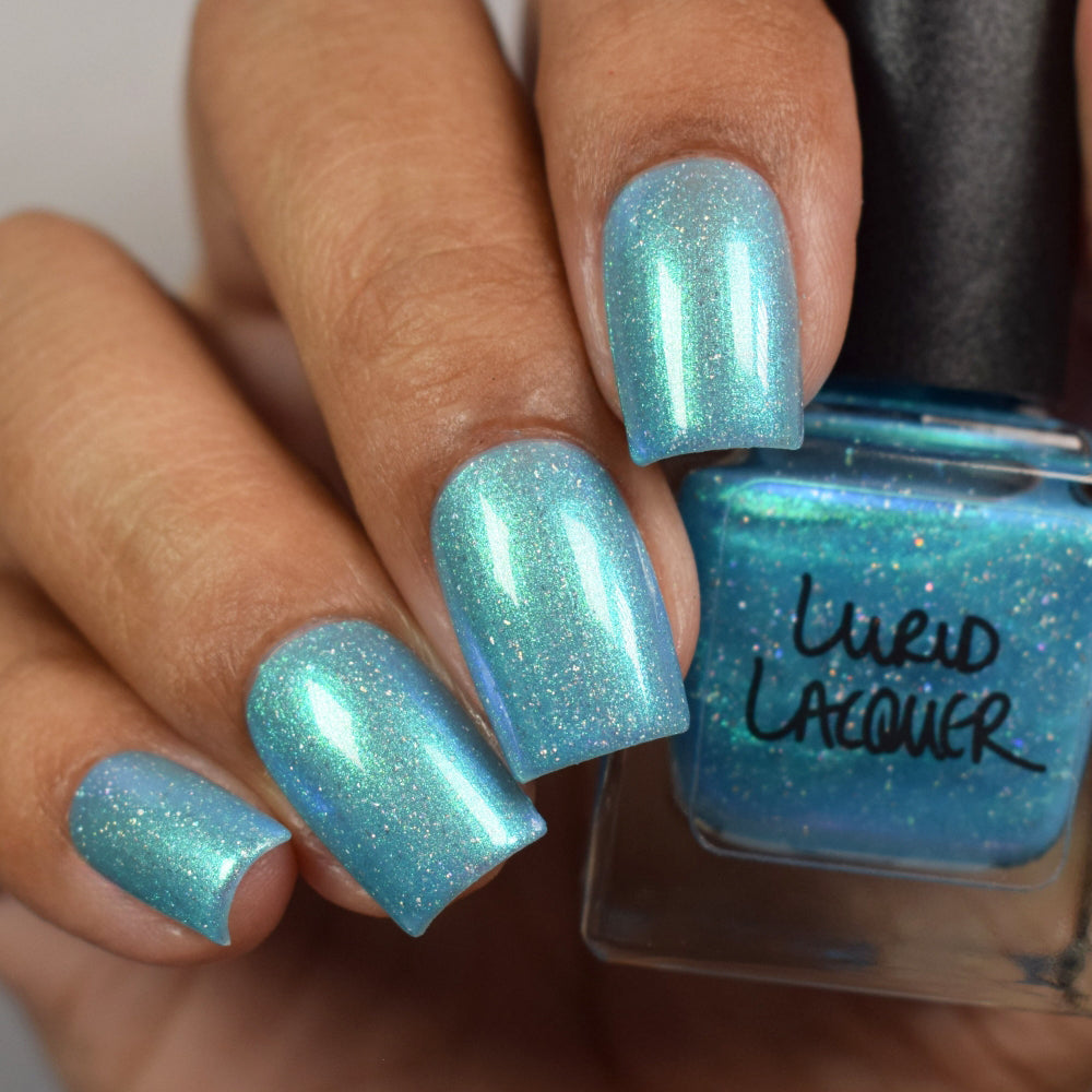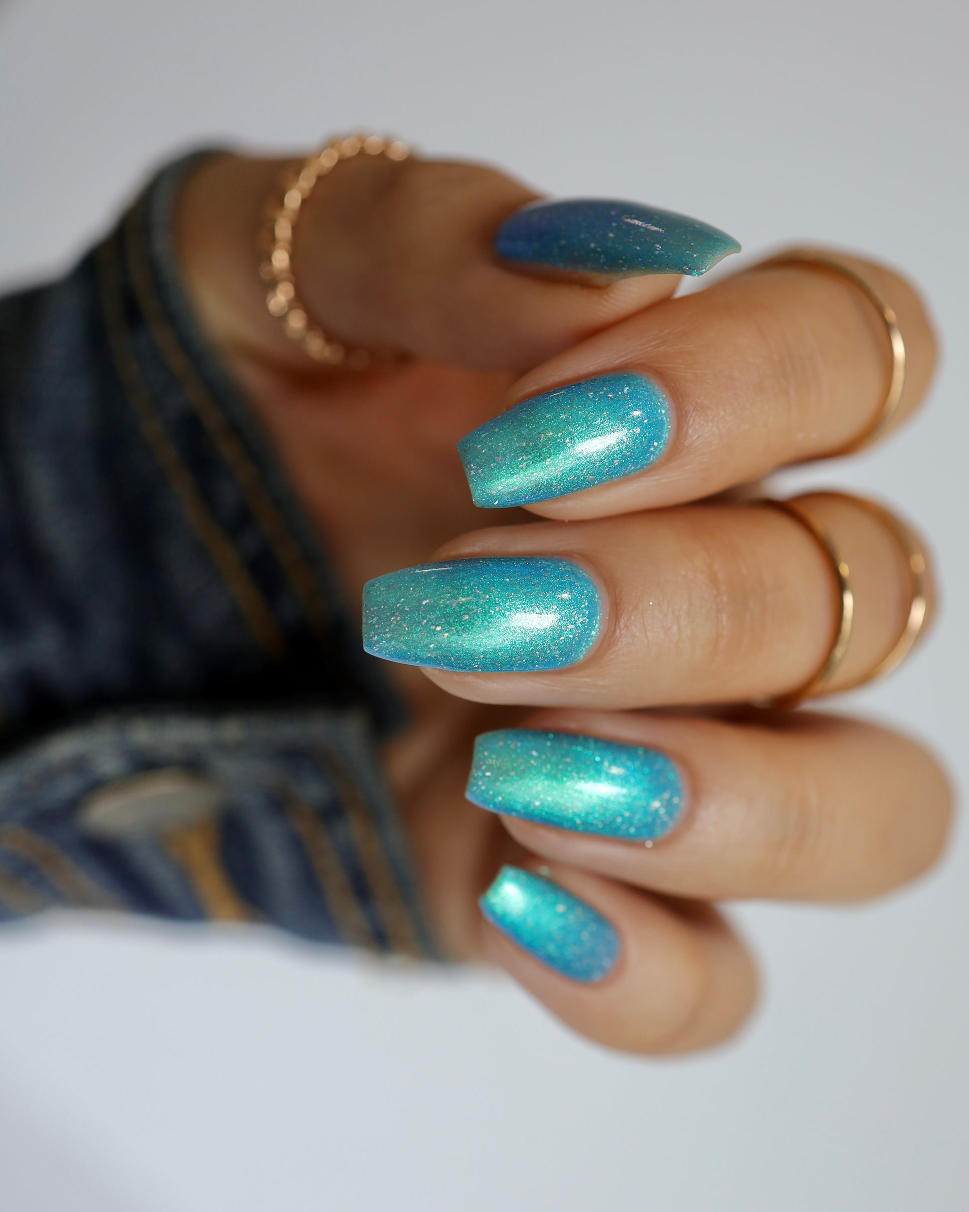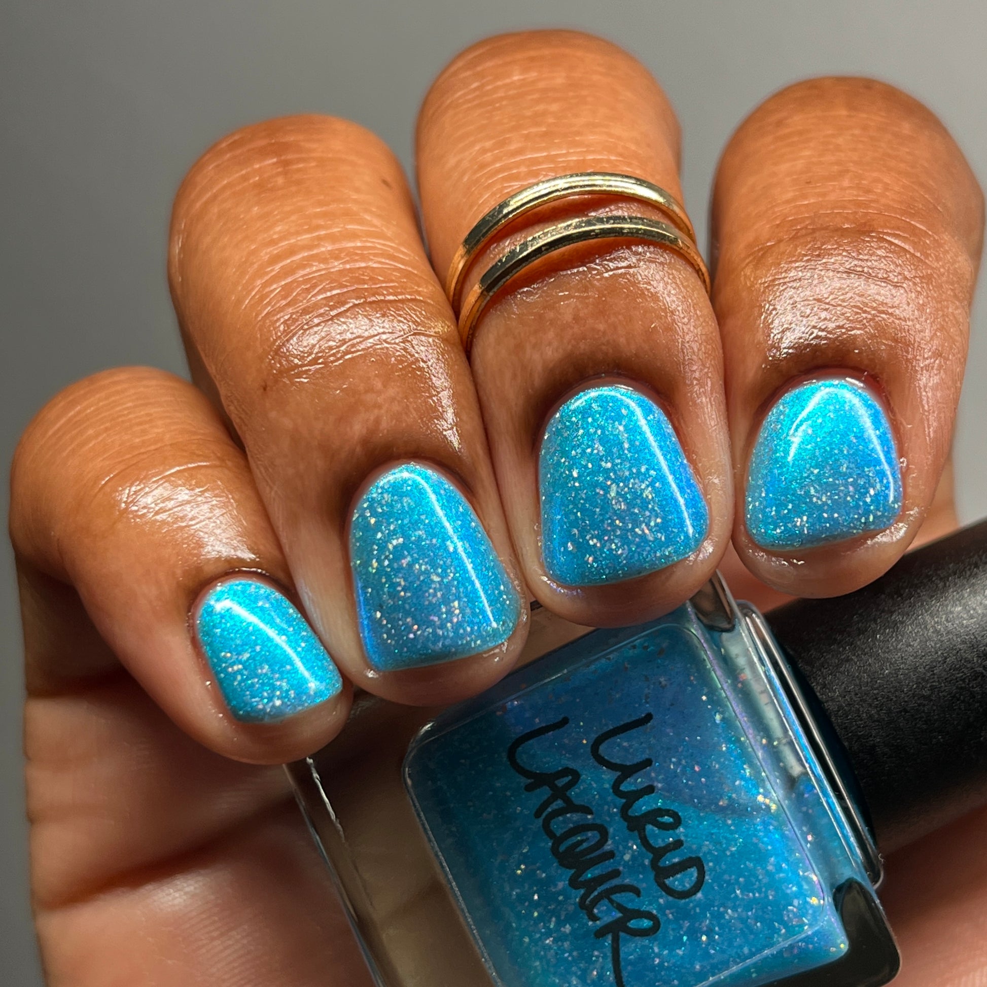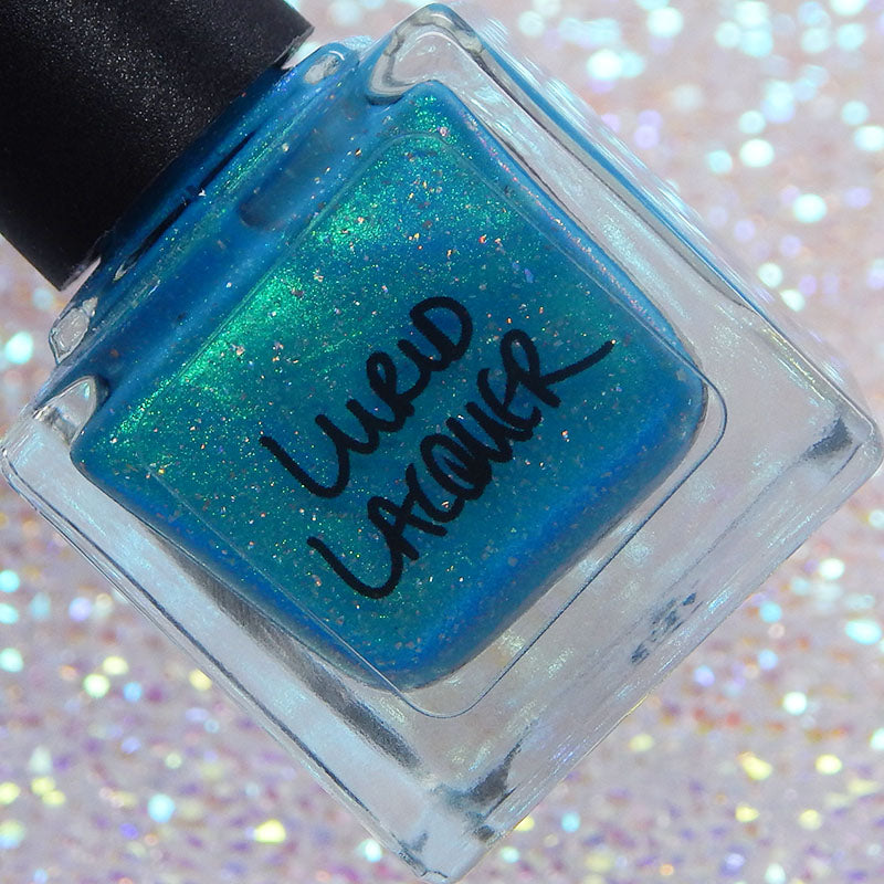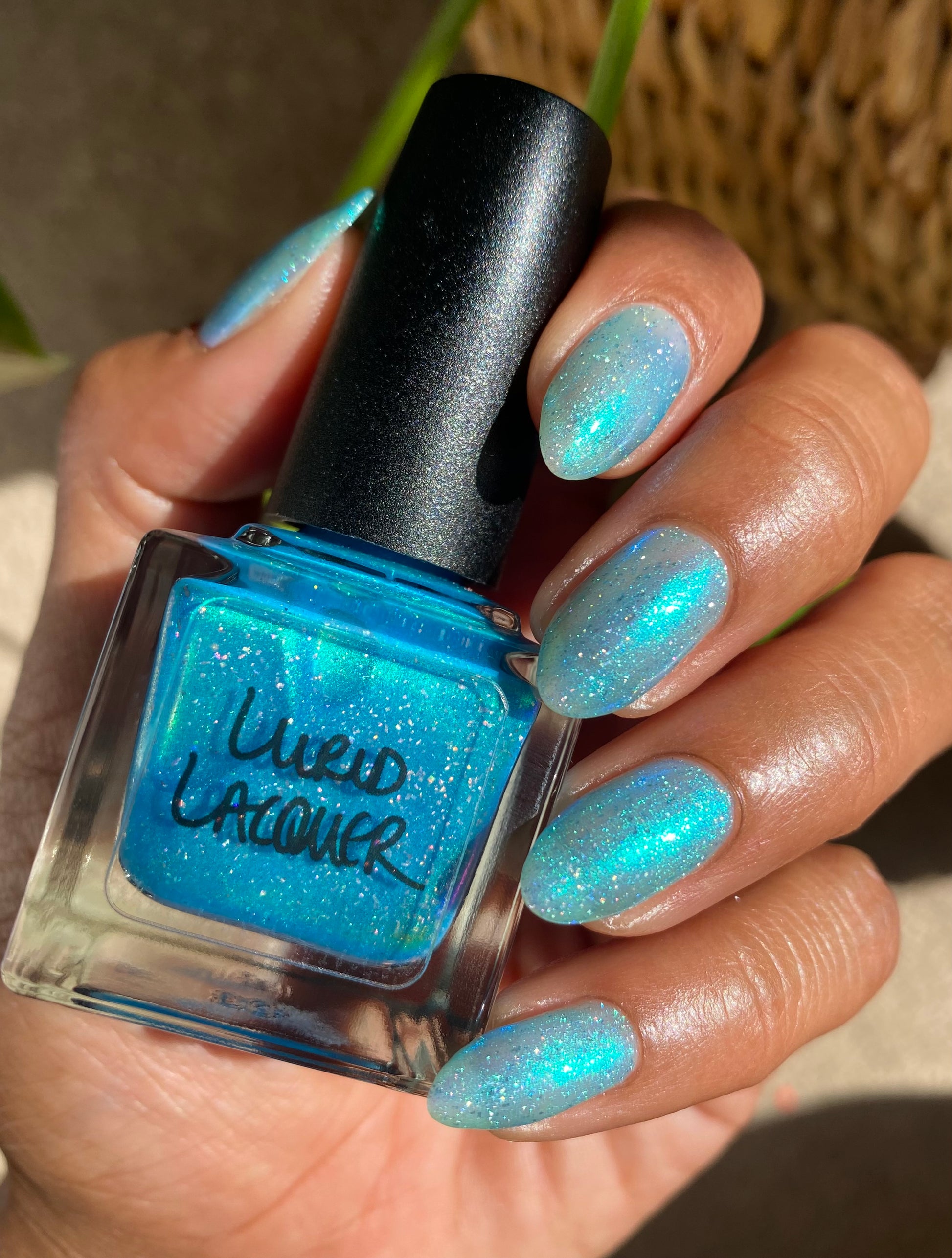 A cerulean crelly base with green to blue shimmer and micro holographic flakes