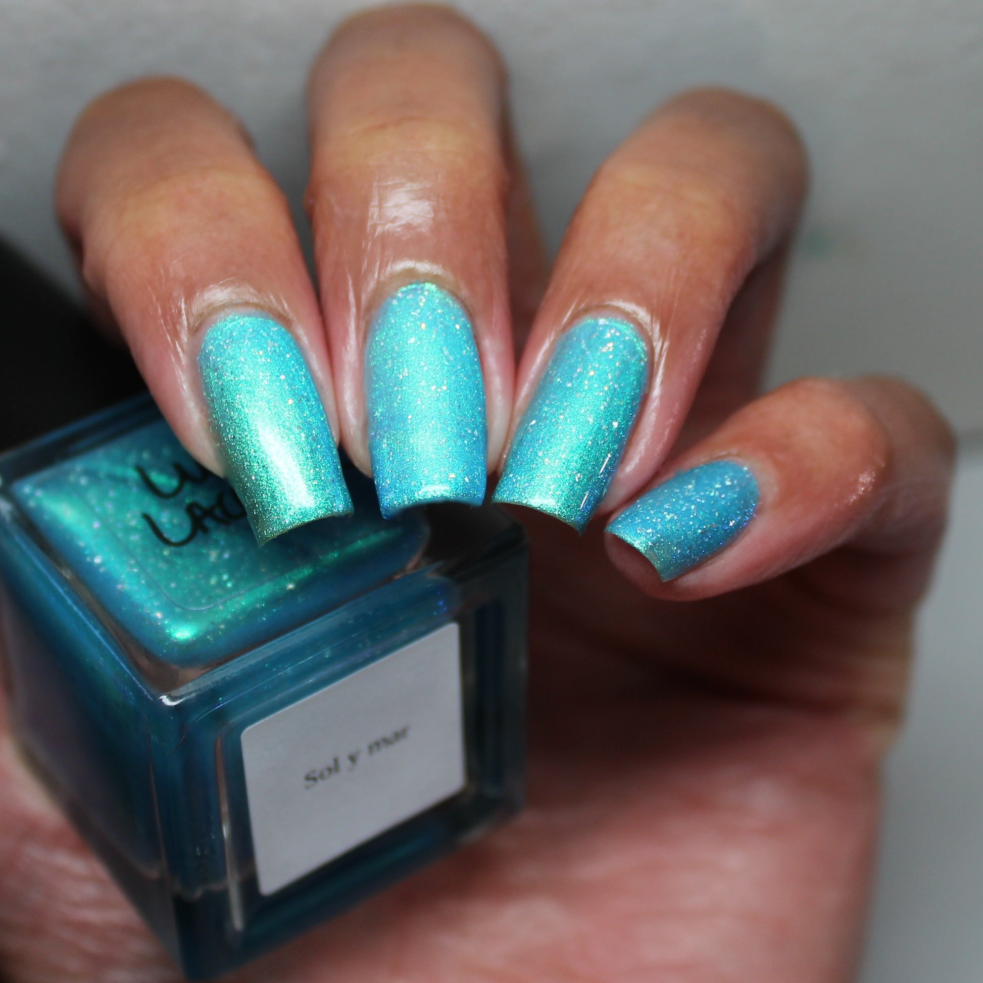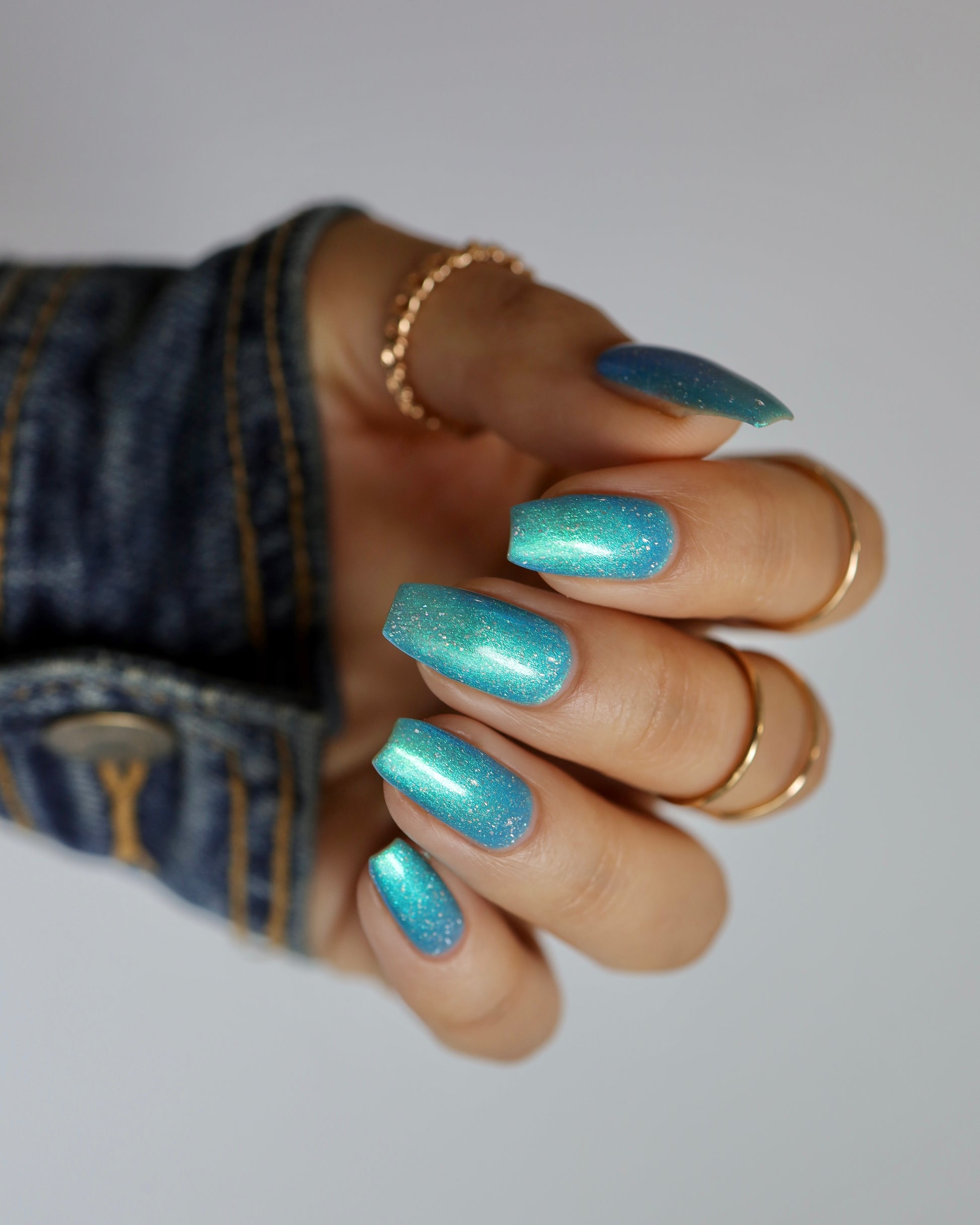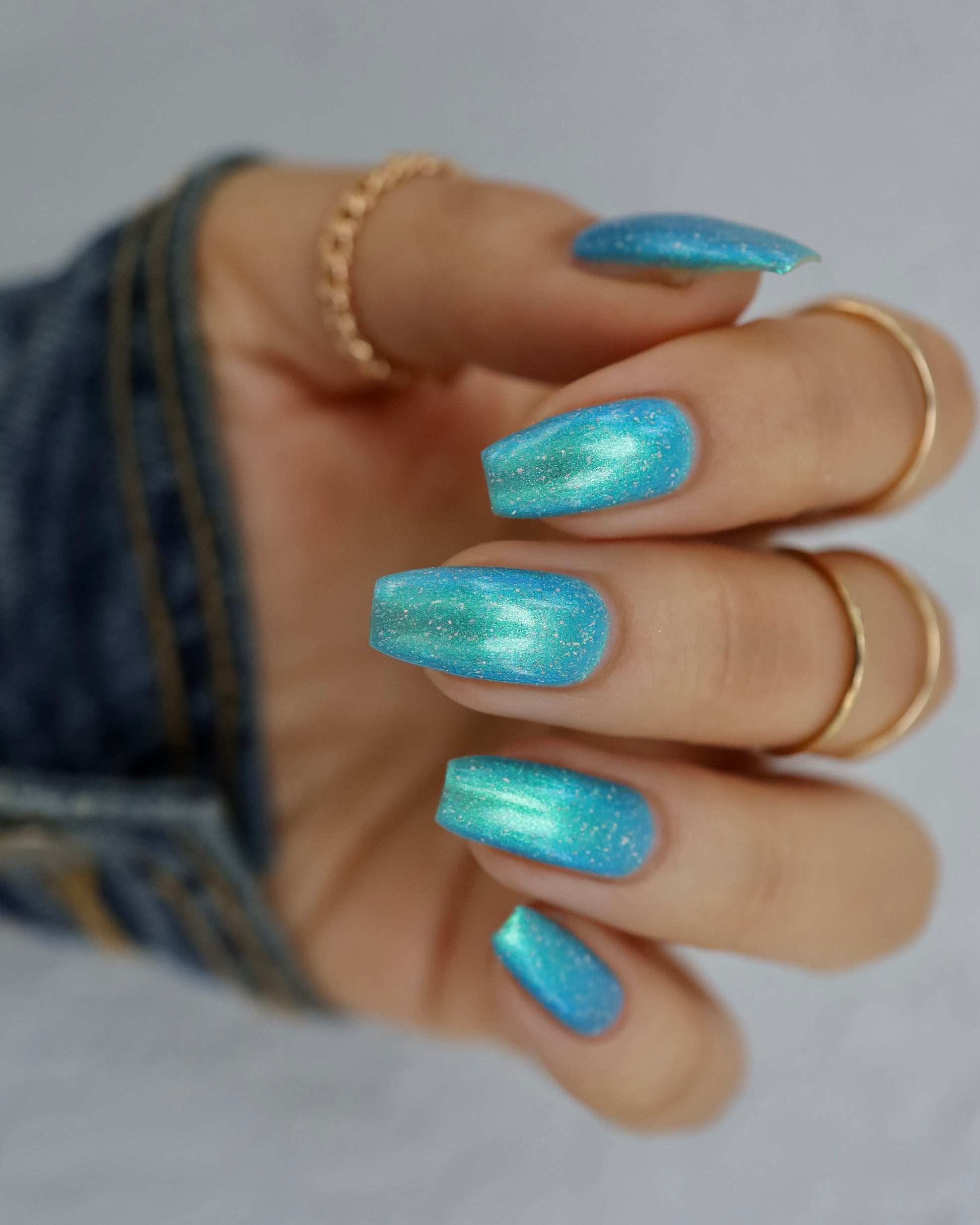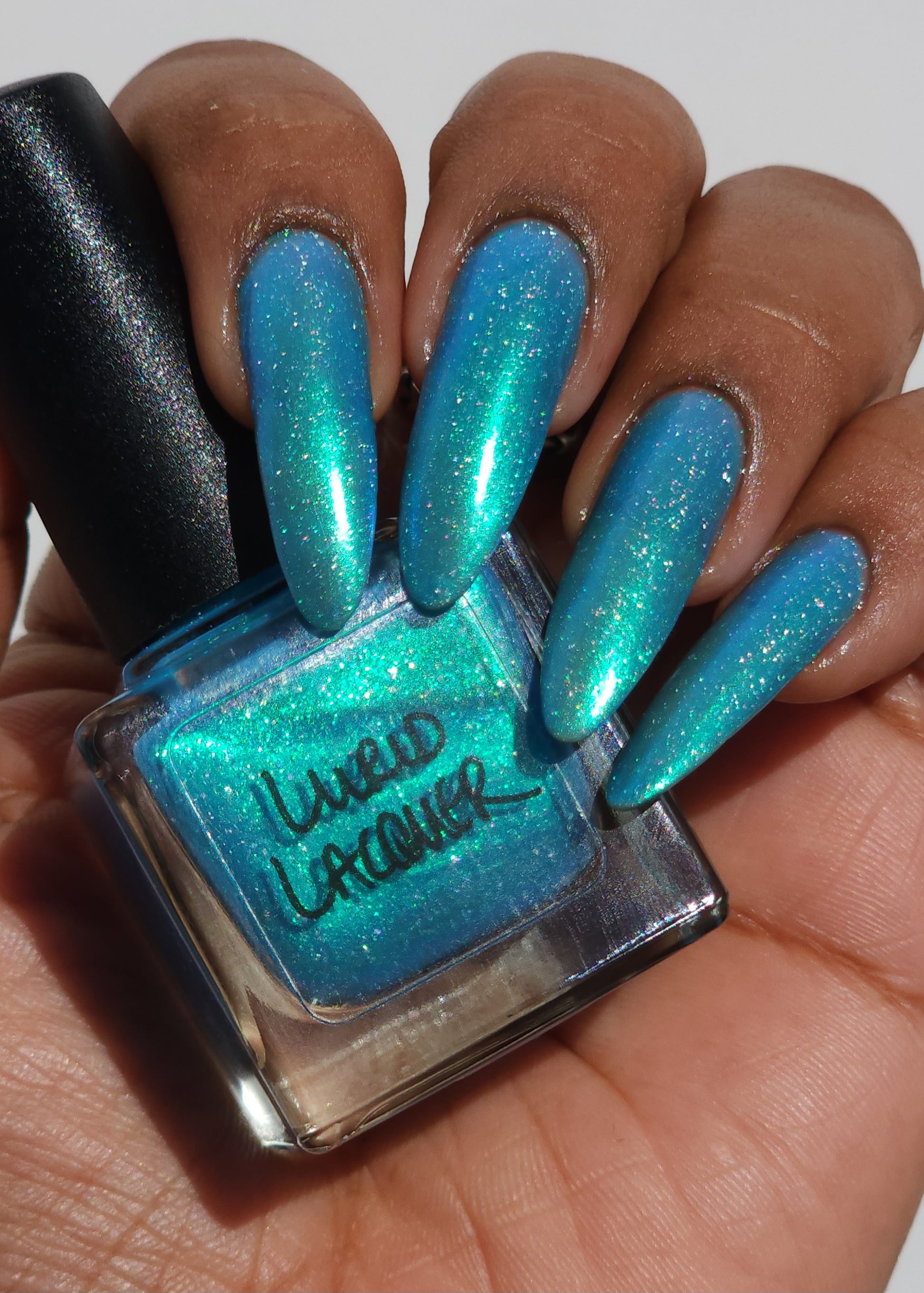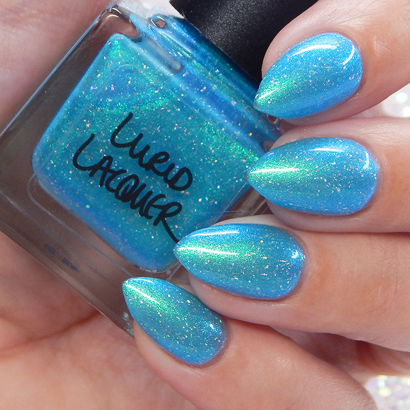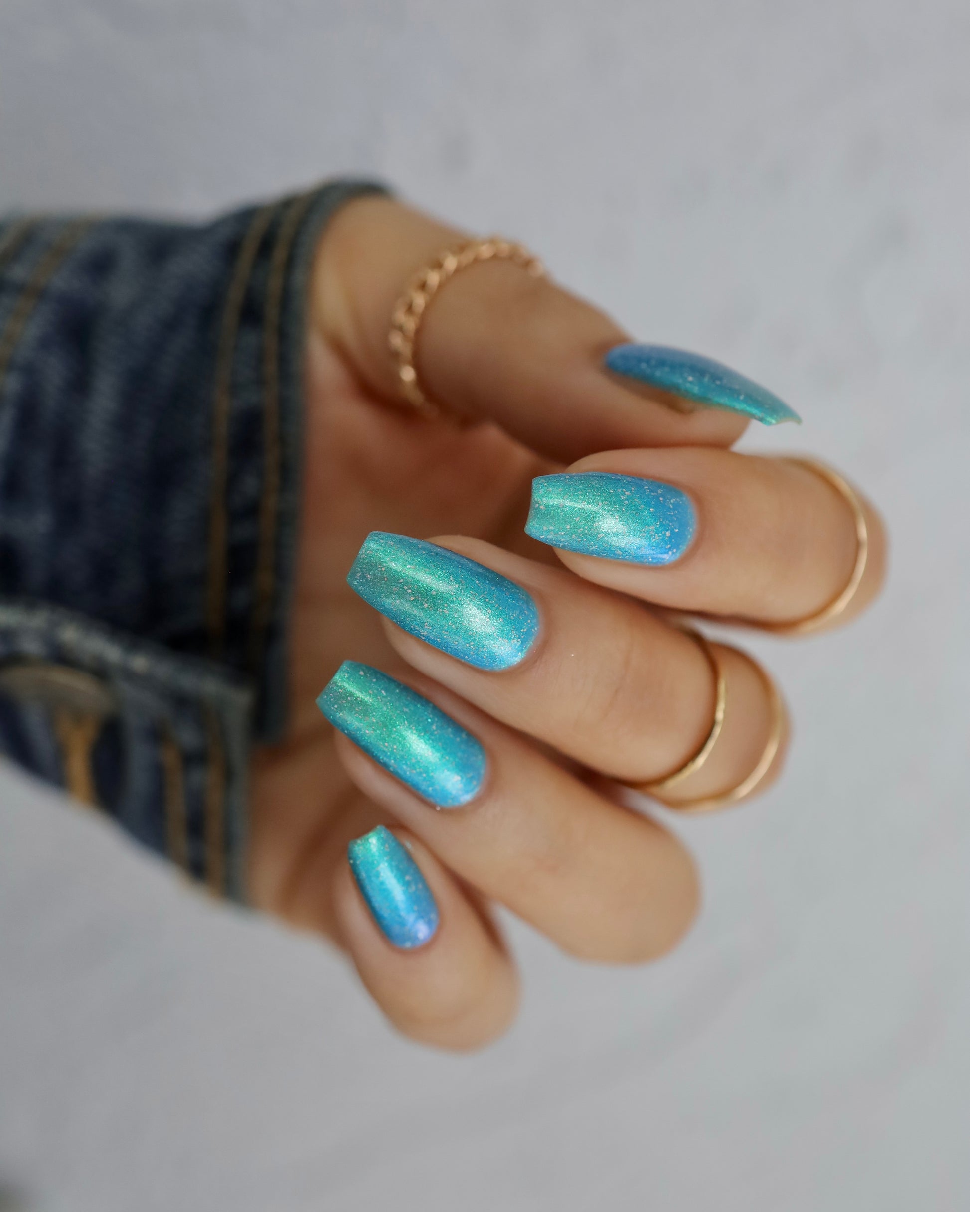 A cerulean crelly base with green to blue shimmer and micro holographic flakes