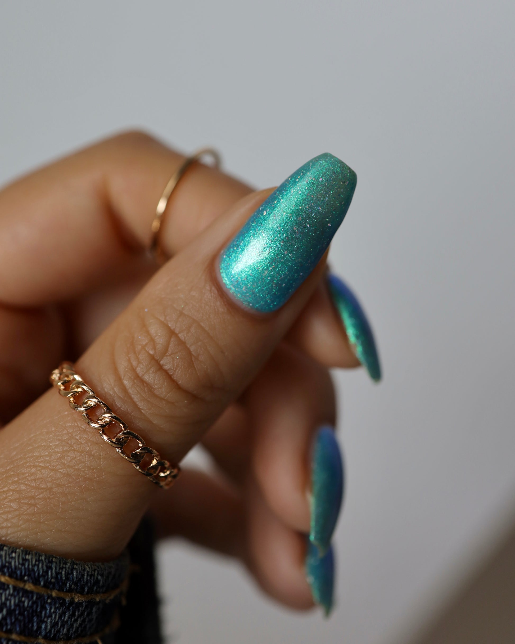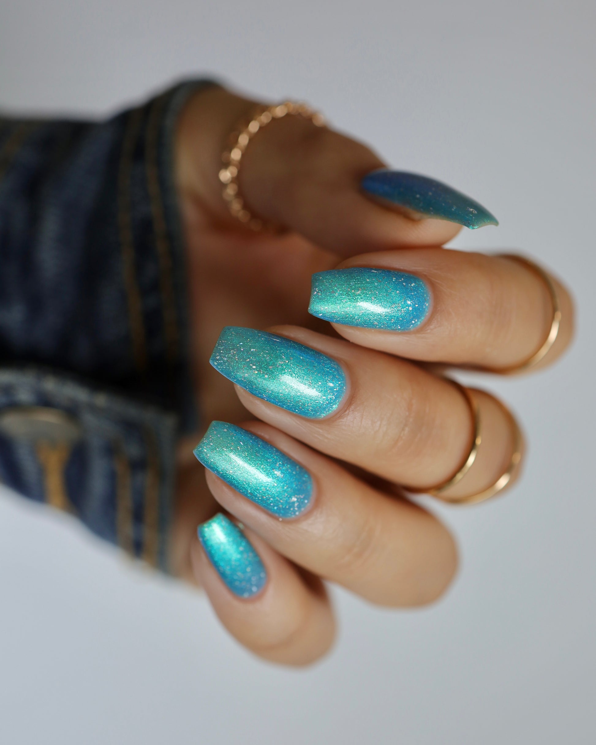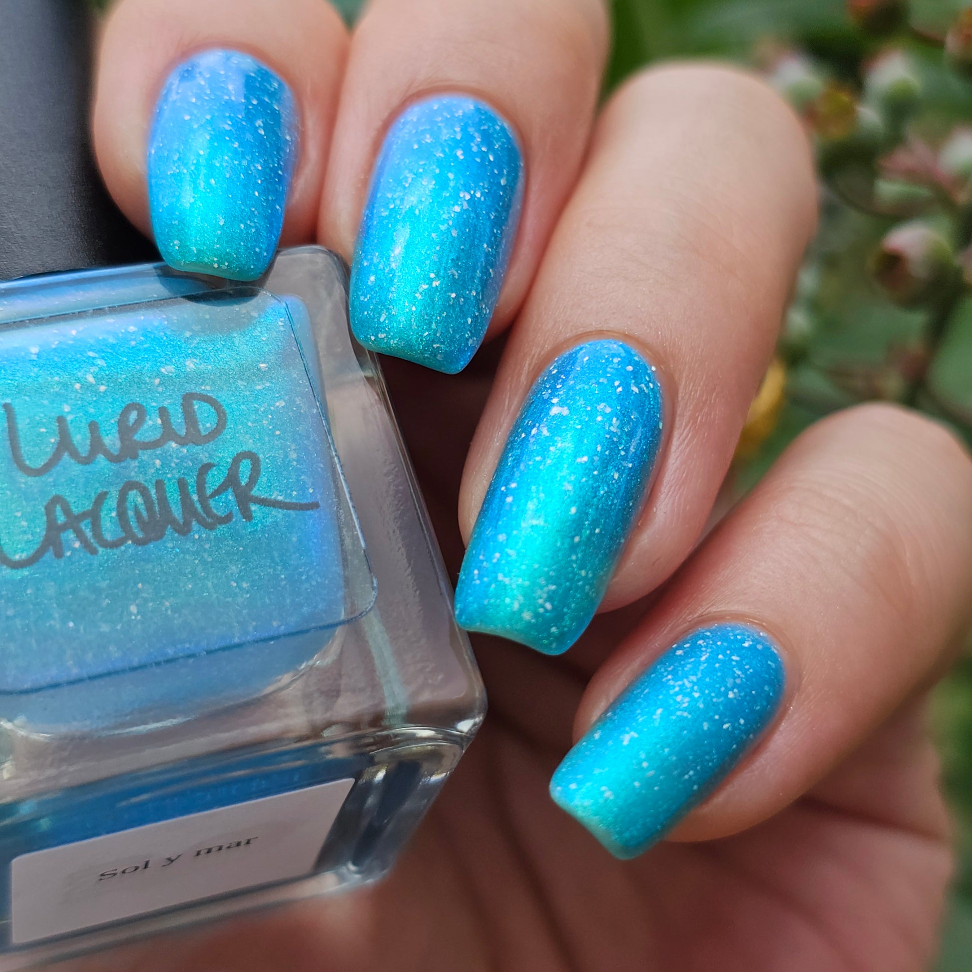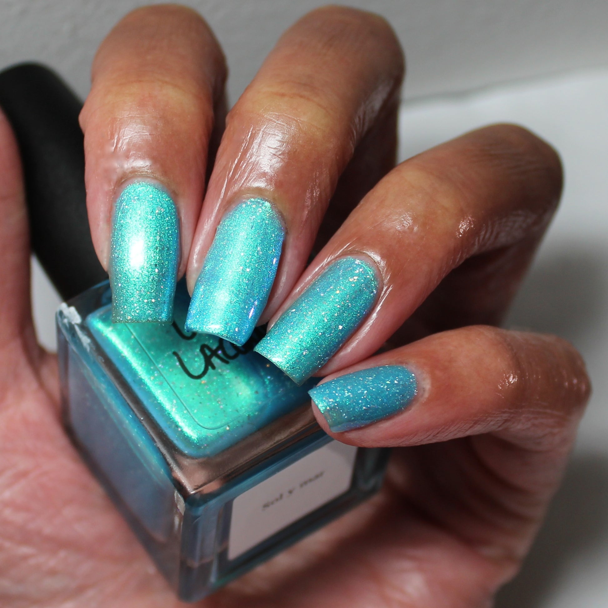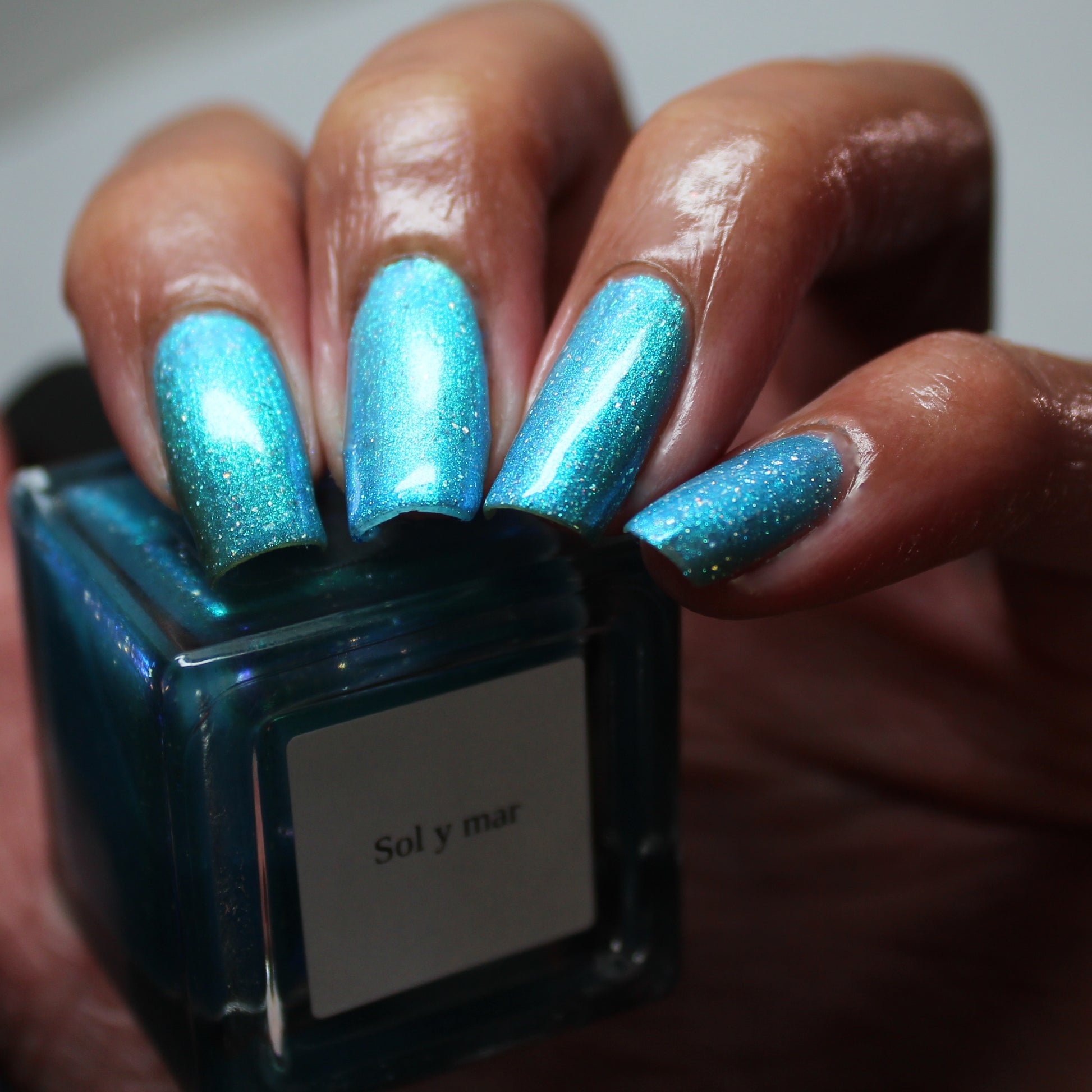 A cerulean crelly base with green to blue shimmer and micro holographic flakes