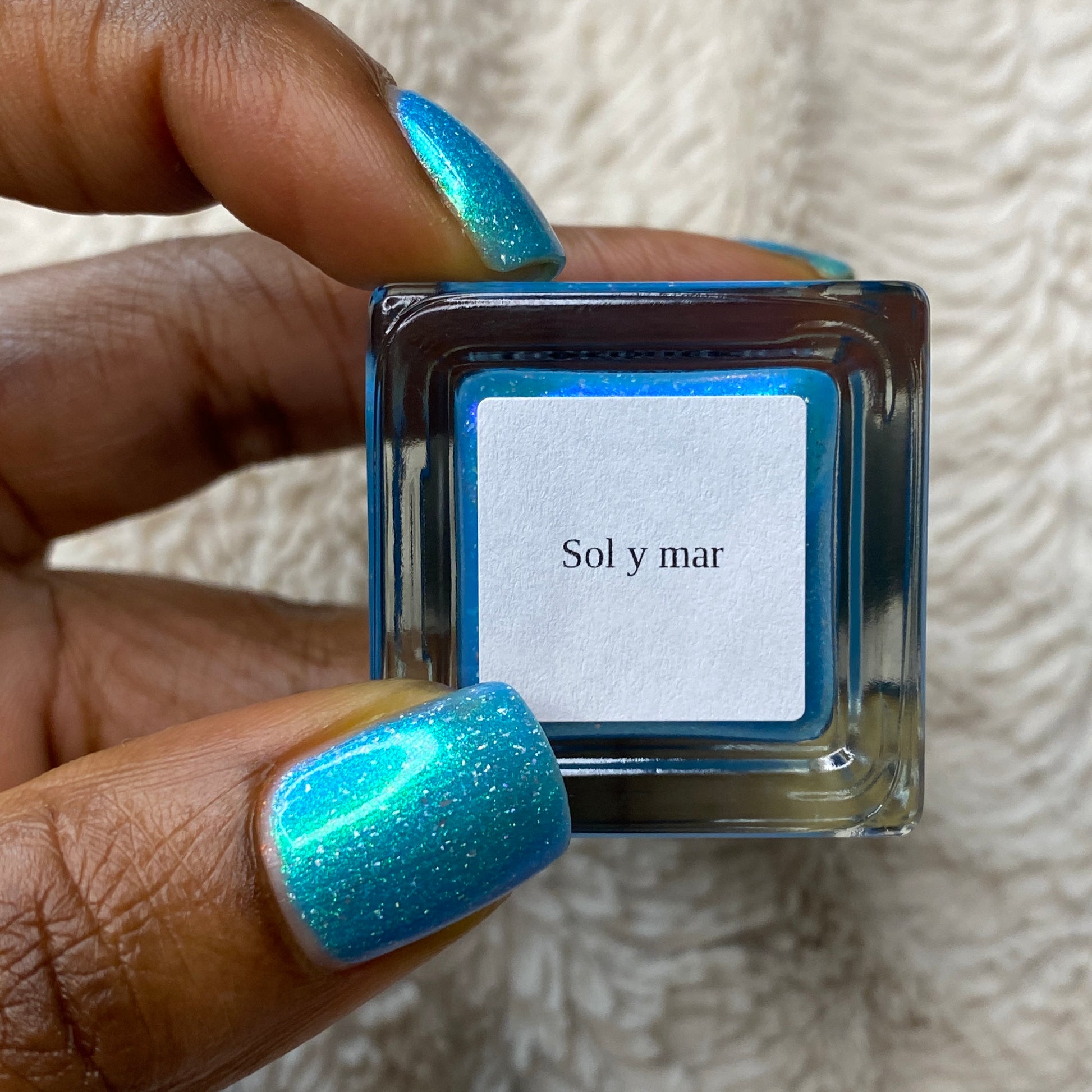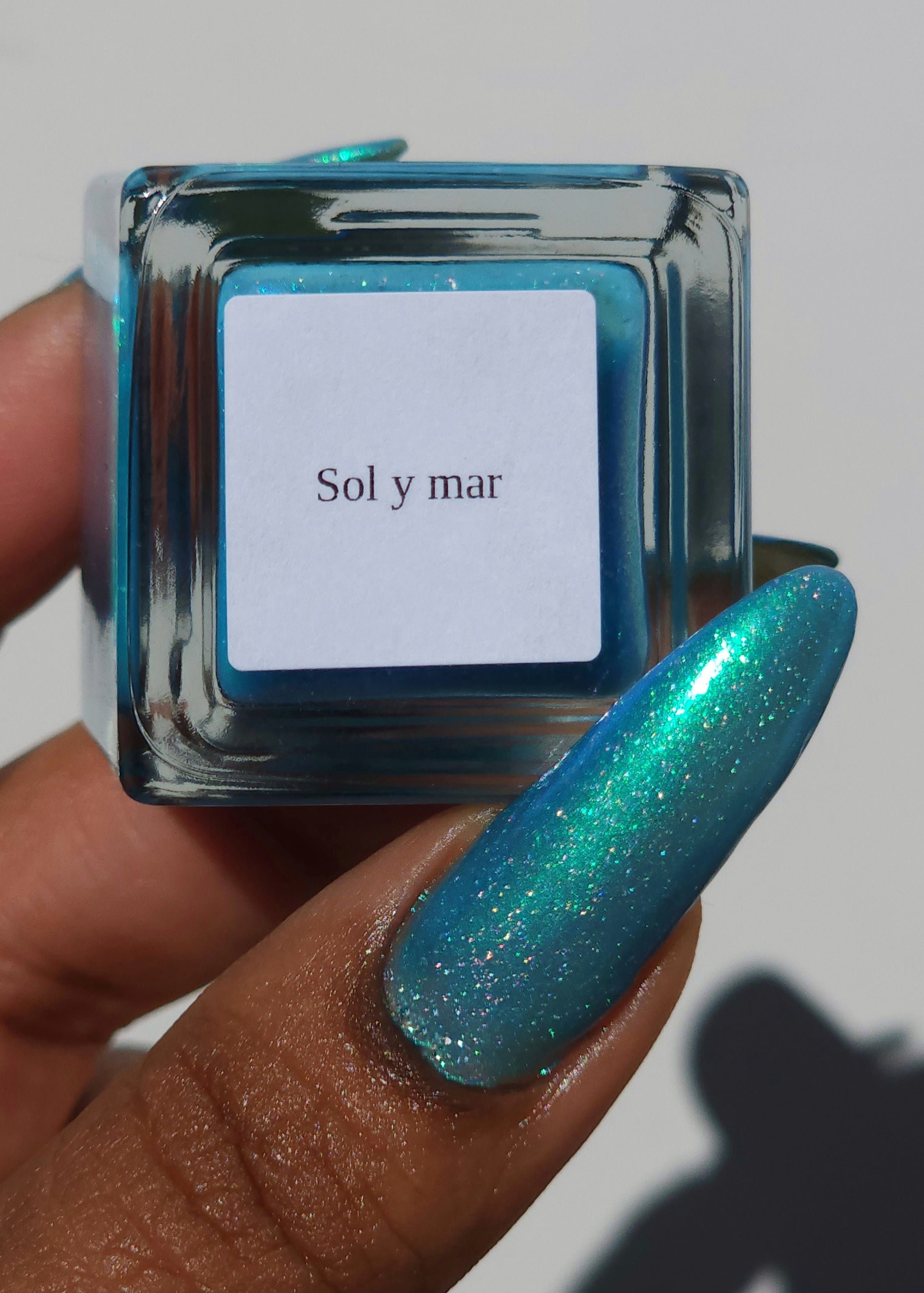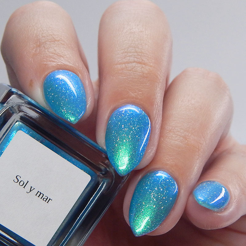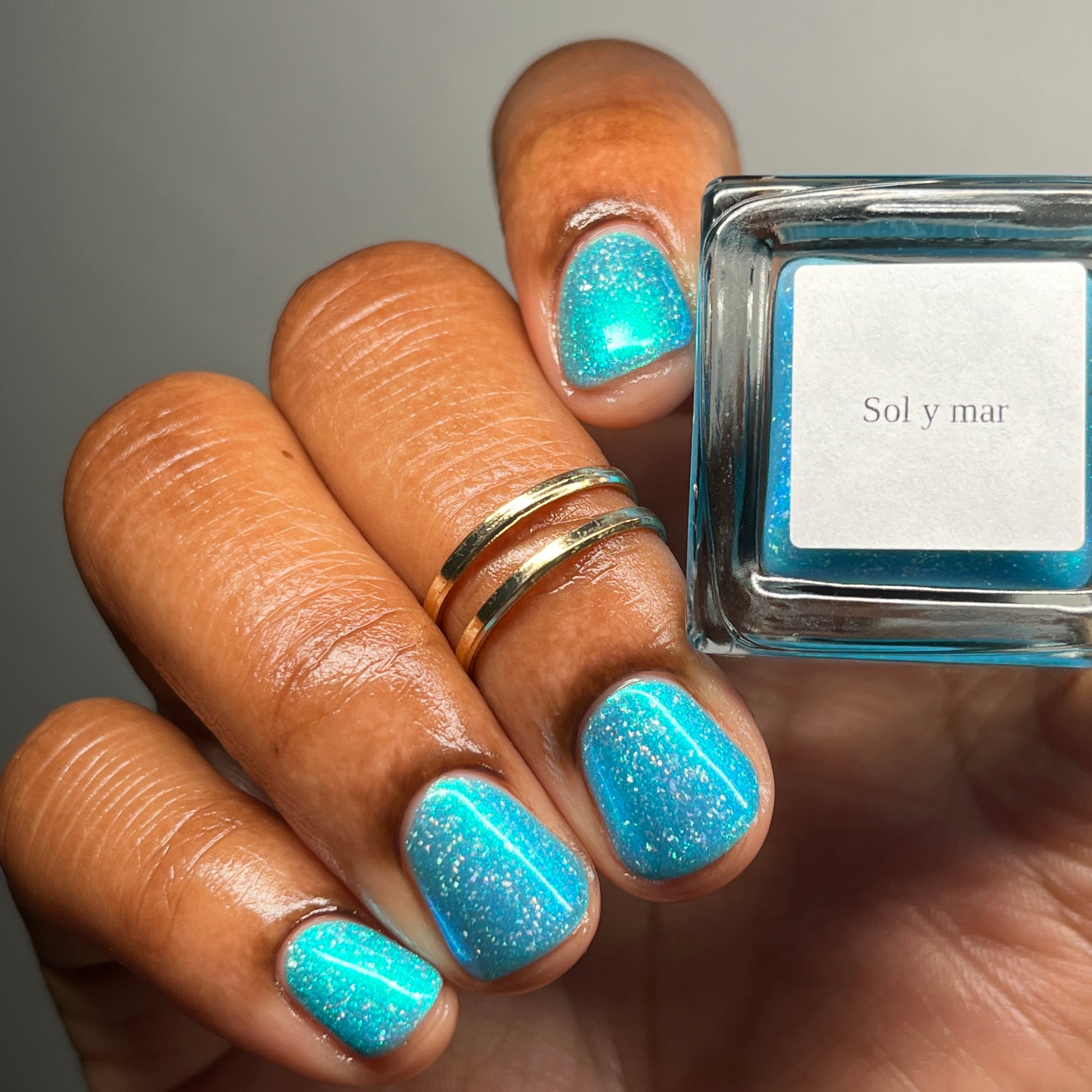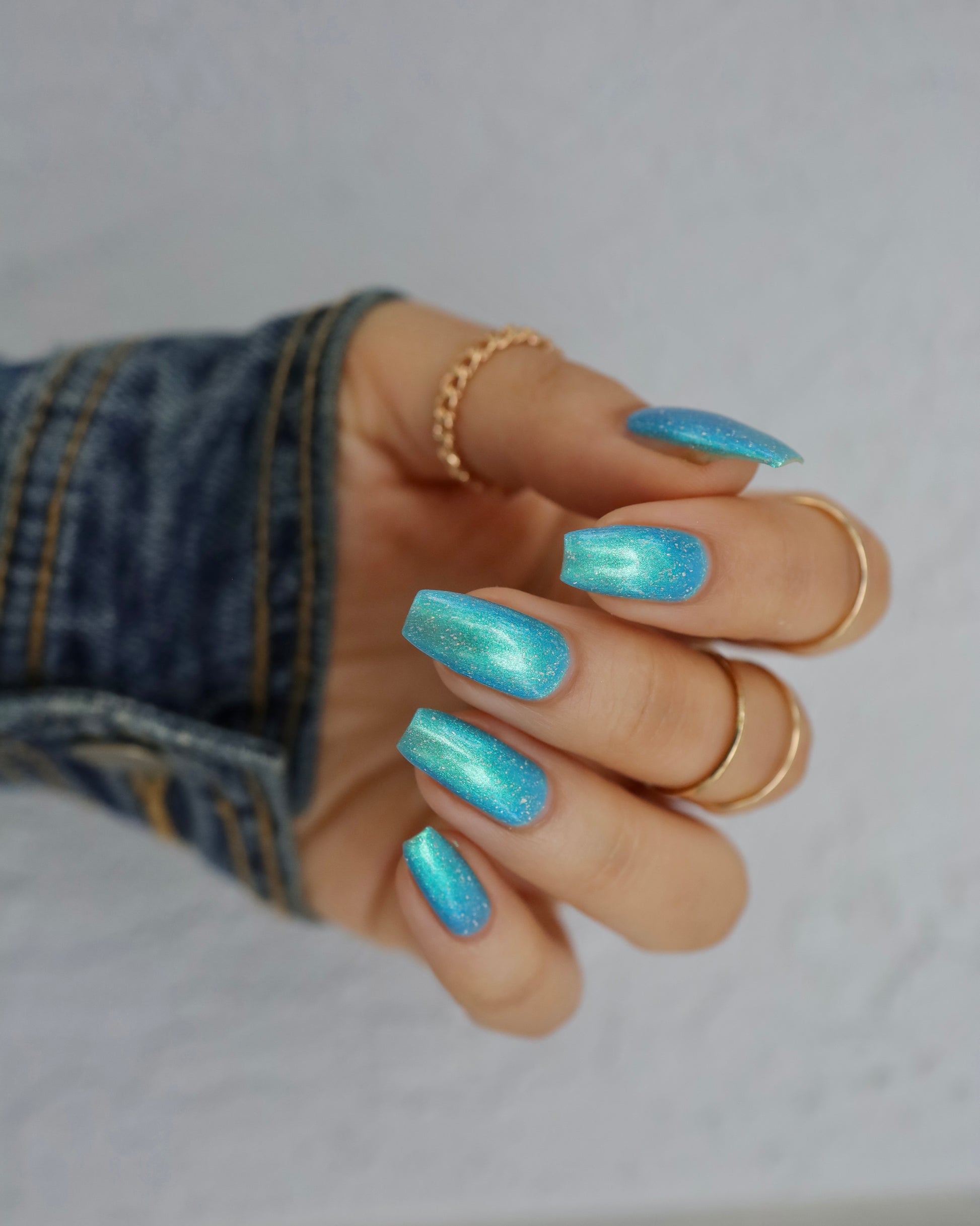 A cerulean crelly base with green to blue shimmer and micro holographic flakes