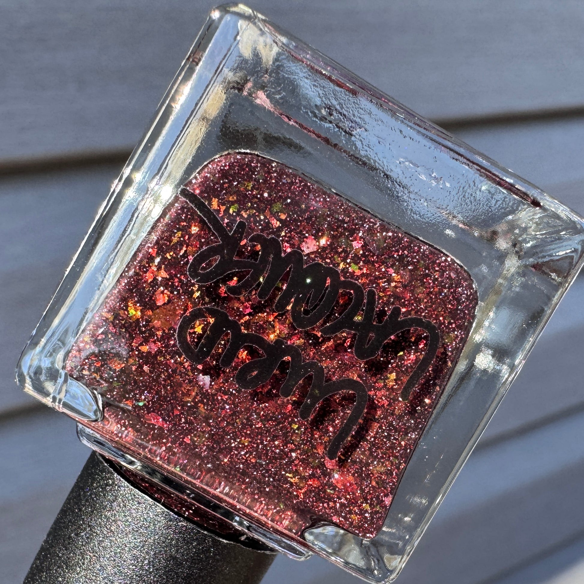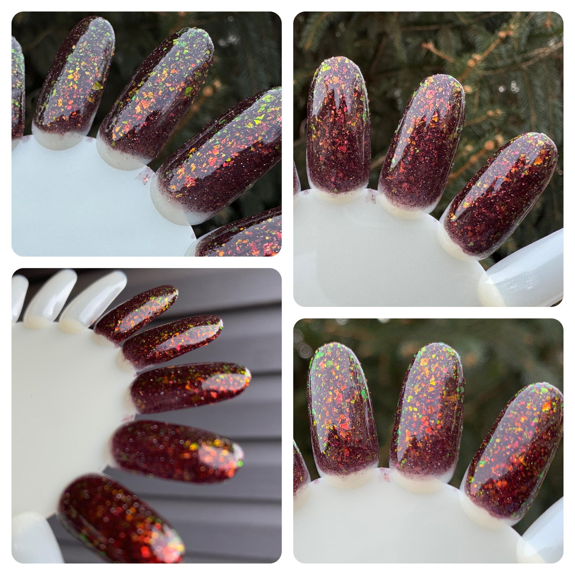 Sparkling Embers features a brown jelly base with red light reflective glitter and iridescent flakes that shift from orange to gold to green.