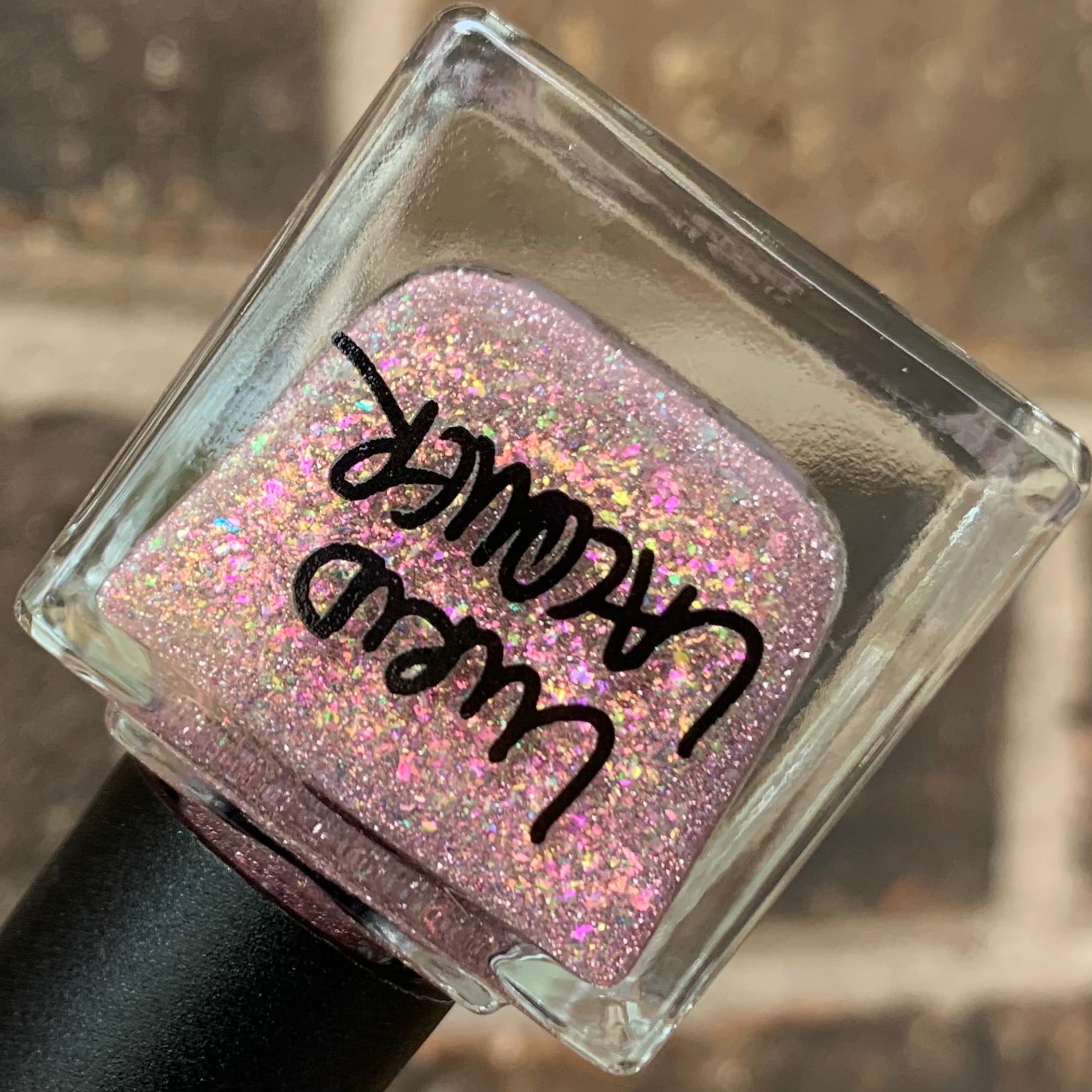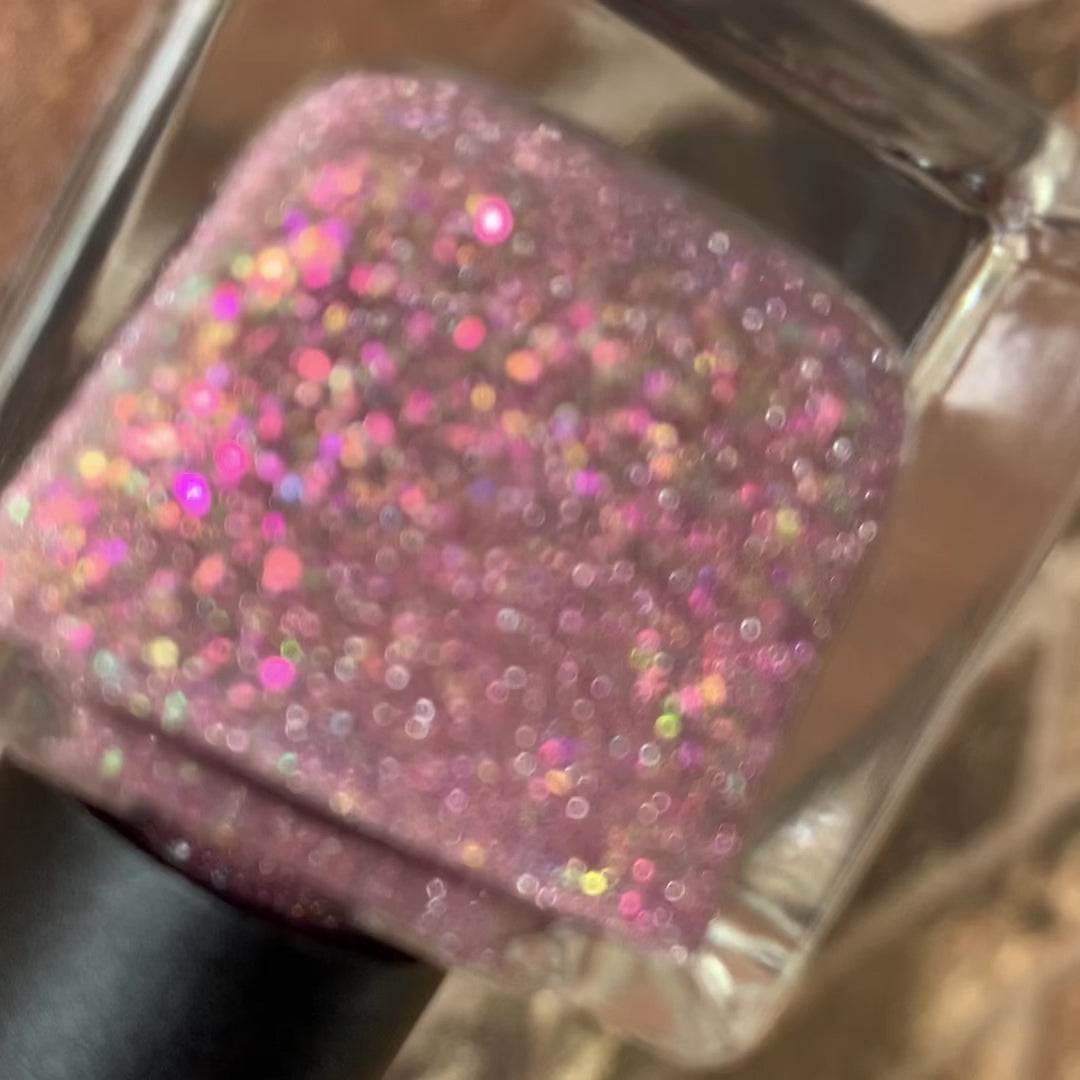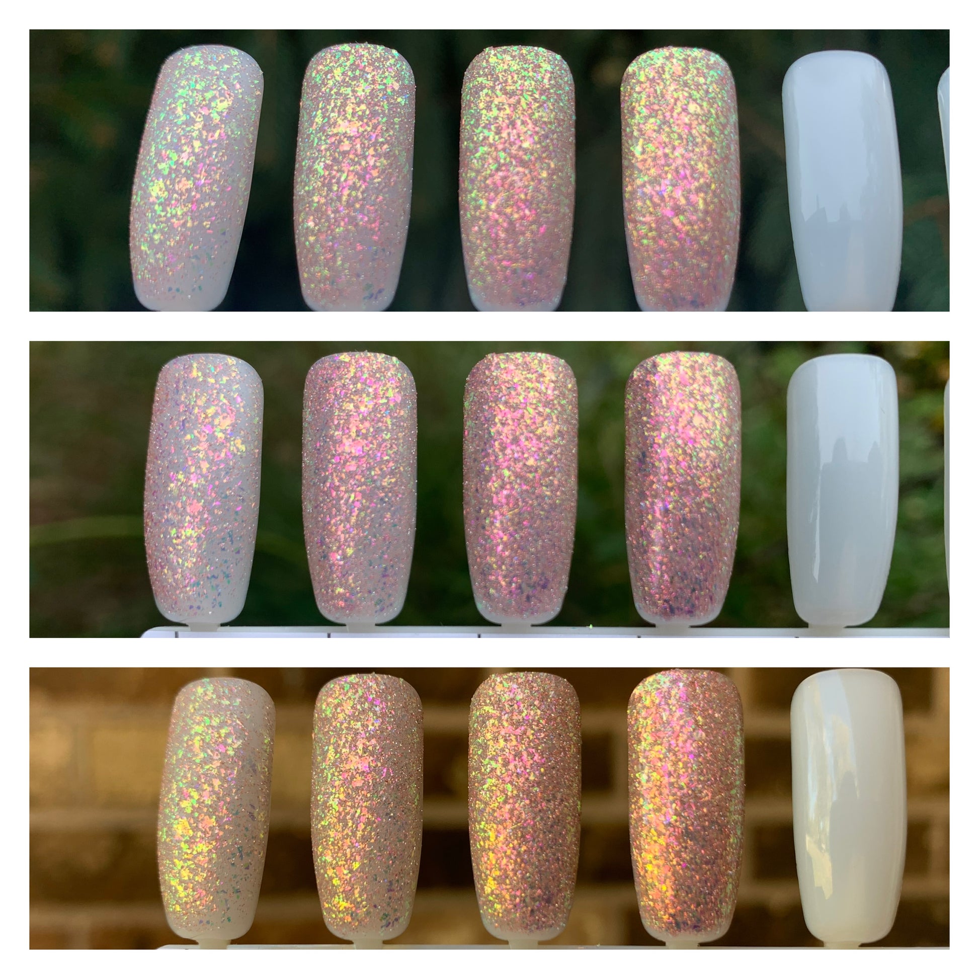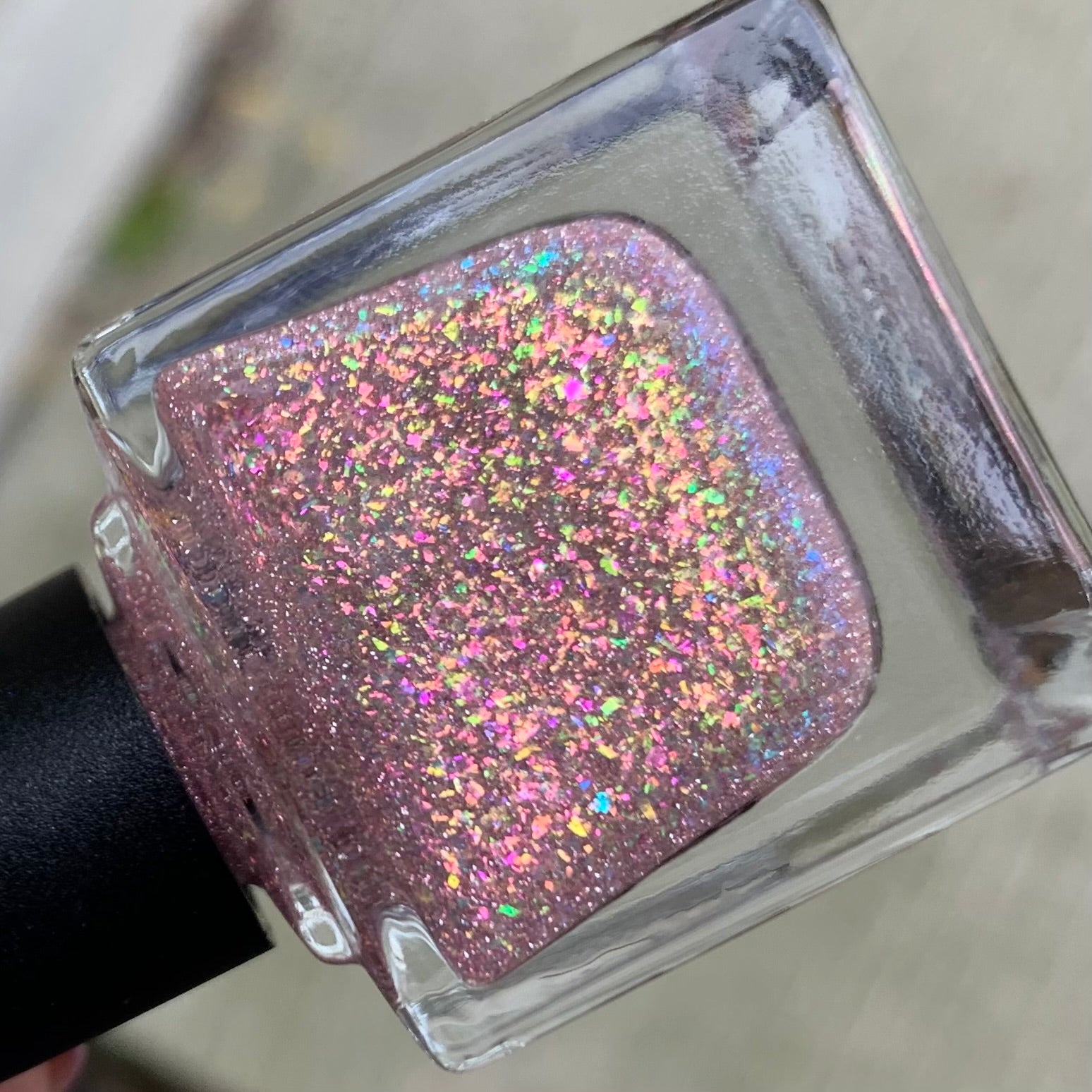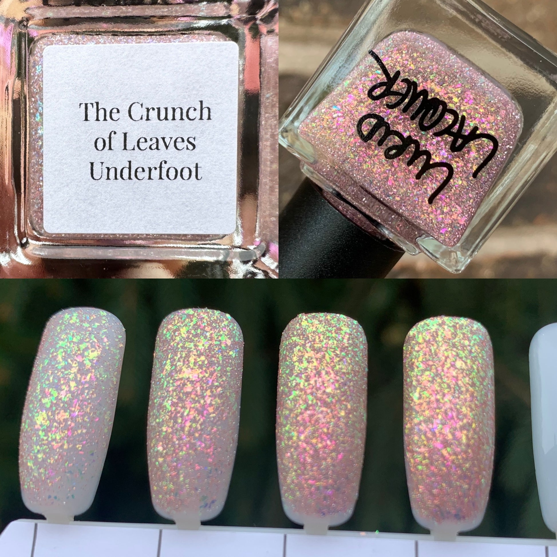 The Crunch of Leaves Underfoot features a clear base packed with peachy pink light reflective glitter and glowy pink and peach iridescent flakies that shift to orange, gold, and green.