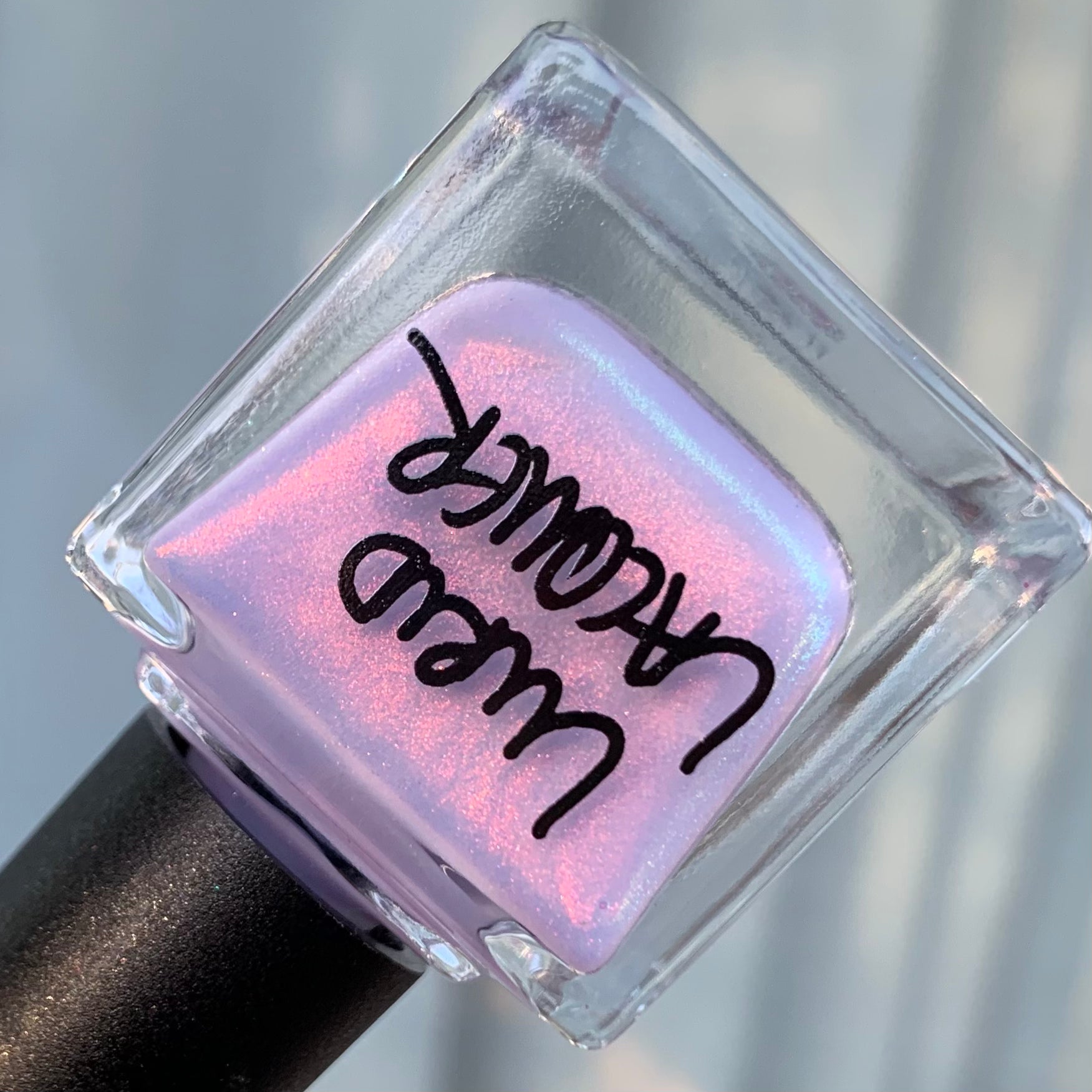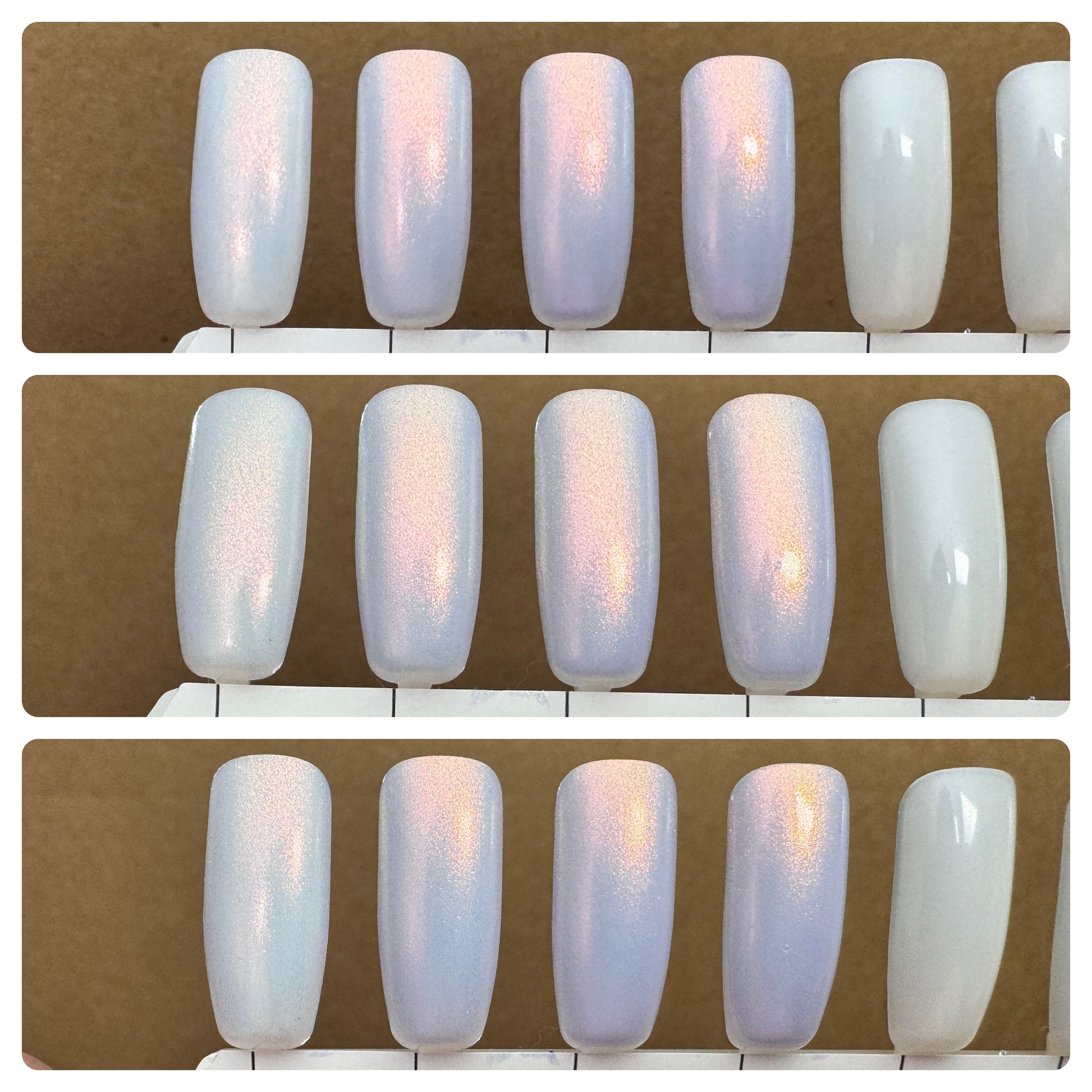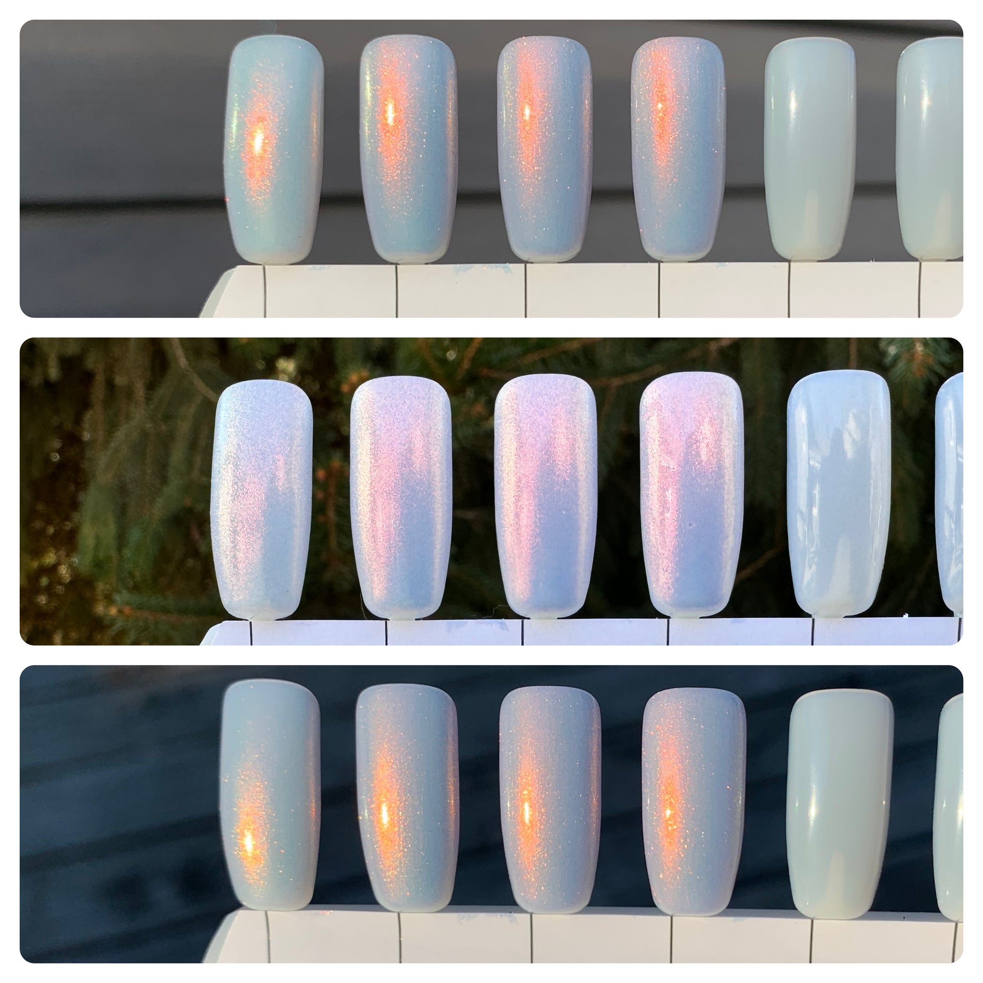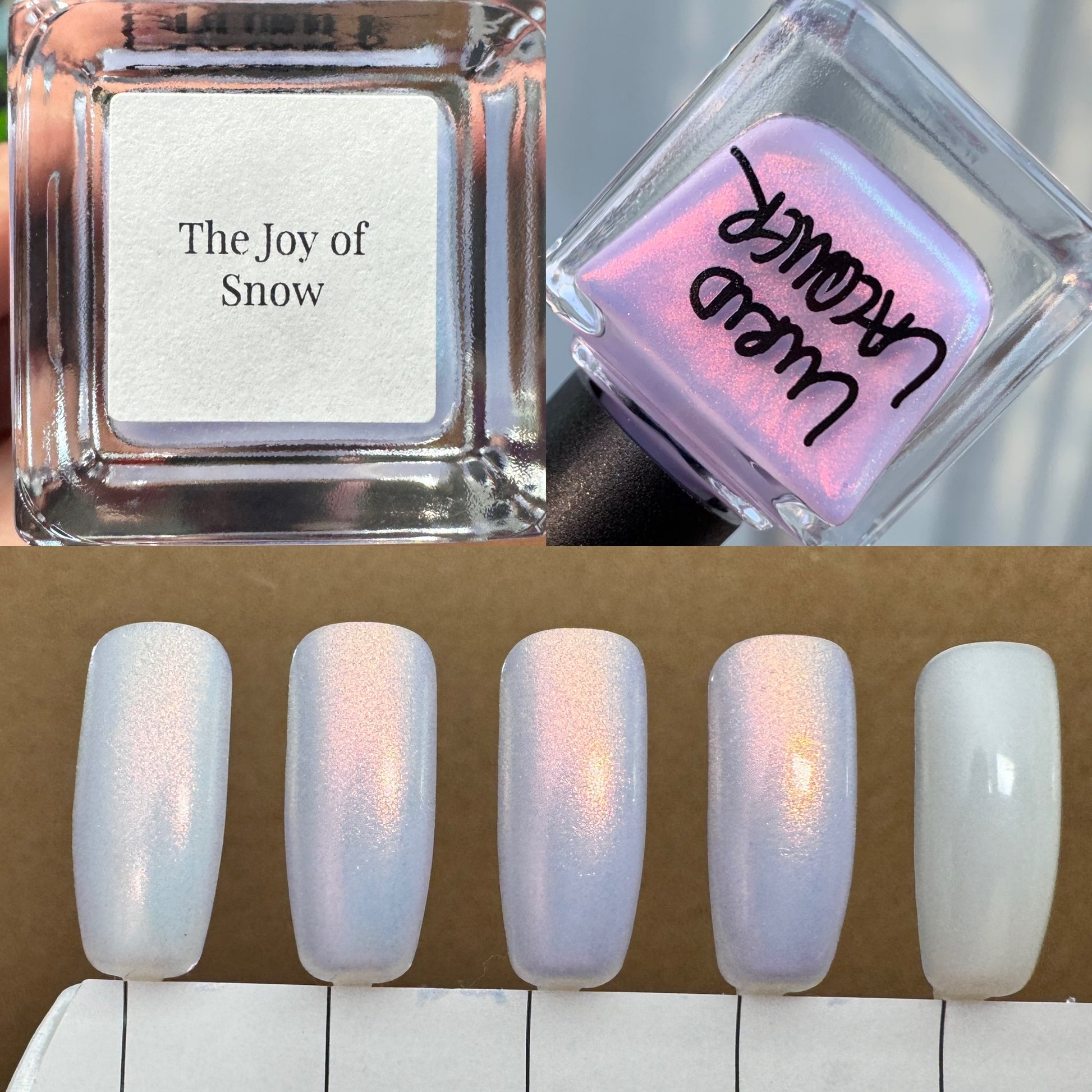 The Joy of Snow features a cool white crelly base with a hint of a bluish lavender tint and aurora shimmer that shifts from a reddish orange to gold. On the nail, The Joy of Snow pulls a little bit more white than it looks in the bottle.