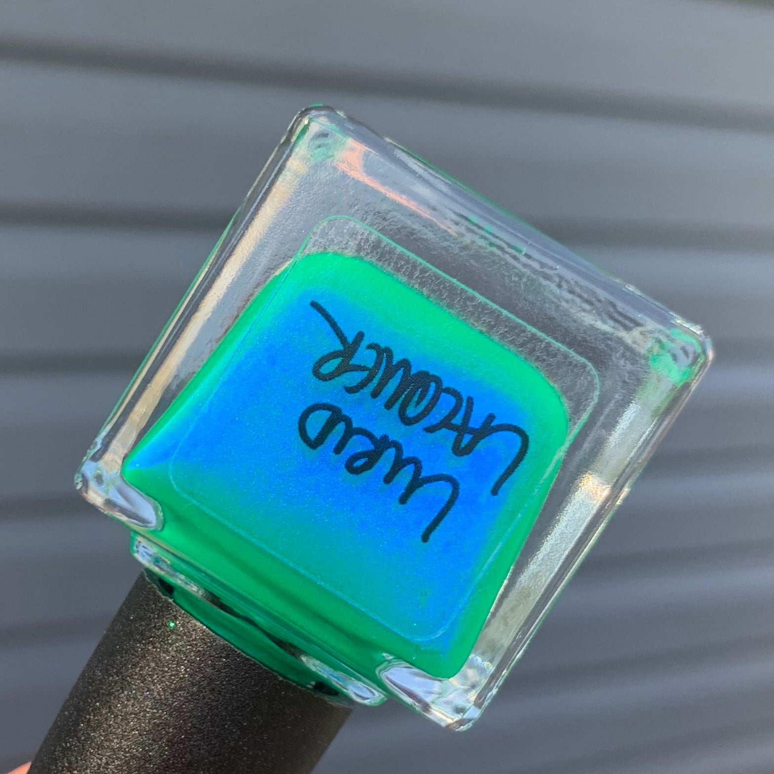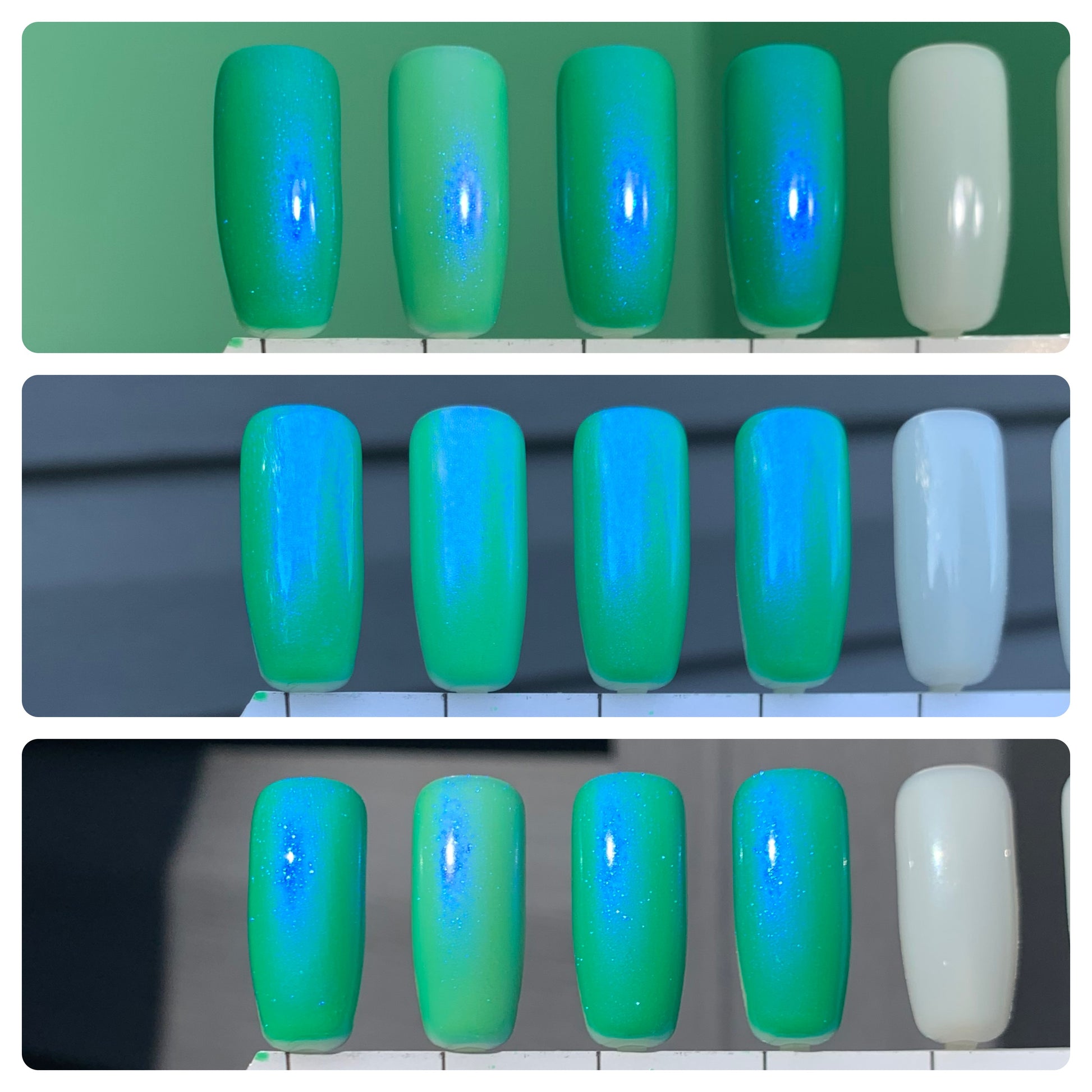 A neon-based malachite (read: cool-toned, mid-tone) green base with glowy blue shimmer that shifts to purple at extremes