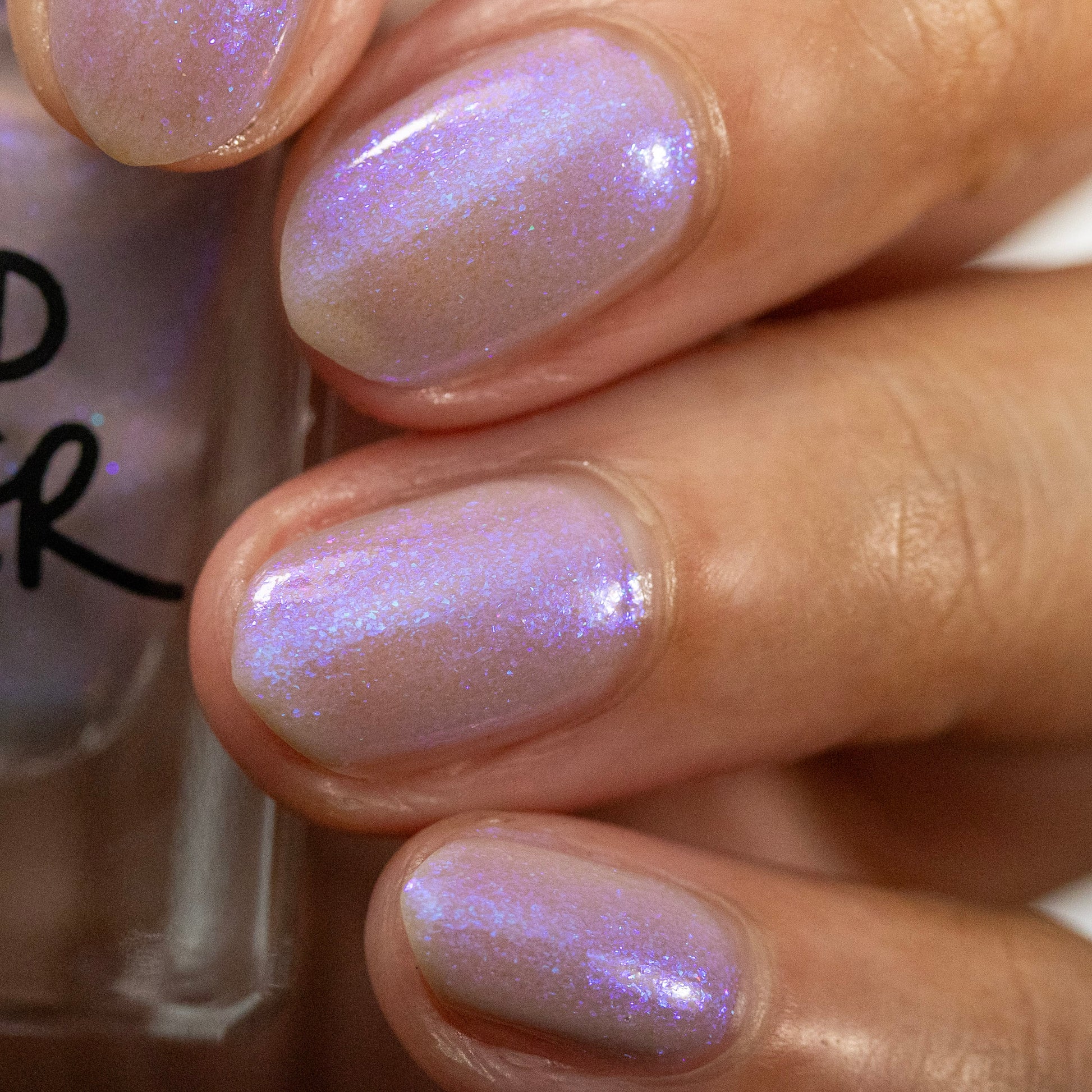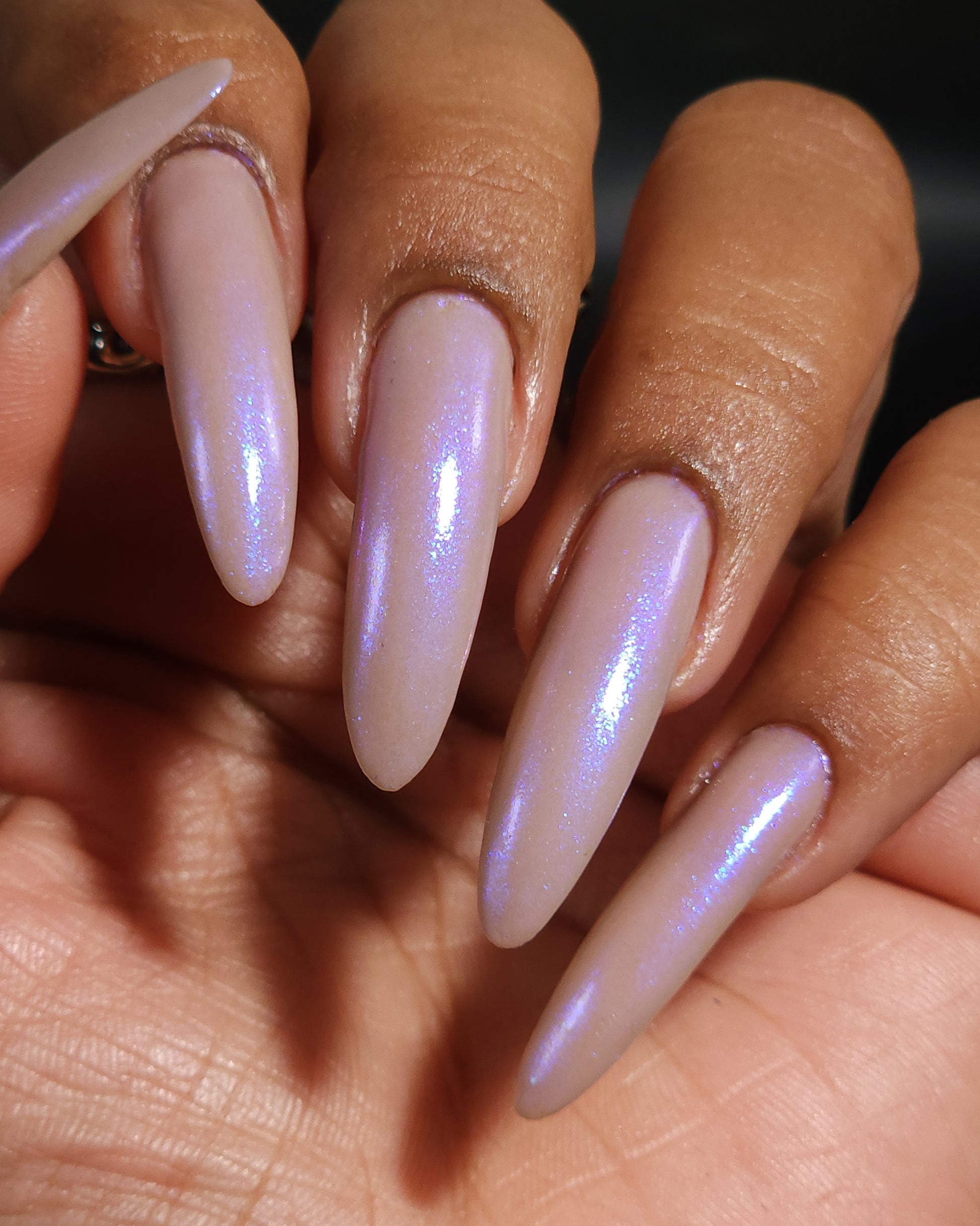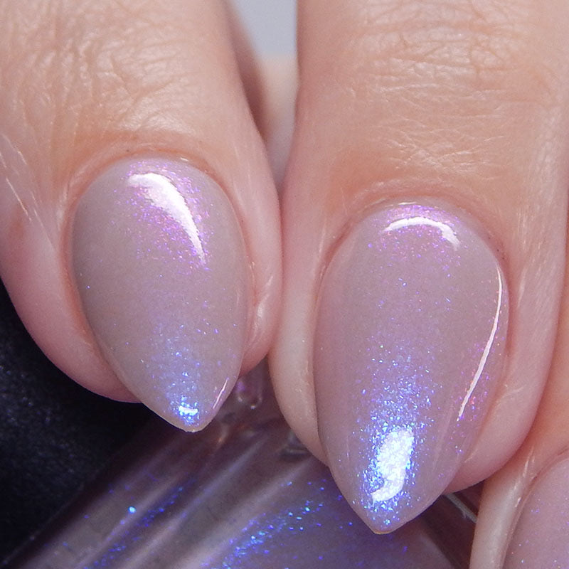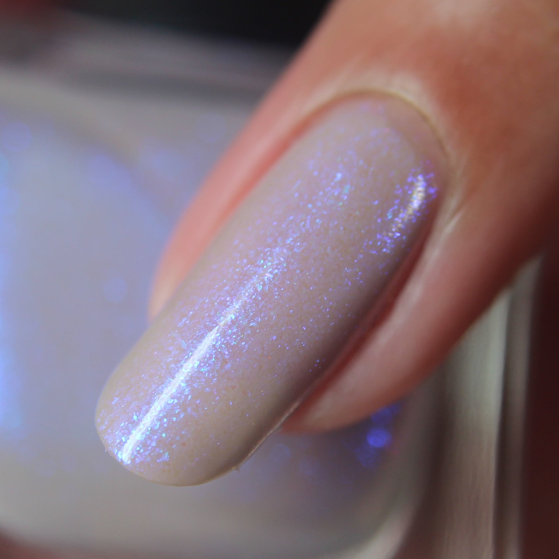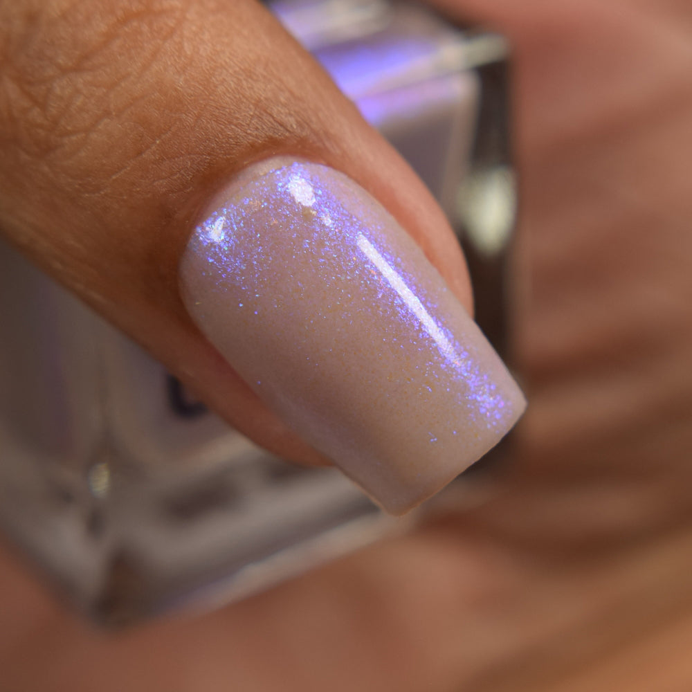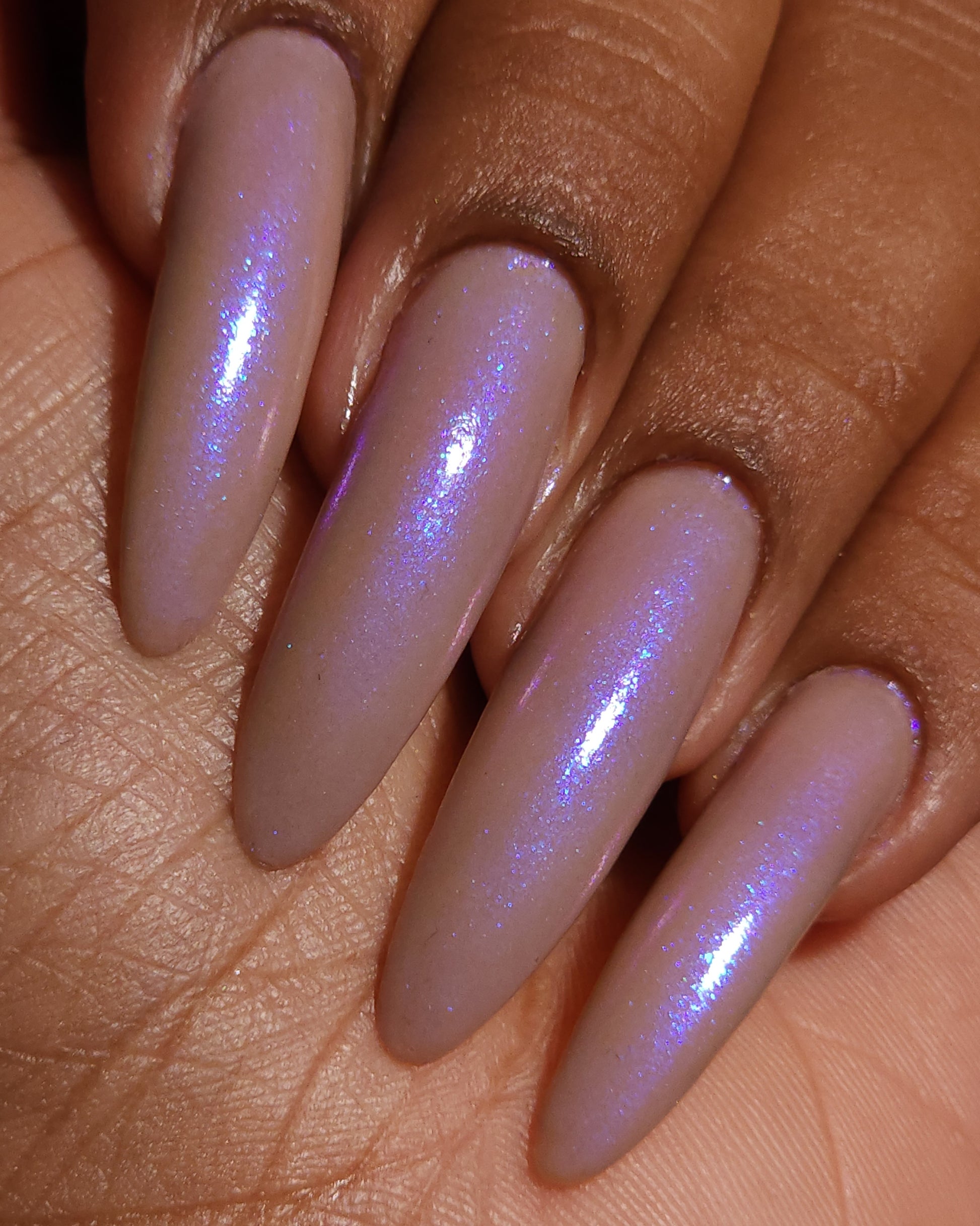 A cool-toned taupe base packed with glowy large particle shimmer that shifts from blue to purple (and to pink at extremes)