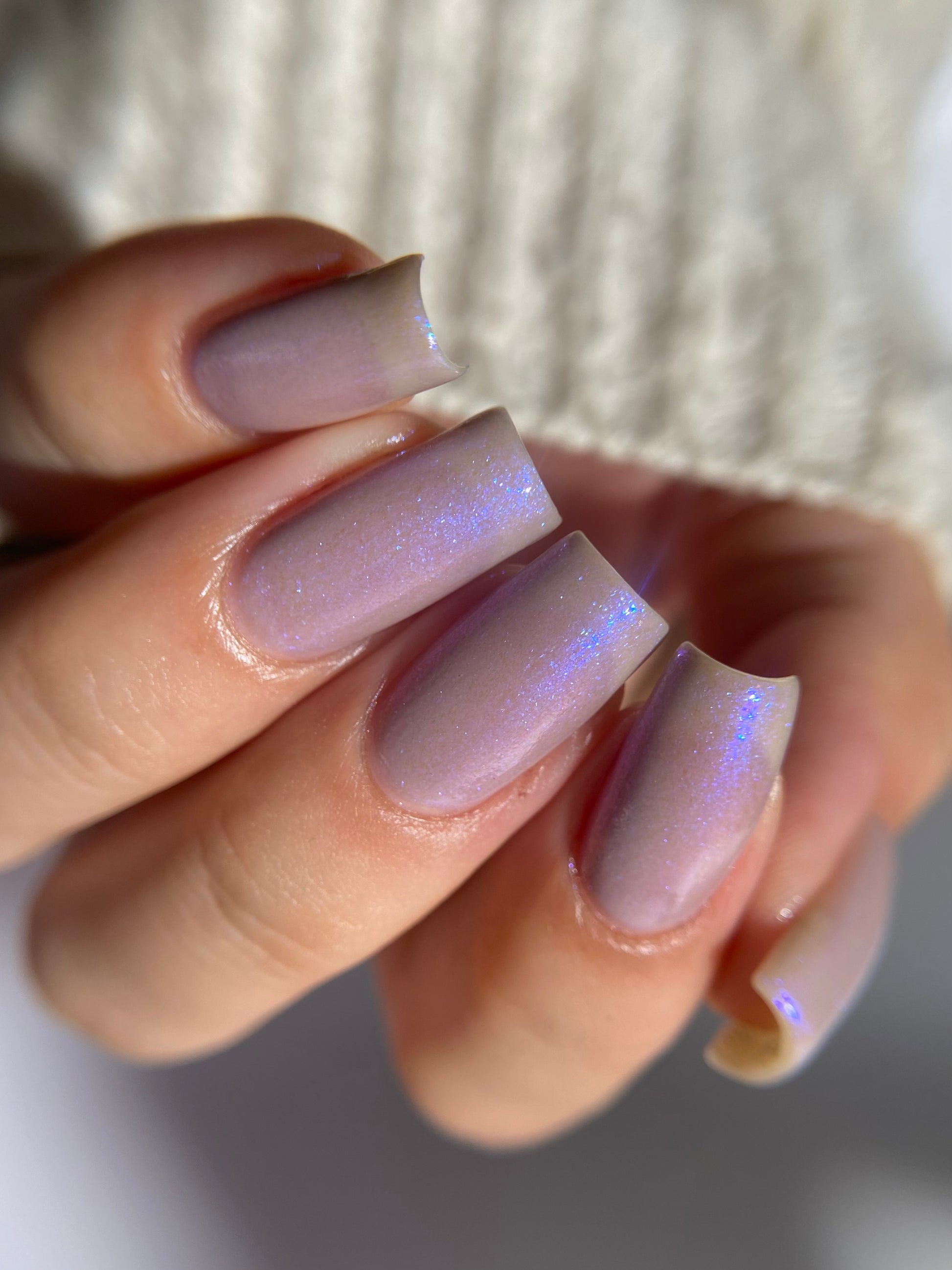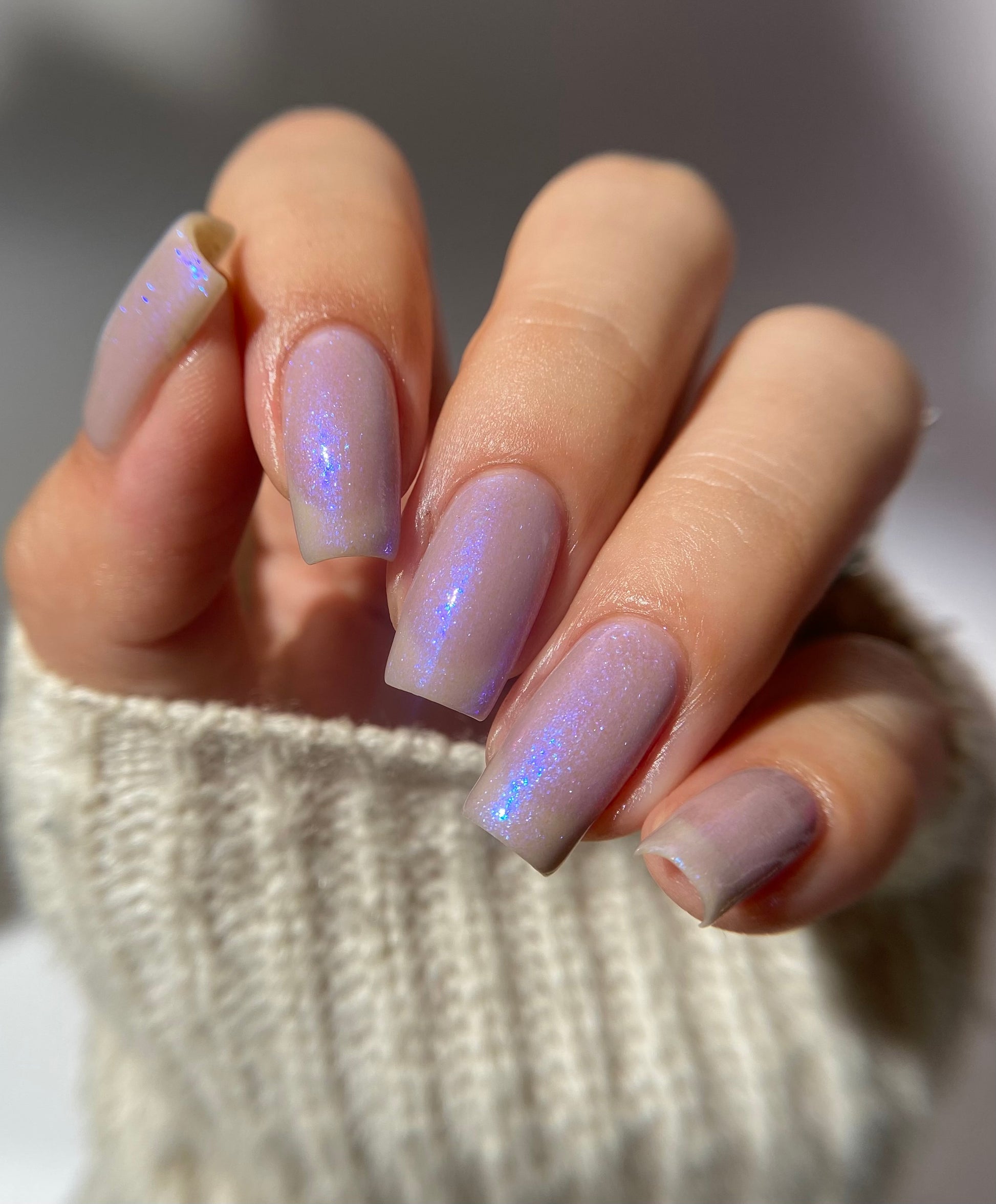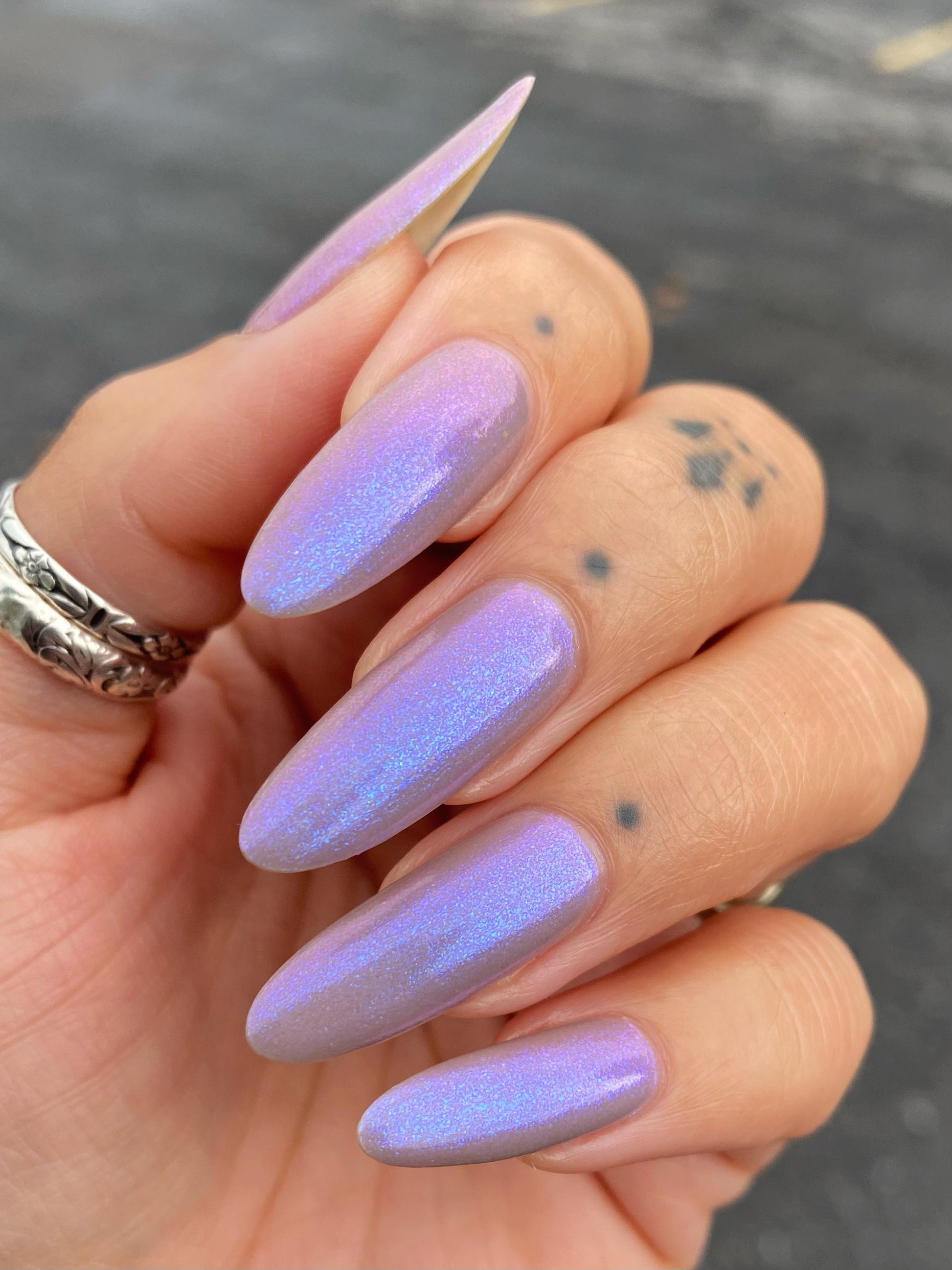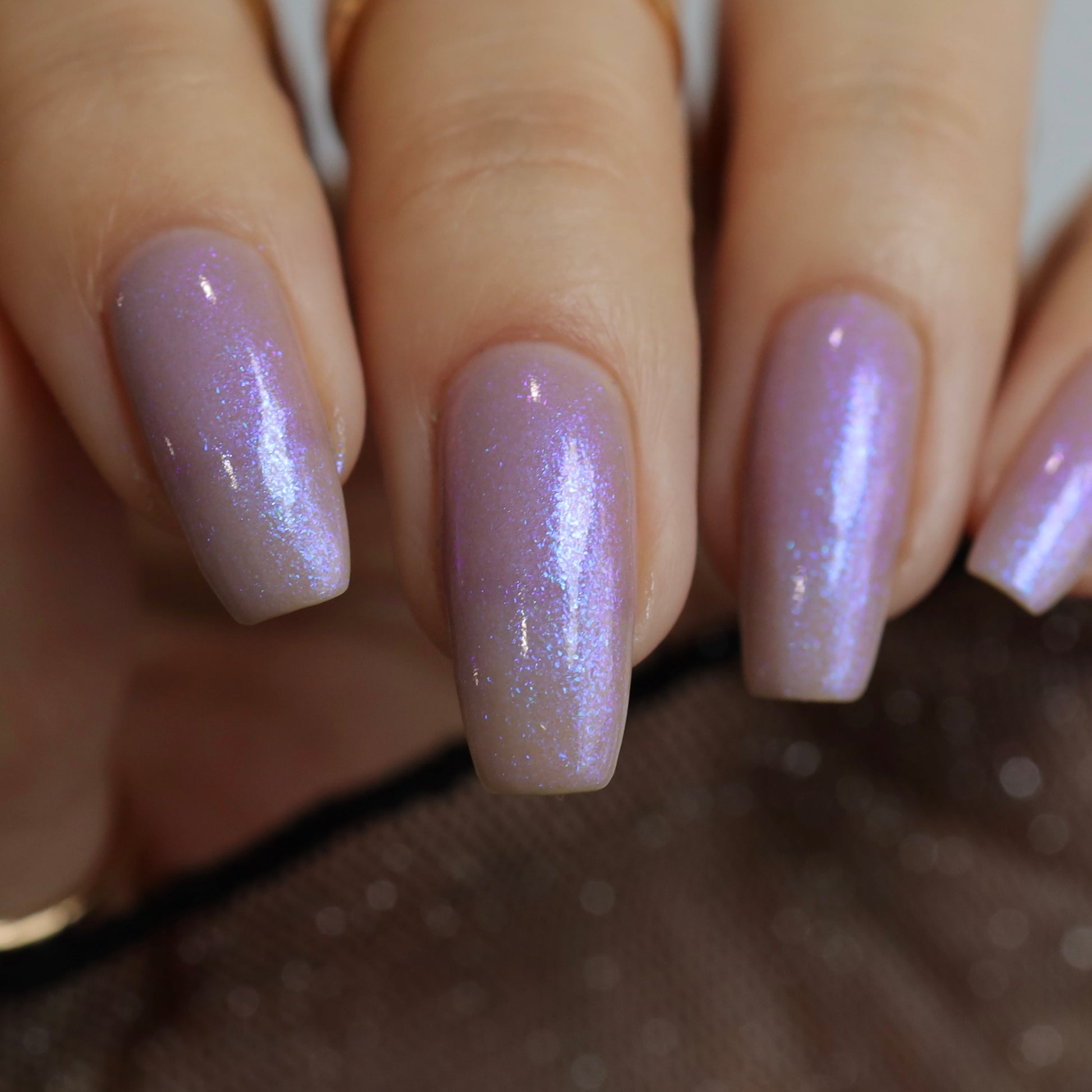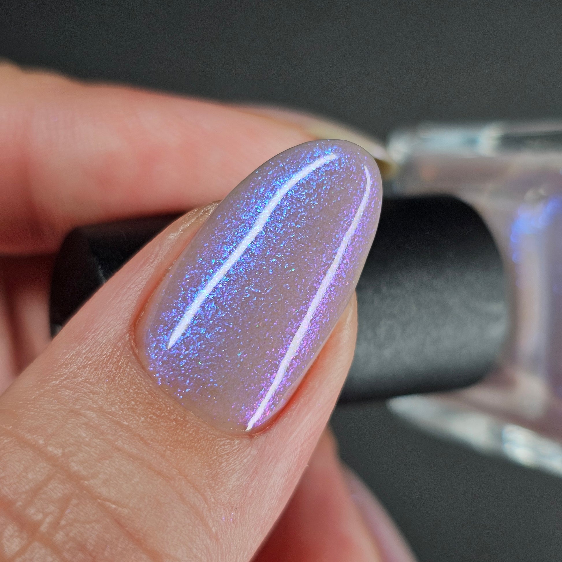 A cool-toned taupe base packed with glowy large particle shimmer that shifts from blue to purple (and to pink at extremes)