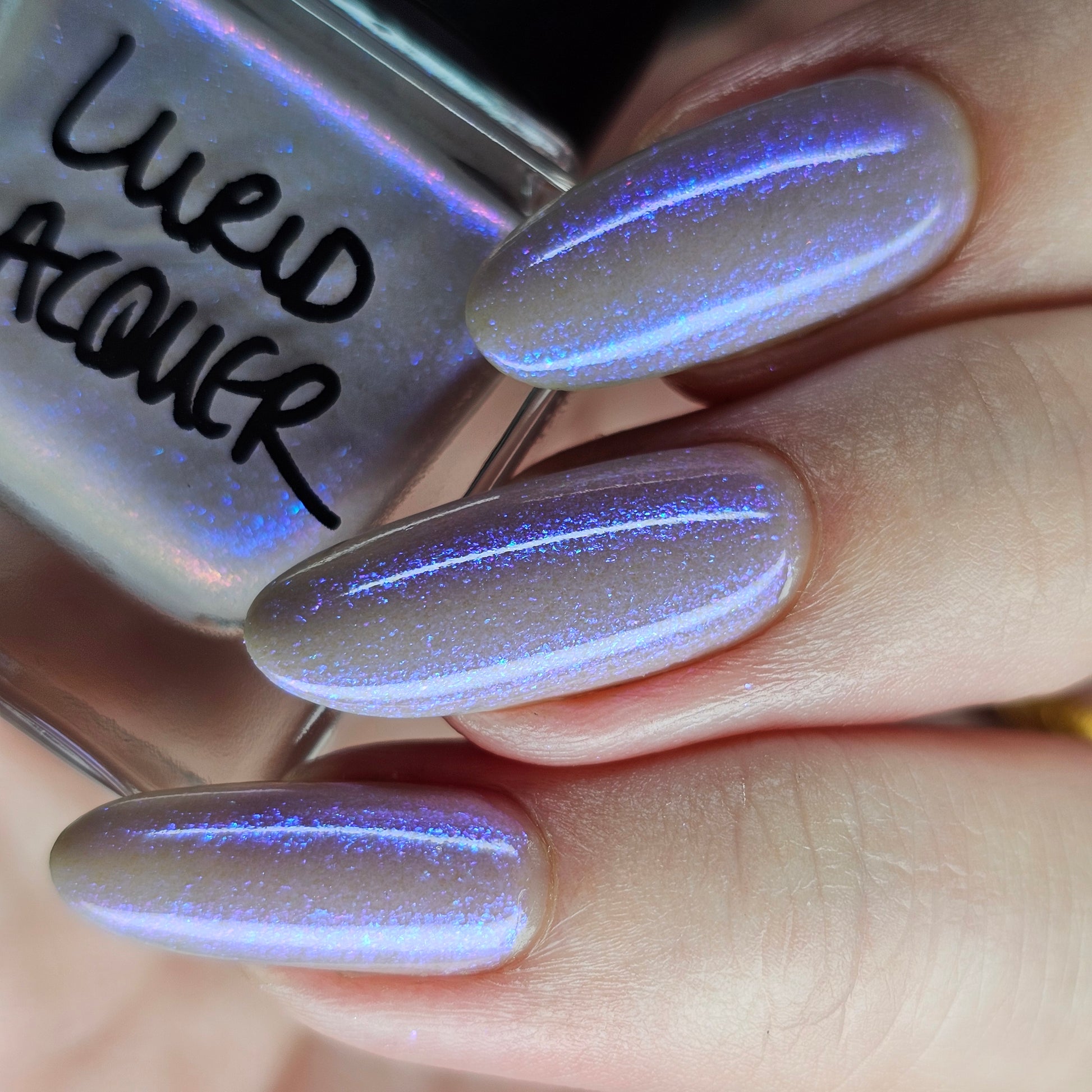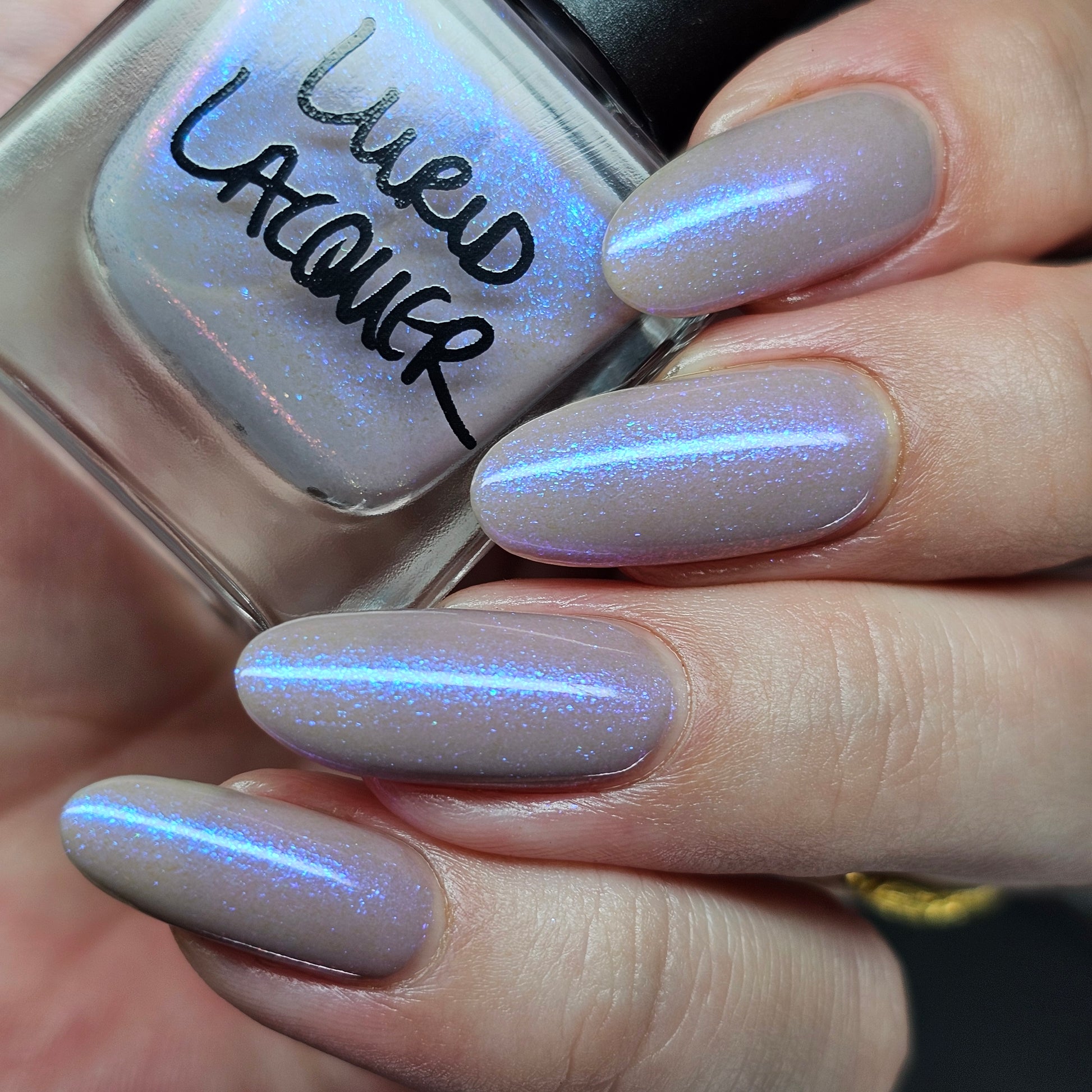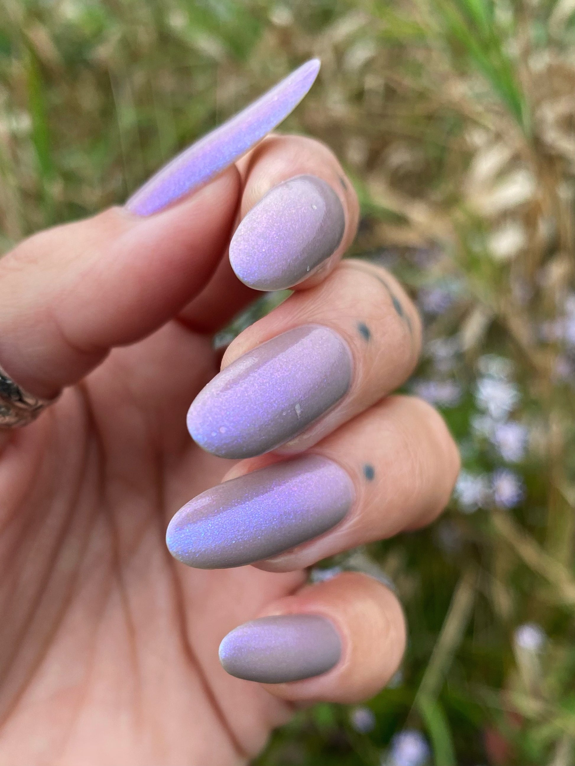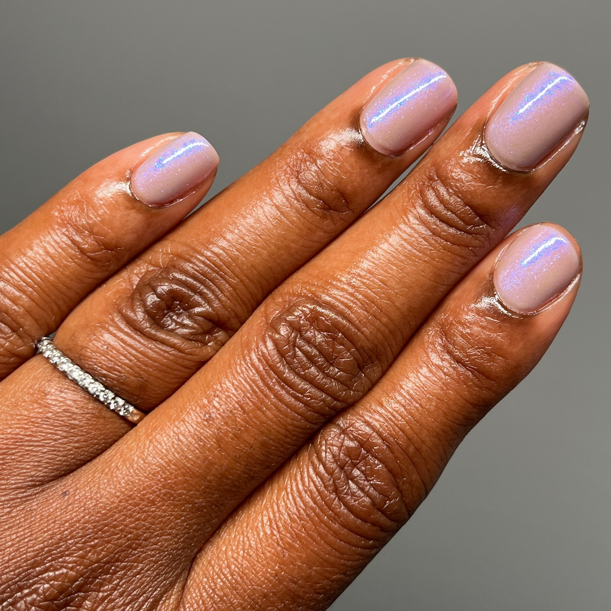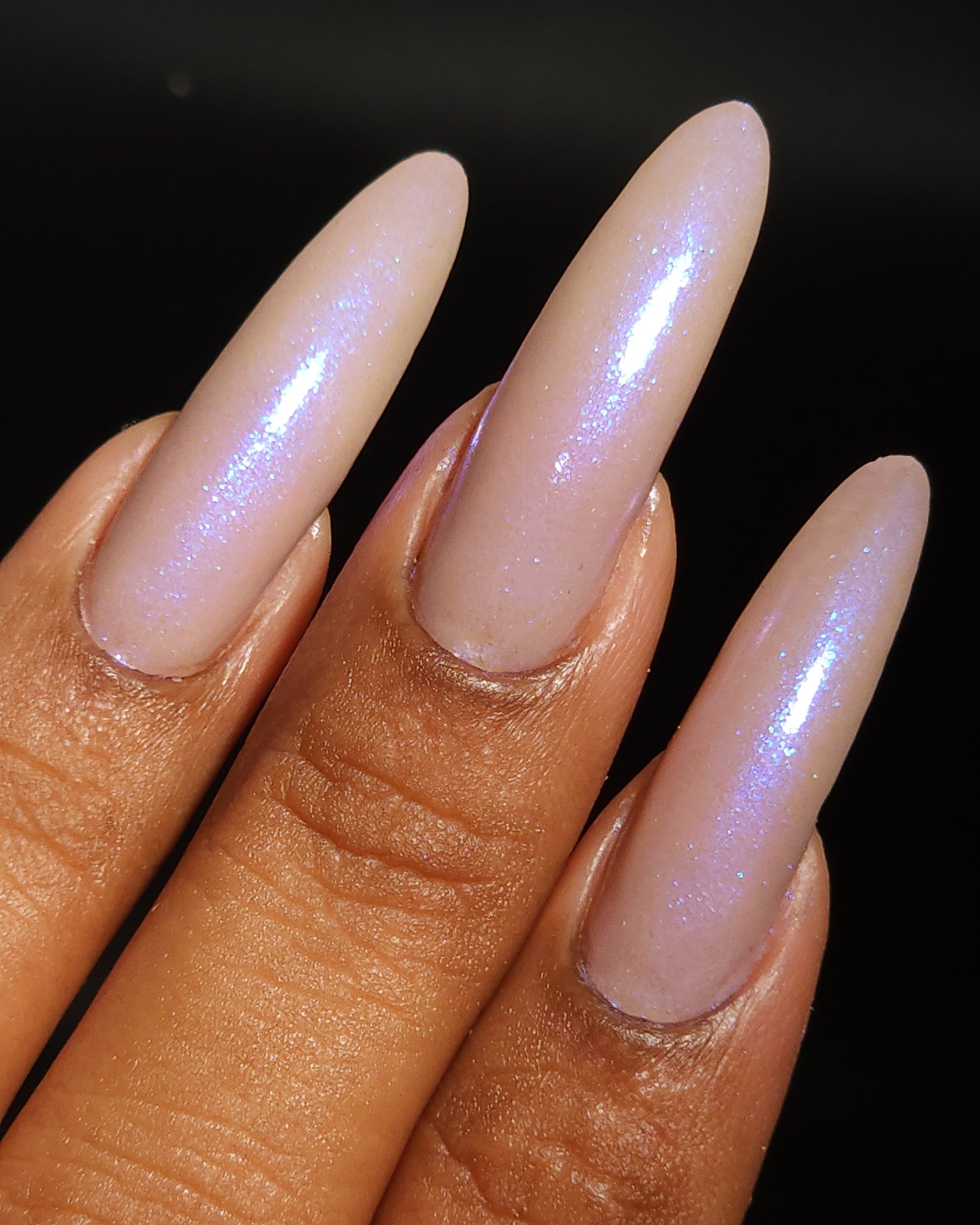 A cool-toned taupe base packed with glowy large particle shimmer that shifts from blue to purple (and to pink at extremes)