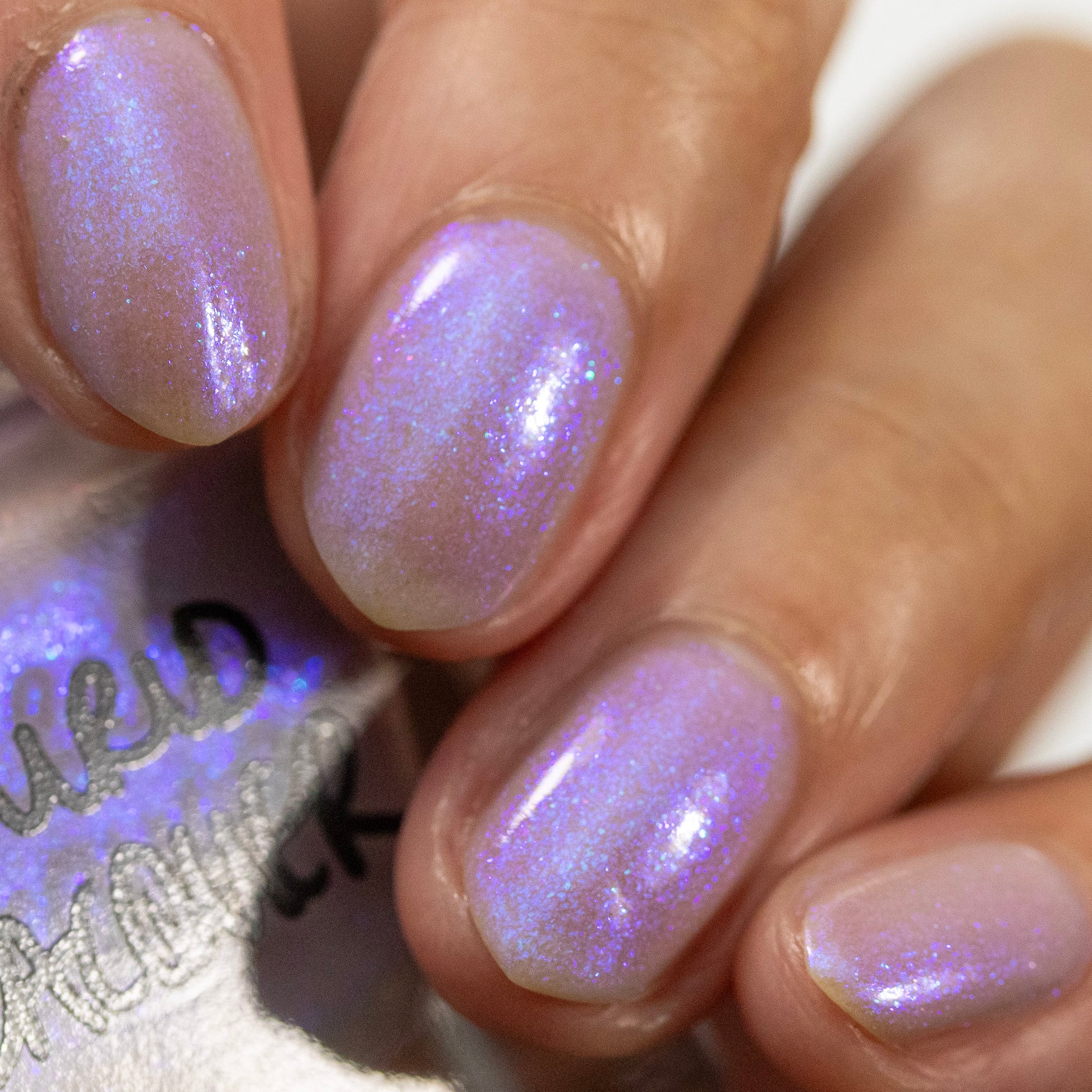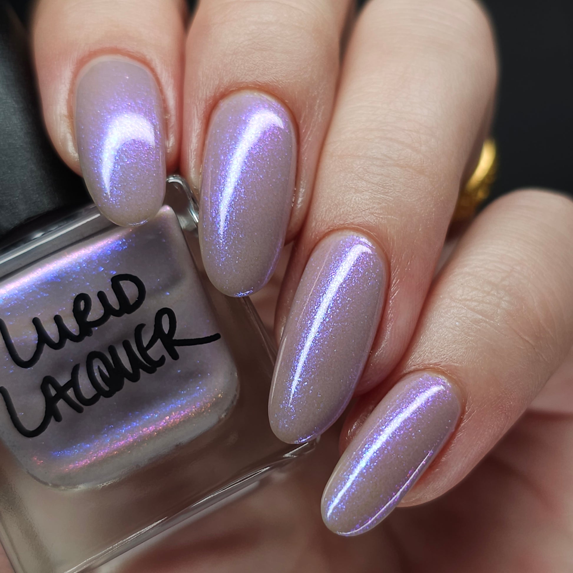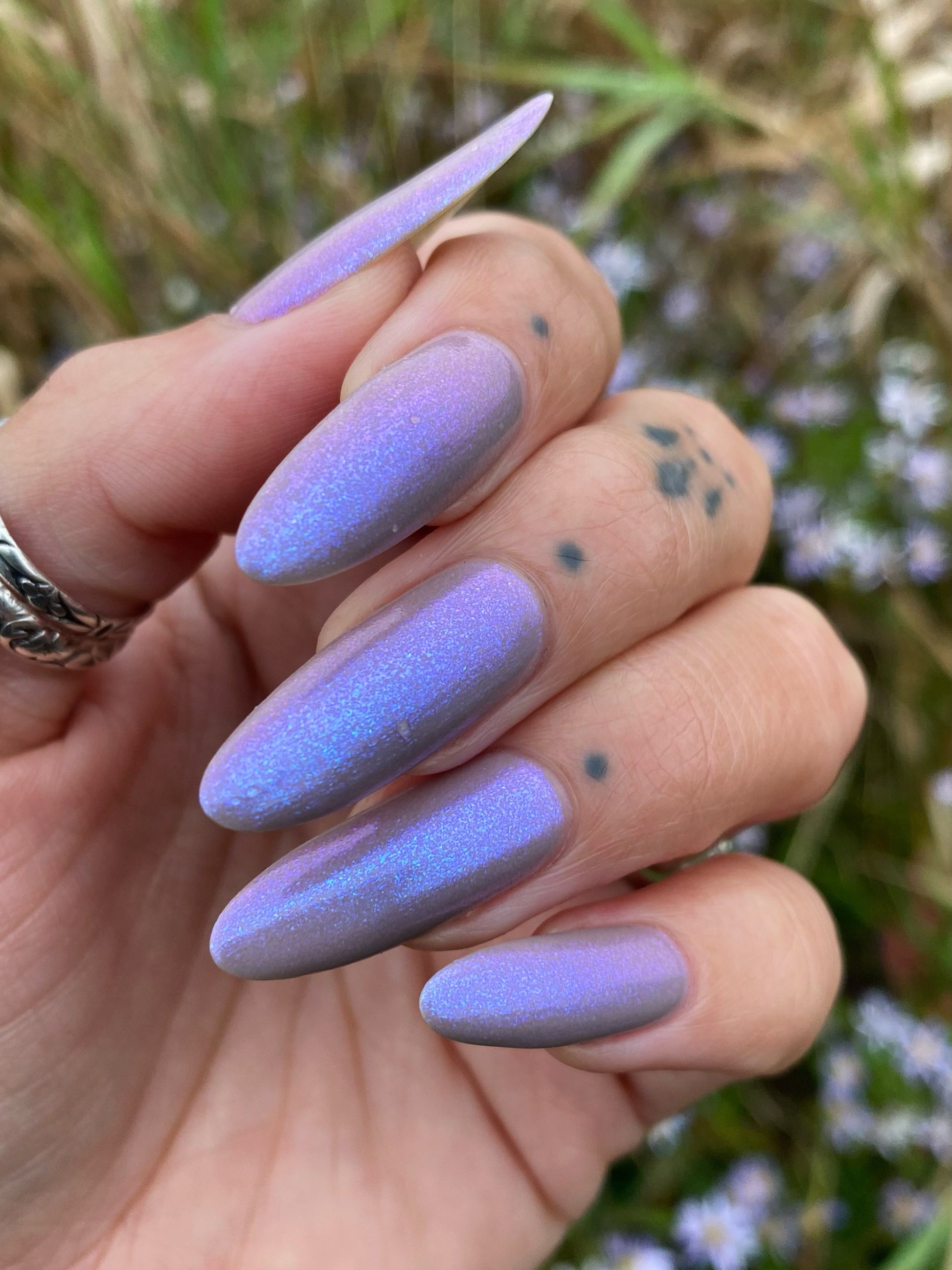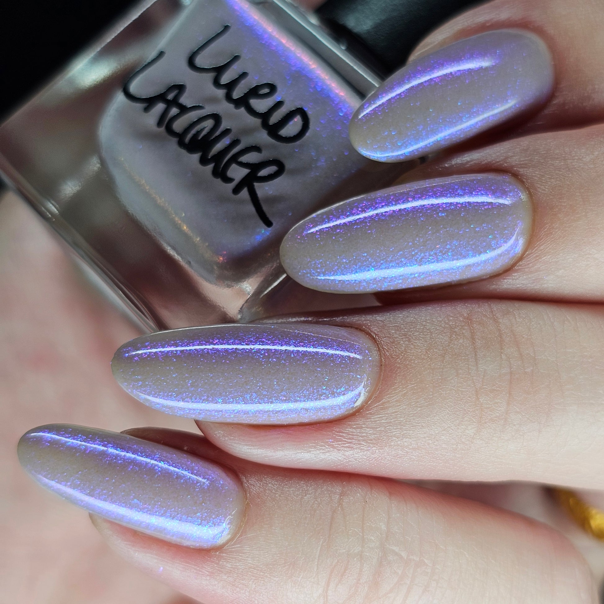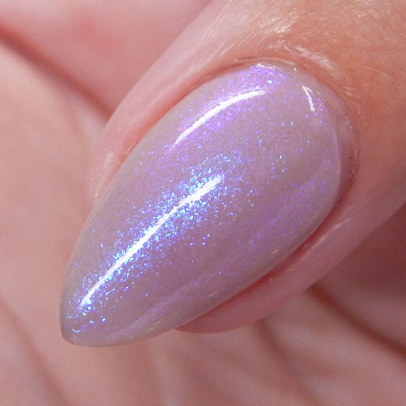 A cool-toned taupe base packed with glowy large particle shimmer that shifts from blue to purple (and to pink at extremes)