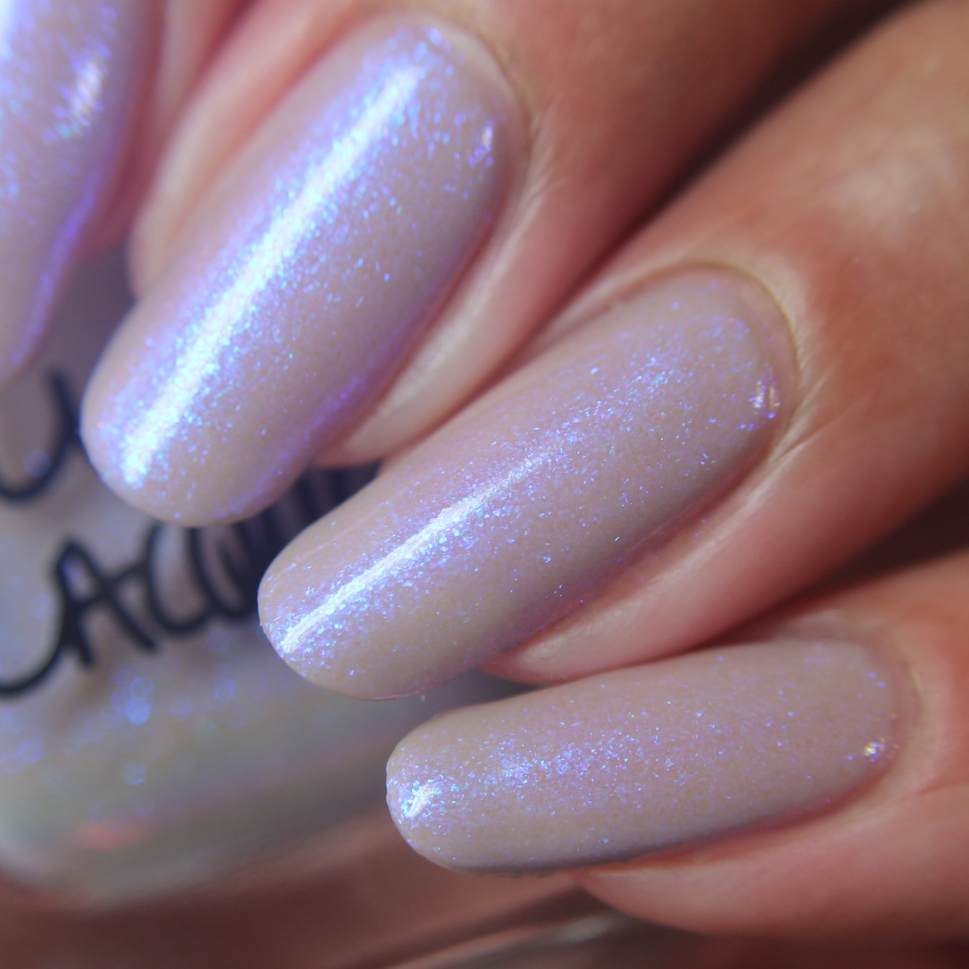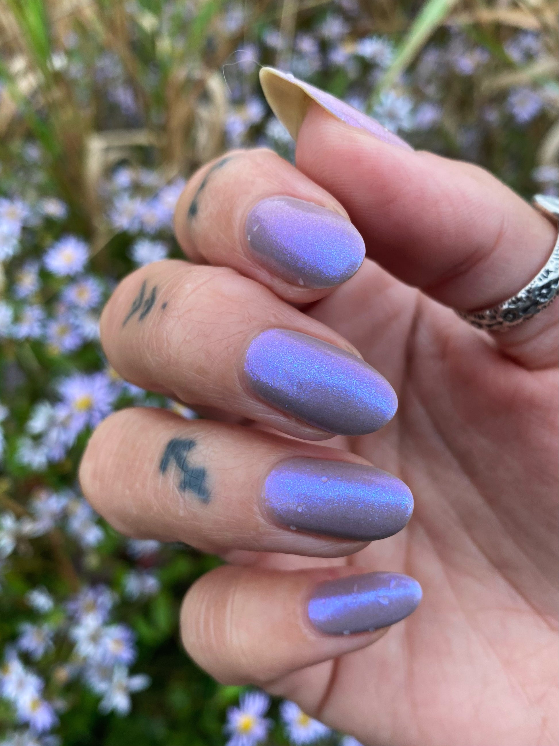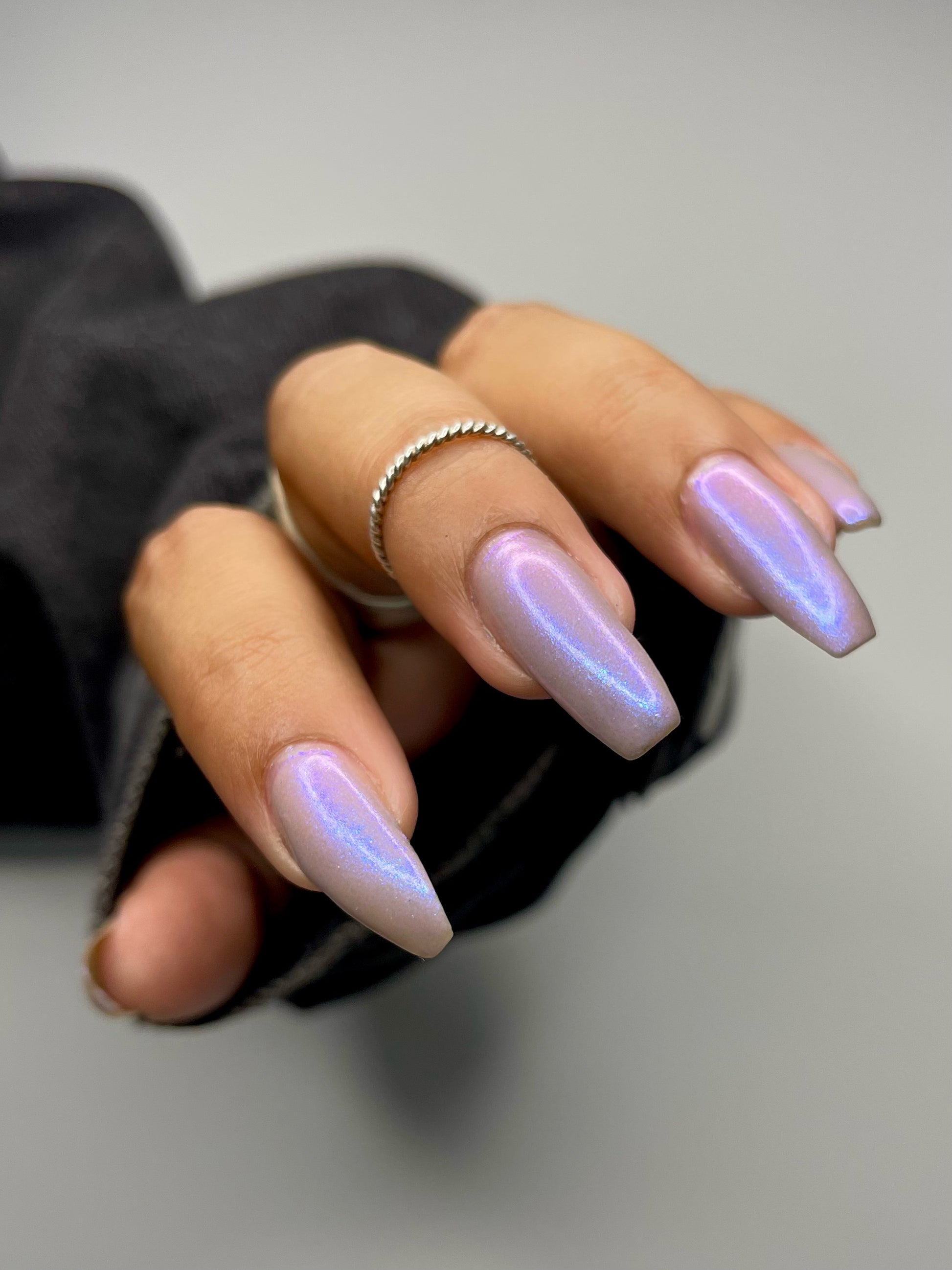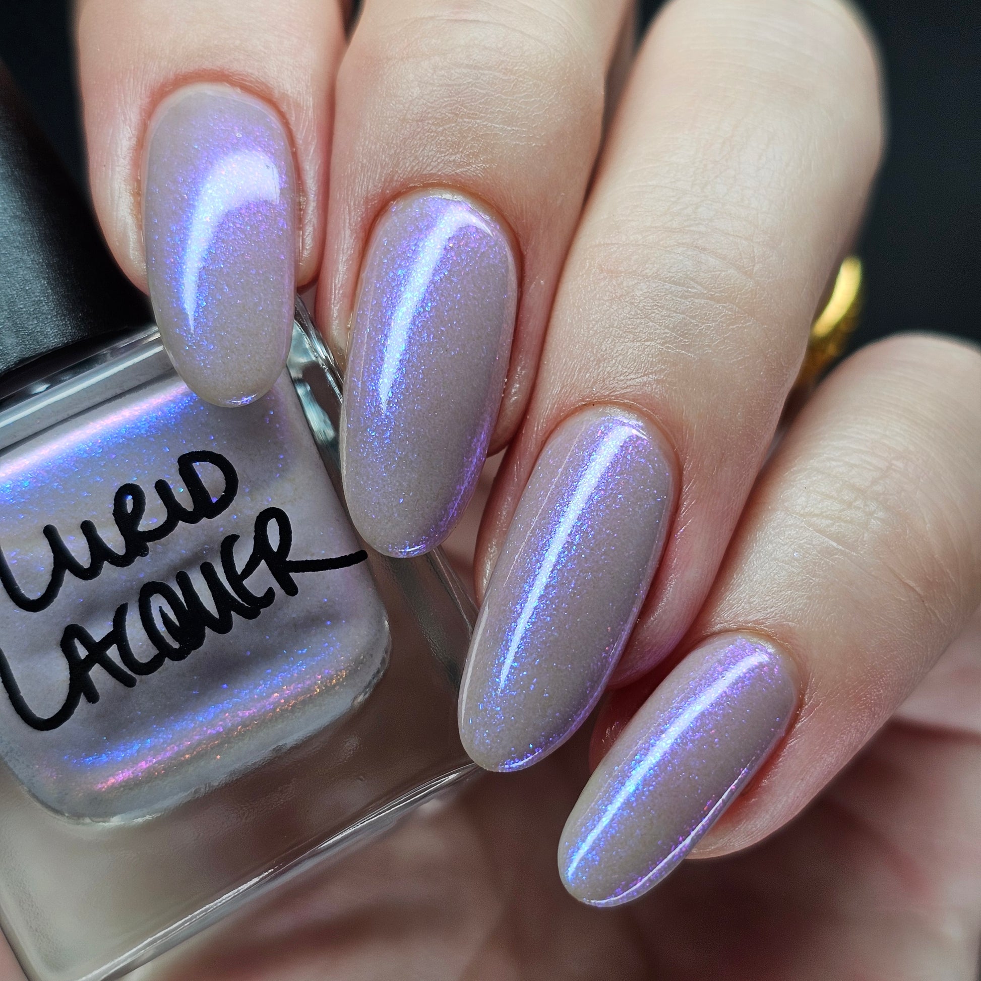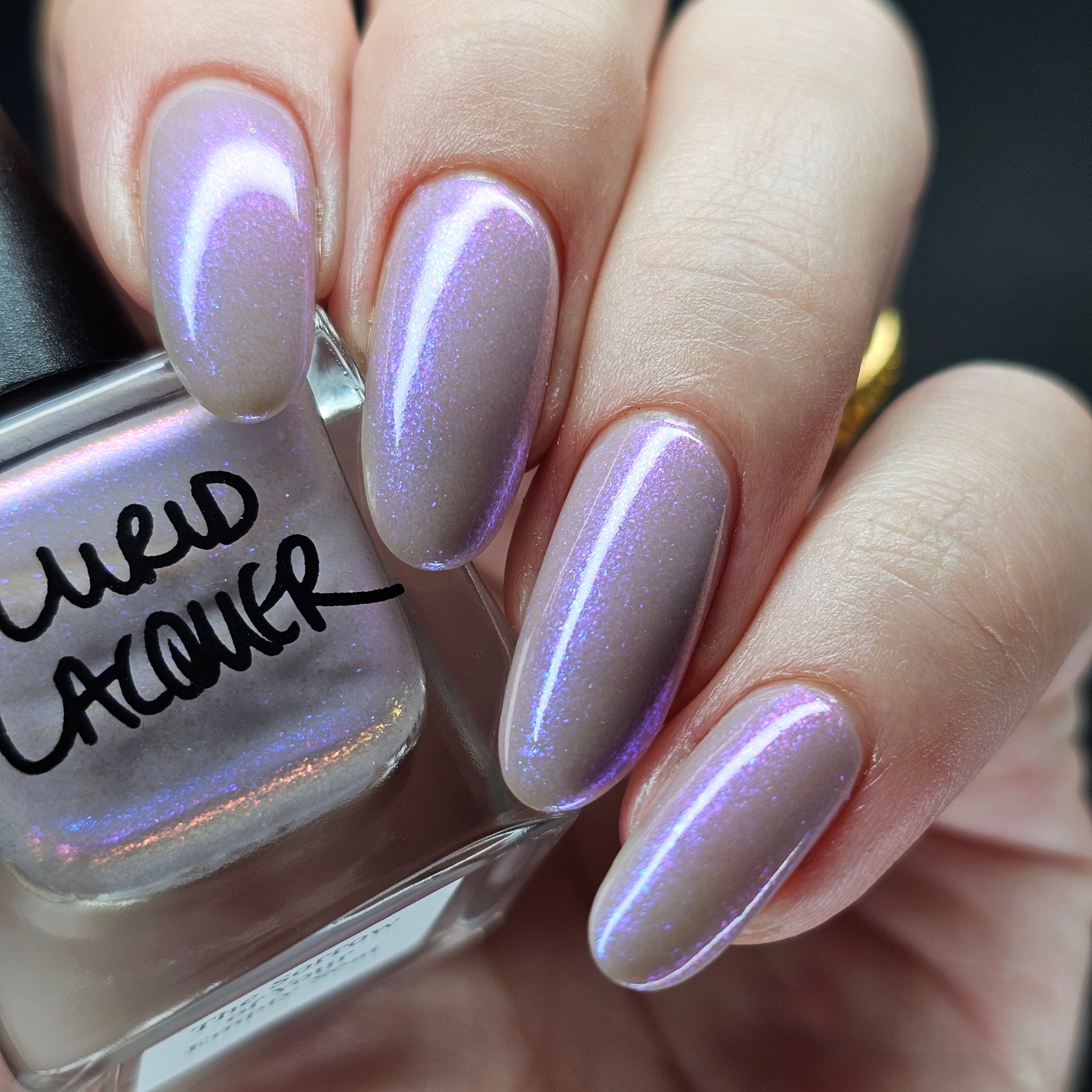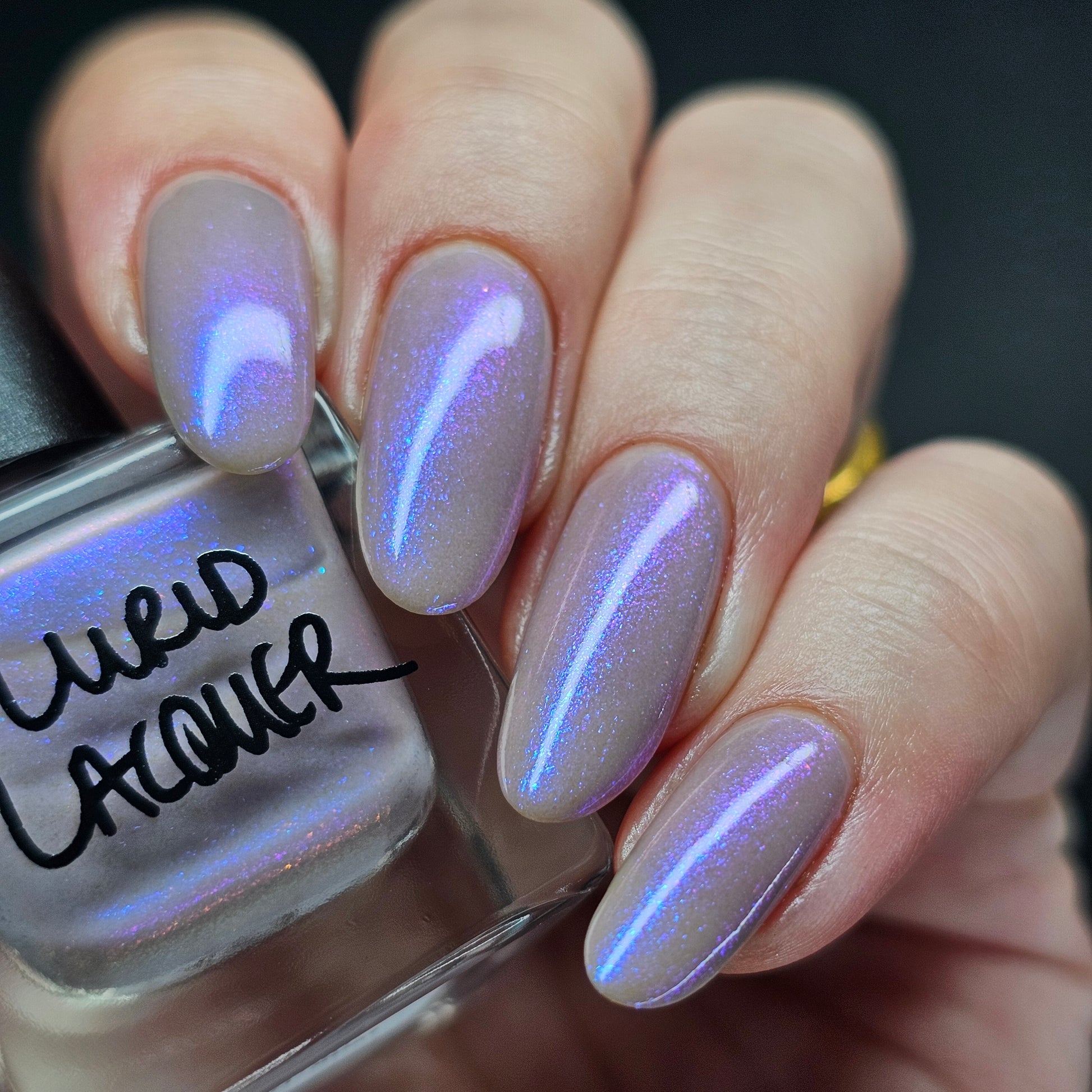 A cool-toned taupe base packed with glowy large particle shimmer that shifts from blue to purple (and to pink at extremes)