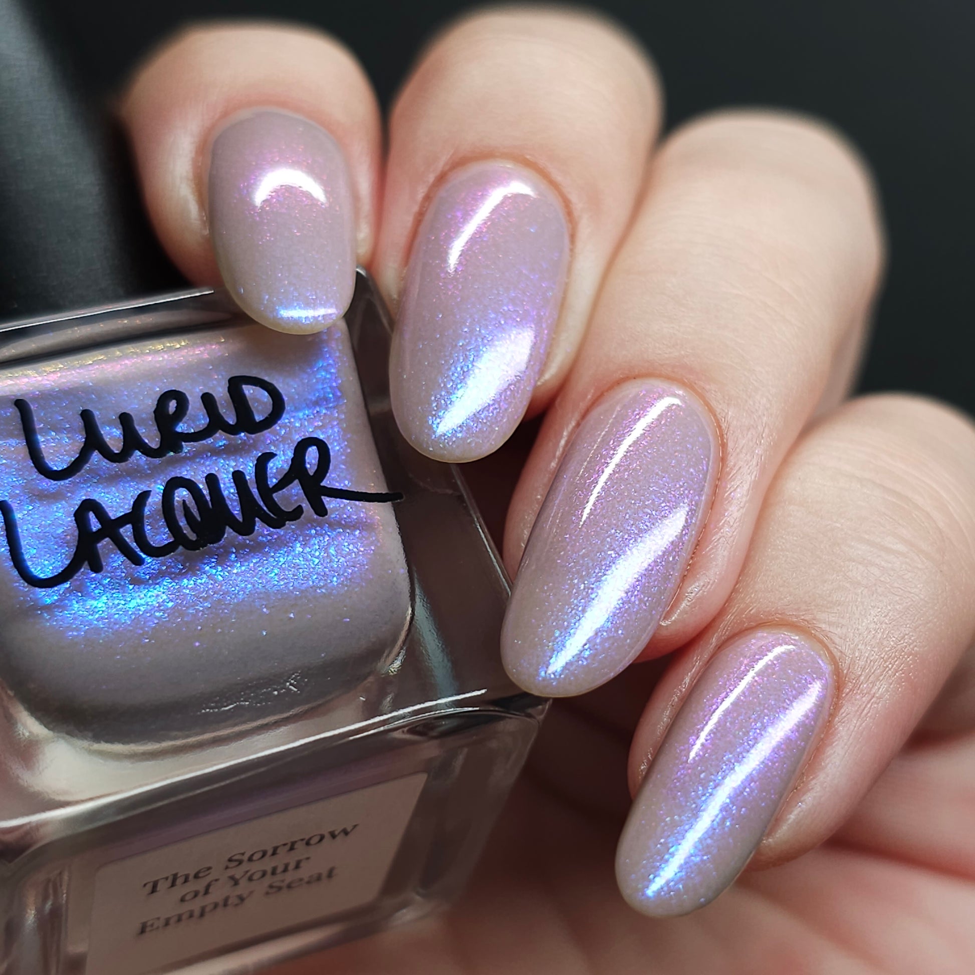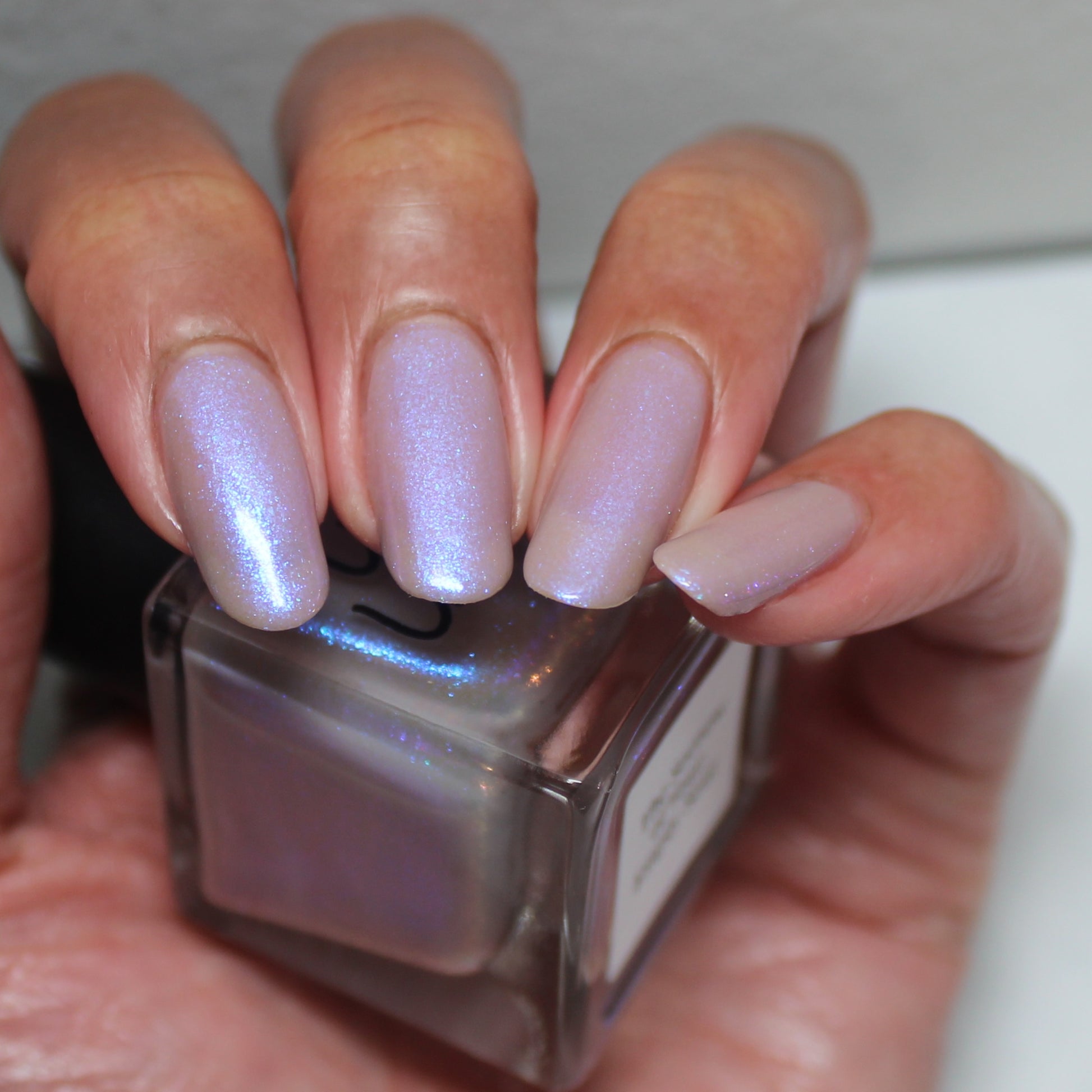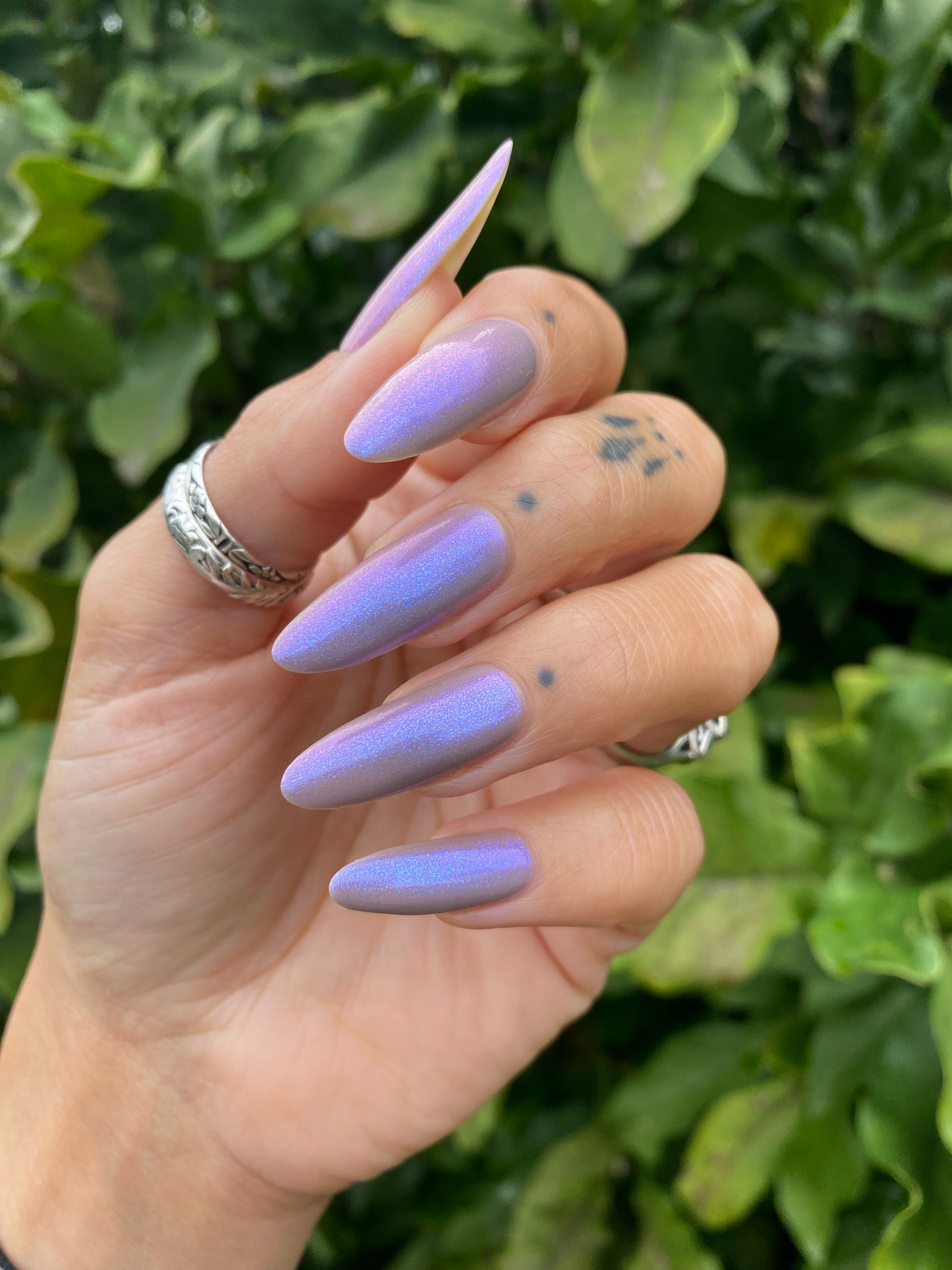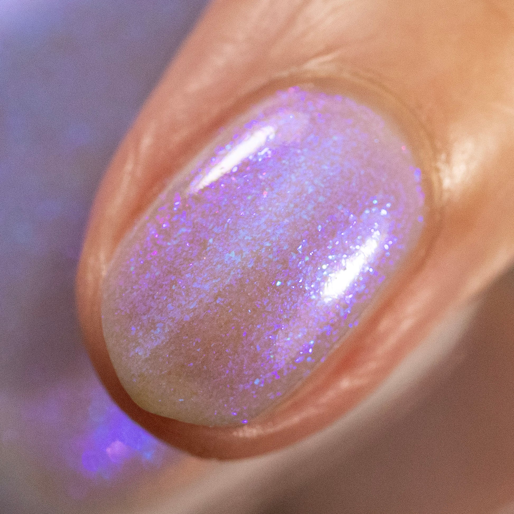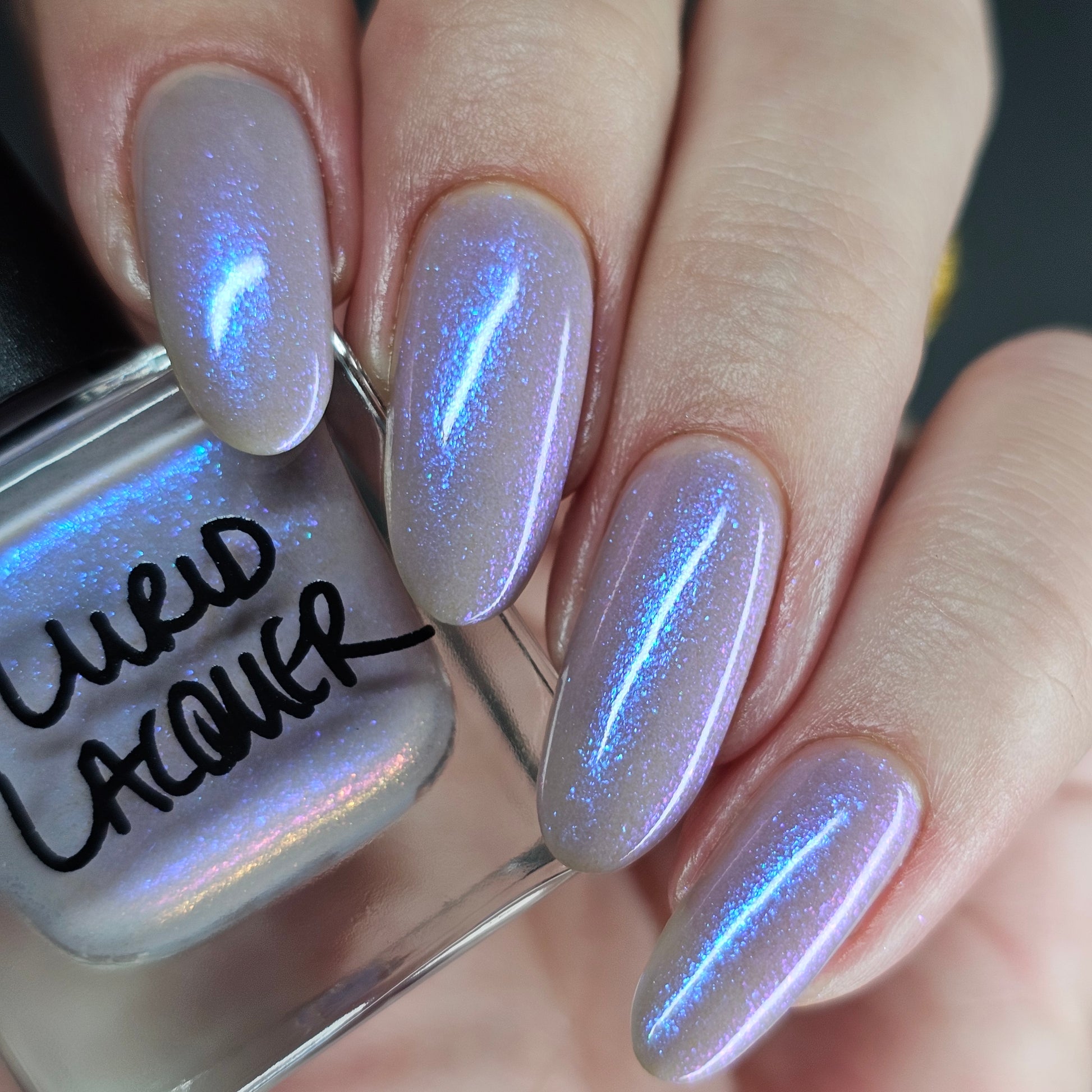 A cool-toned taupe base packed with glowy large particle shimmer that shifts from blue to purple (and to pink at extremes)