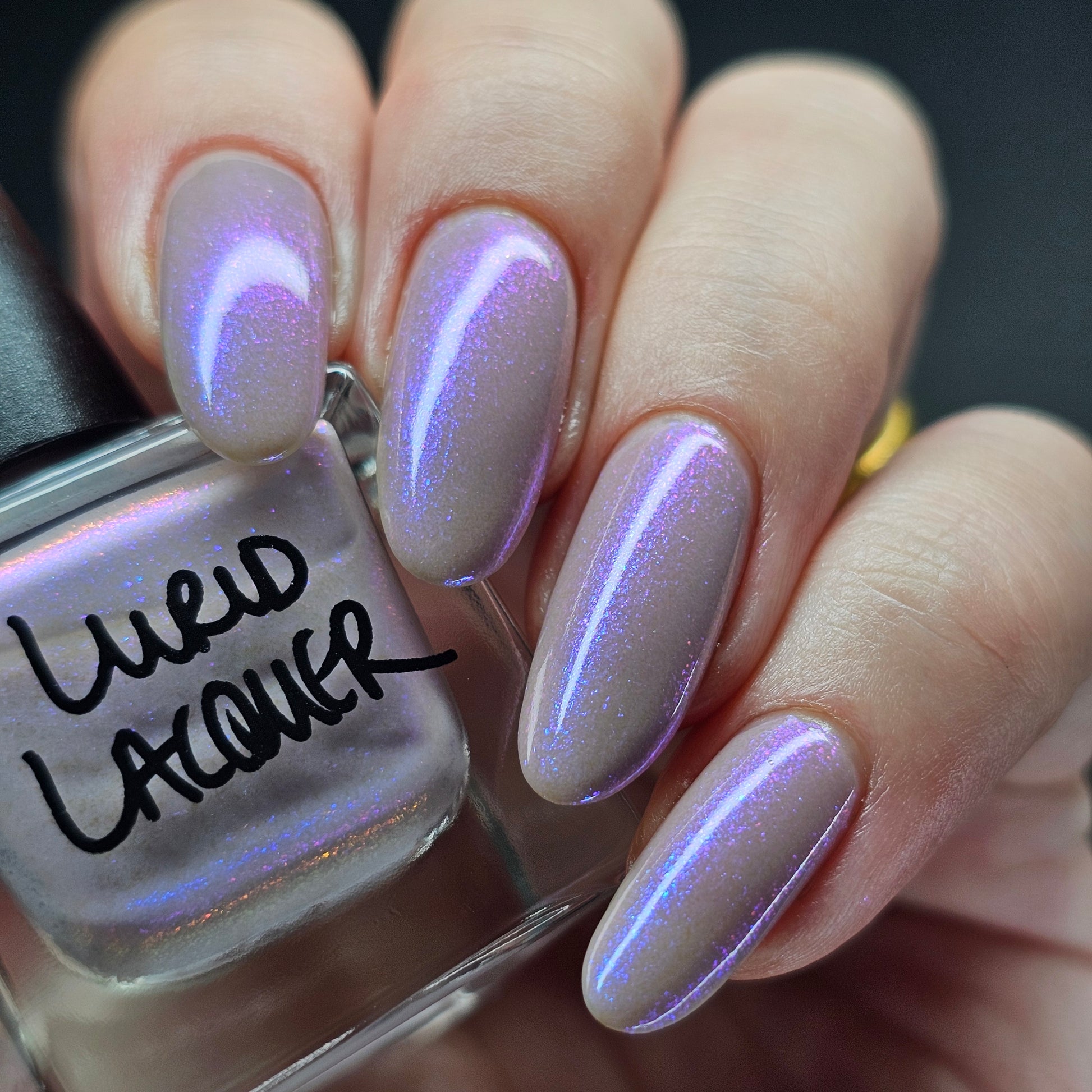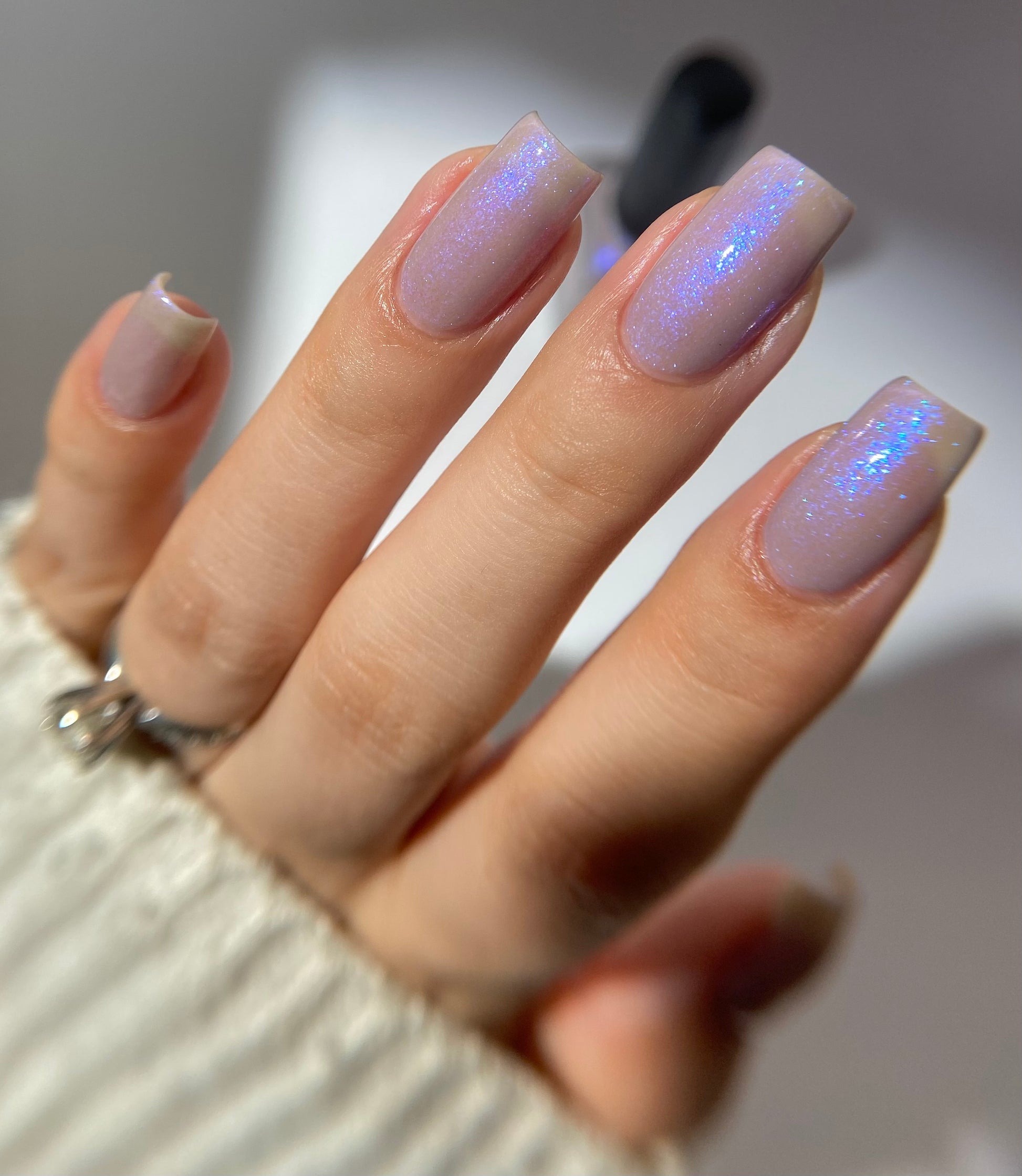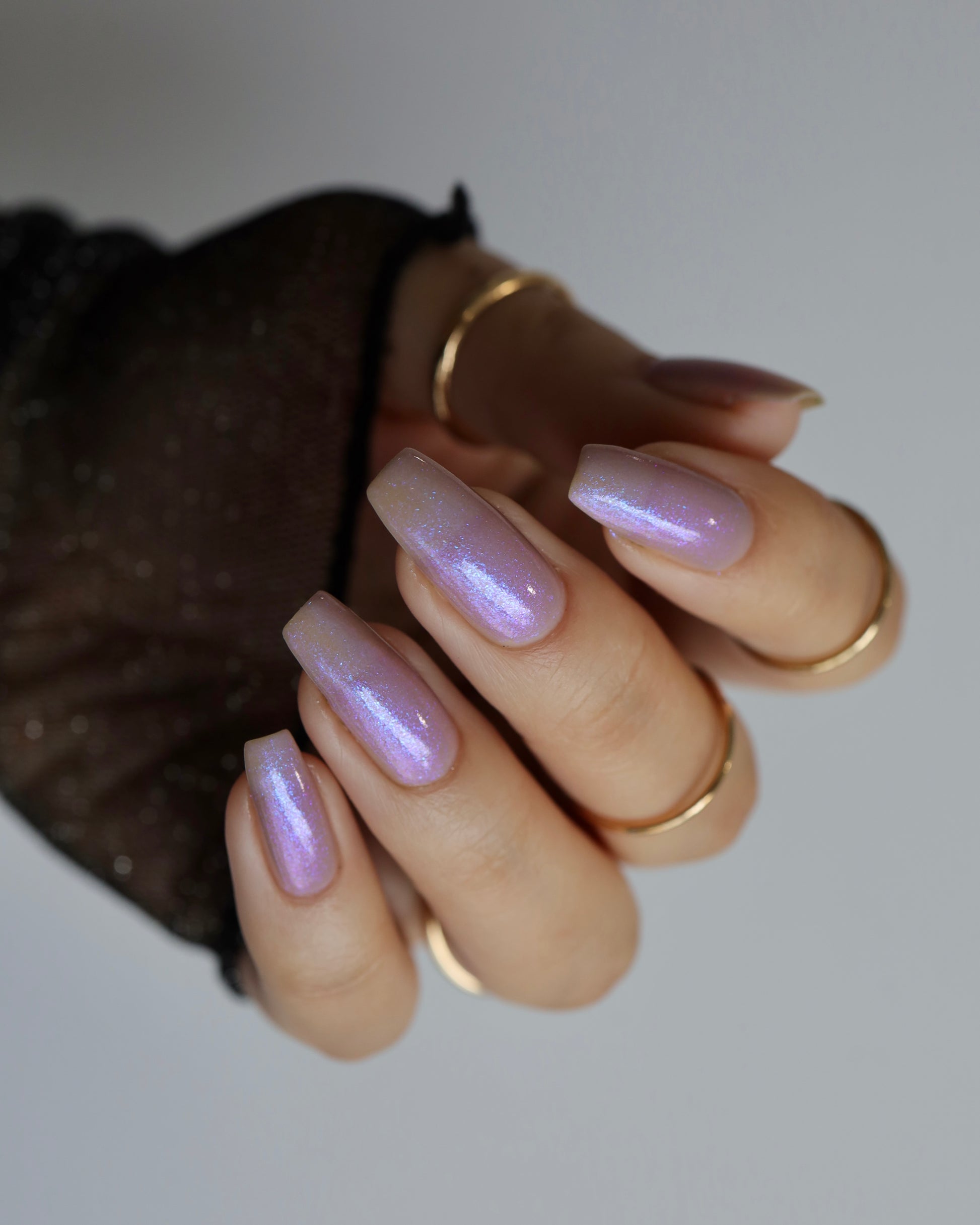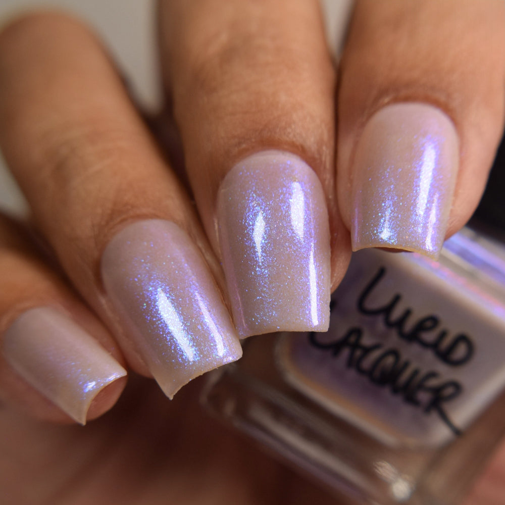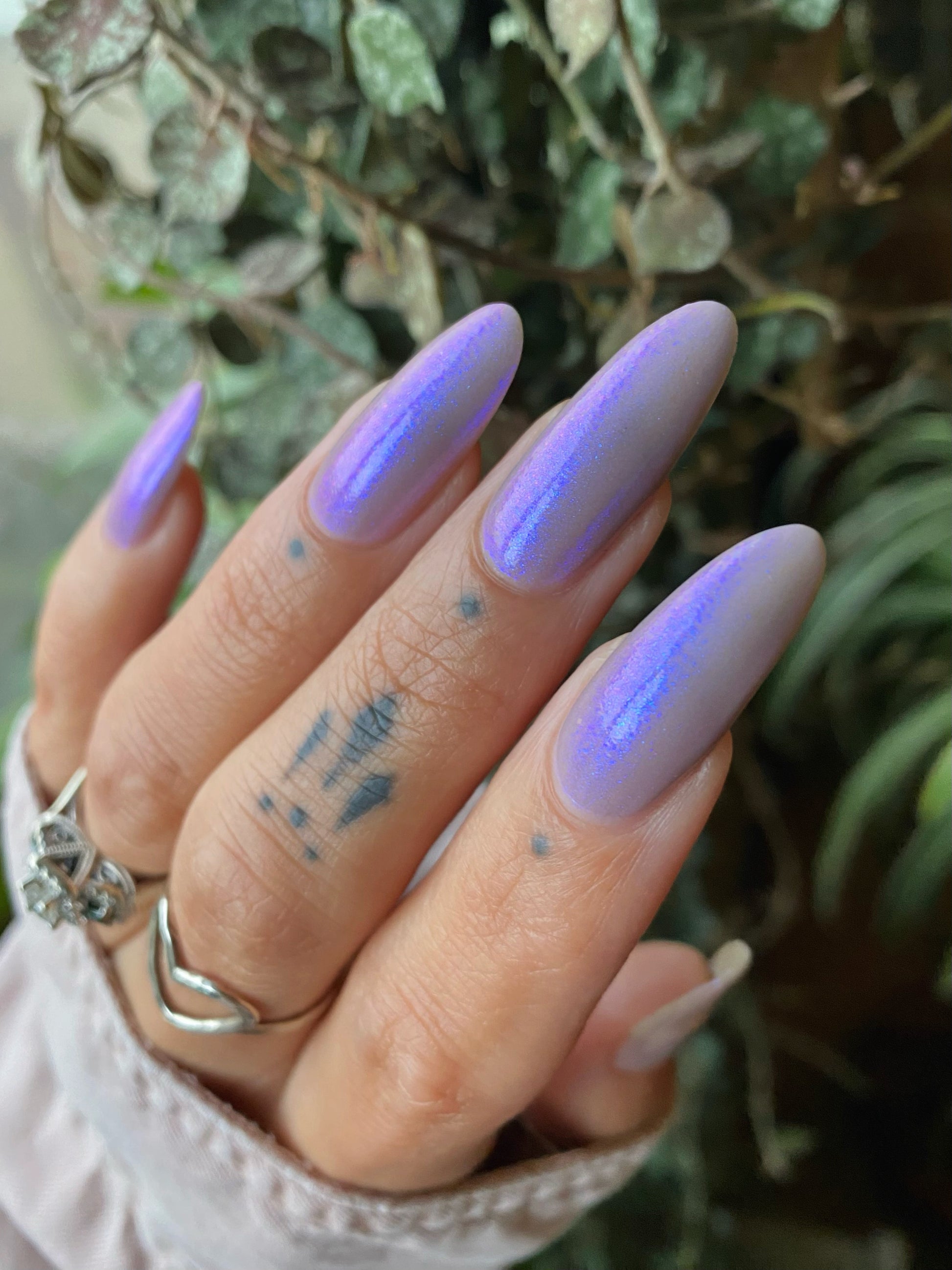 A cool-toned taupe base packed with glowy large particle shimmer that shifts from blue to purple (and to pink at extremes)