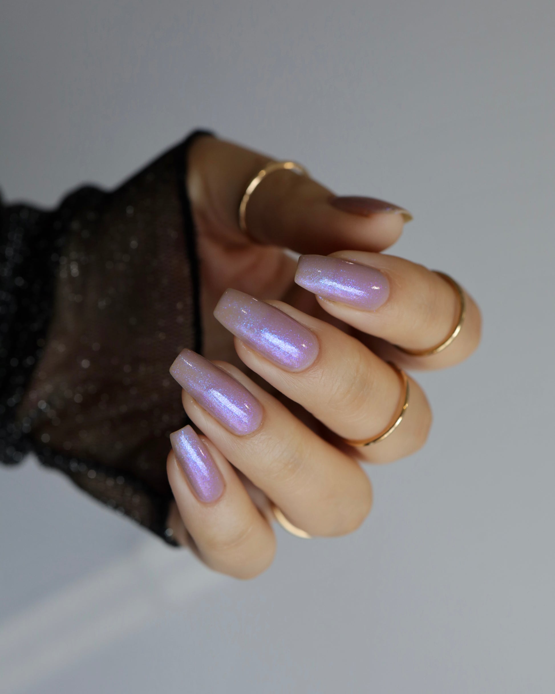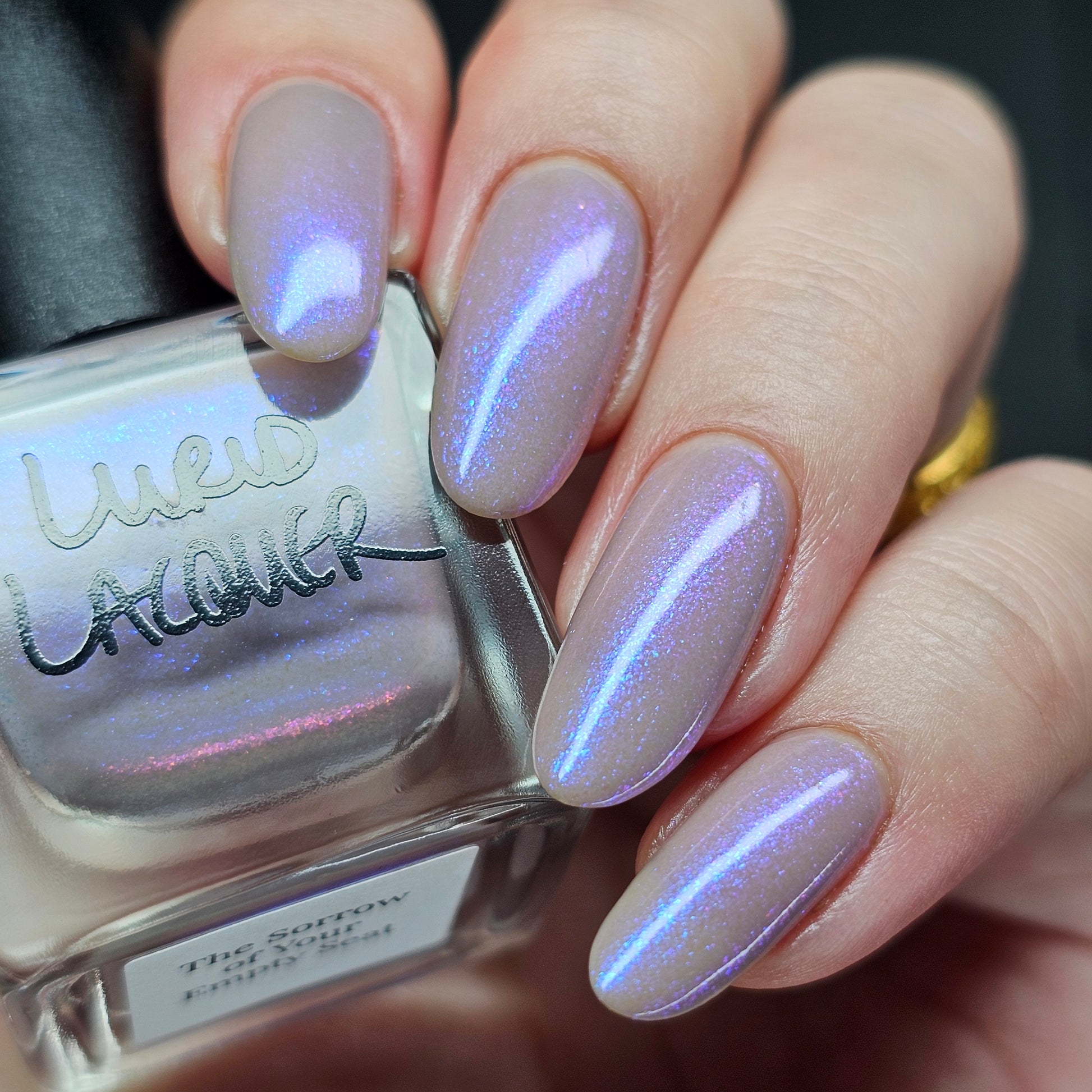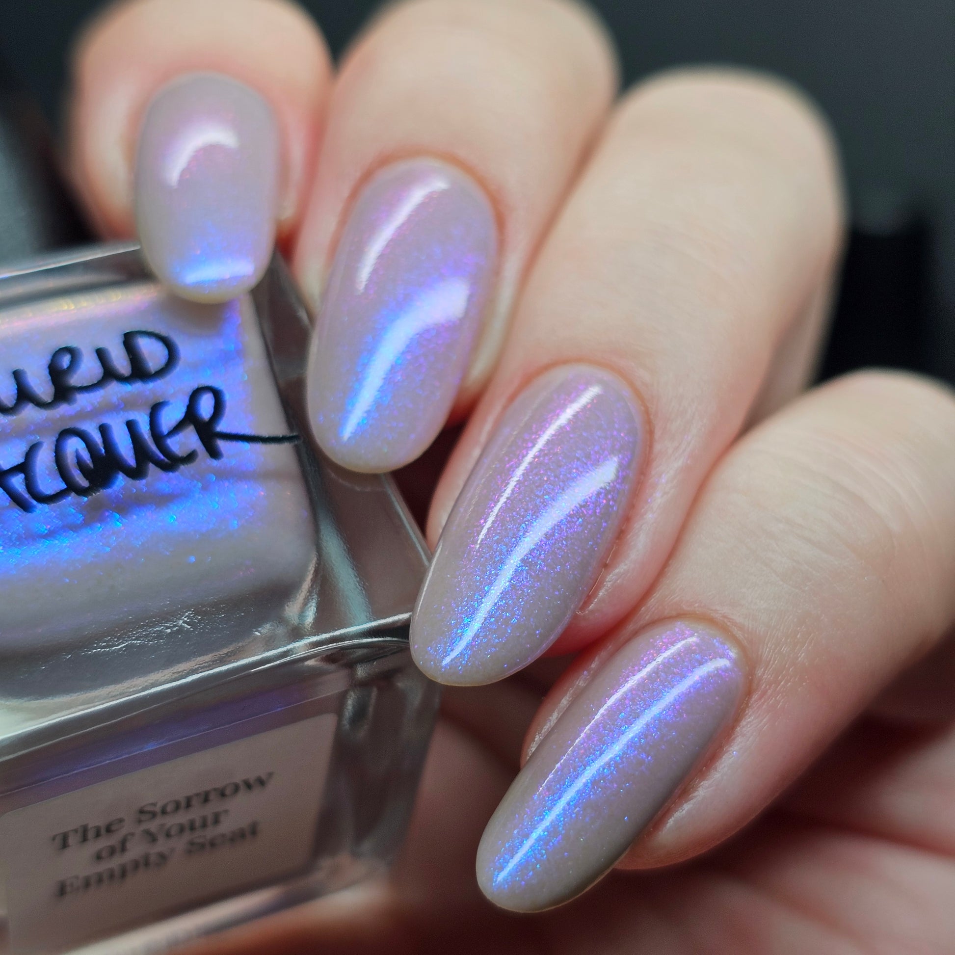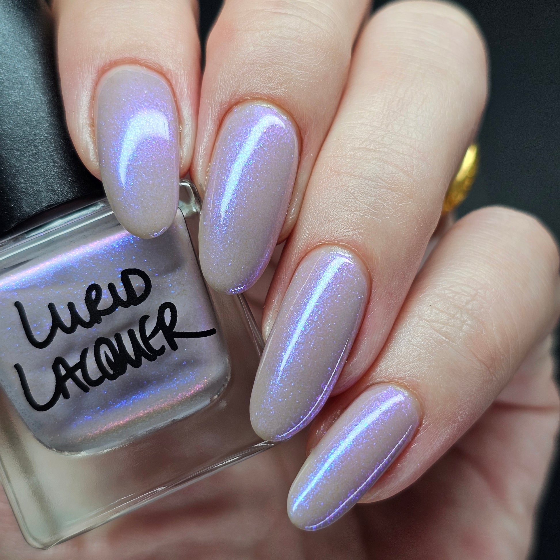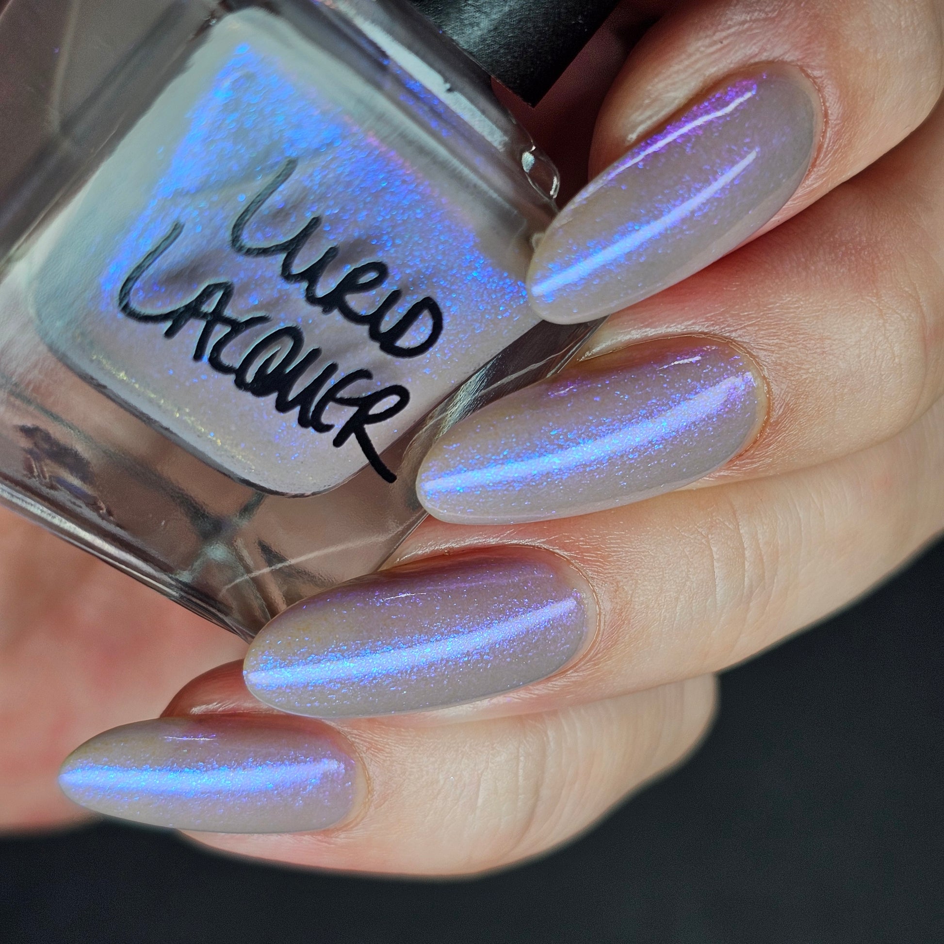 A cool-toned taupe base packed with glowy large particle shimmer that shifts from blue to purple (and to pink at extremes)