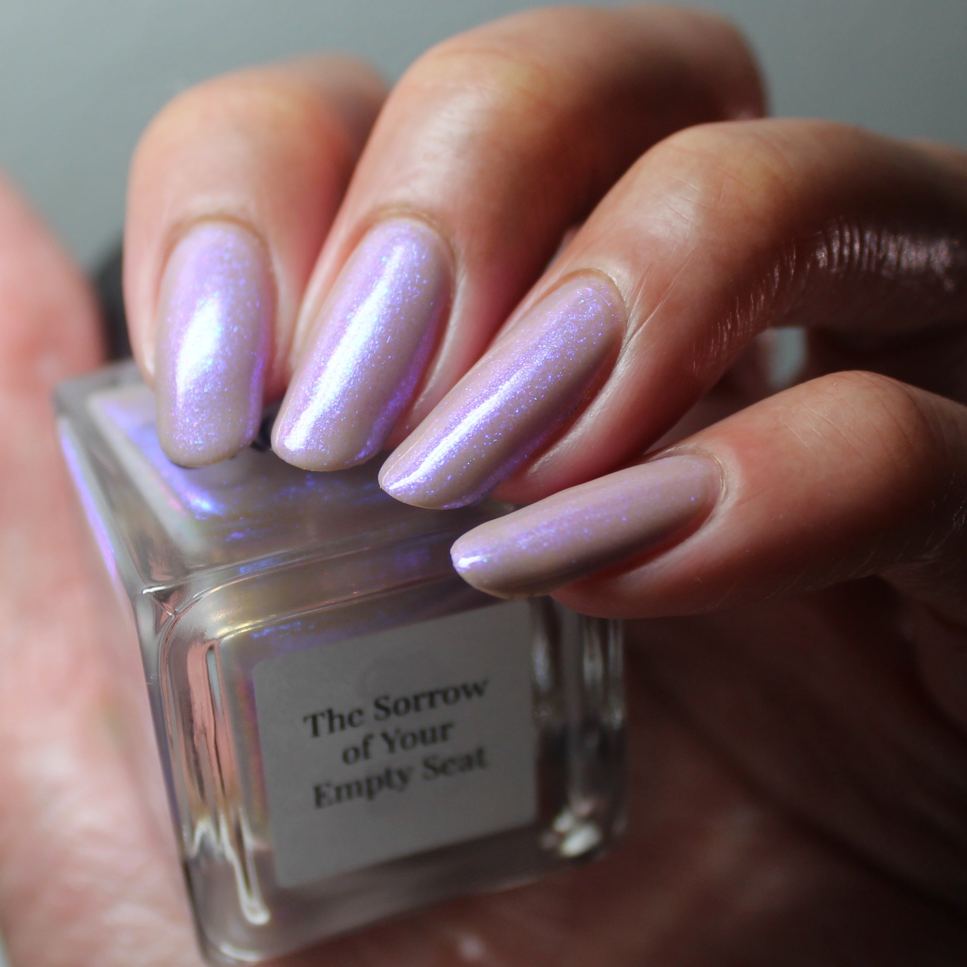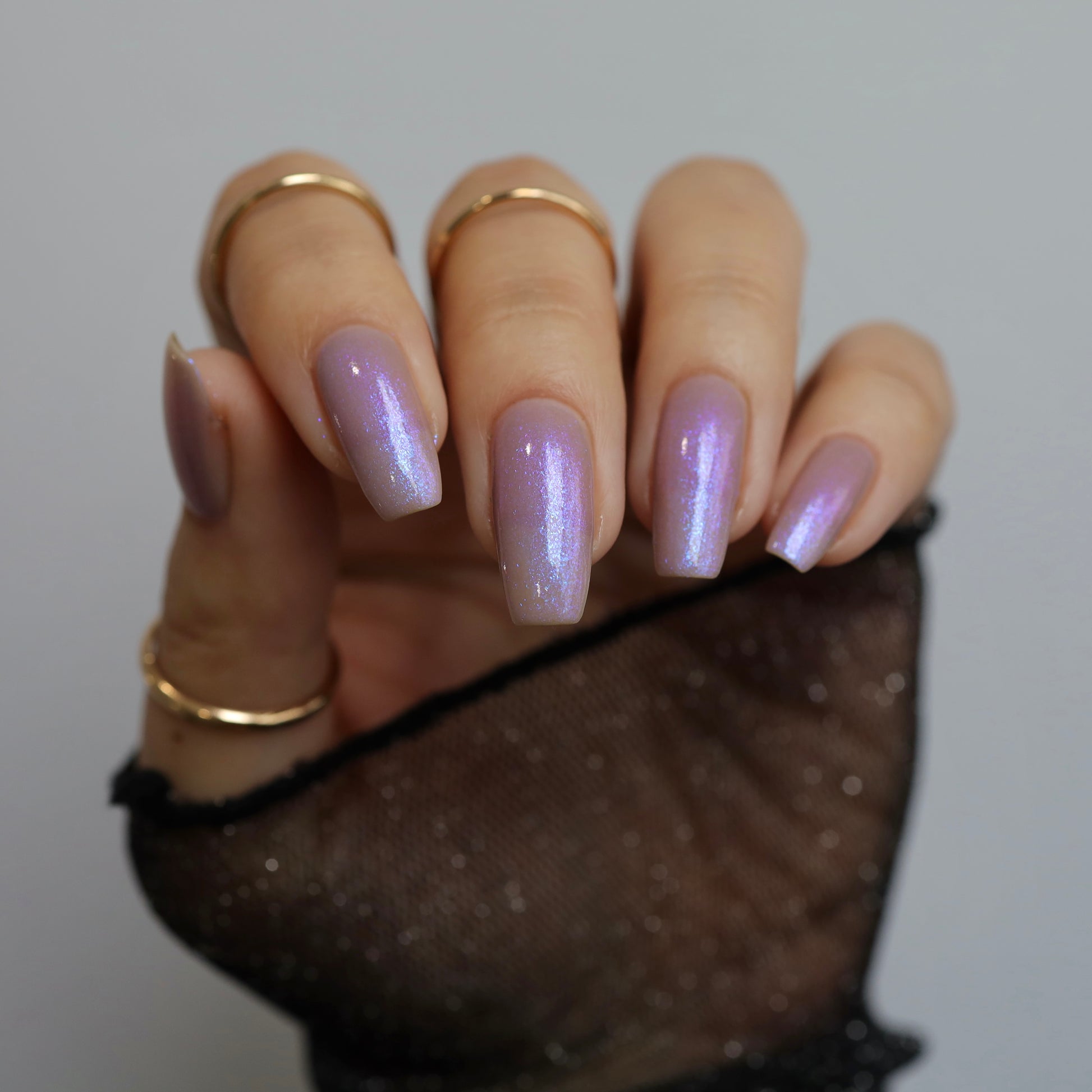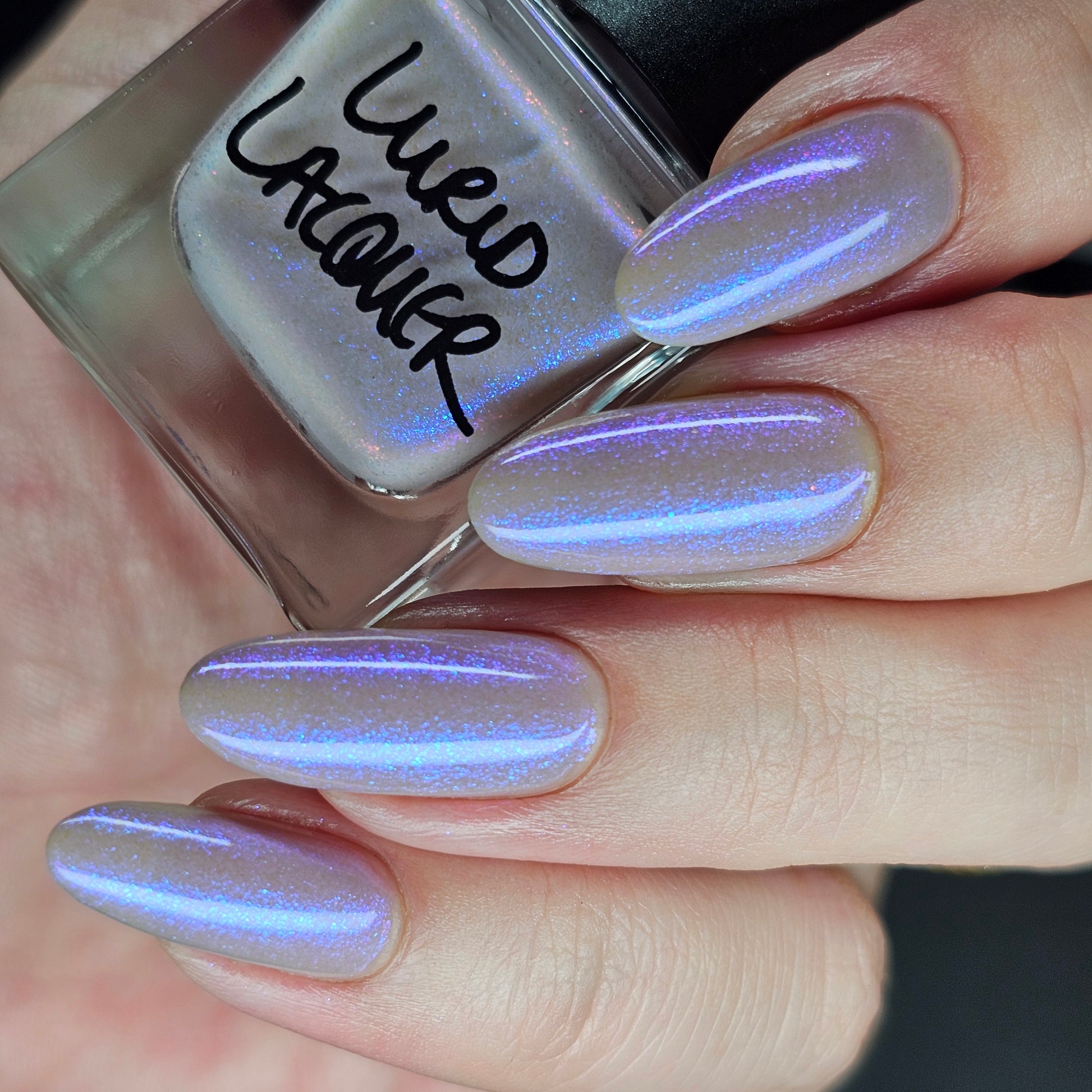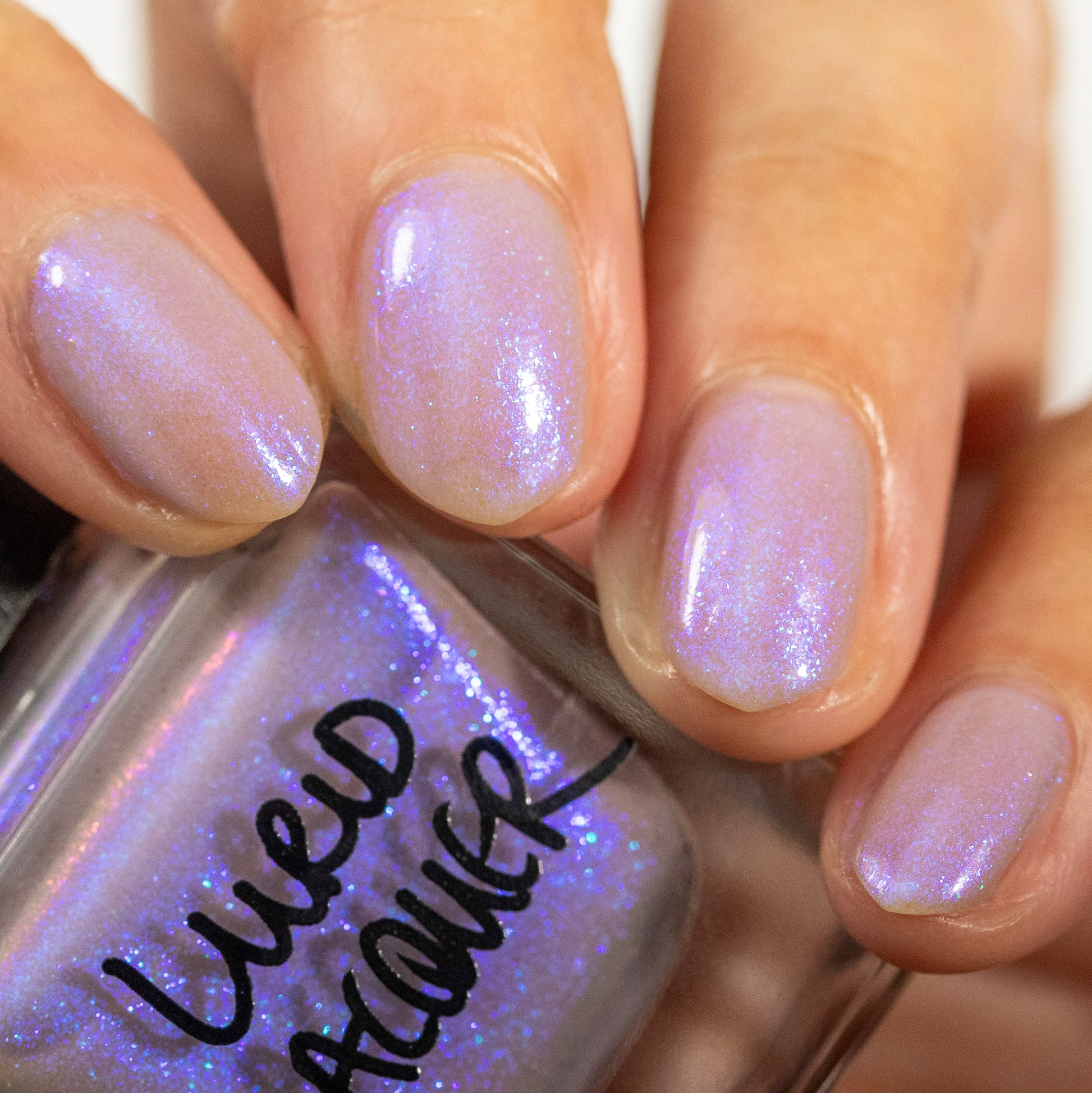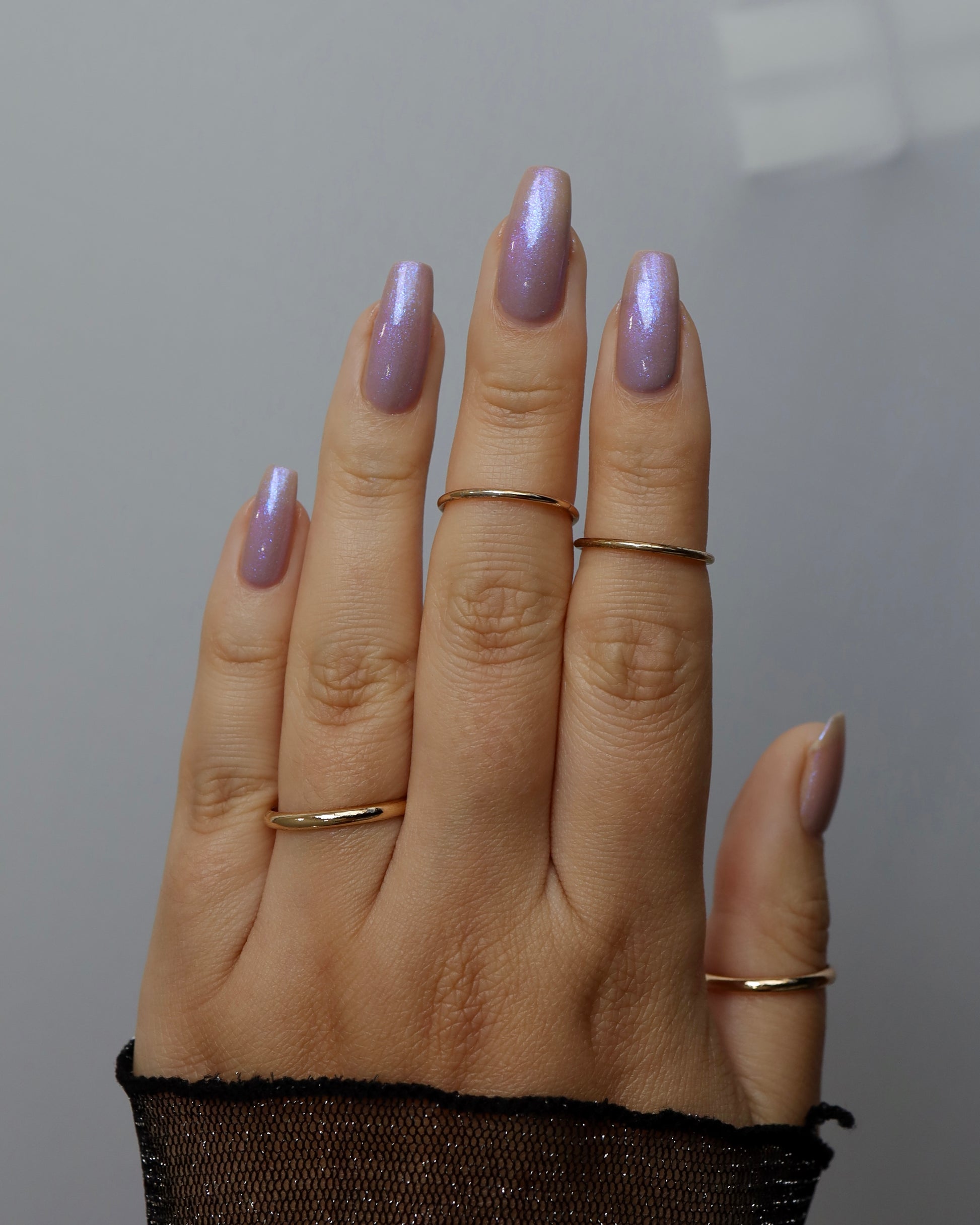A cool-toned taupe base packed with glowy large particle shimmer that shifts from blue to purple (and to pink at extremes)