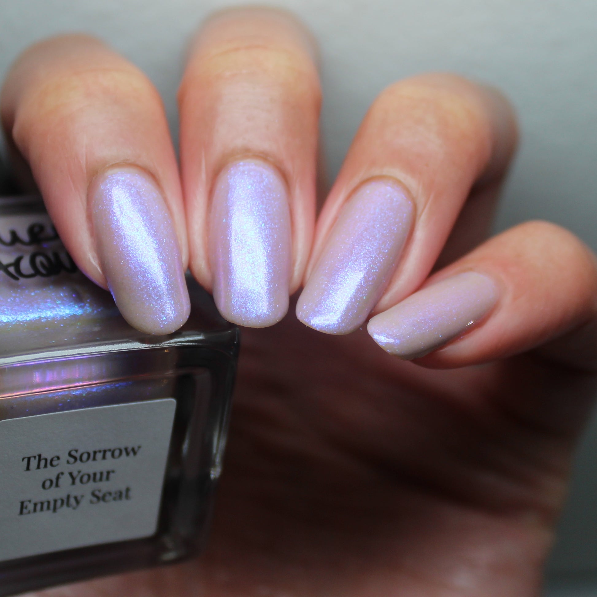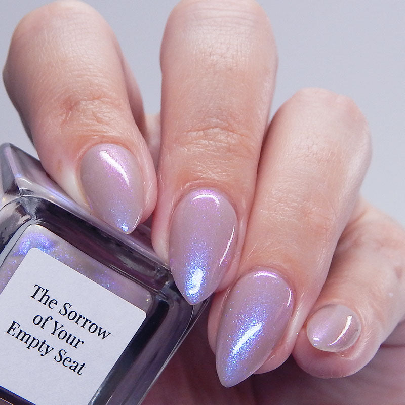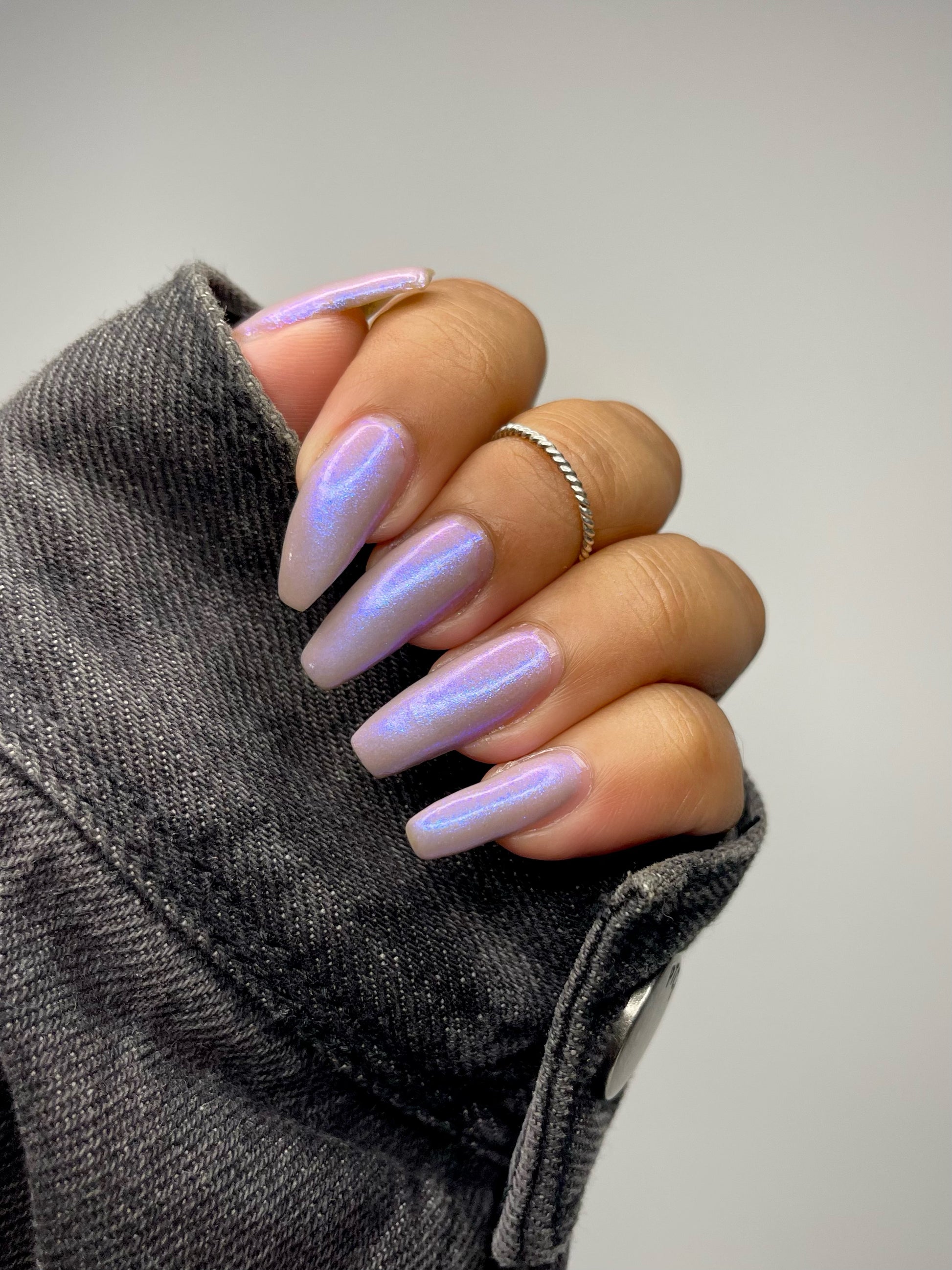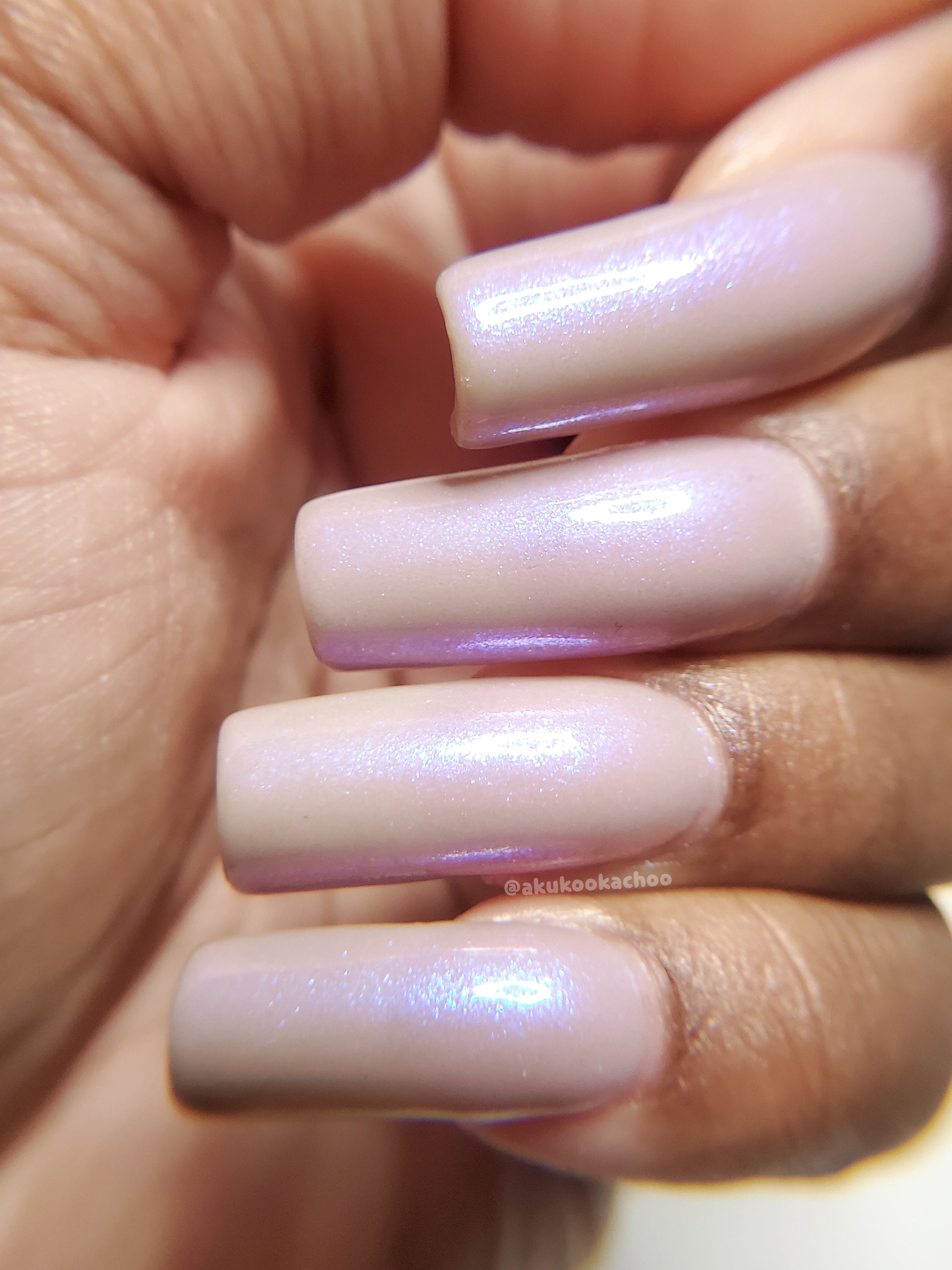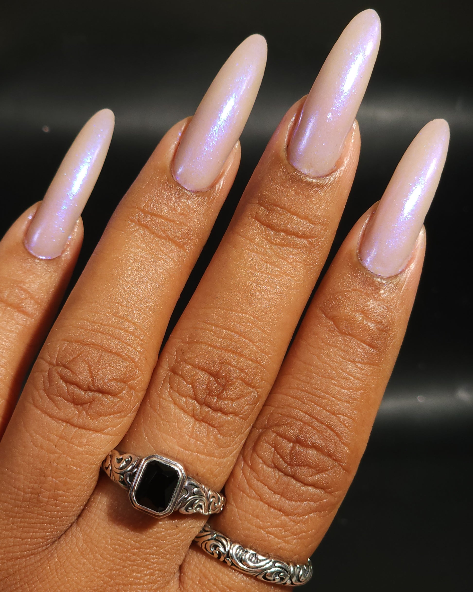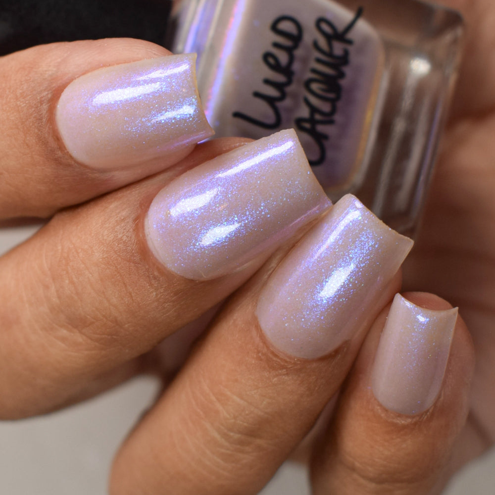 A cool-toned taupe base packed with glowy large particle shimmer that shifts from blue to purple (and to pink at extremes)