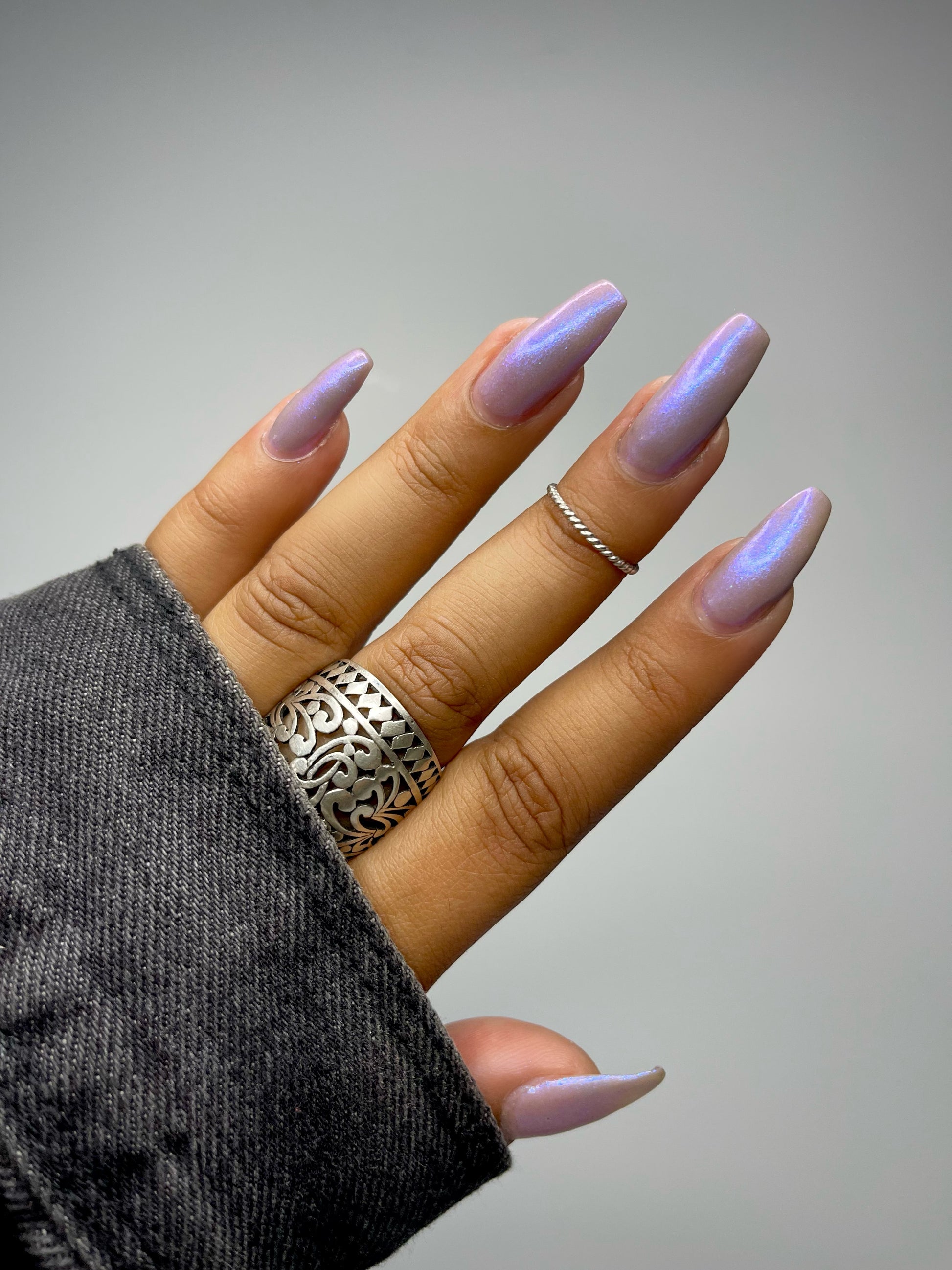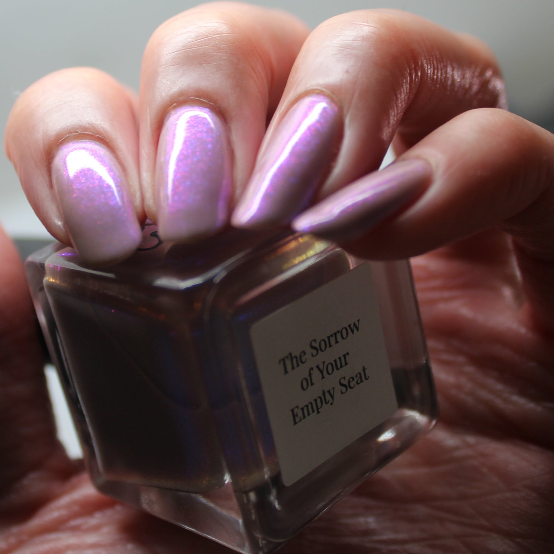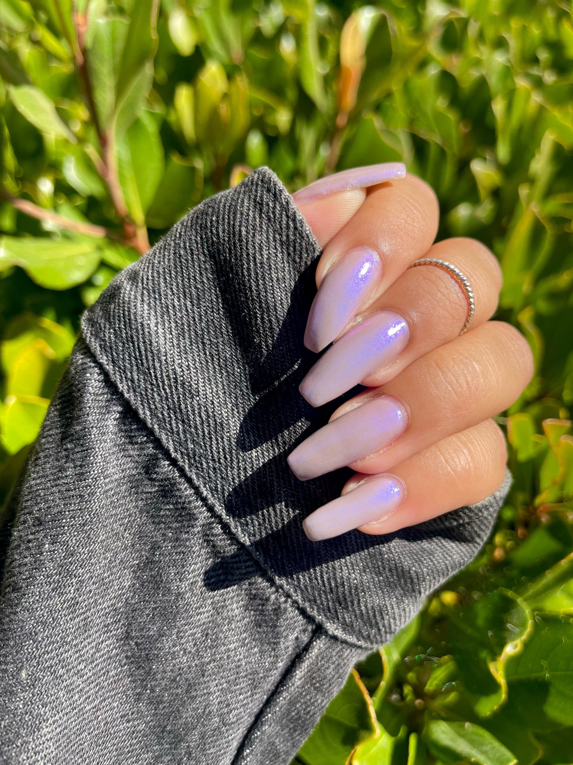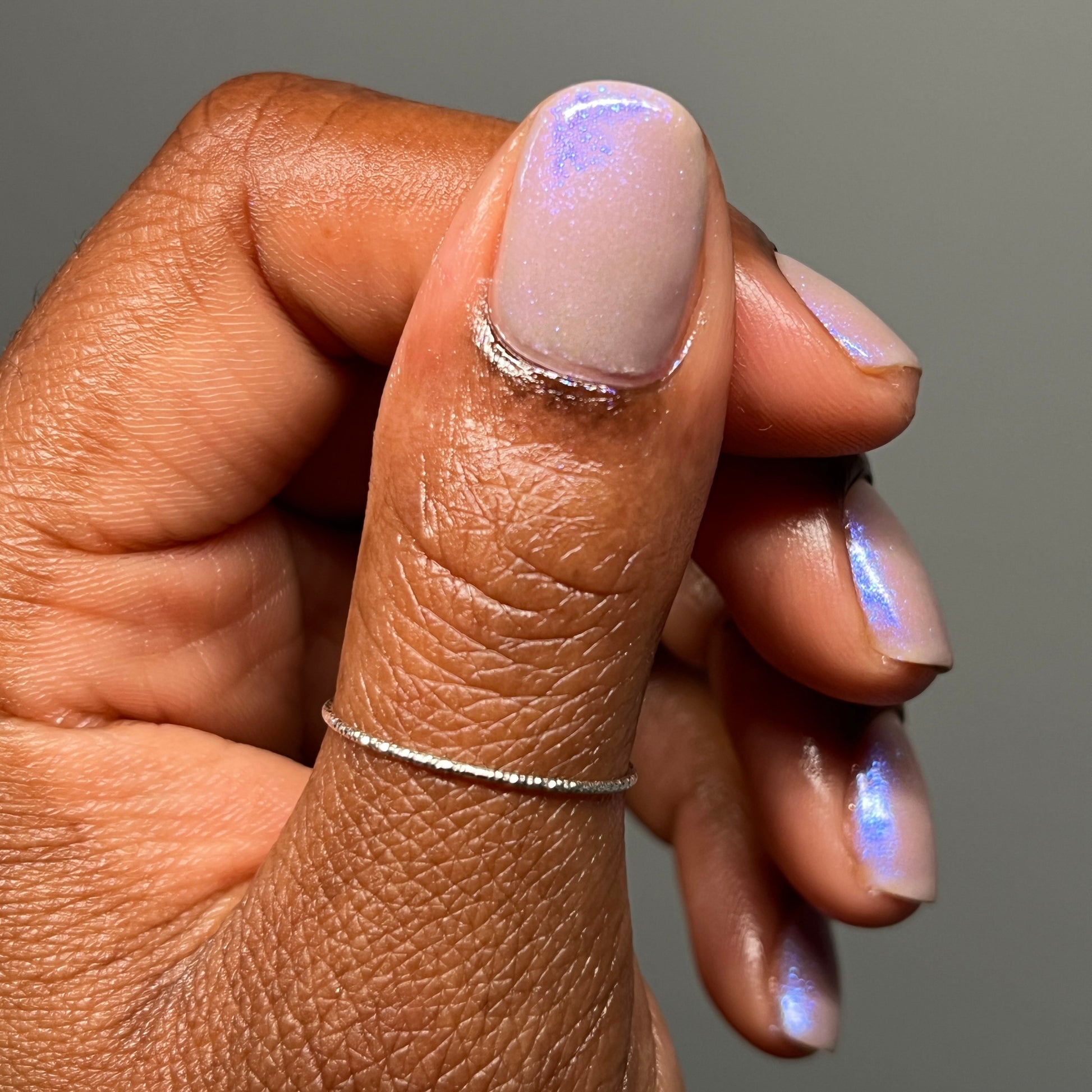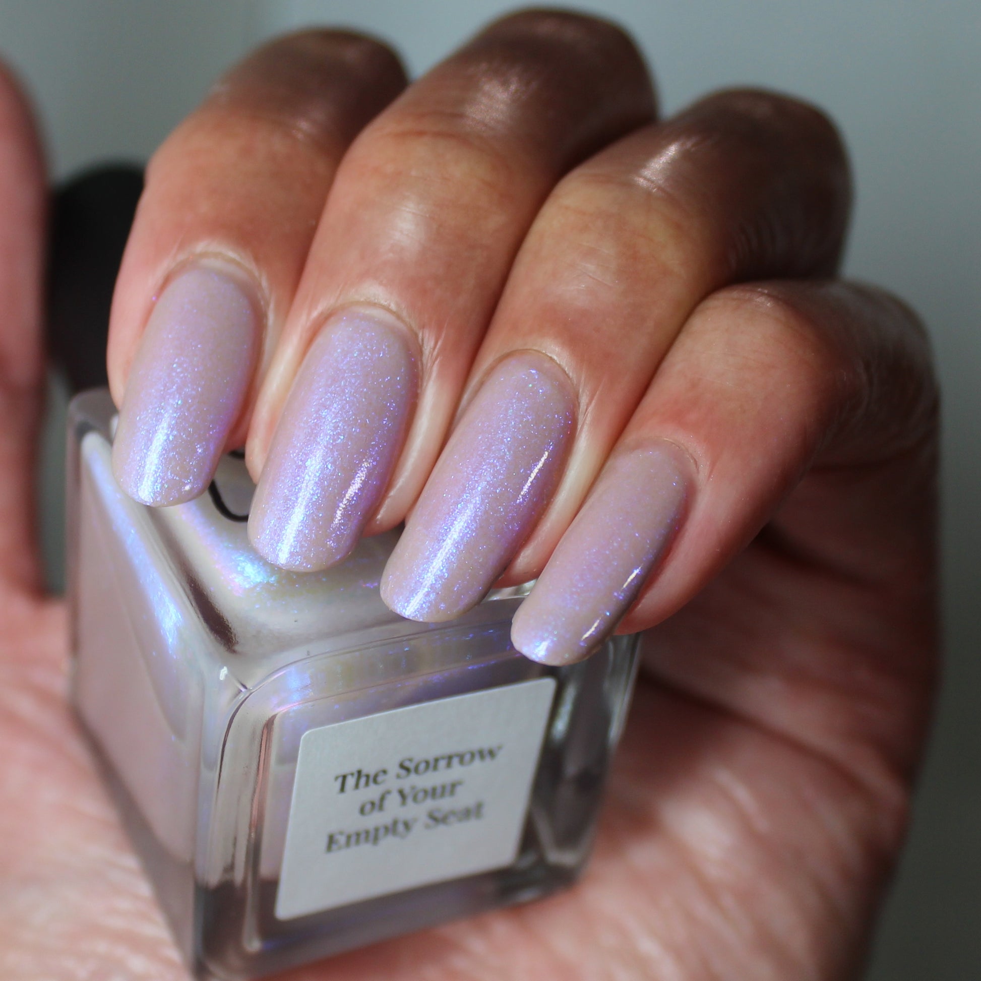 A cool-toned taupe base packed with glowy large particle shimmer that shifts from blue to purple (and to pink at extremes)