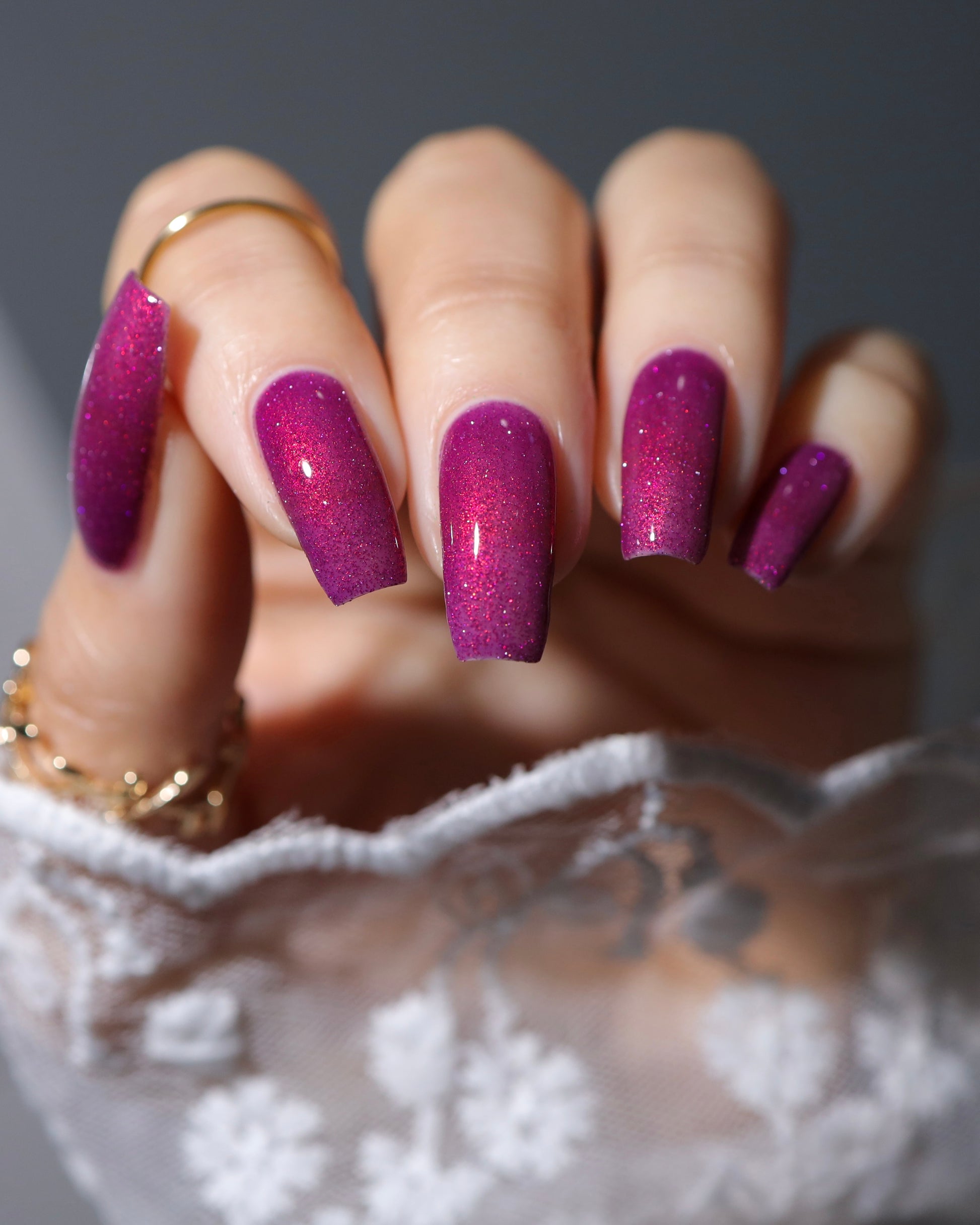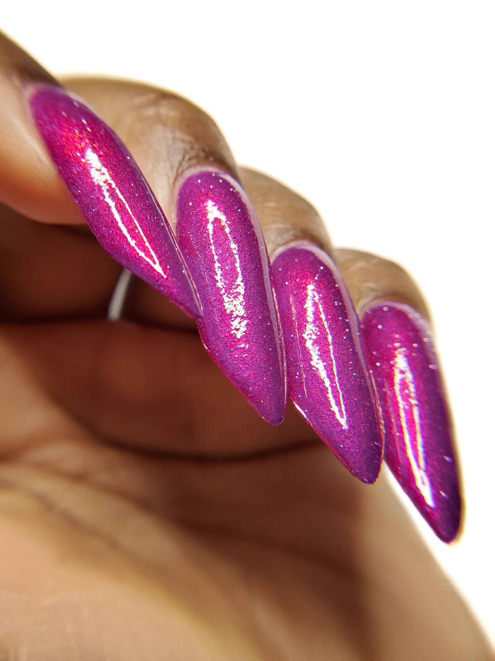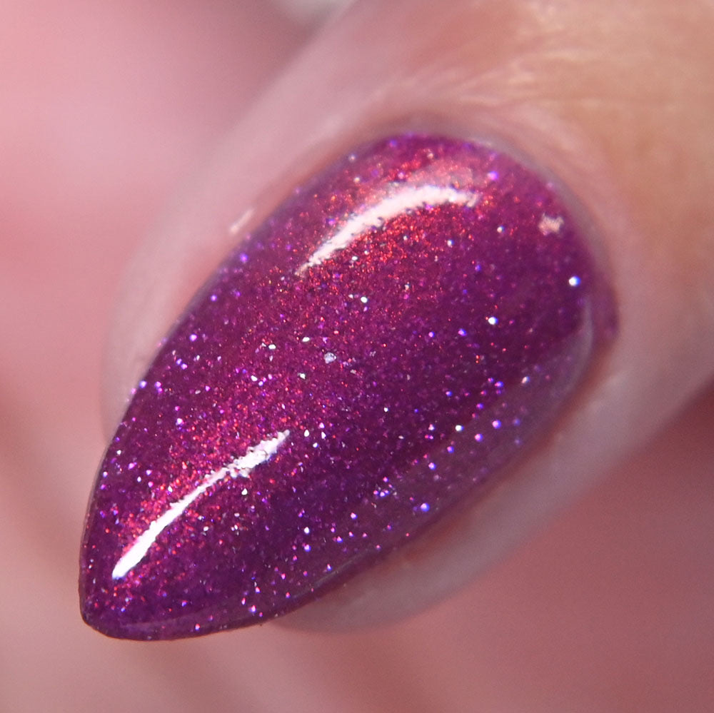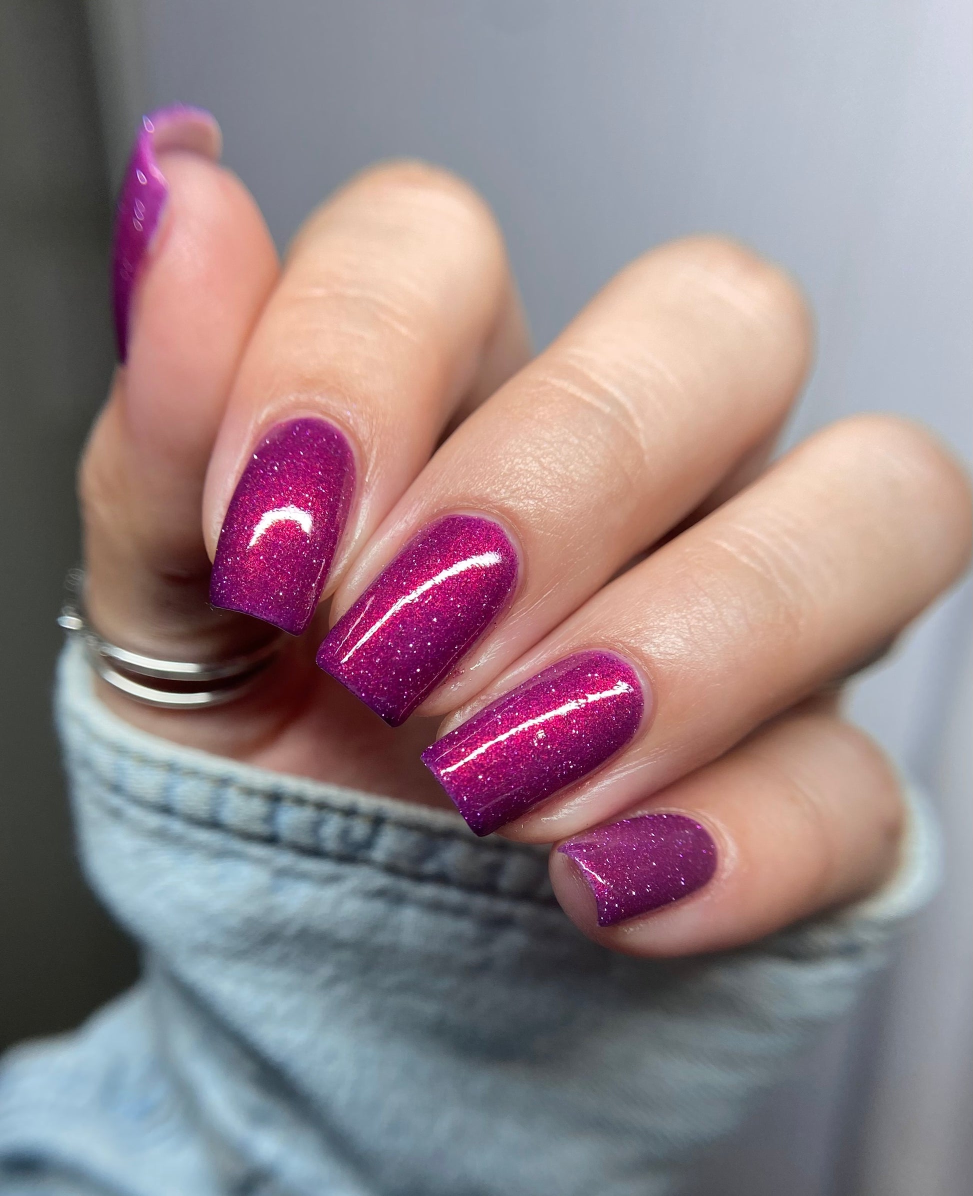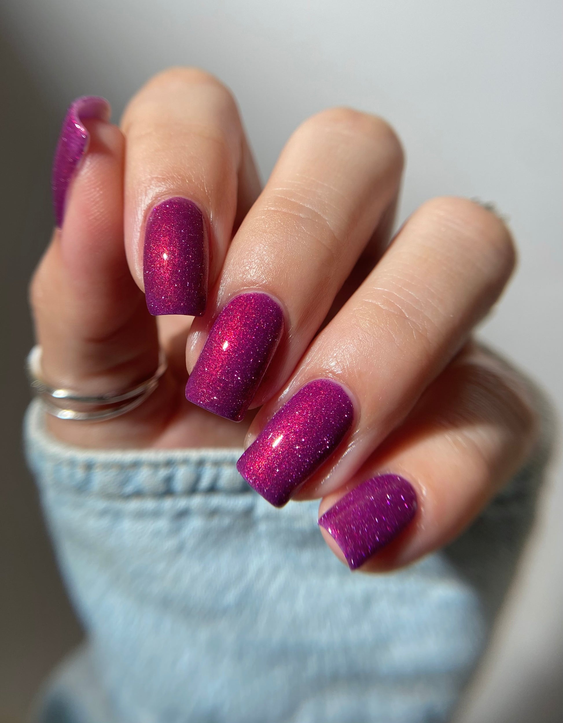 A purple jelly base with purple light reflective glitter and aurora shimmer that shifts from pinkish red to orange