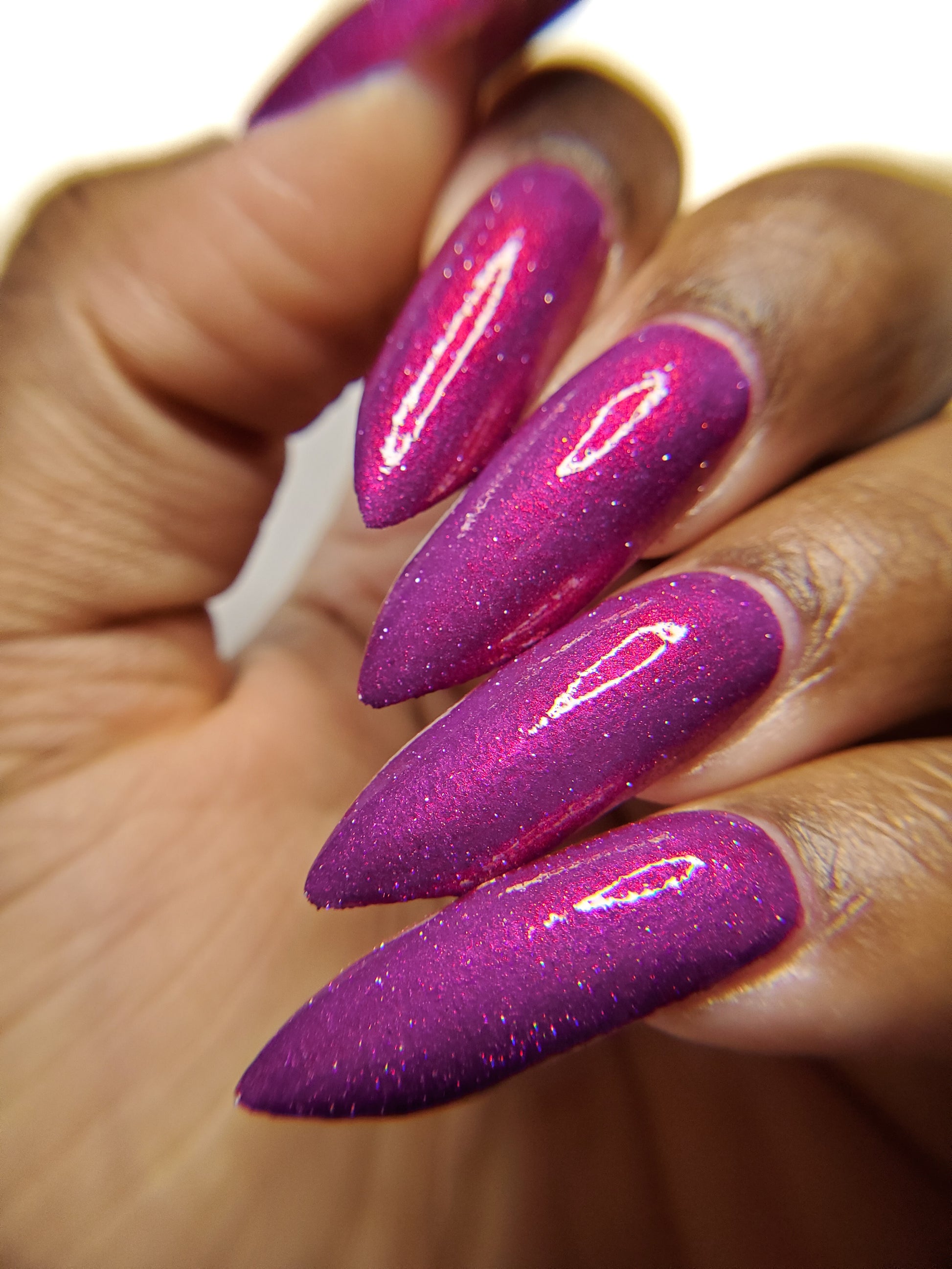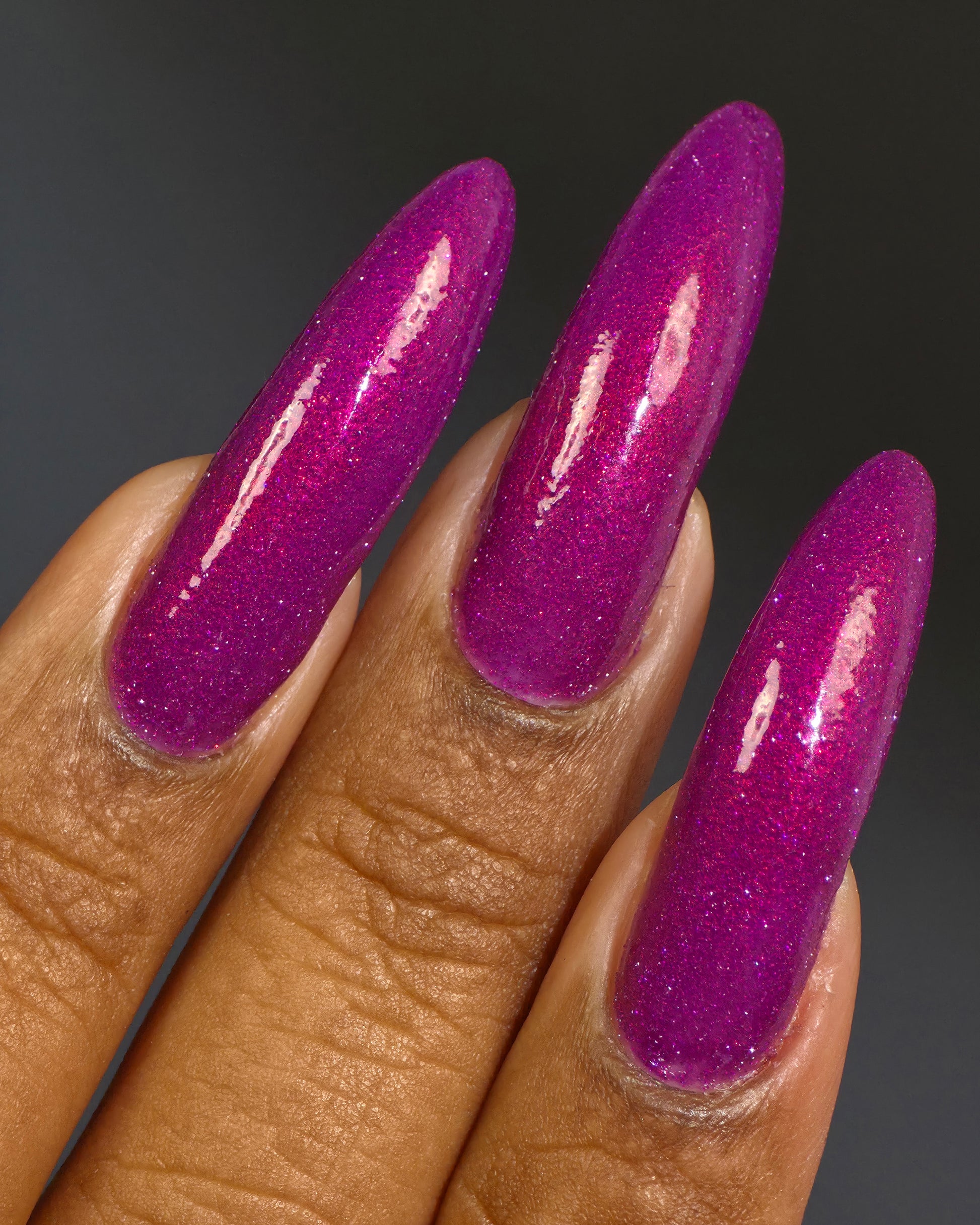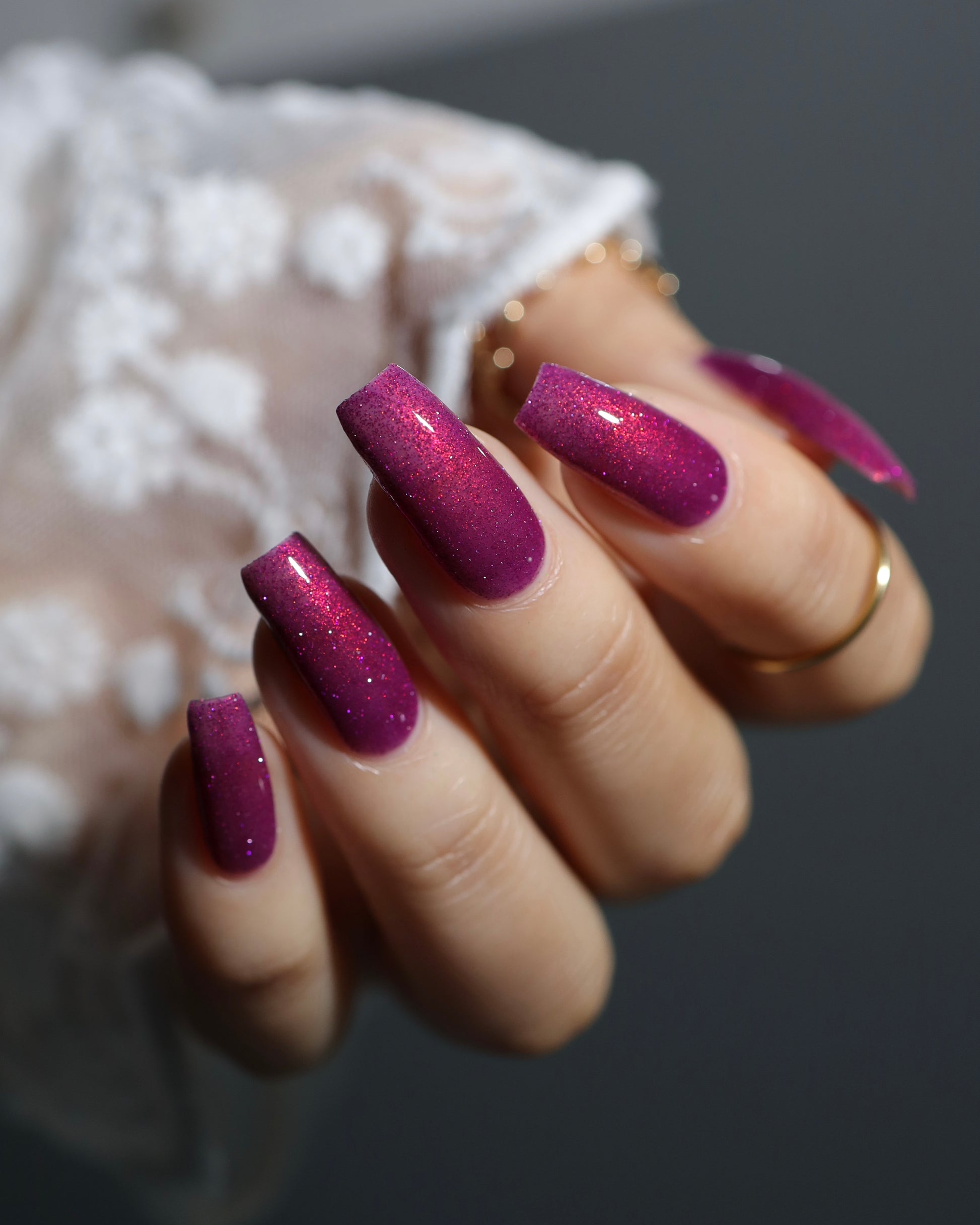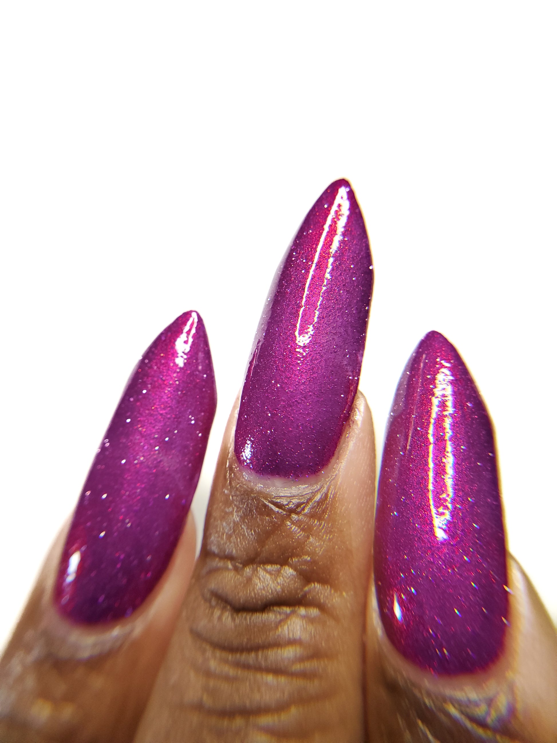 A purple jelly base with purple light reflective glitter and aurora shimmer that shifts from pinkish red to orange