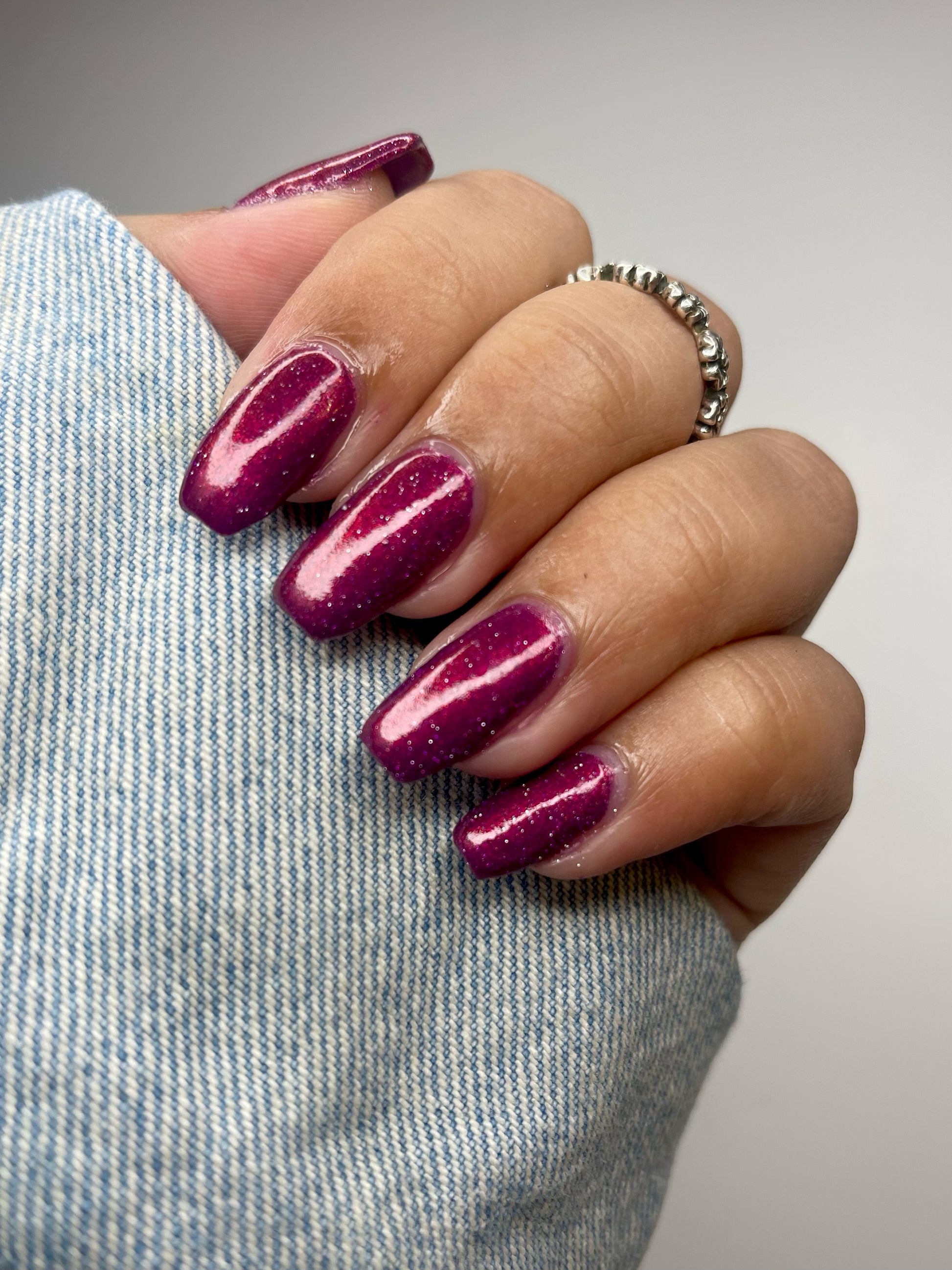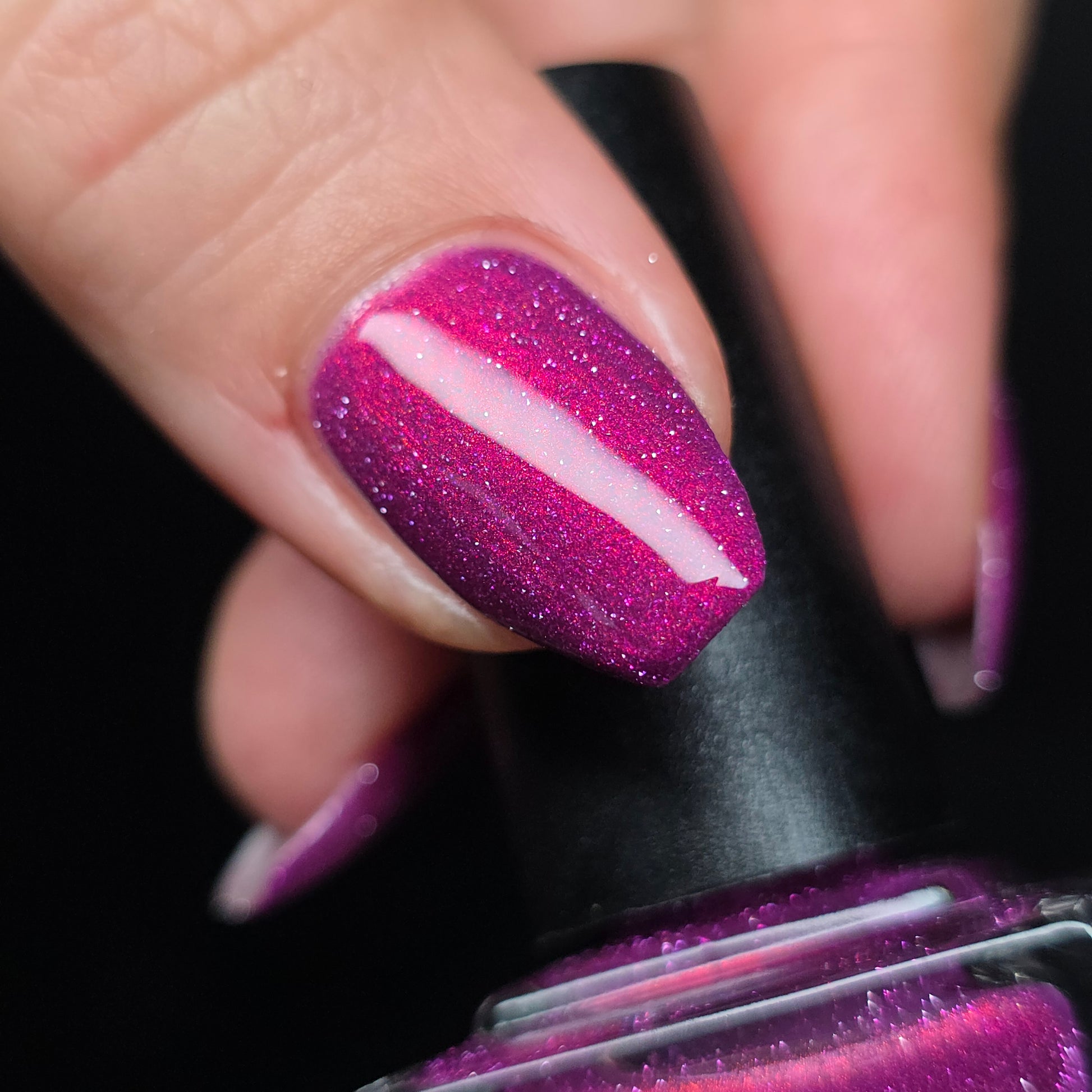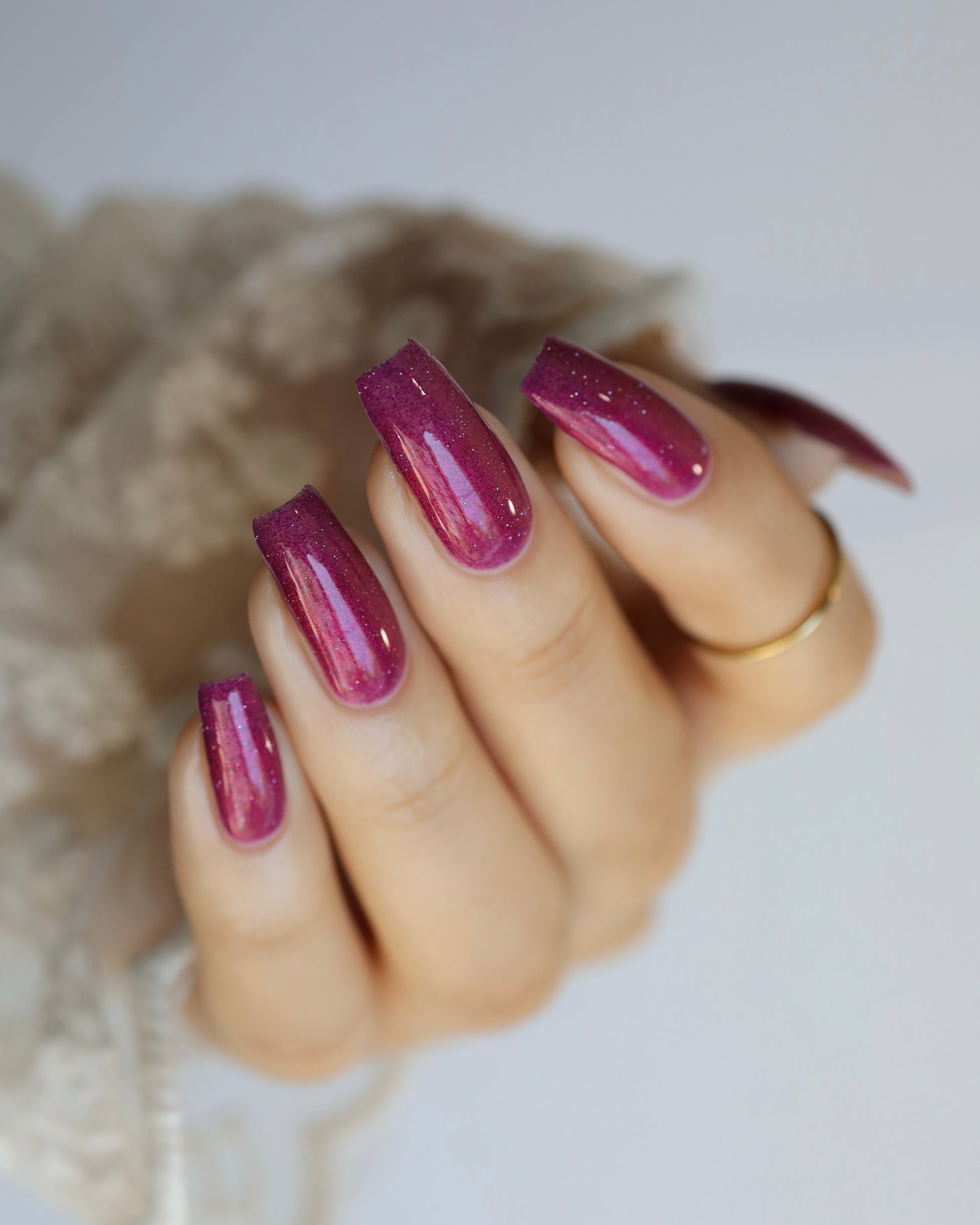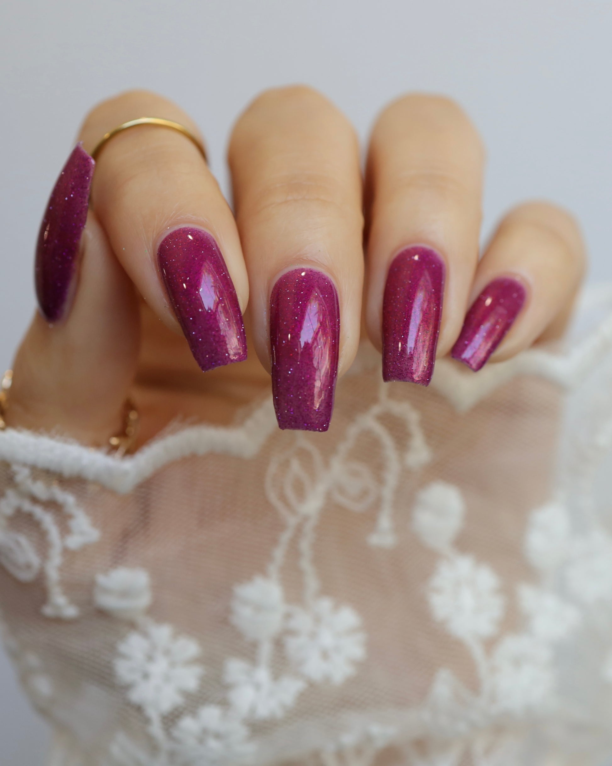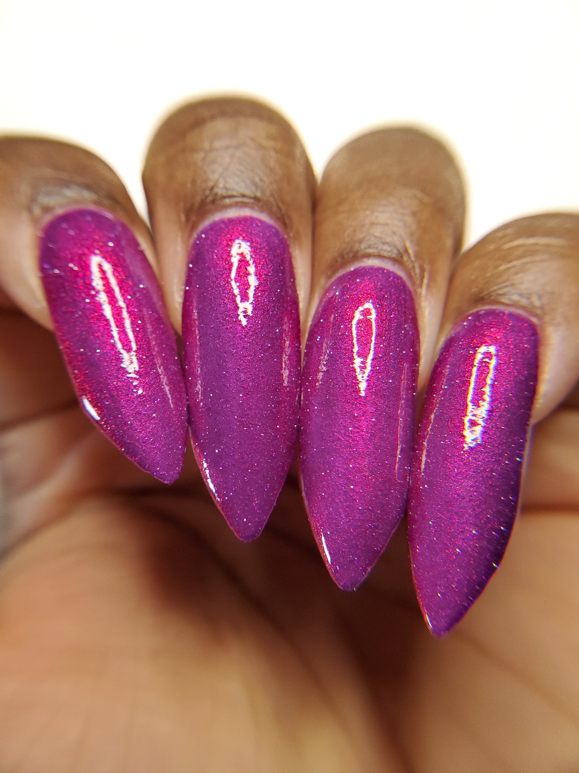 A purple jelly base with purple light reflective glitter and aurora shimmer that shifts from pinkish red to orange
