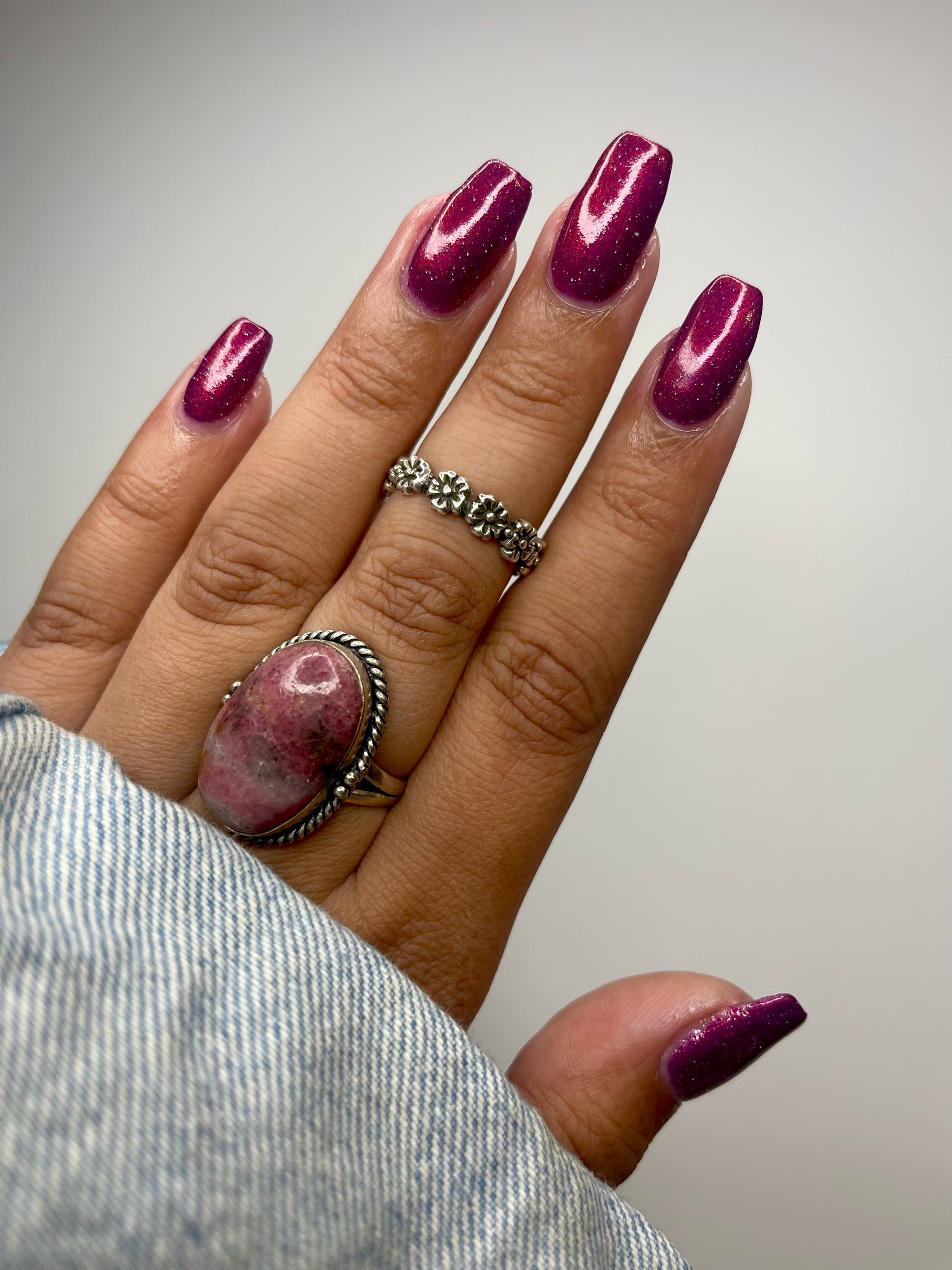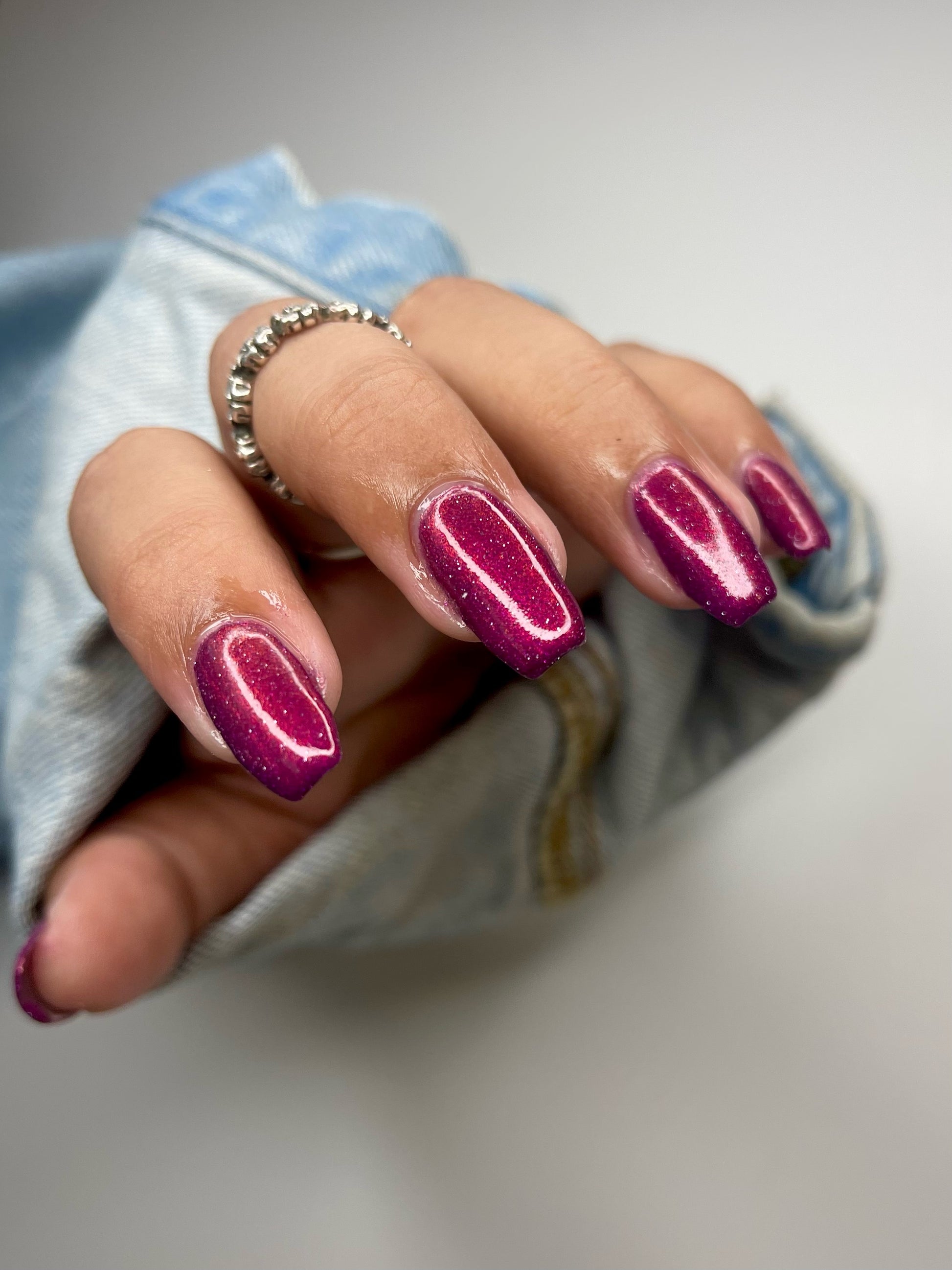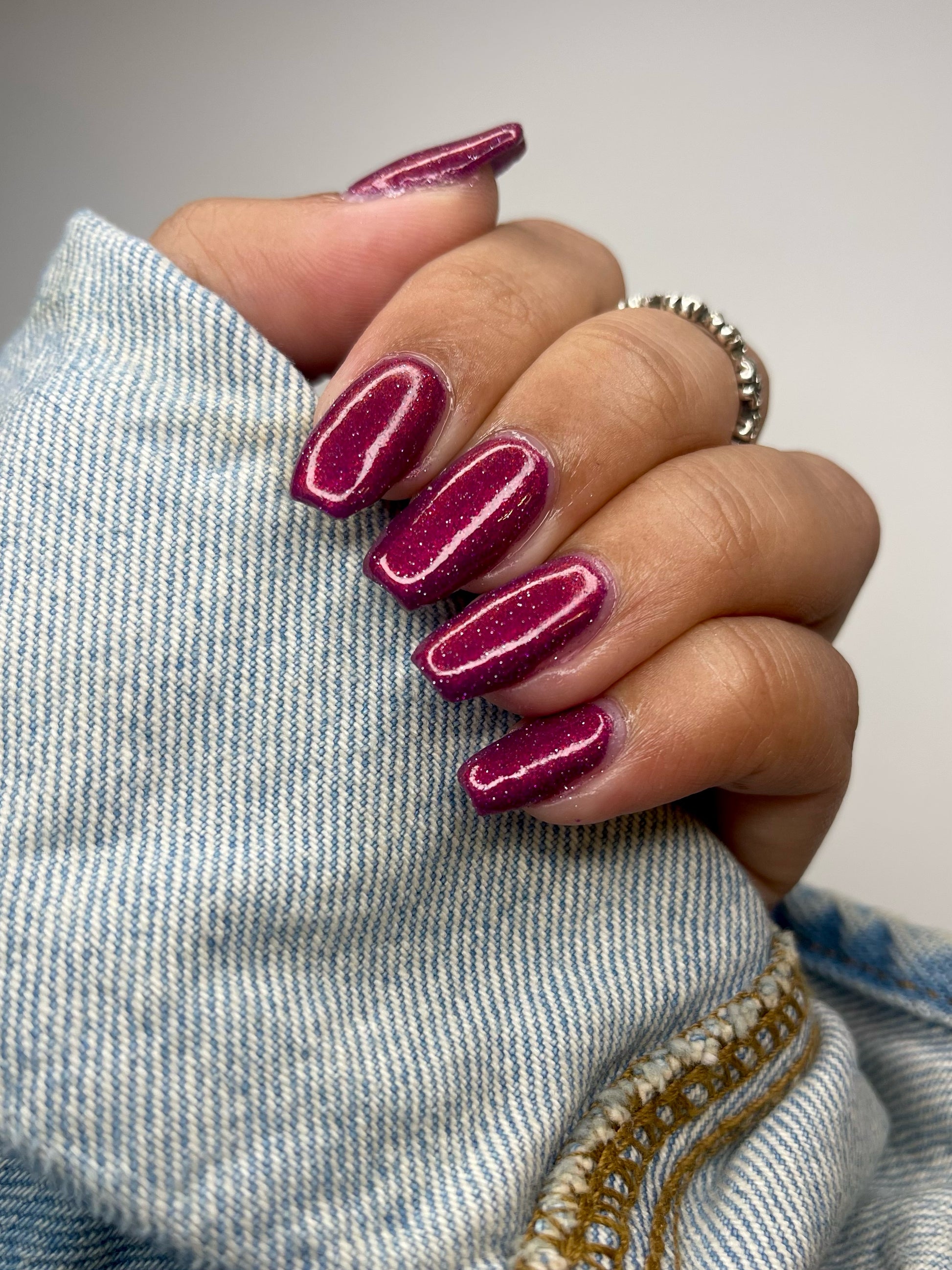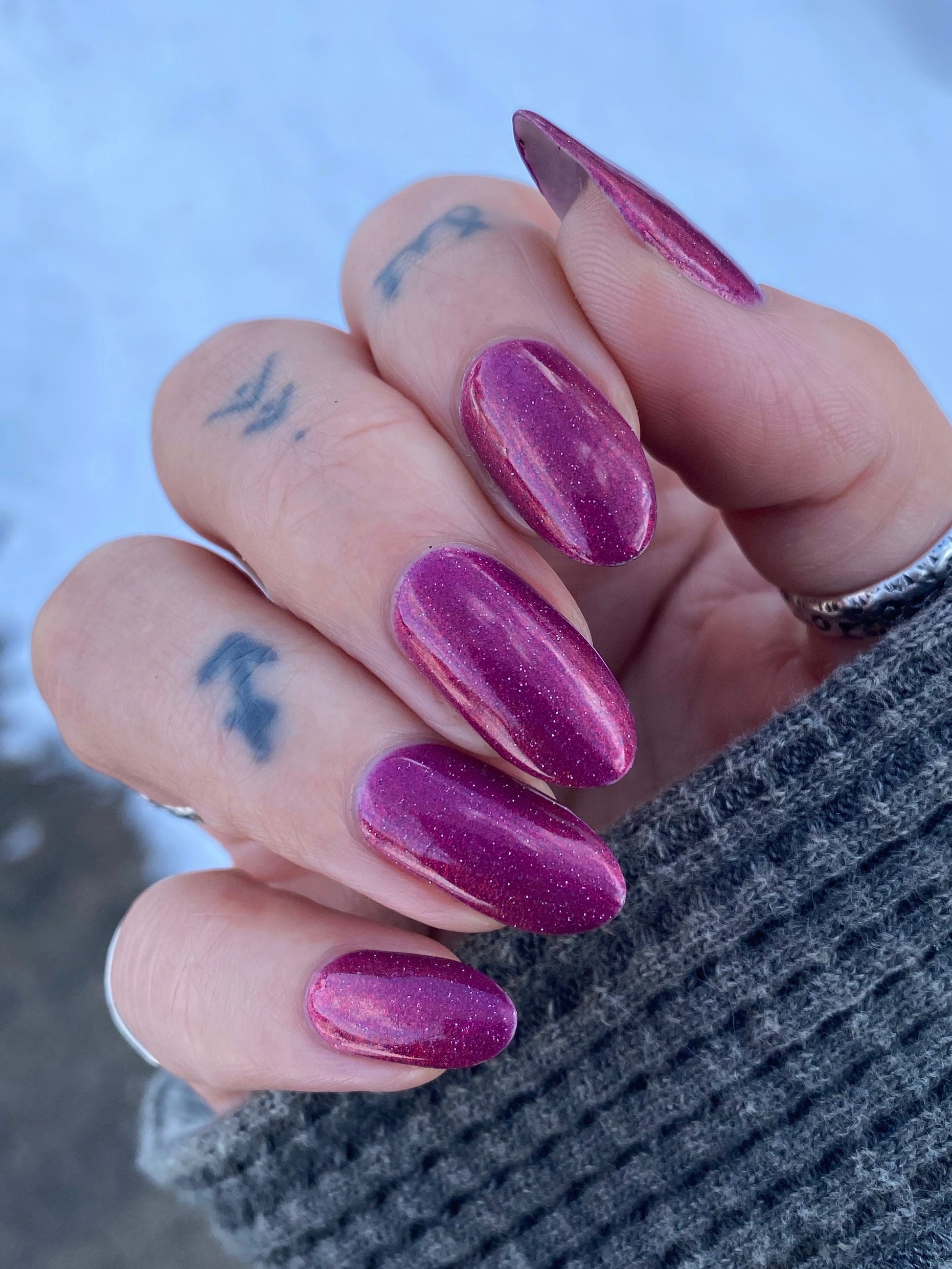 A purple jelly base with purple light reflective glitter and aurora shimmer that shifts from pinkish red to orange