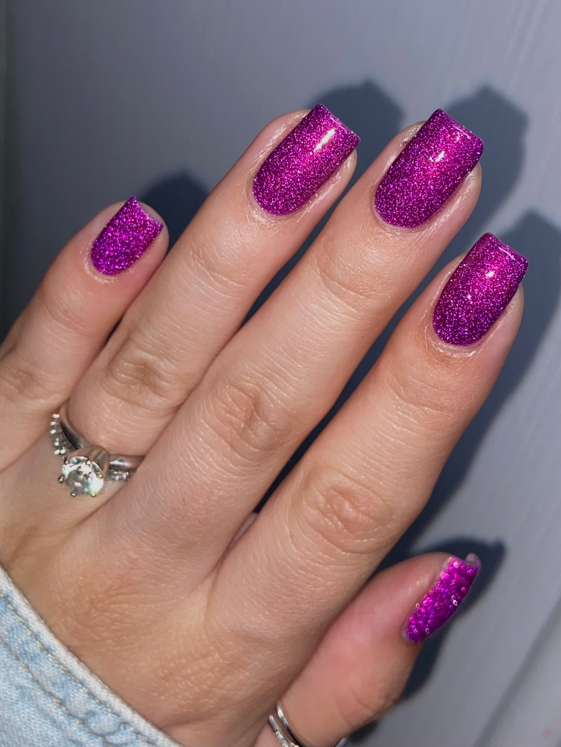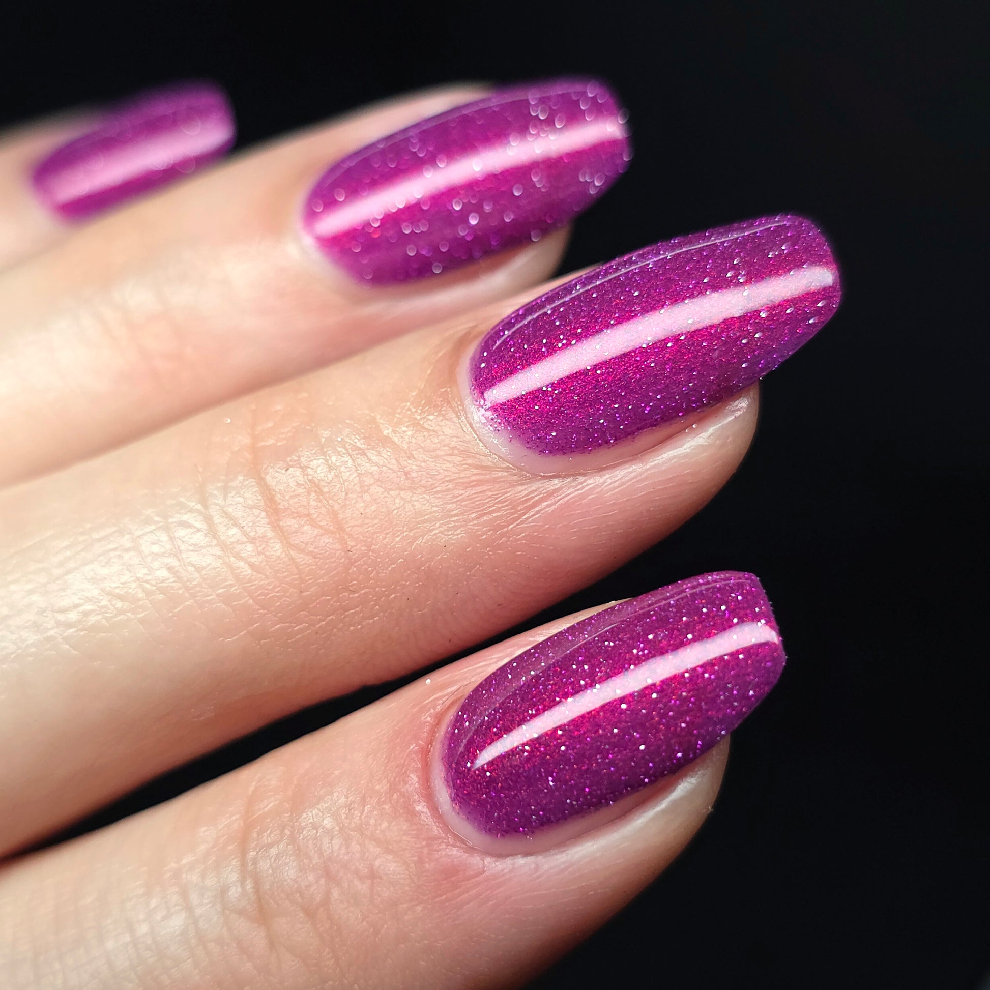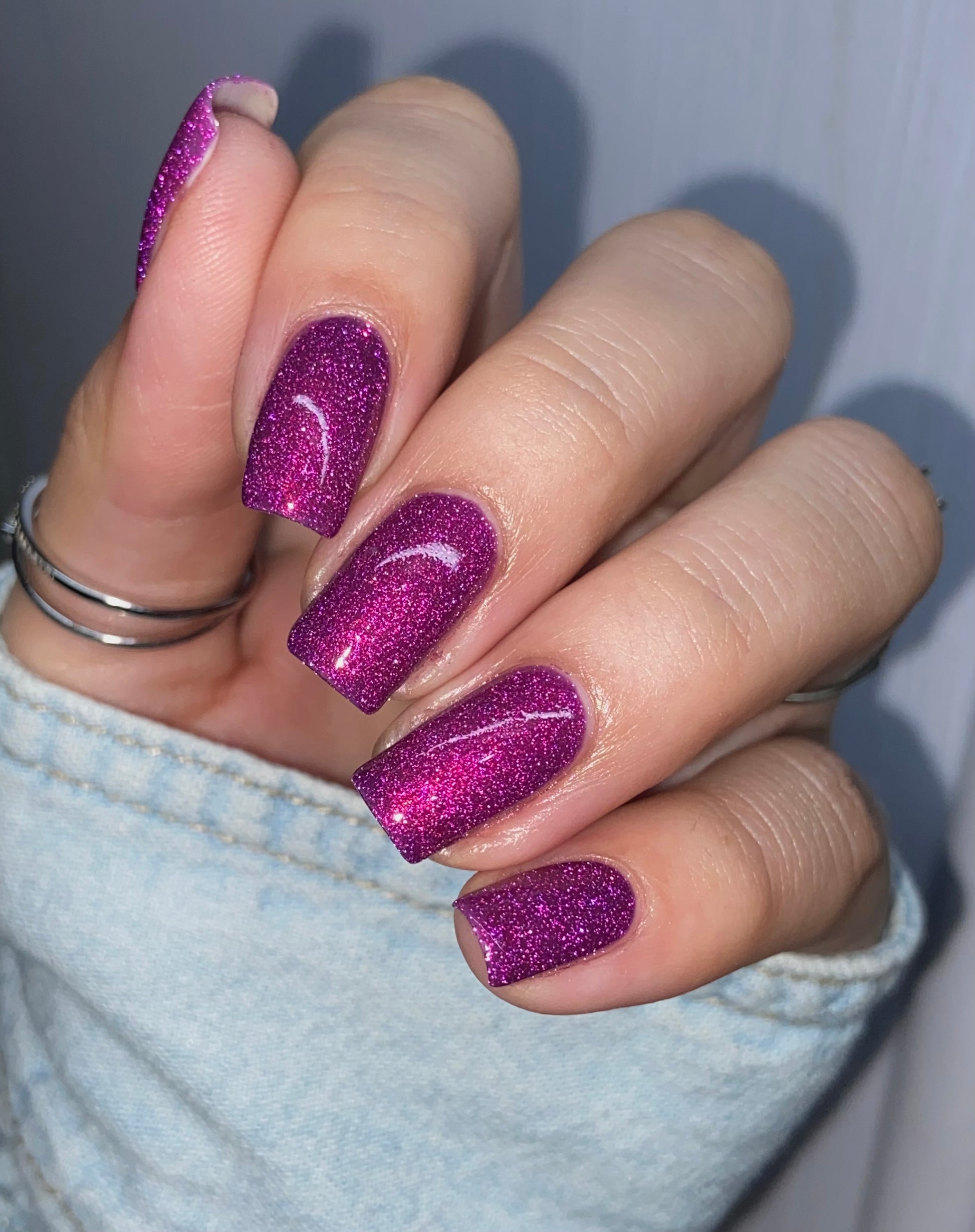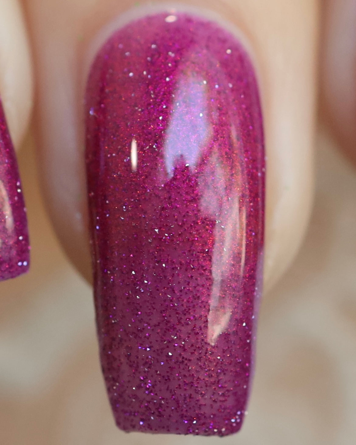 Please note: Reflective glitter polishes are textured and dry down with a gritty, sandpaper feeling. To make them look smooth and glossy, I recommend applying 2-3 coats of the polish, then applying one coat of a glitter smoother, followed by one coat of top coat.