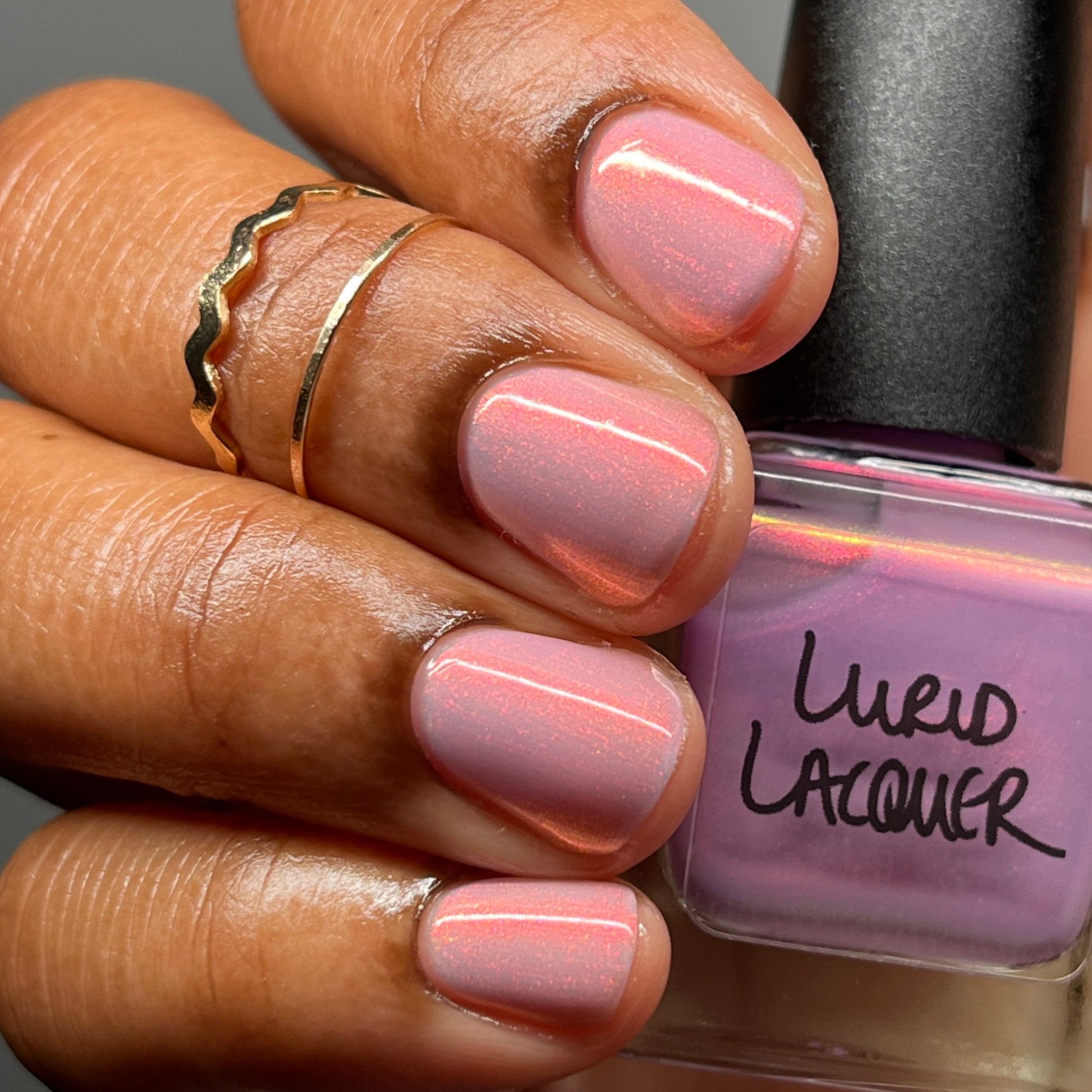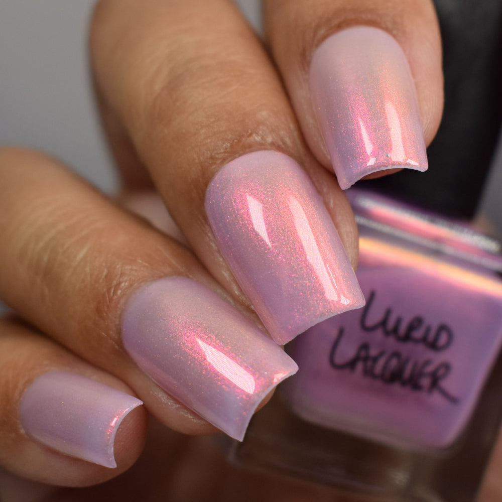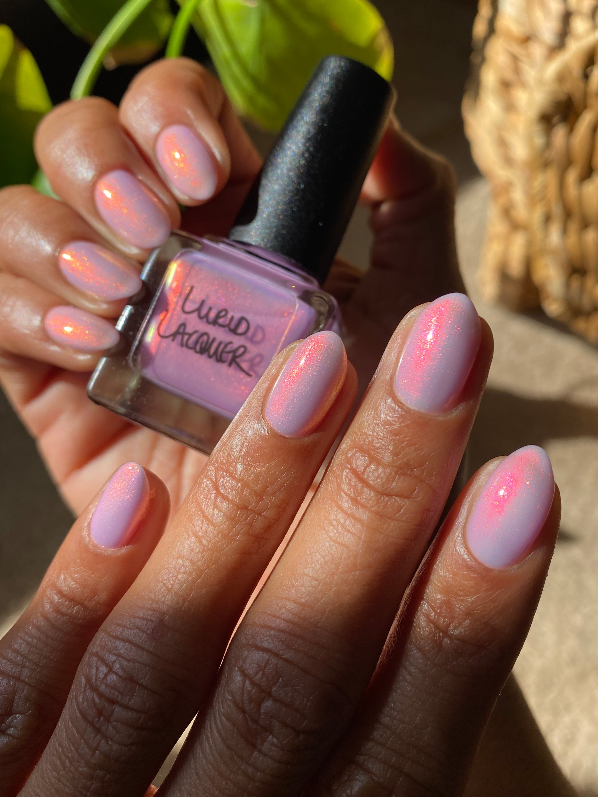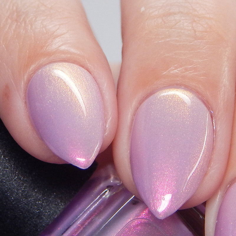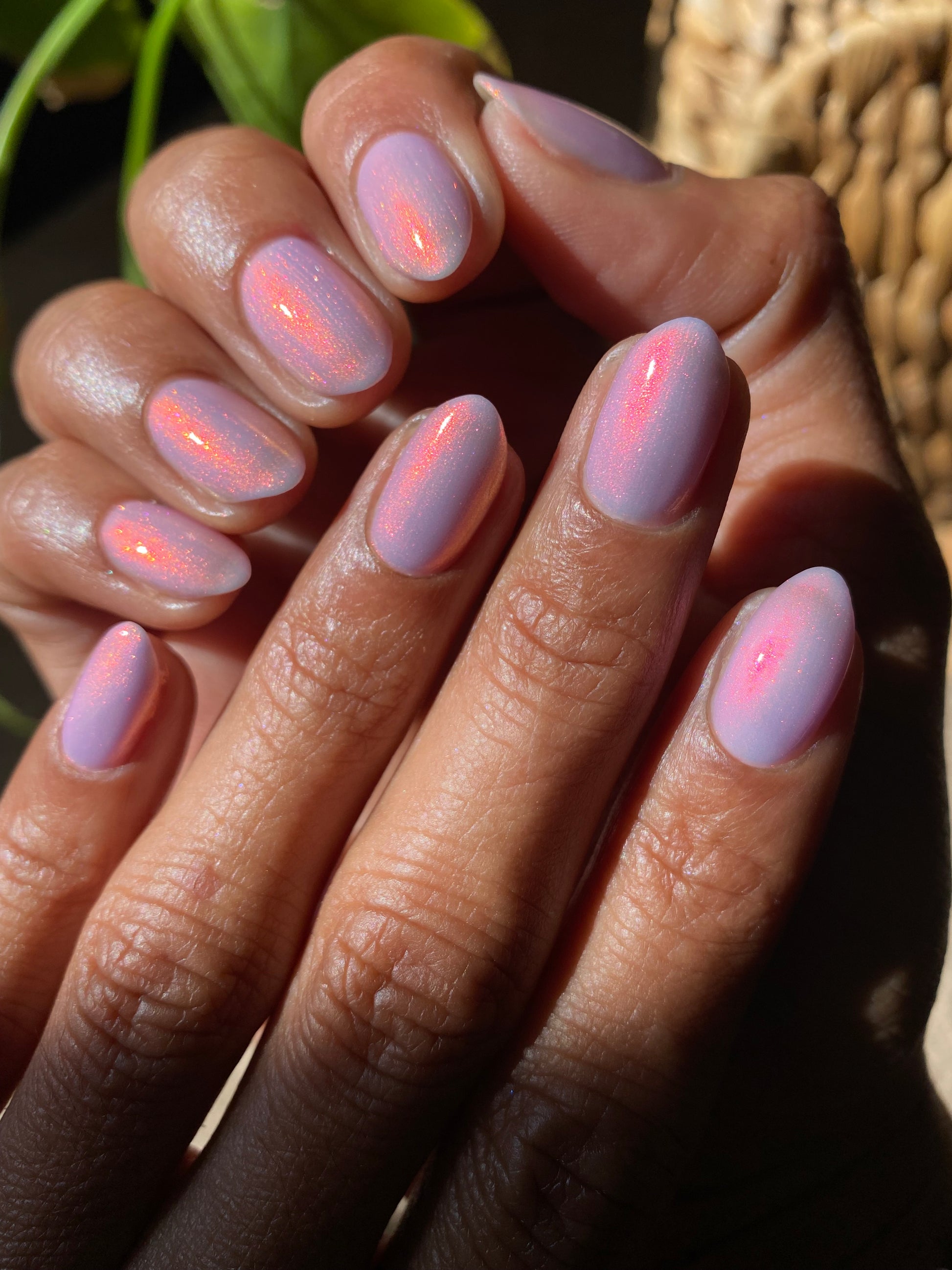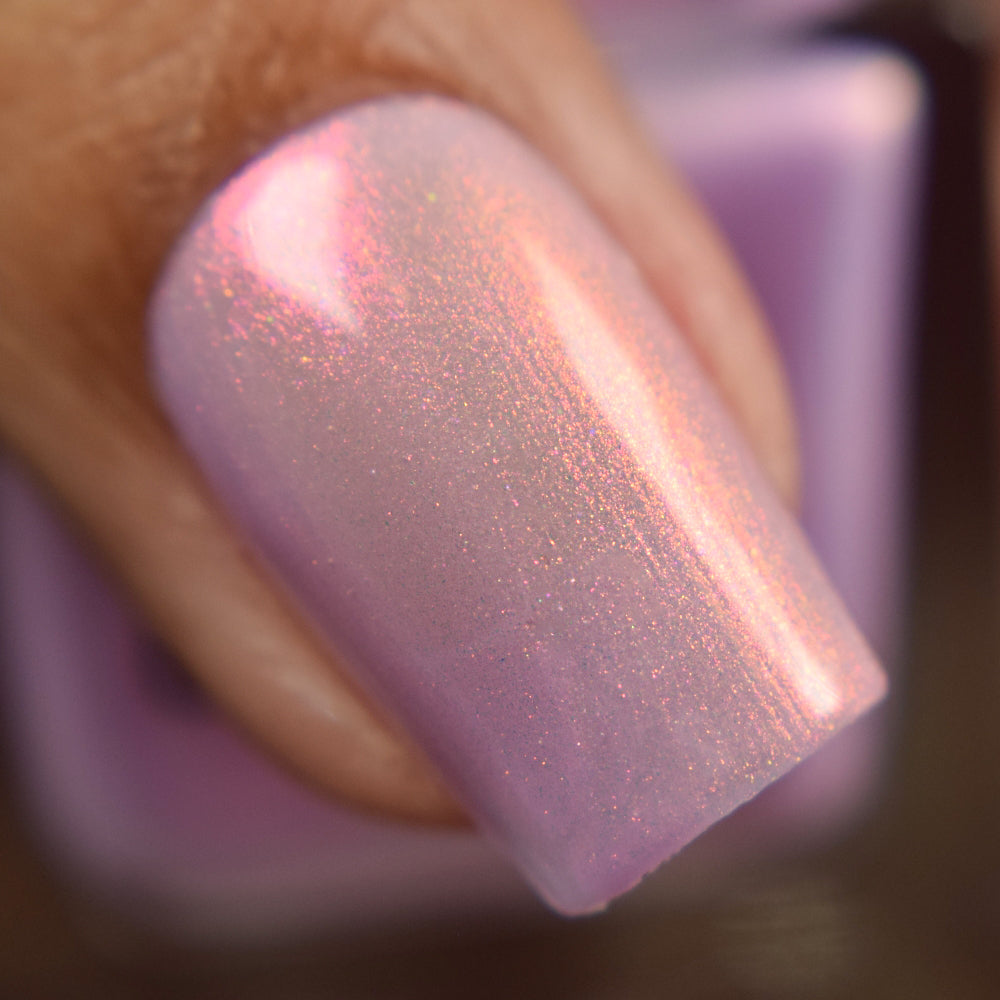 A semi-sheer lavender crelly with a pink to orange to gold aurora shimmer