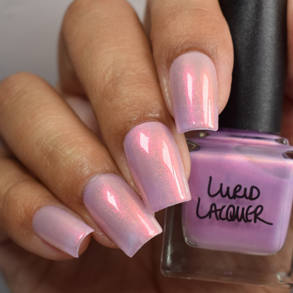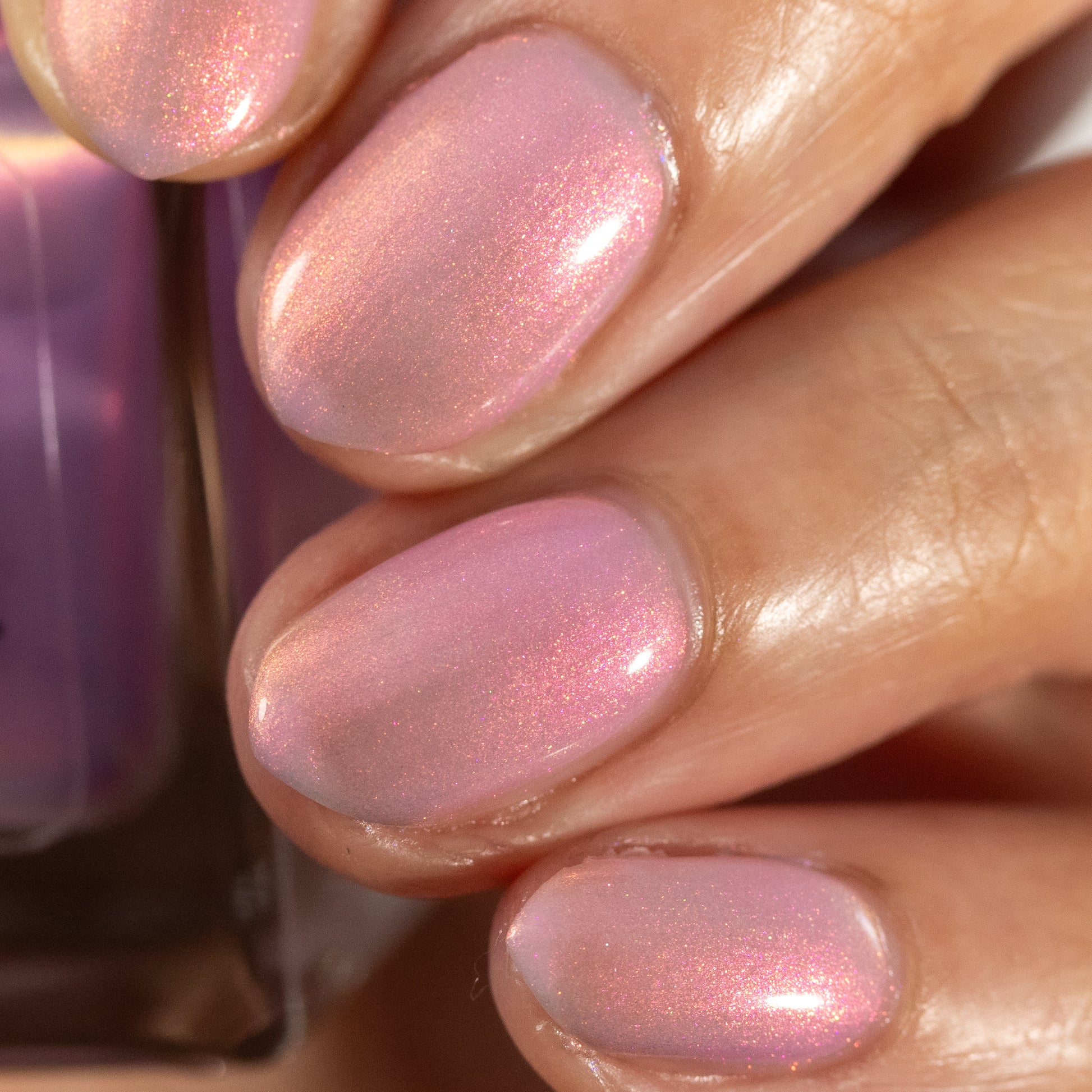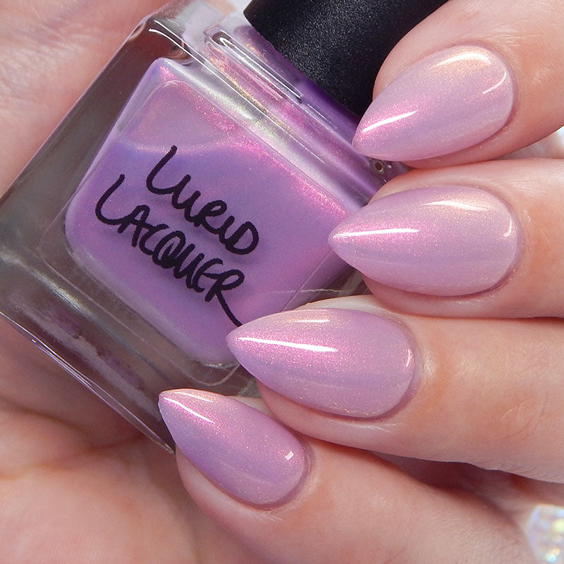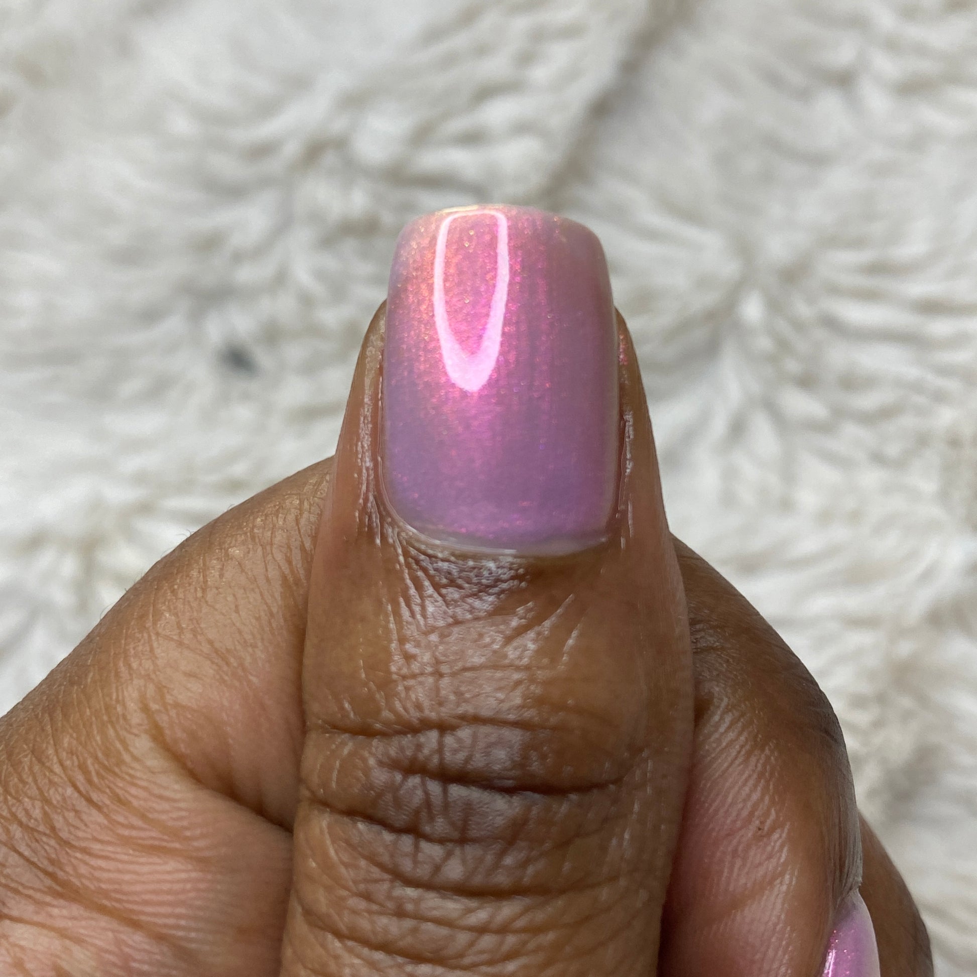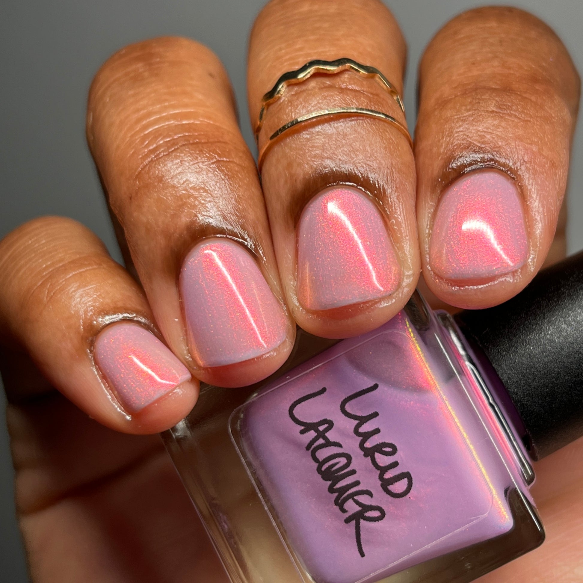 A semi-sheer lavender crelly with a pink to orange to gold aurora shimmer