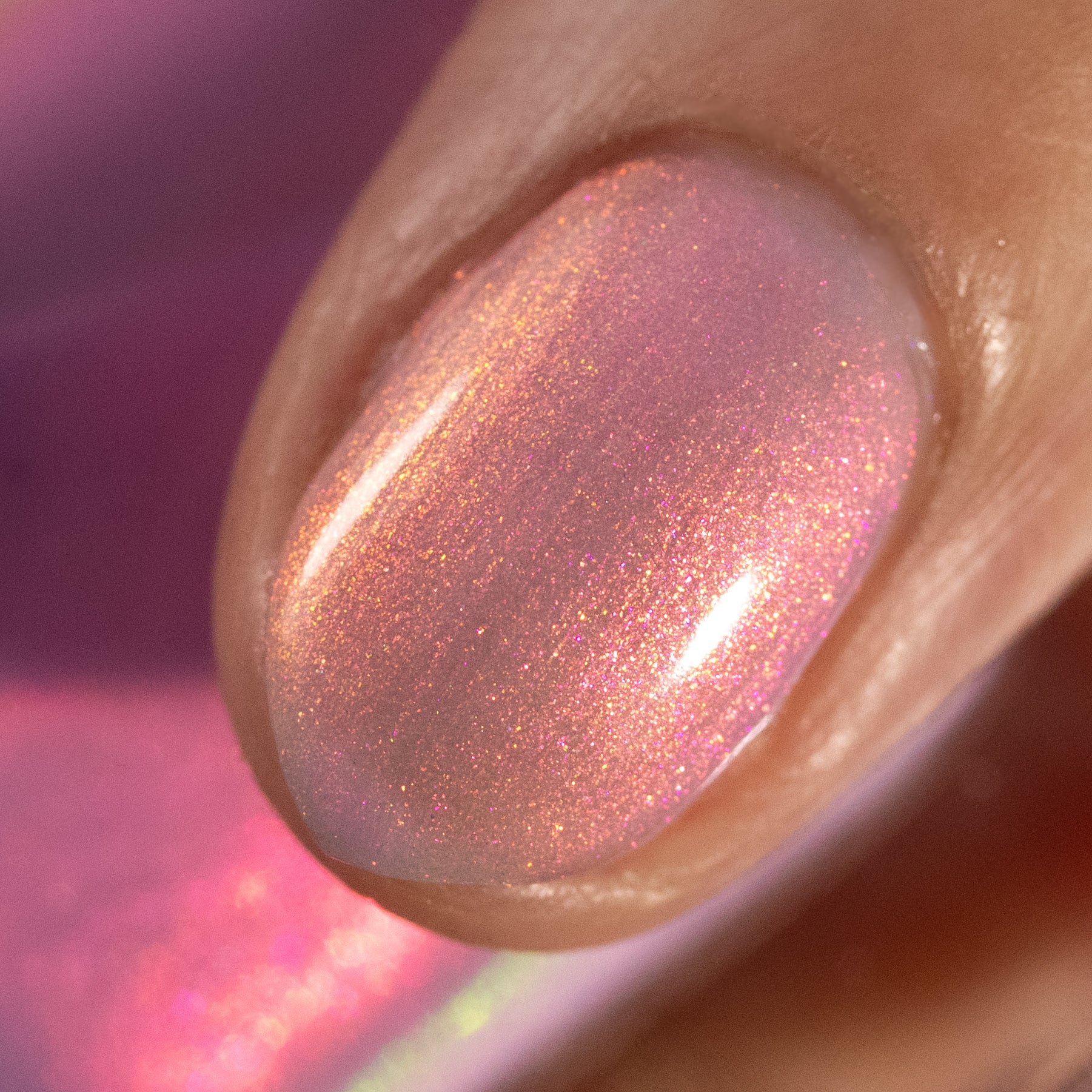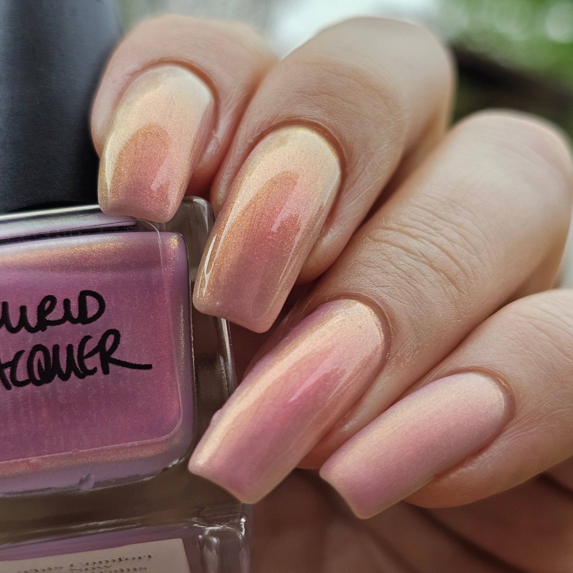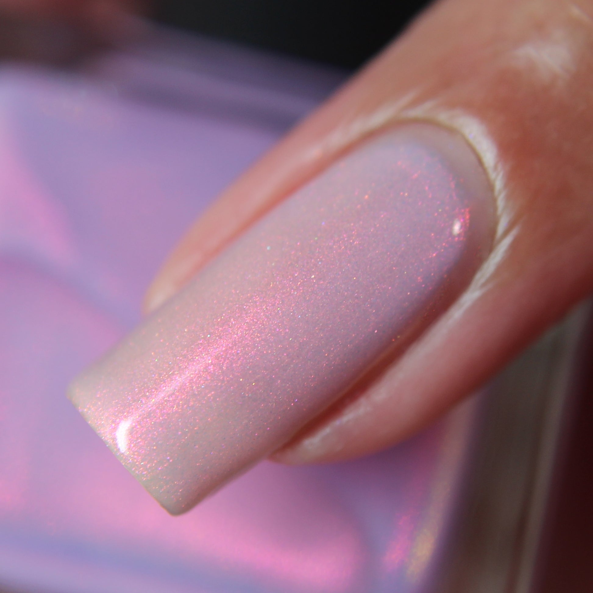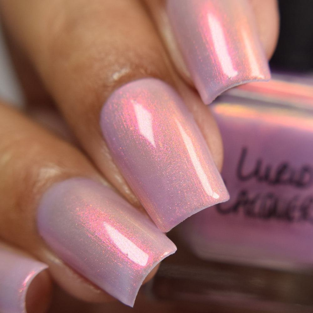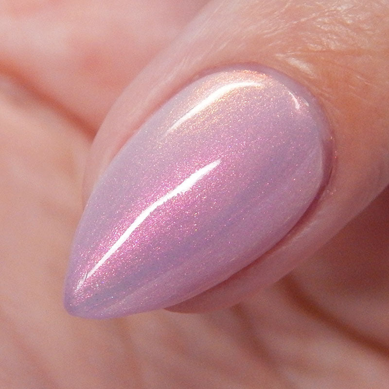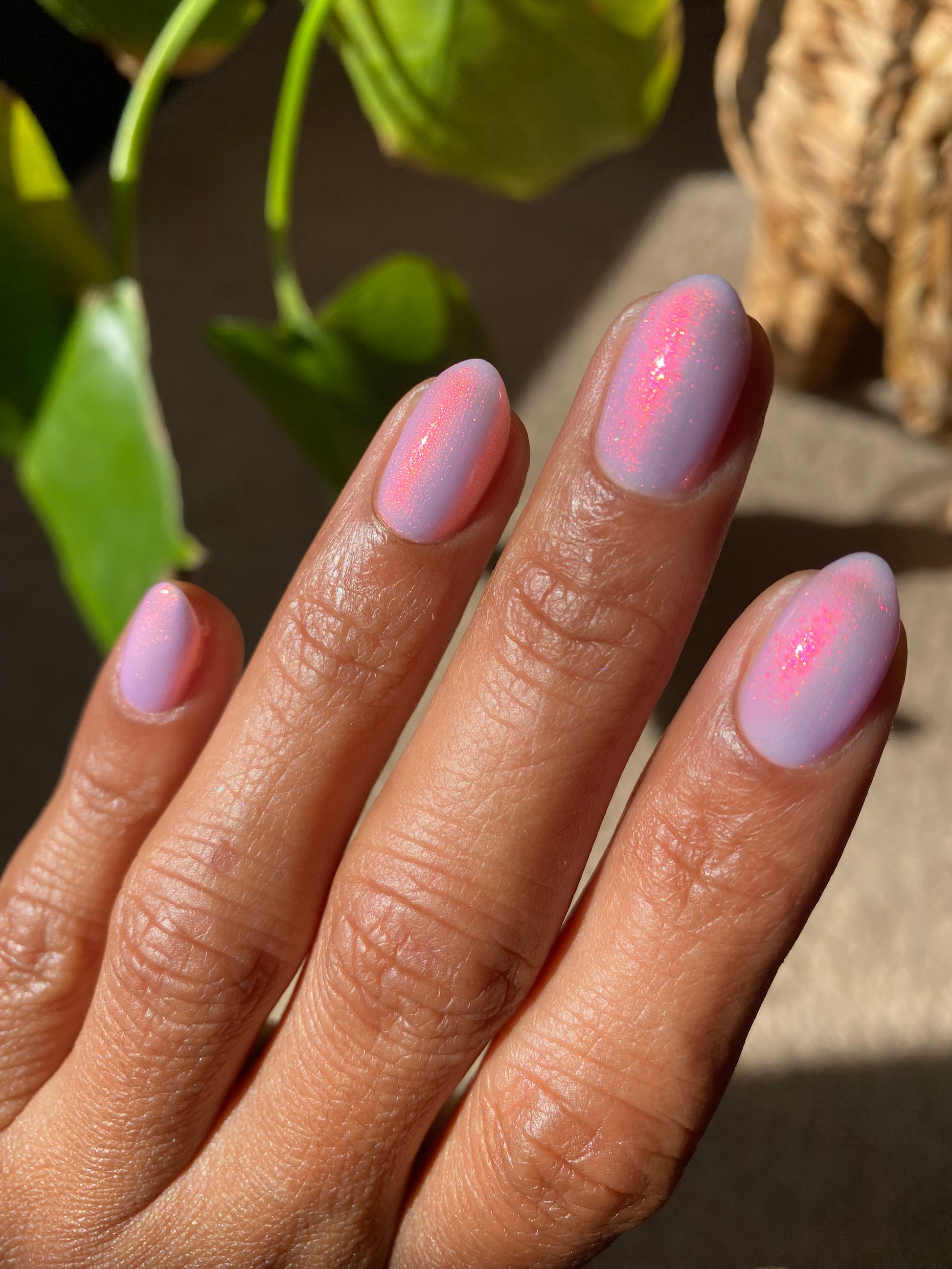 A semi-sheer lavender crelly with a pink to orange to gold aurora shimmer