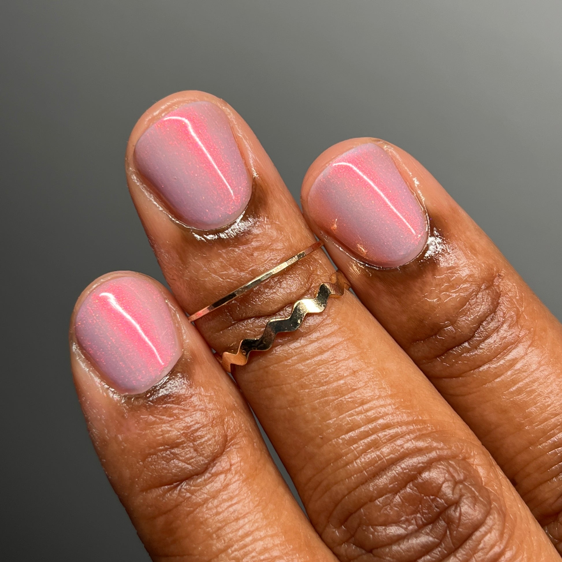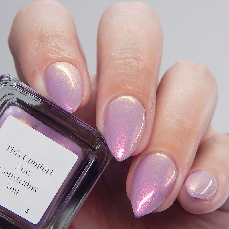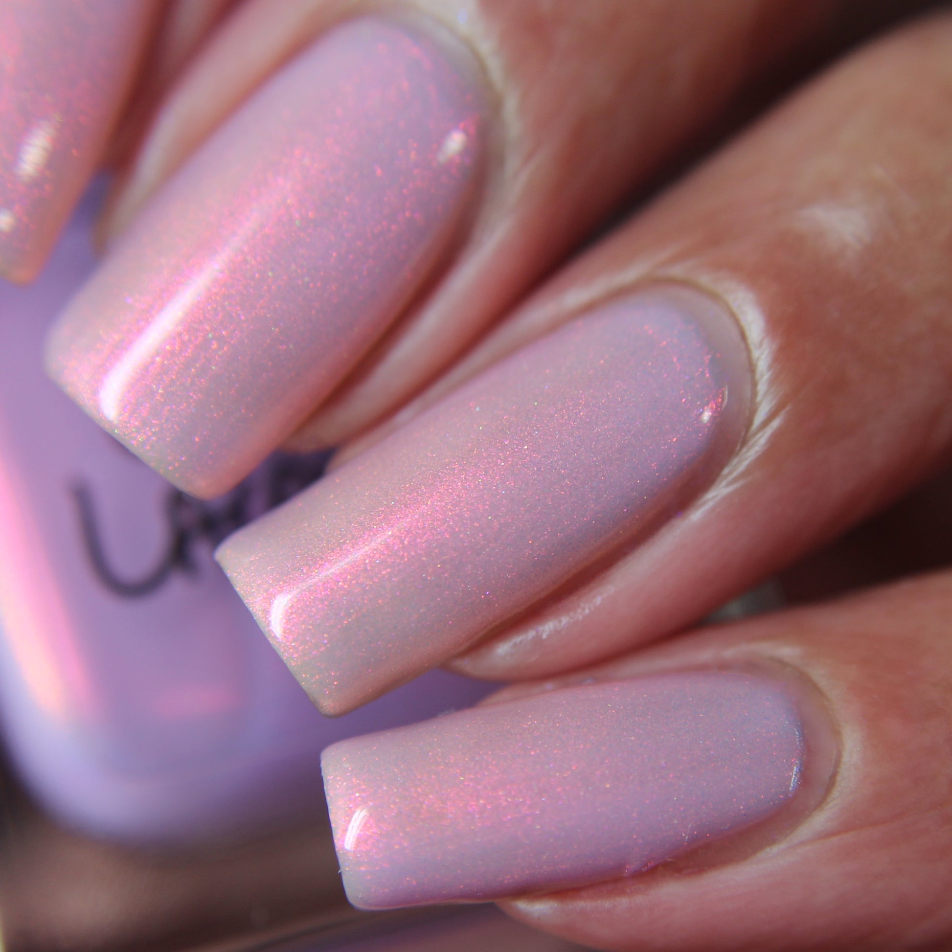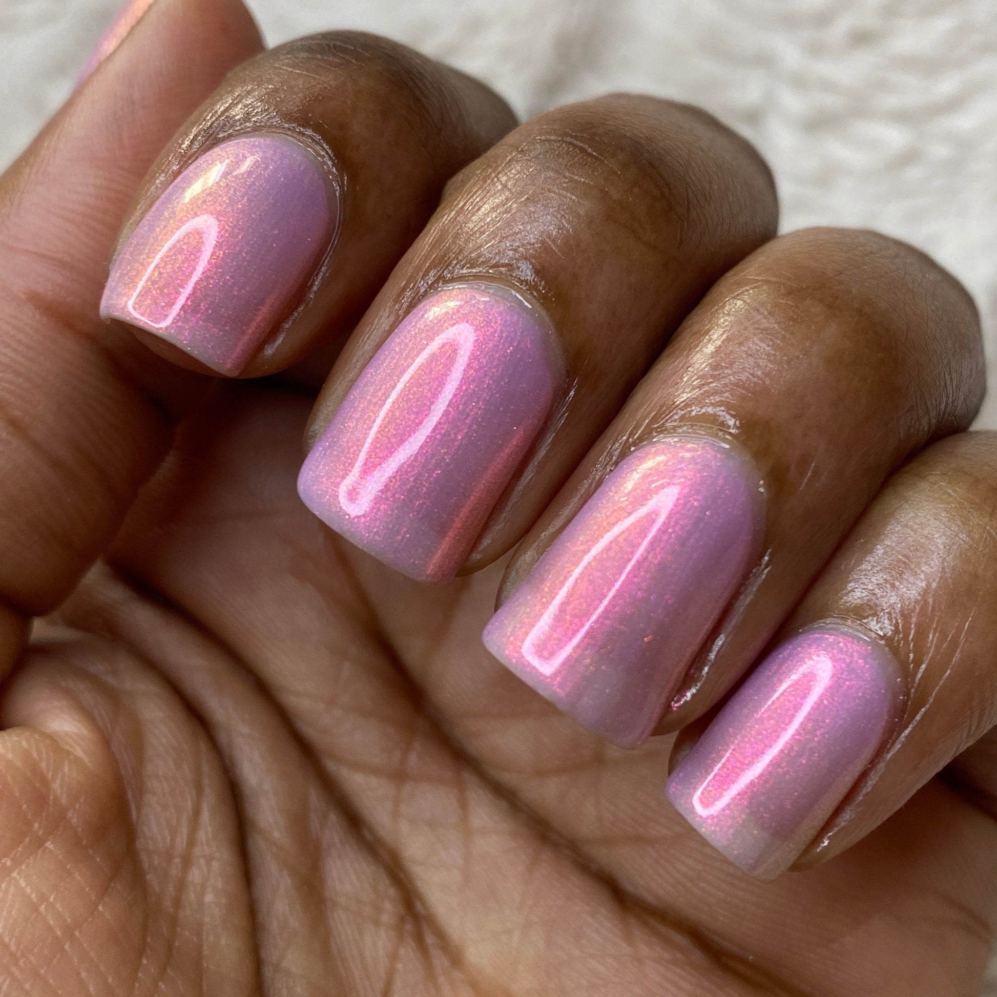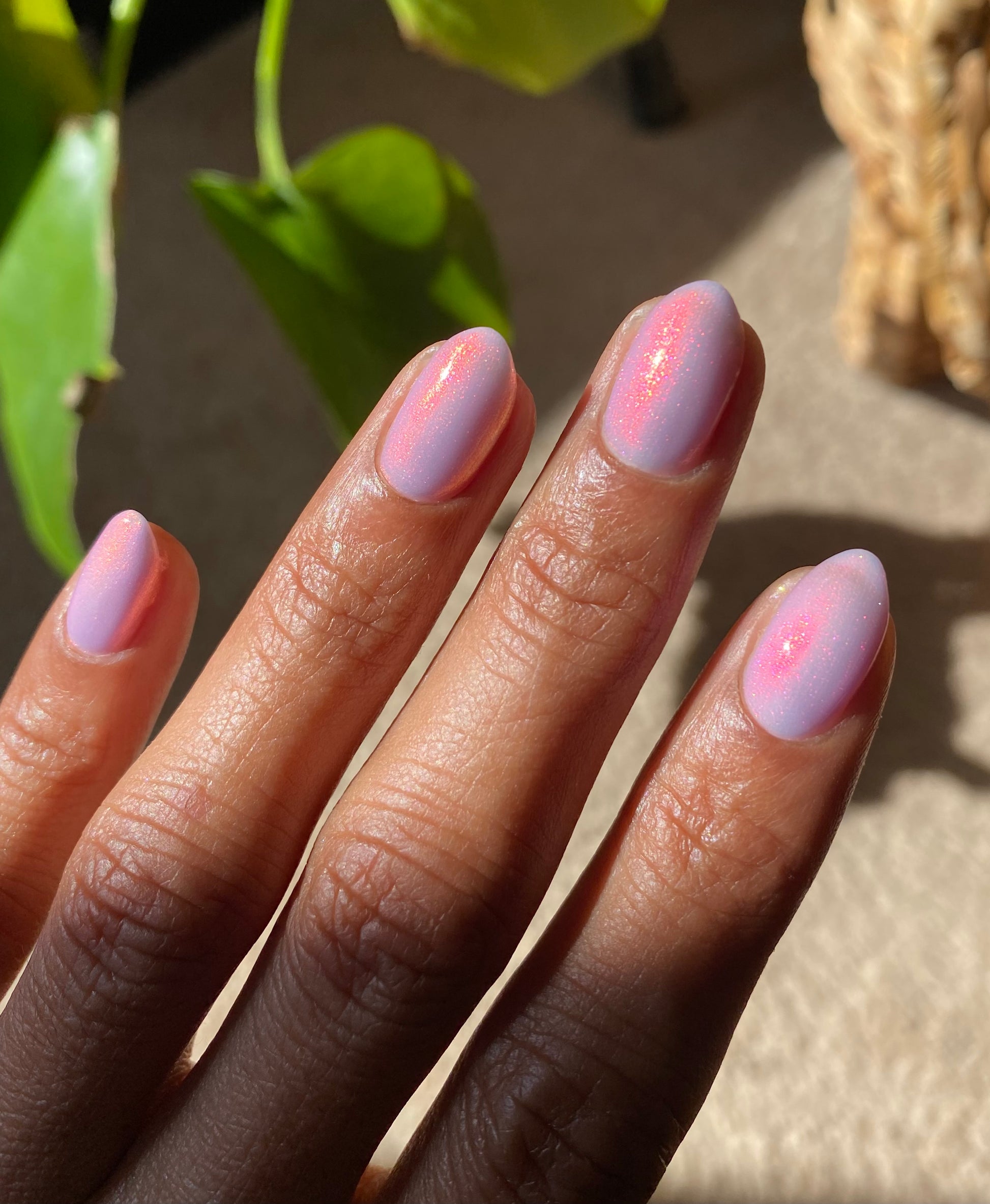 A semi-sheer lavender crelly with a pink to orange to gold aurora shimmer