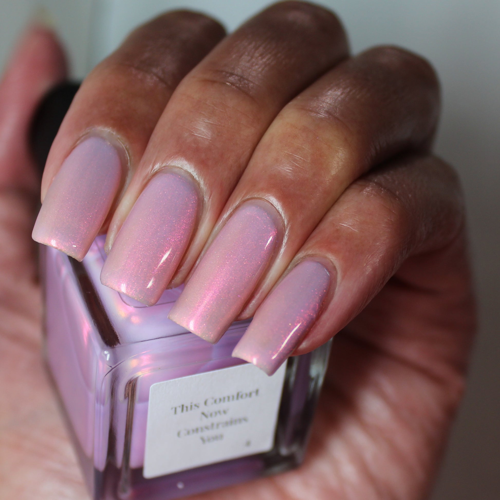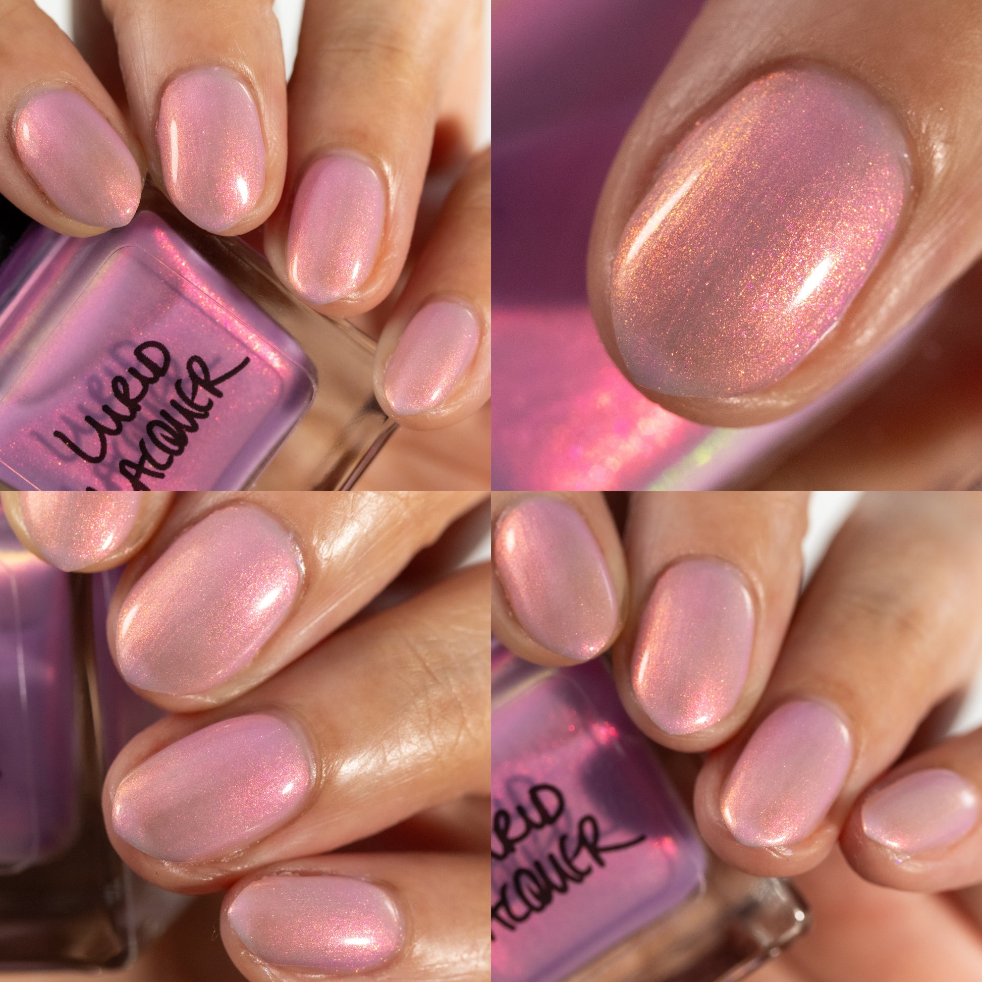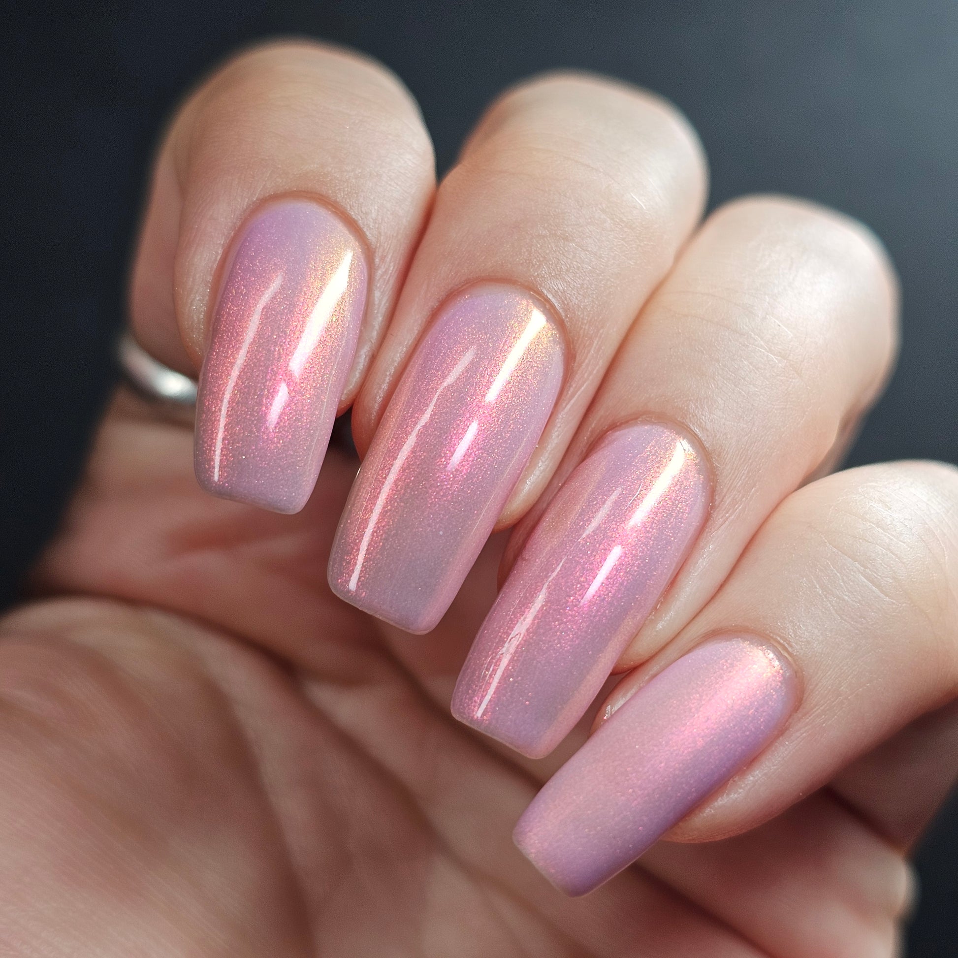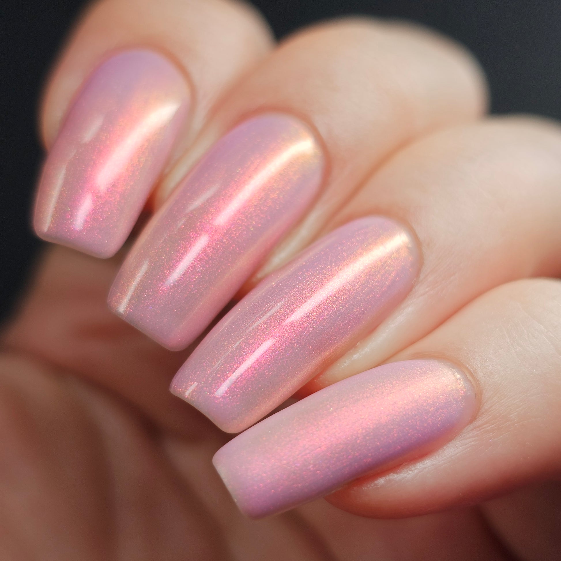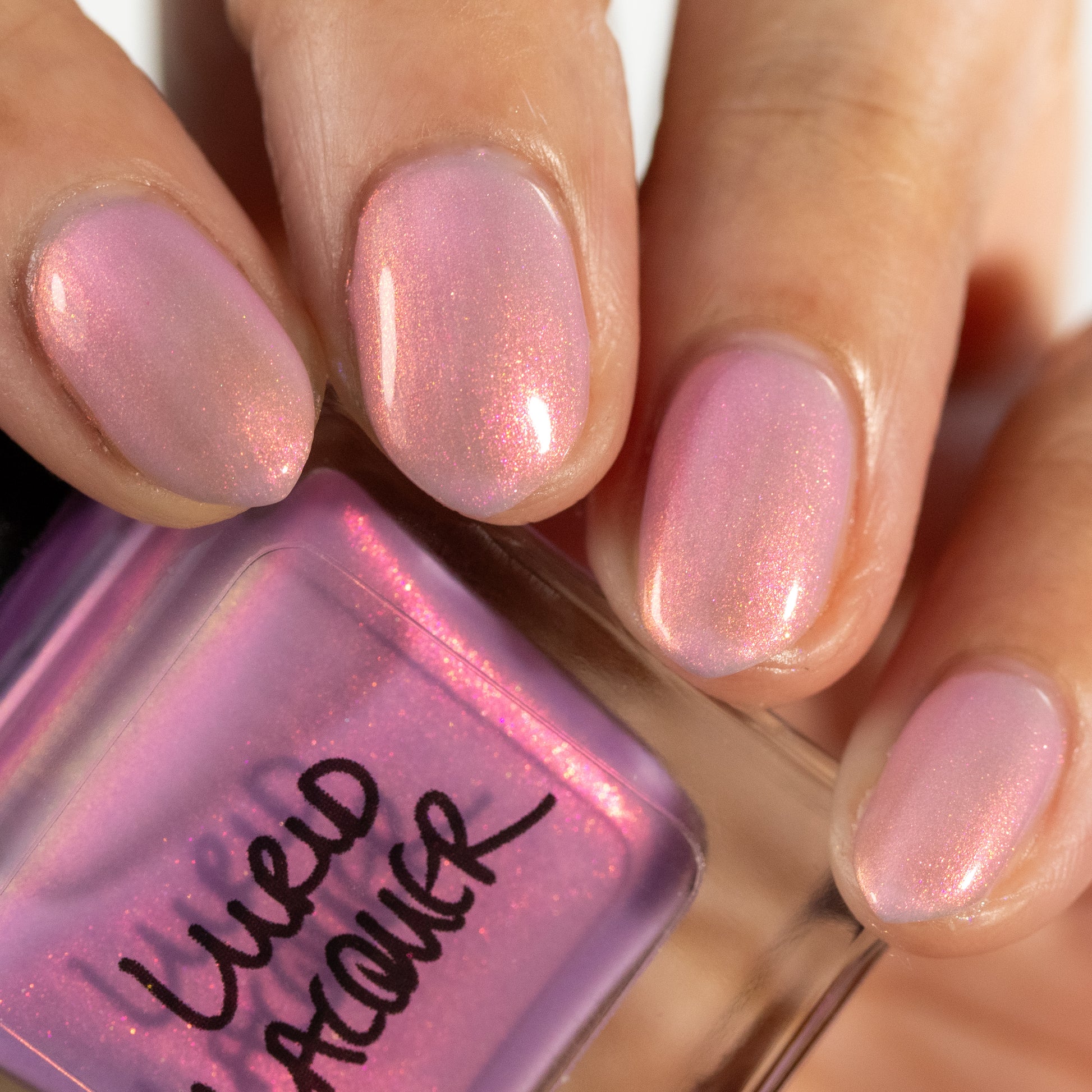 A semi-sheer lavender crelly with a pink to orange to gold aurora shimmer