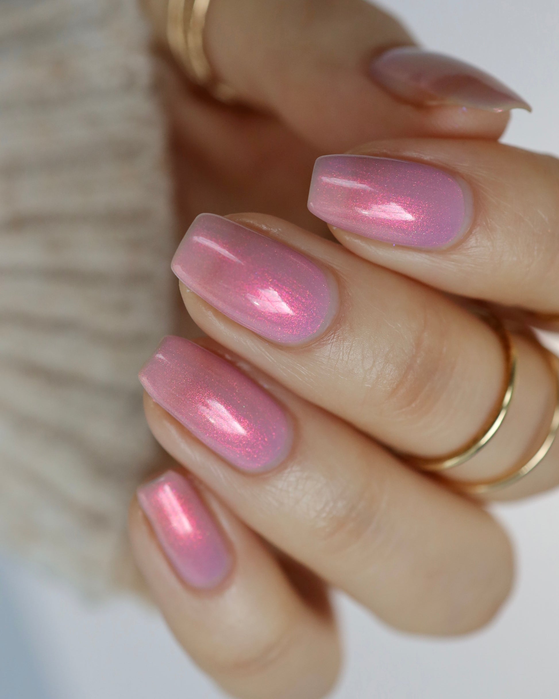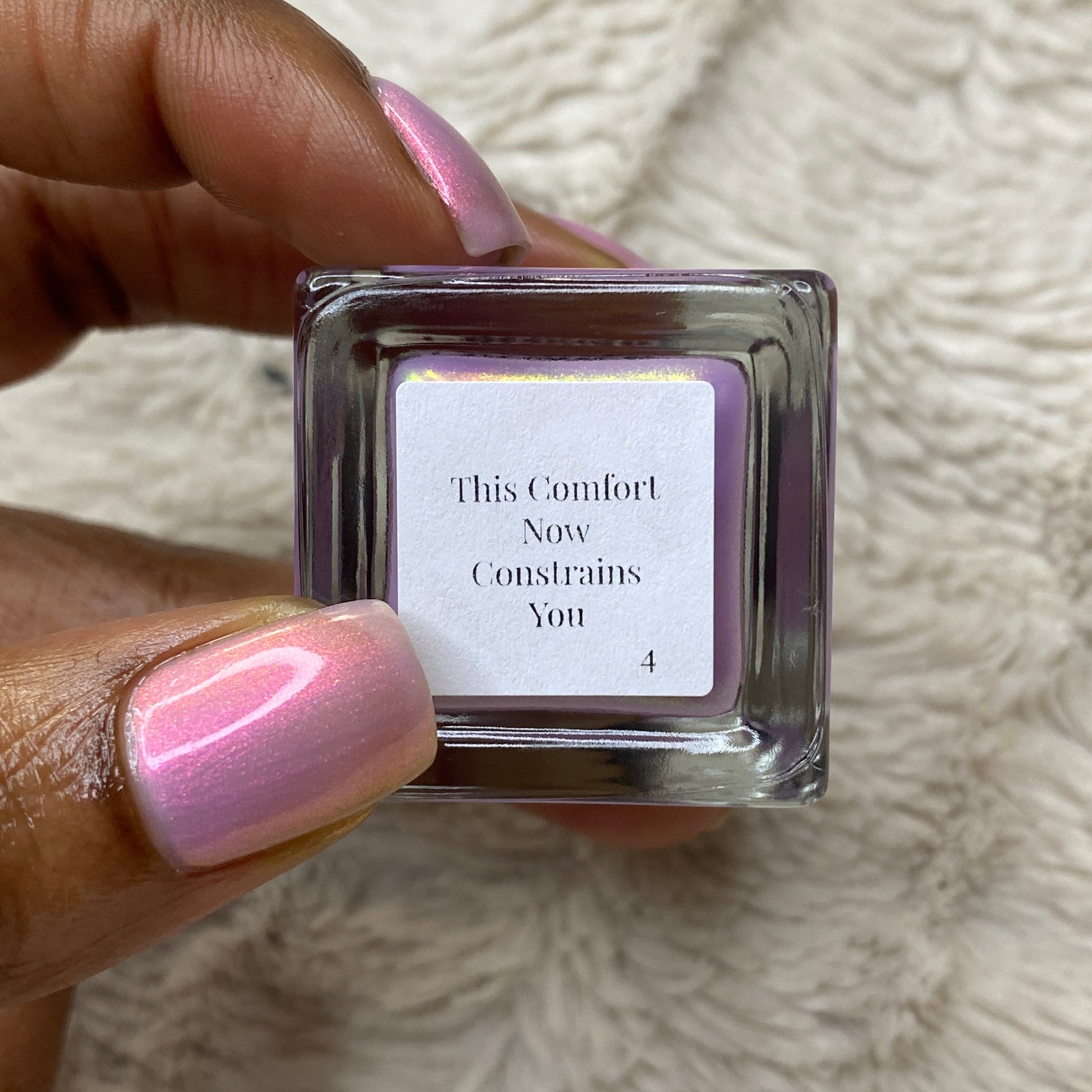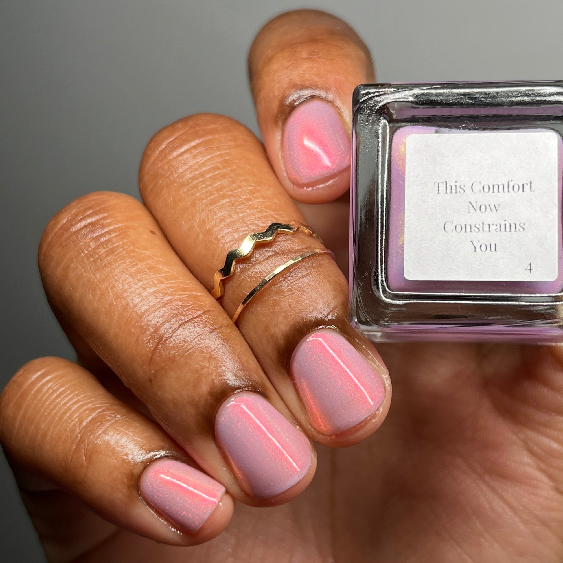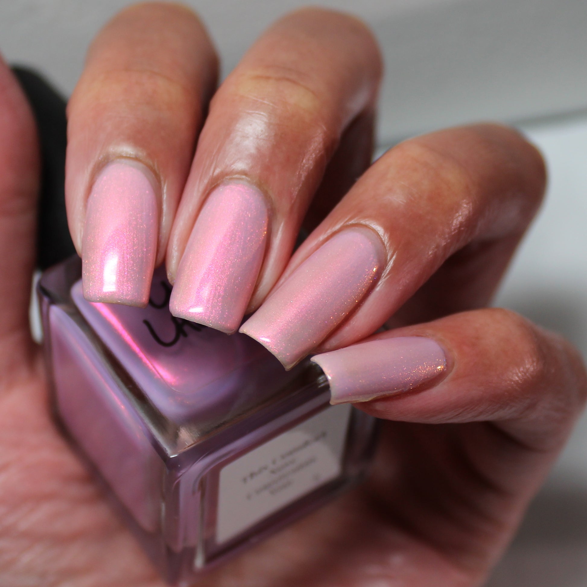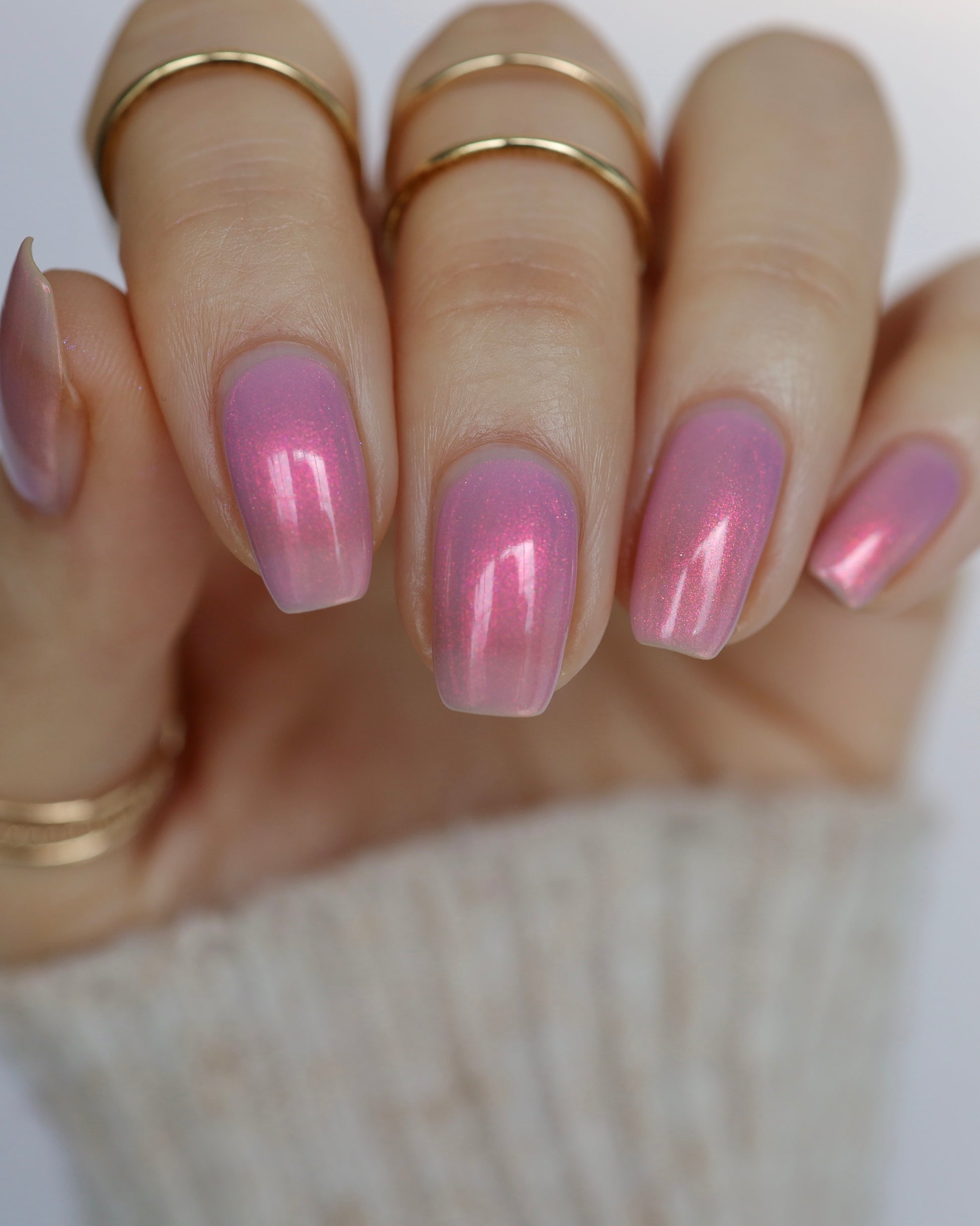 A semi-sheer lavender crelly with a pink to orange to gold aurora shimmer