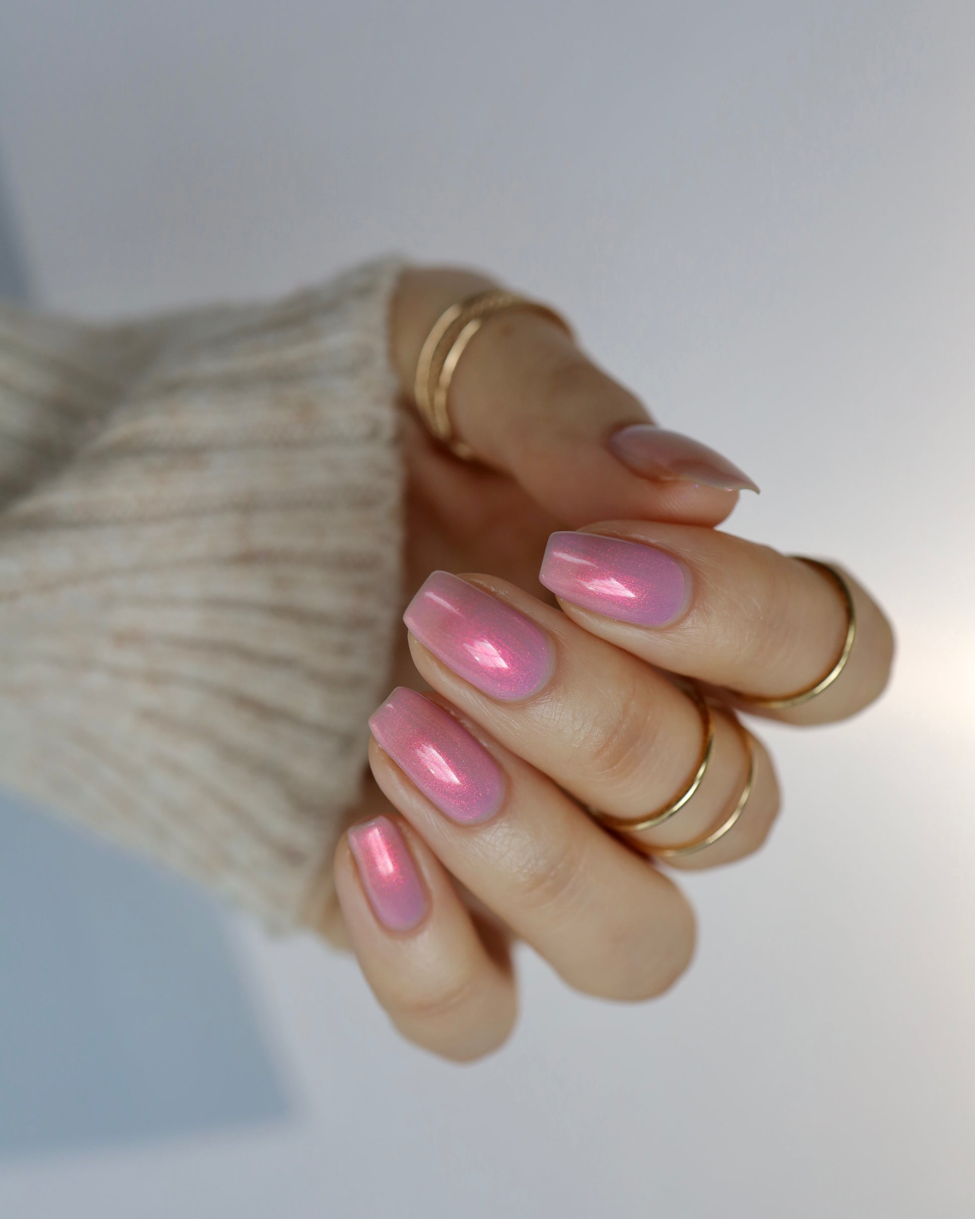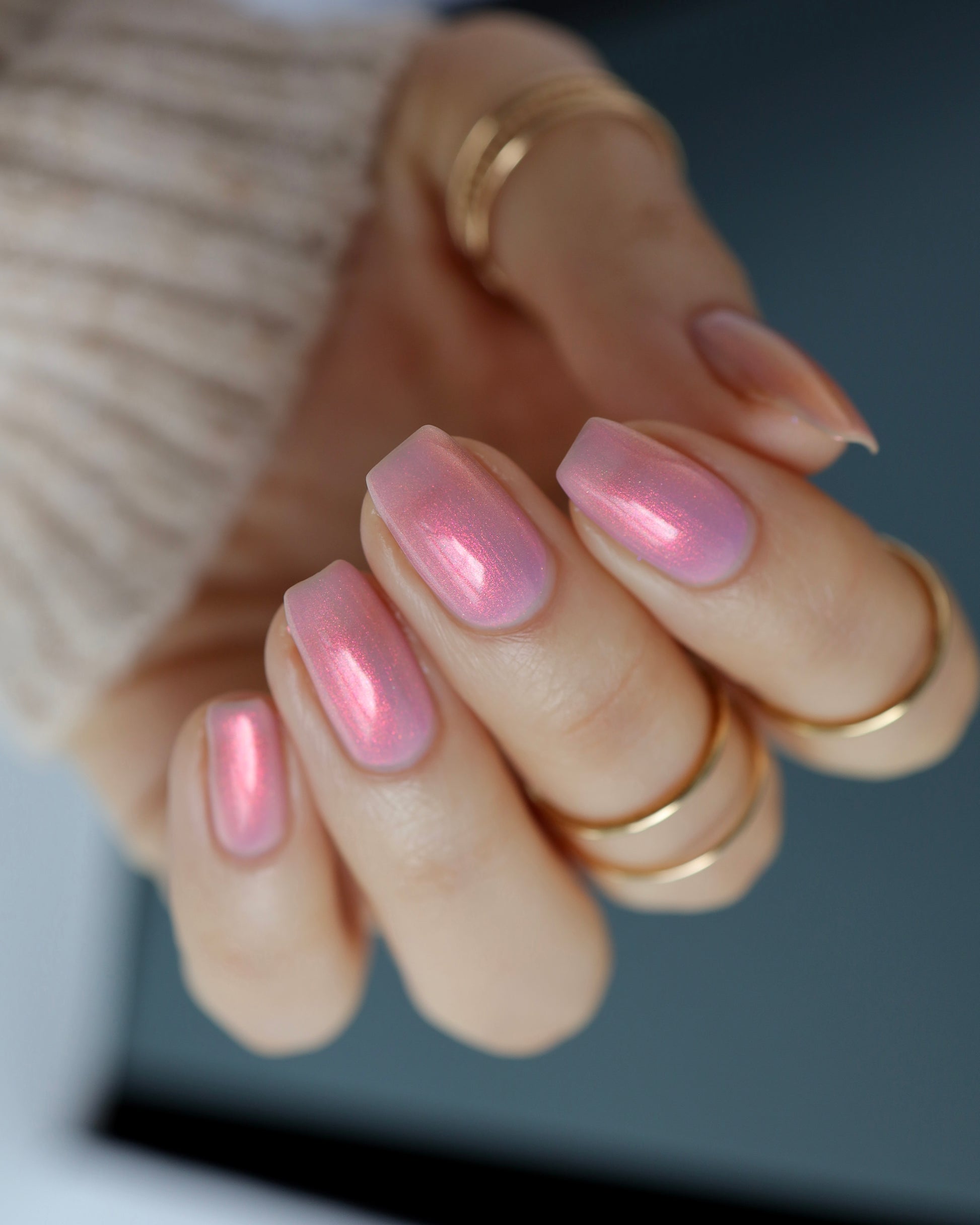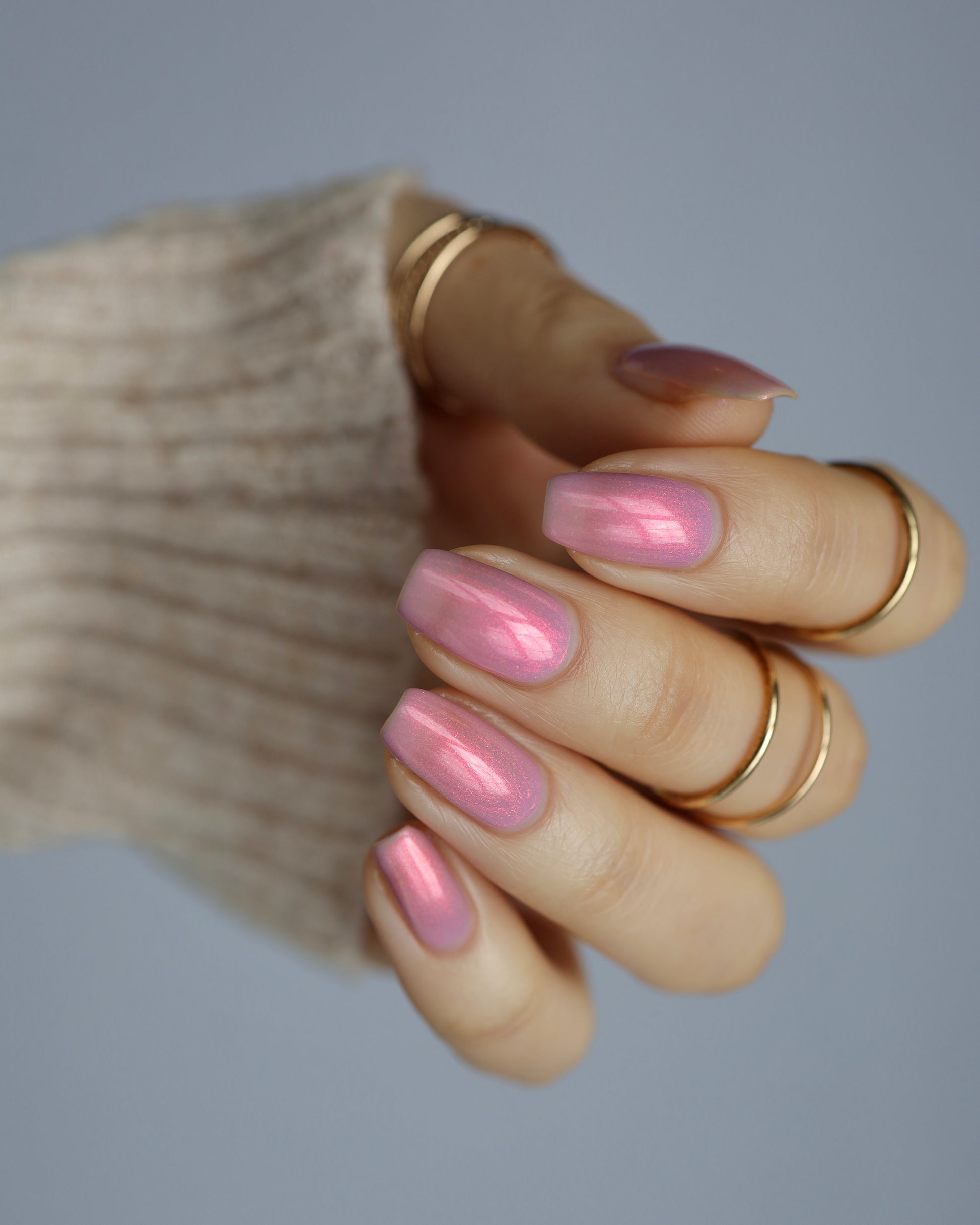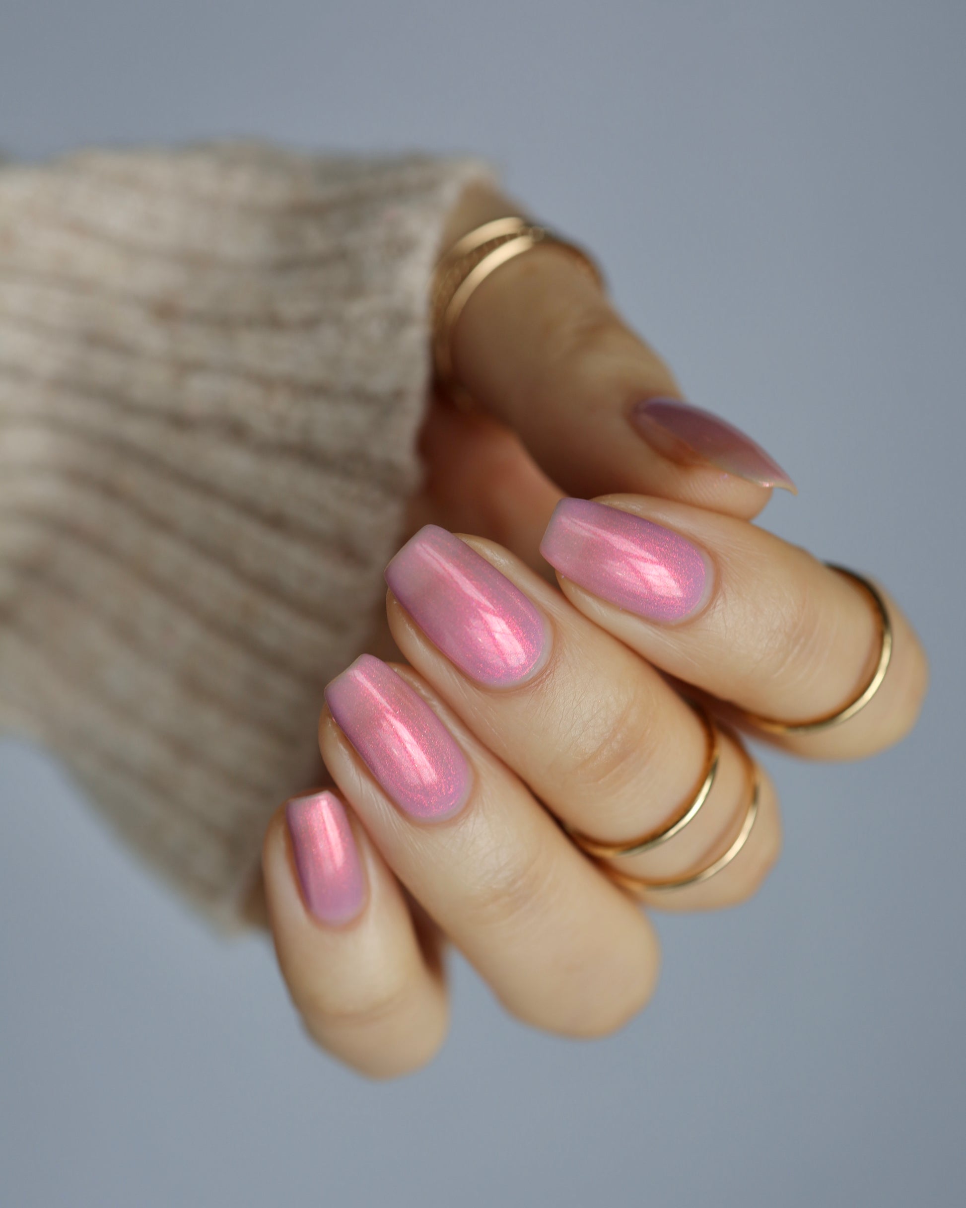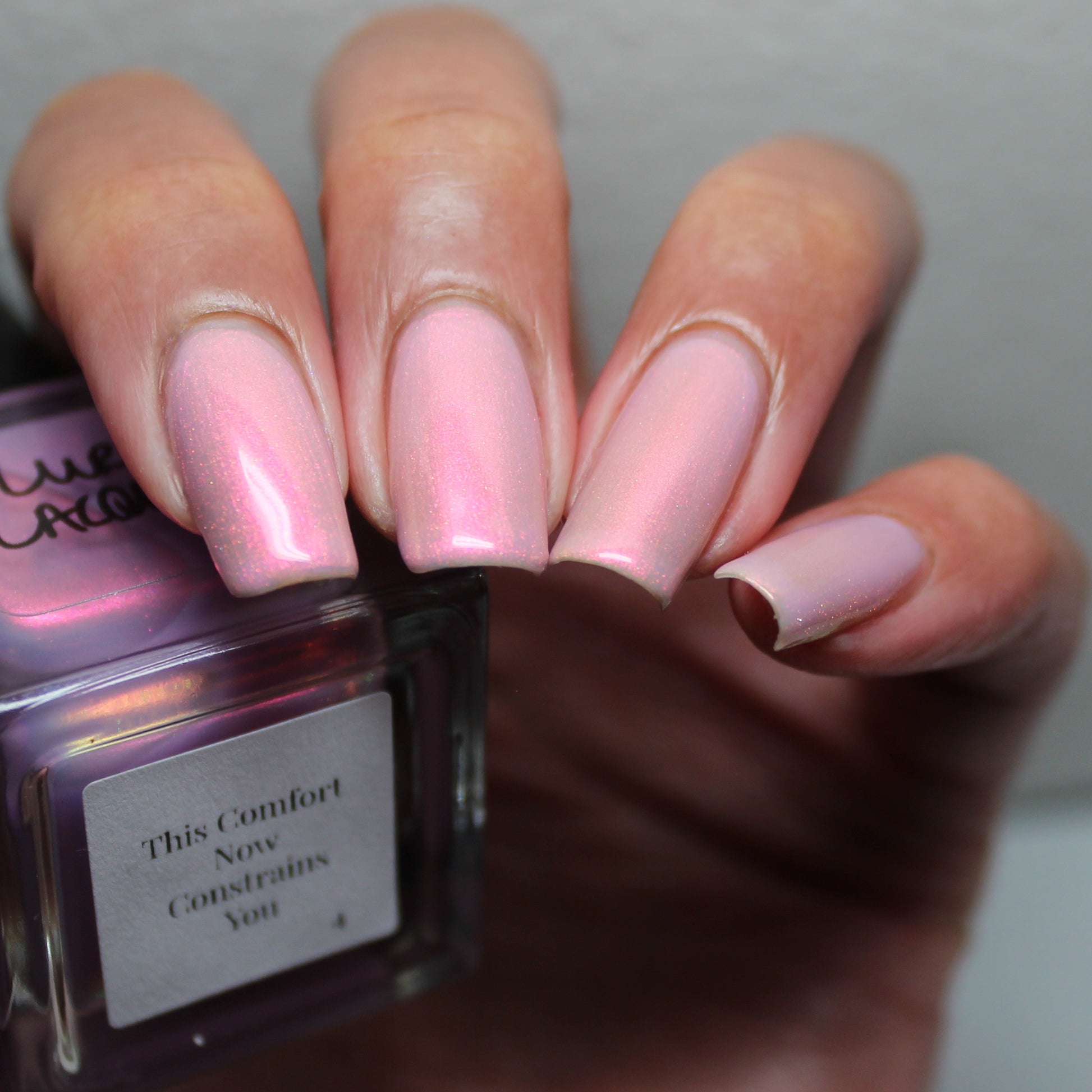 A semi-sheer lavender crelly with a pink to orange to gold aurora shimmer