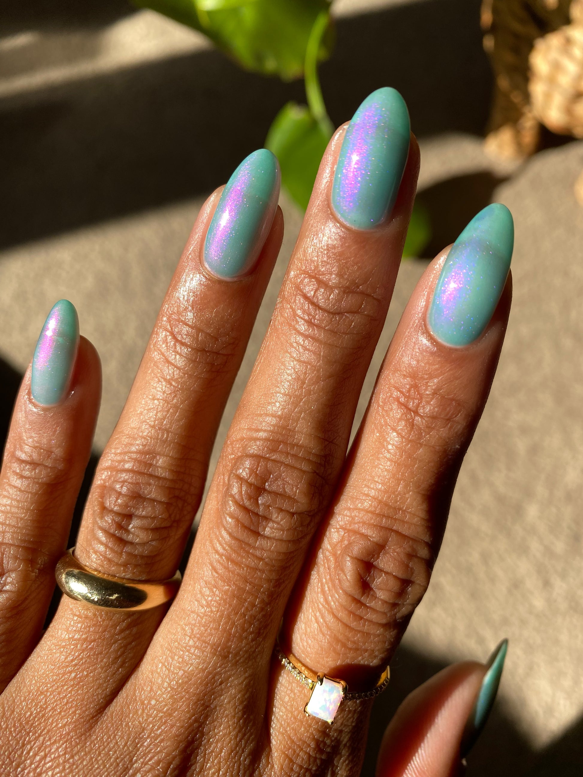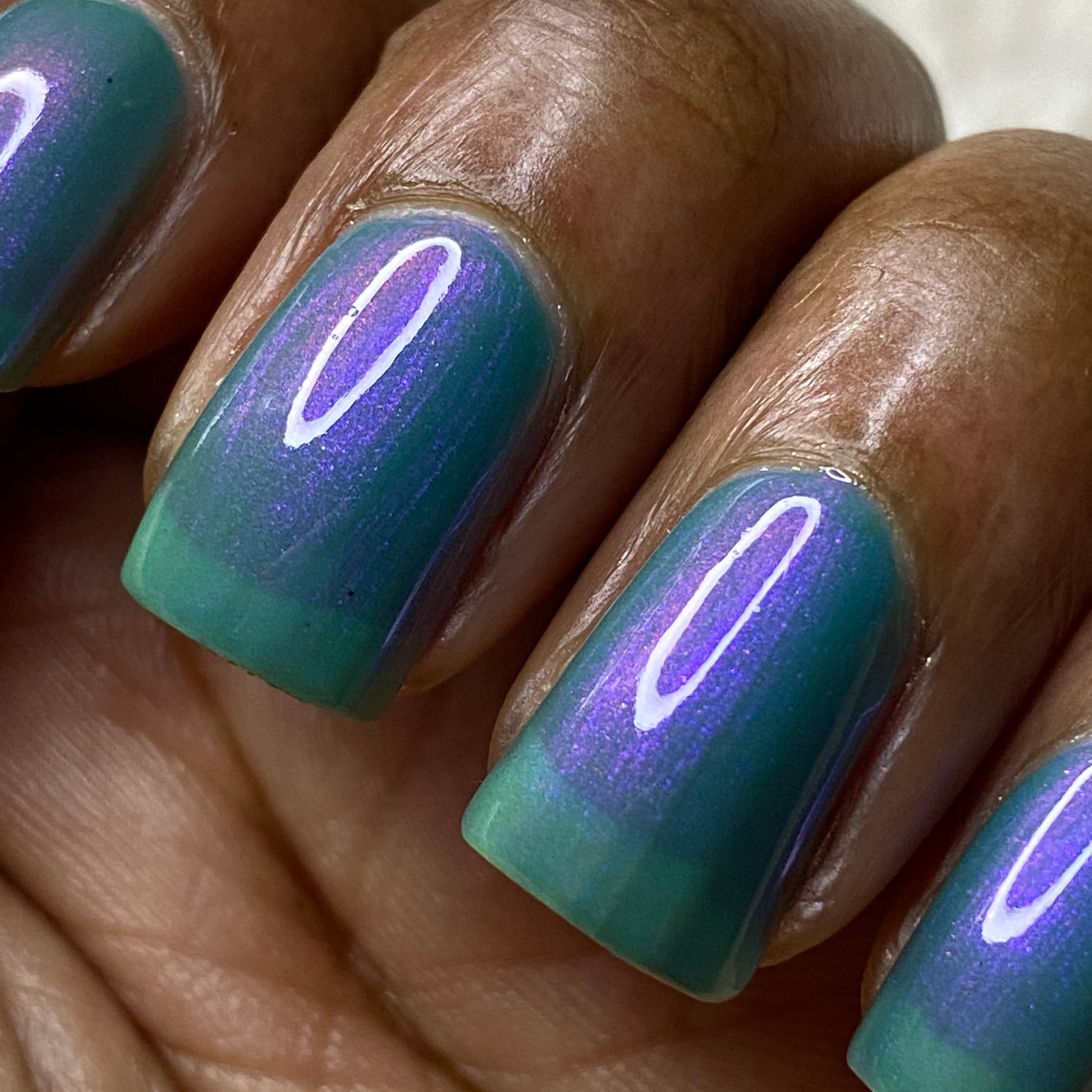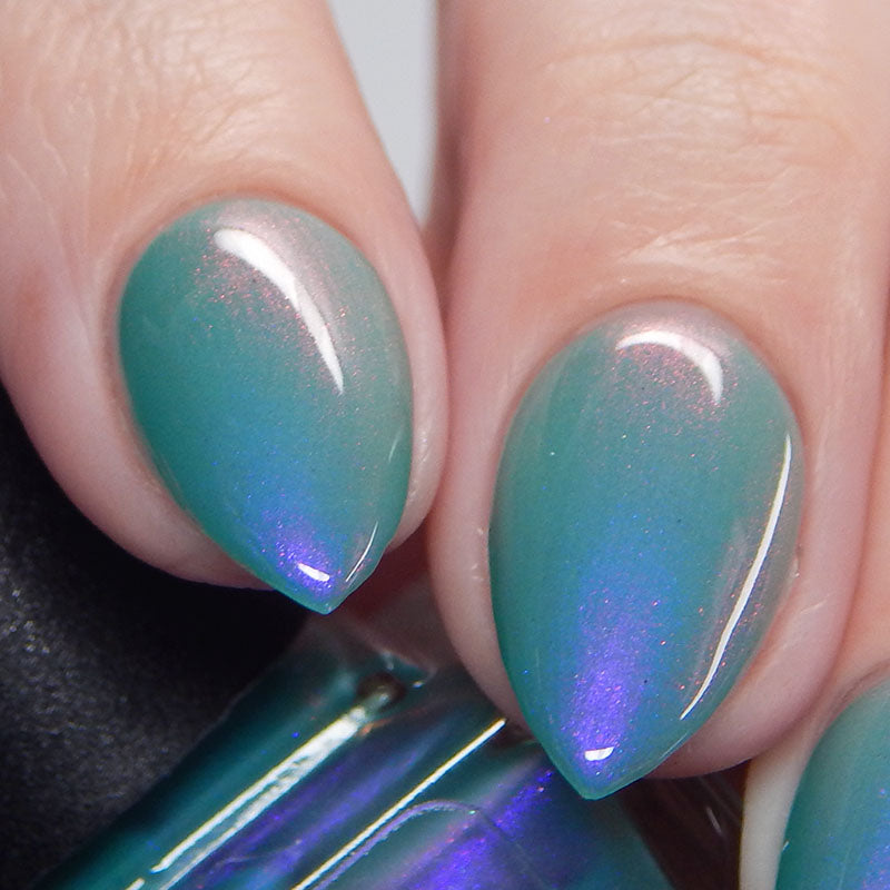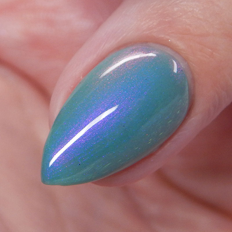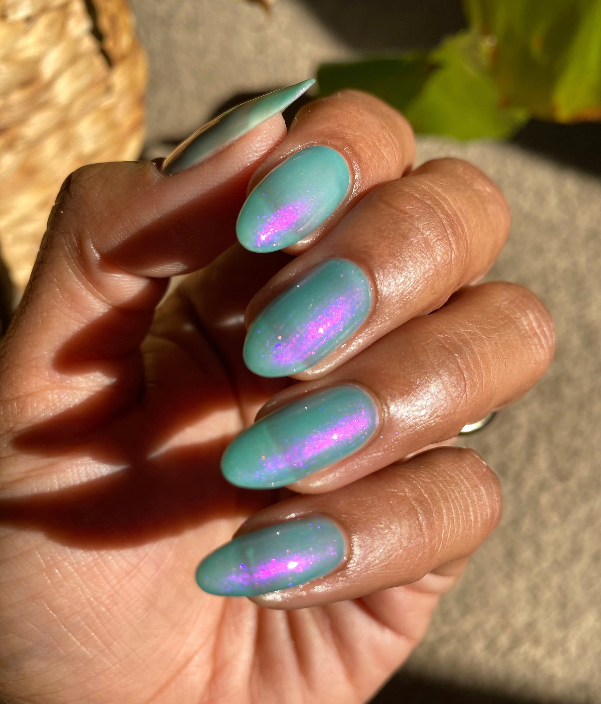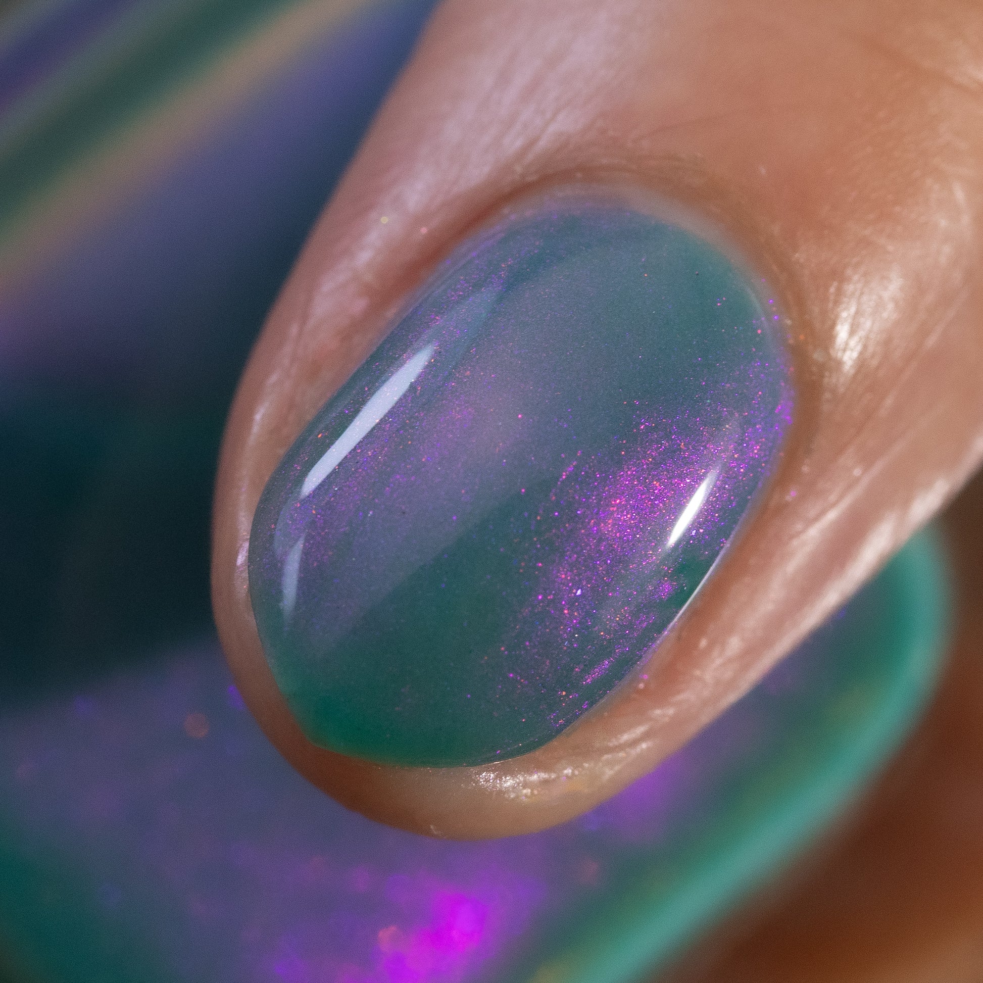 A cool mid-tone green jelly base with a purple to pink to shimmer