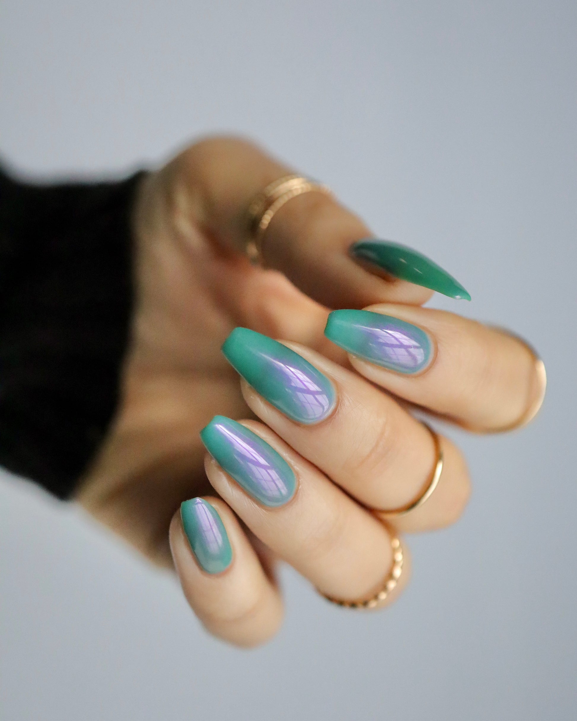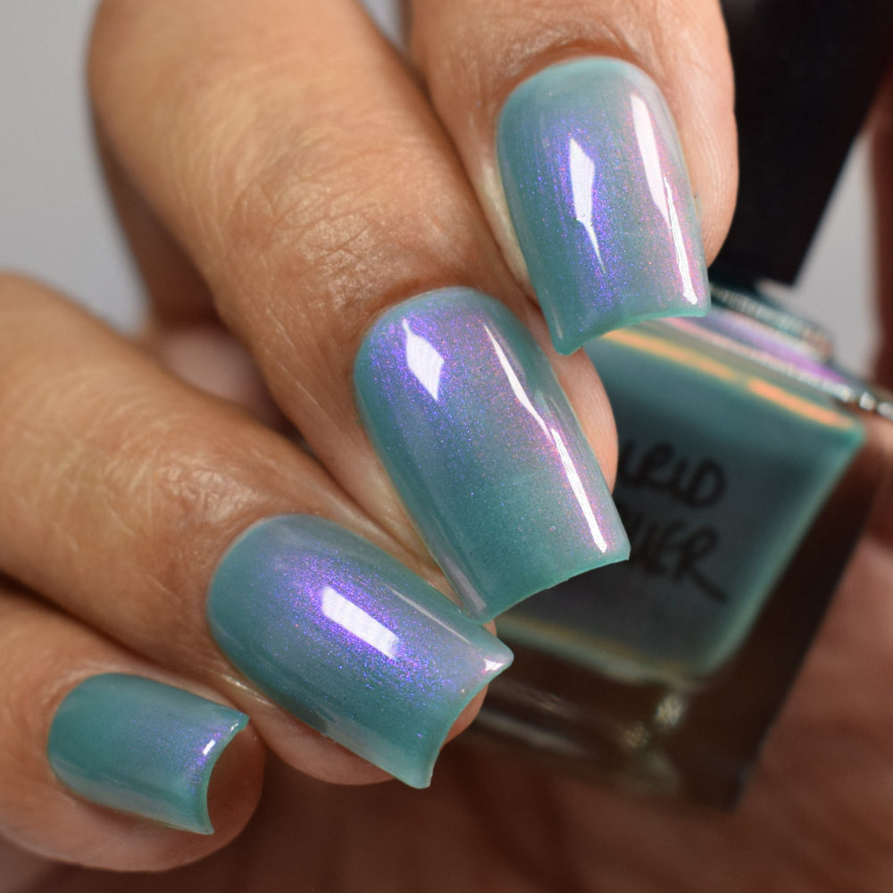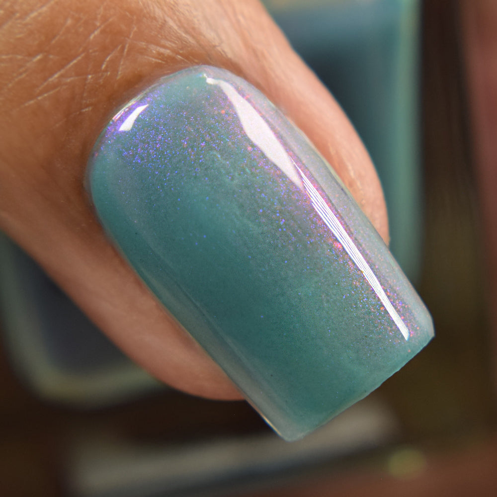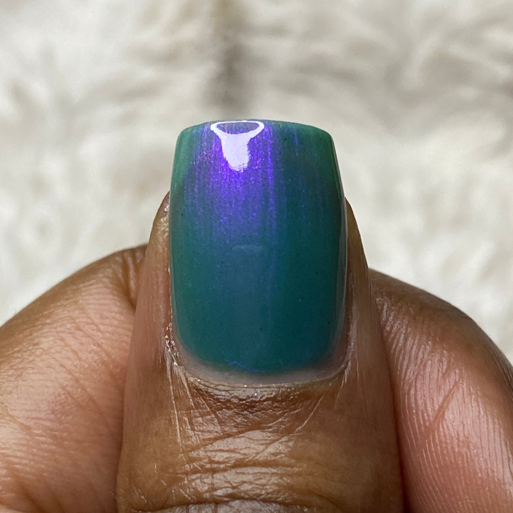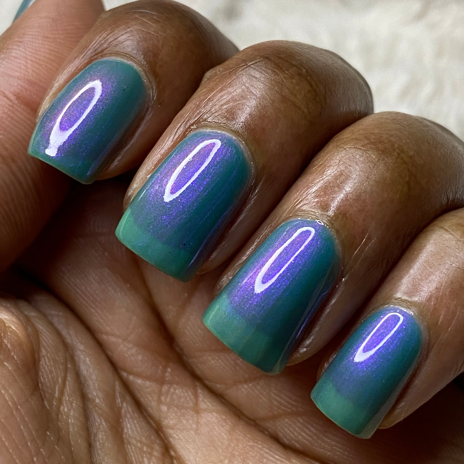 A cool mid-tone green jelly base with a purple to pink to shimmer