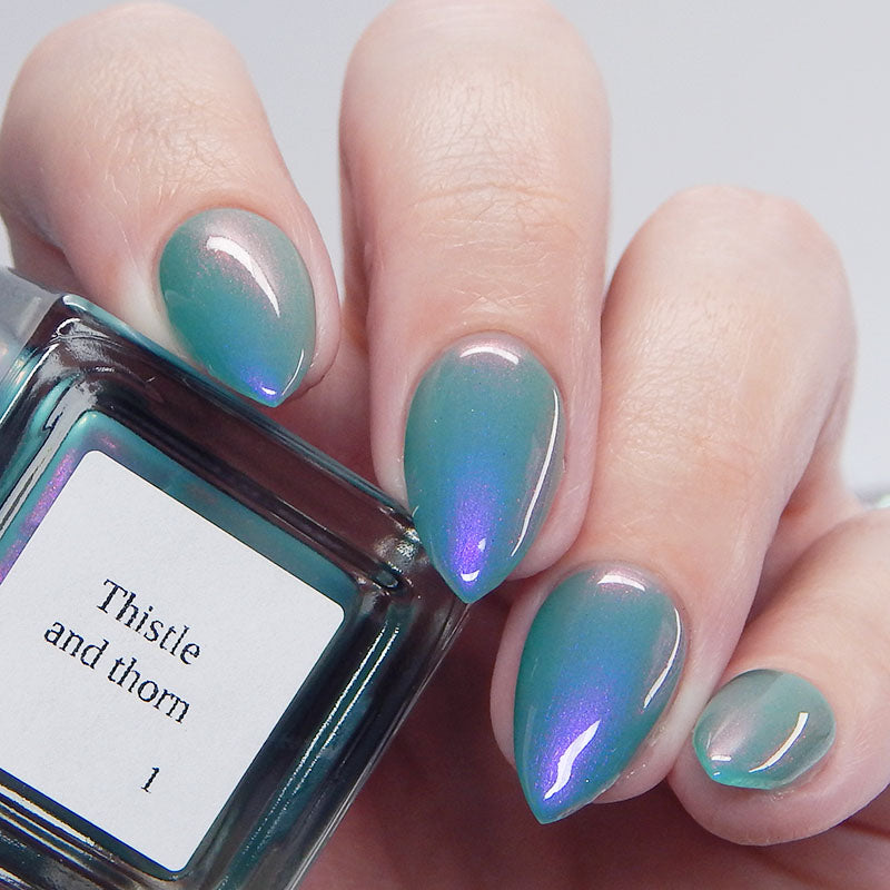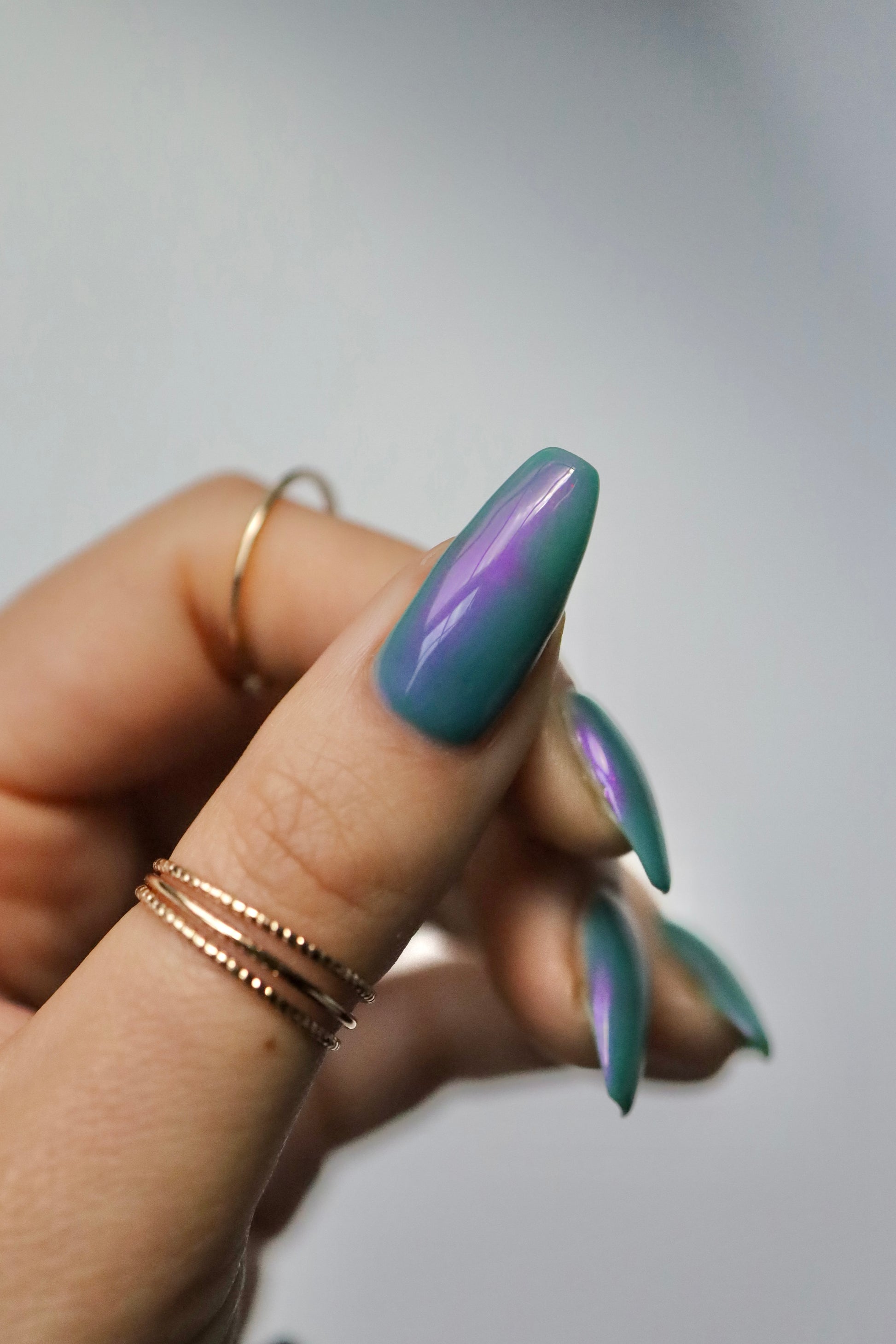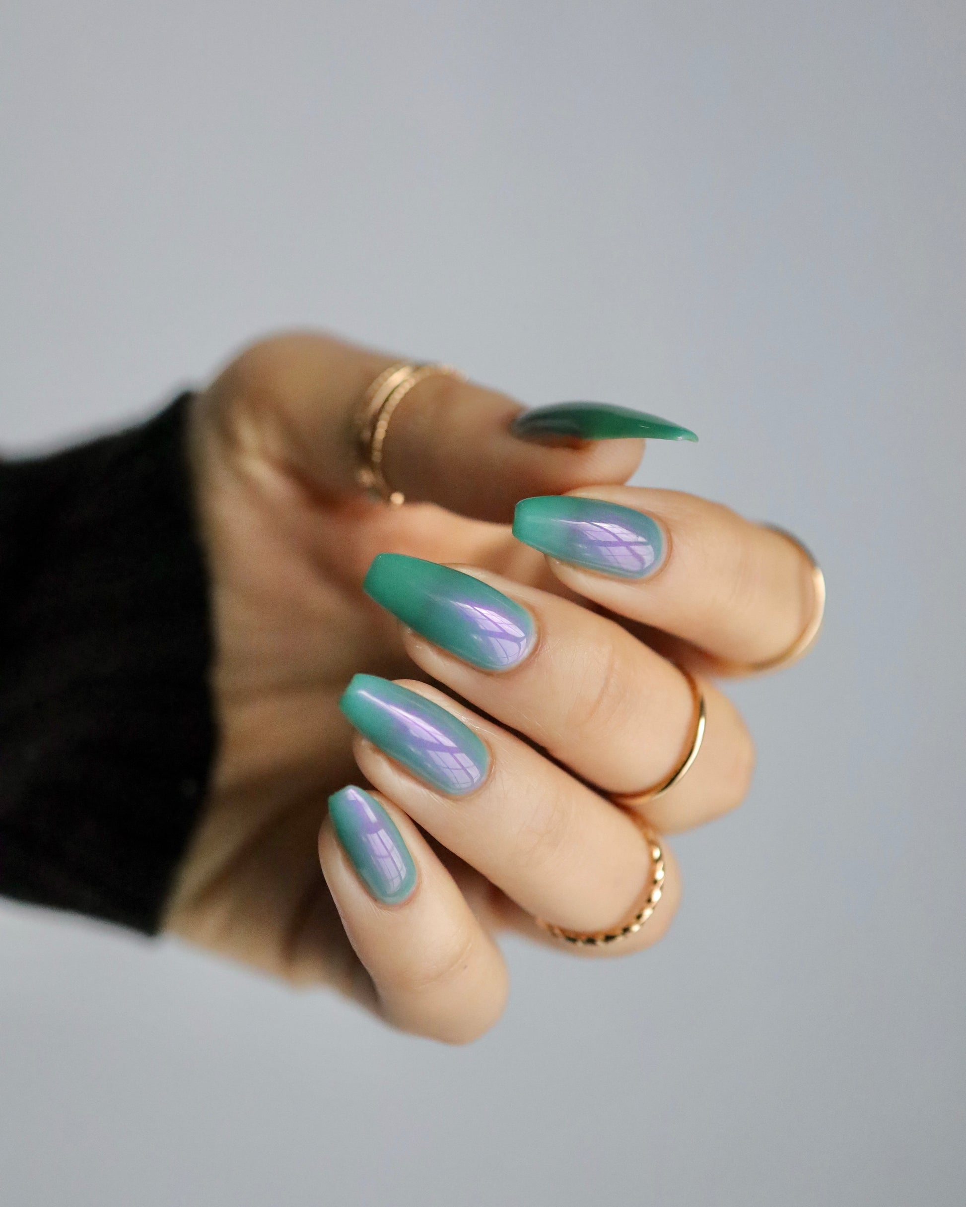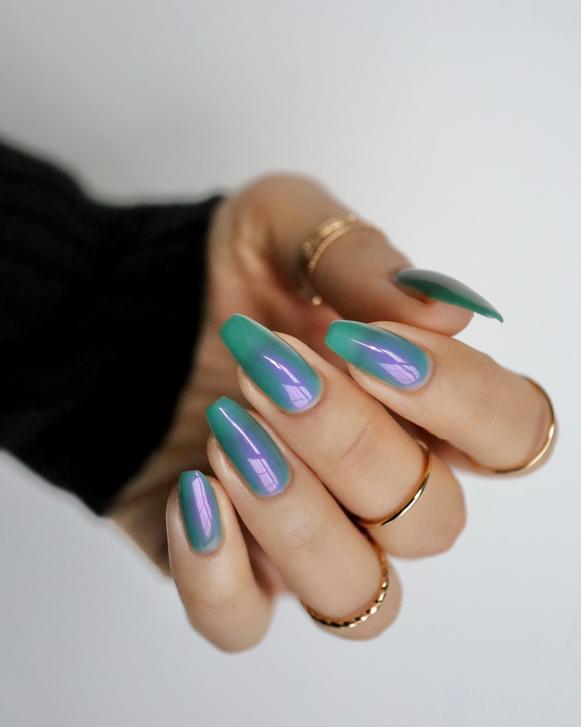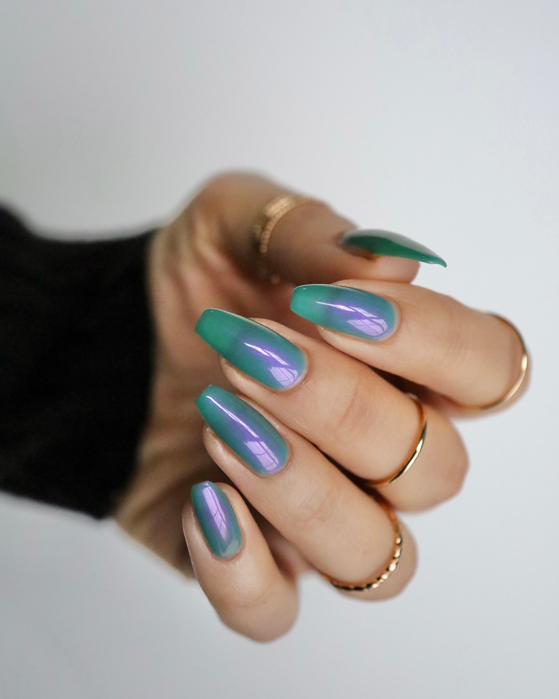 A cool mid-tone green jelly base with a purple to pink to shimmer