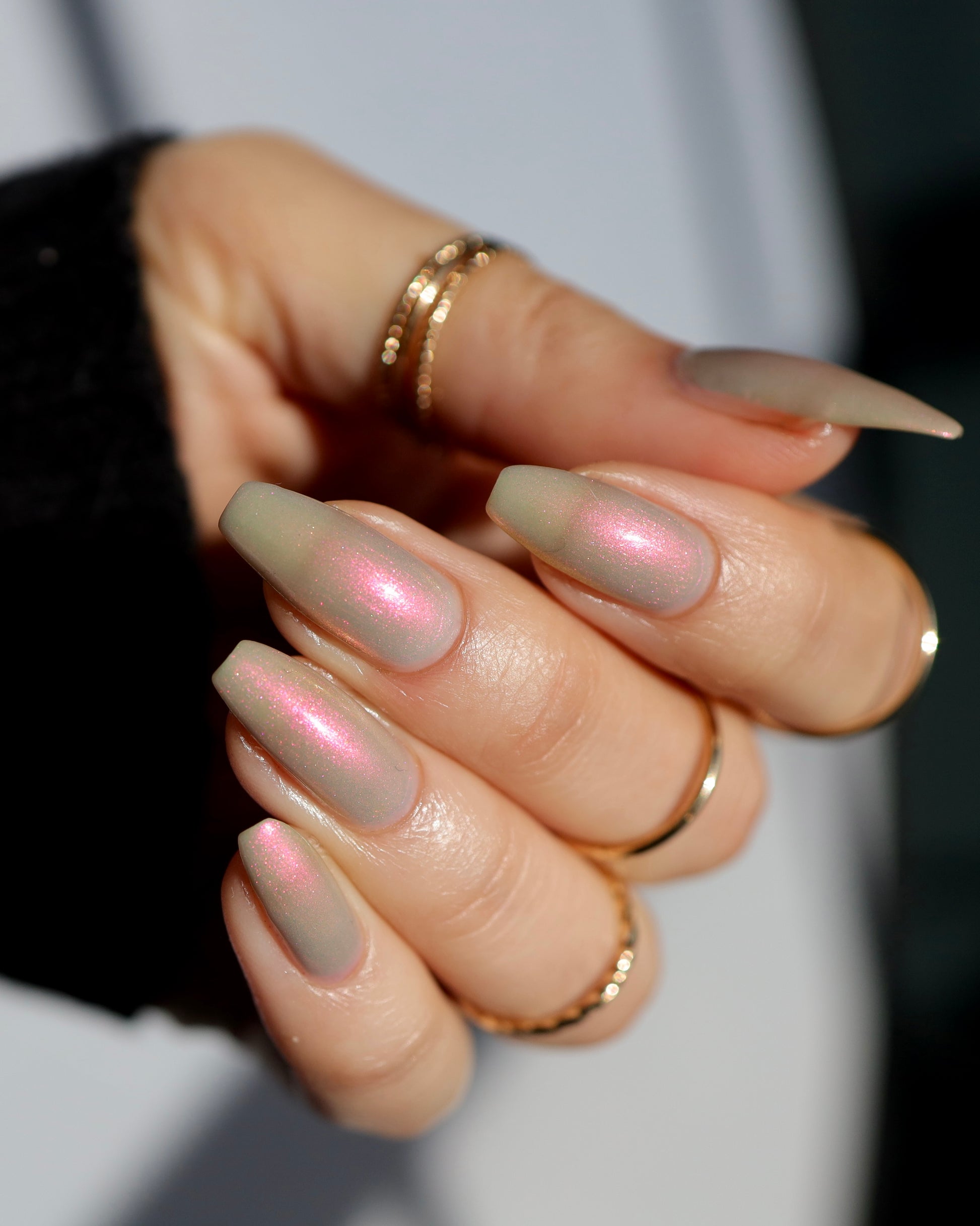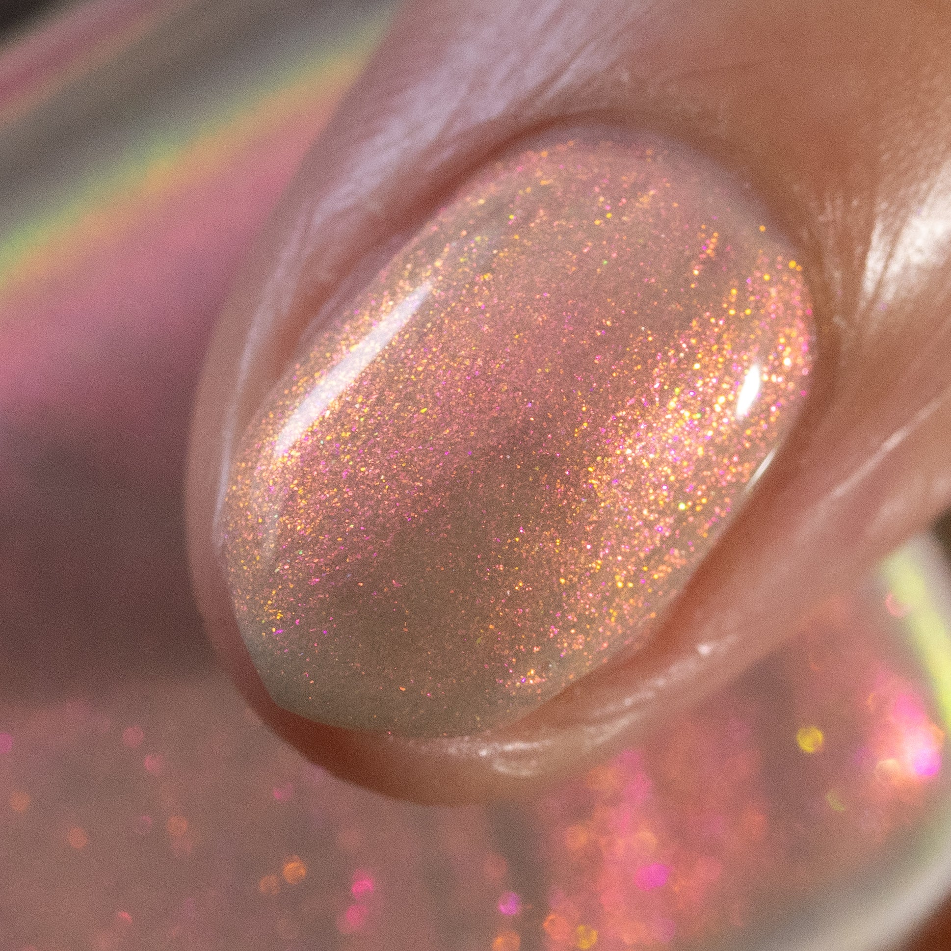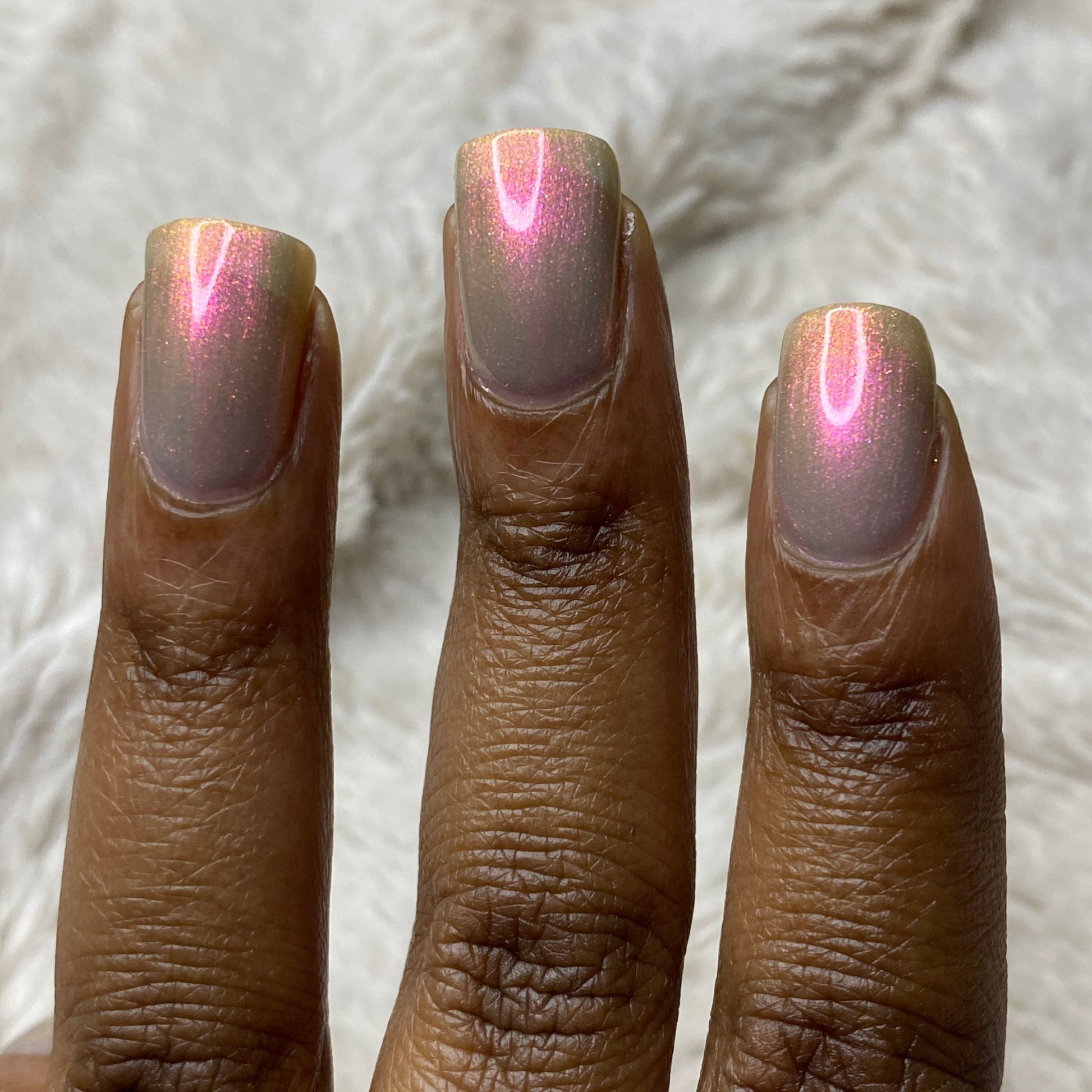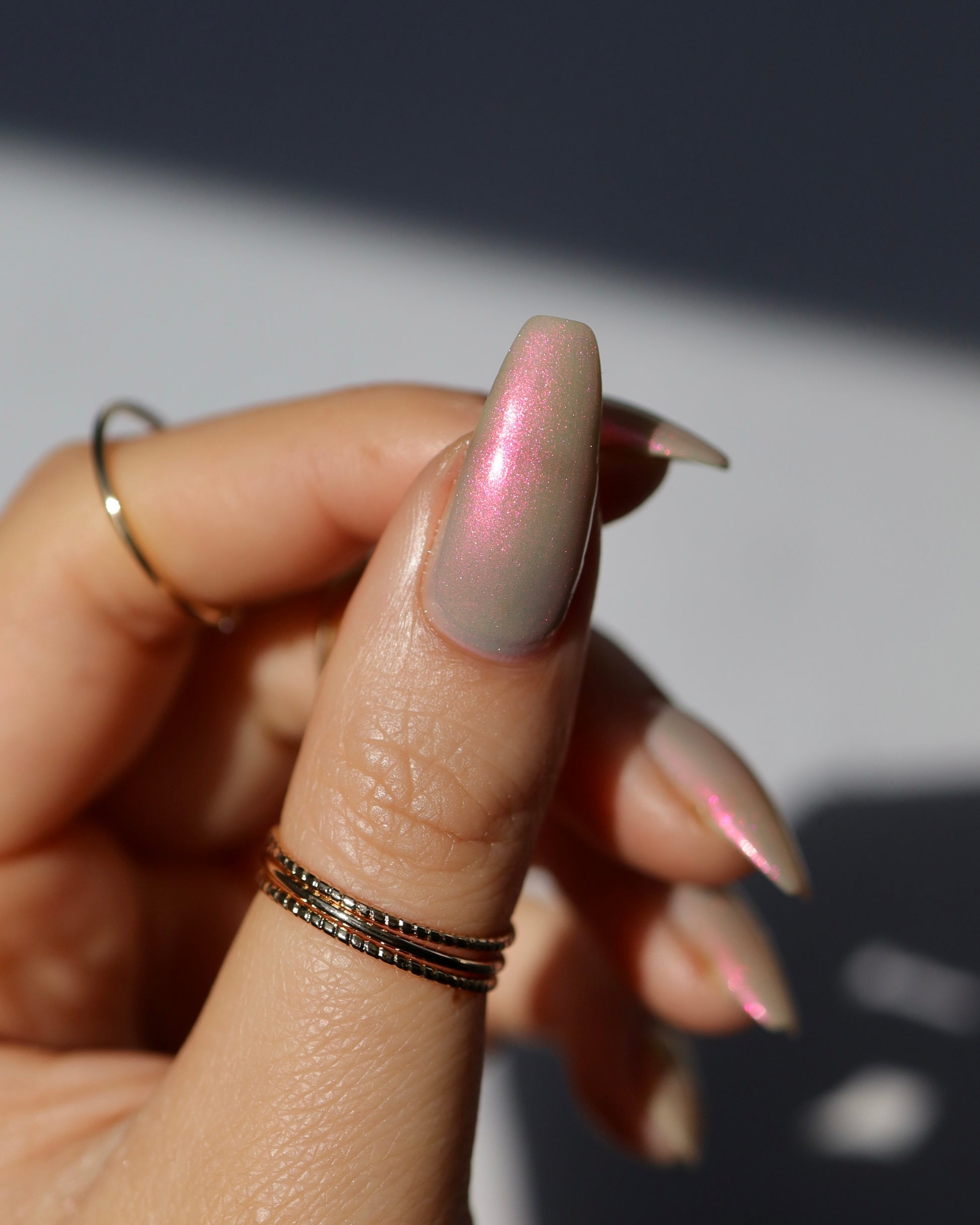 A taupe-gray base with vibrant pink to orange to gold to green shimmer