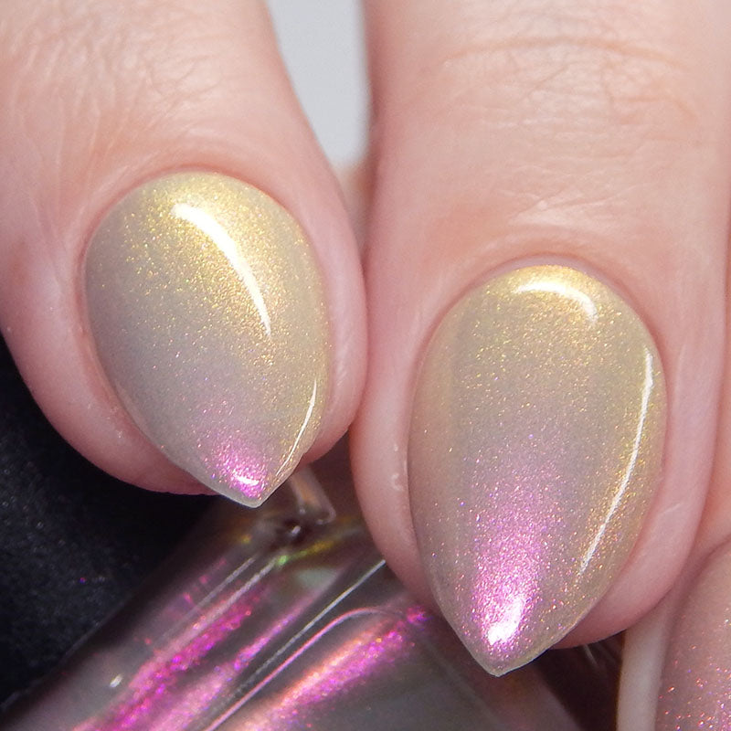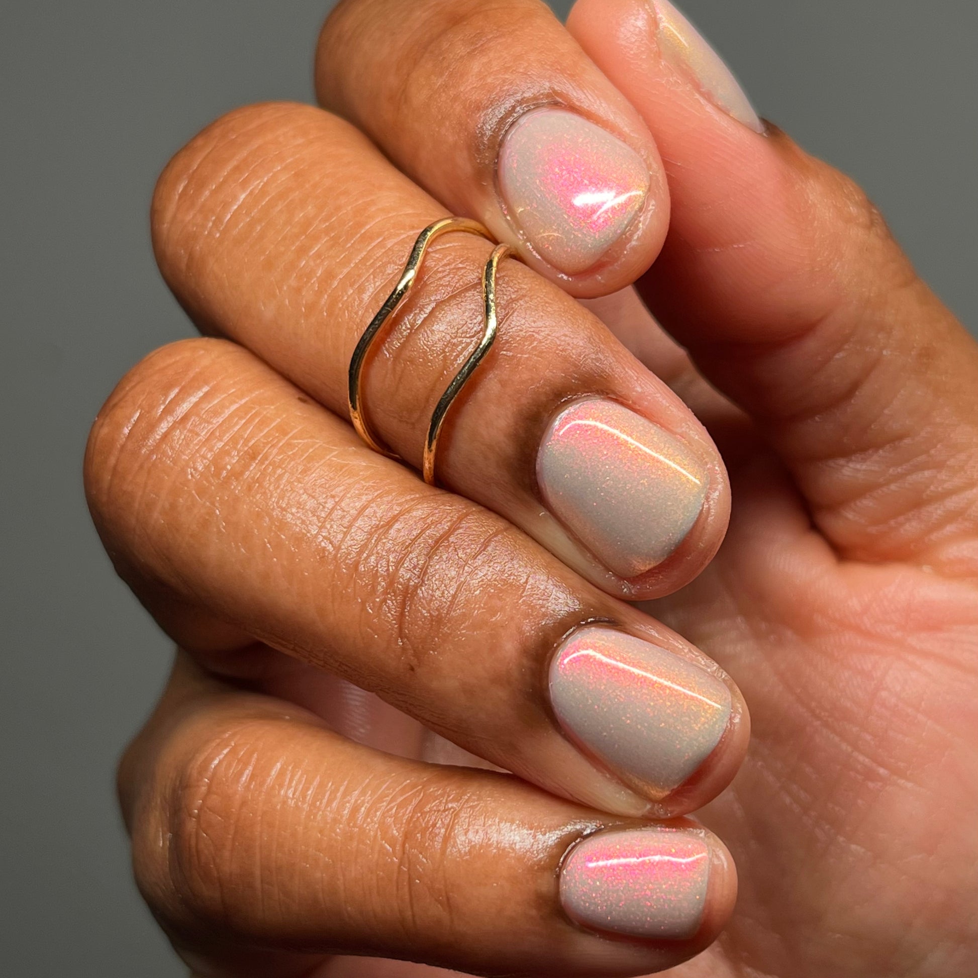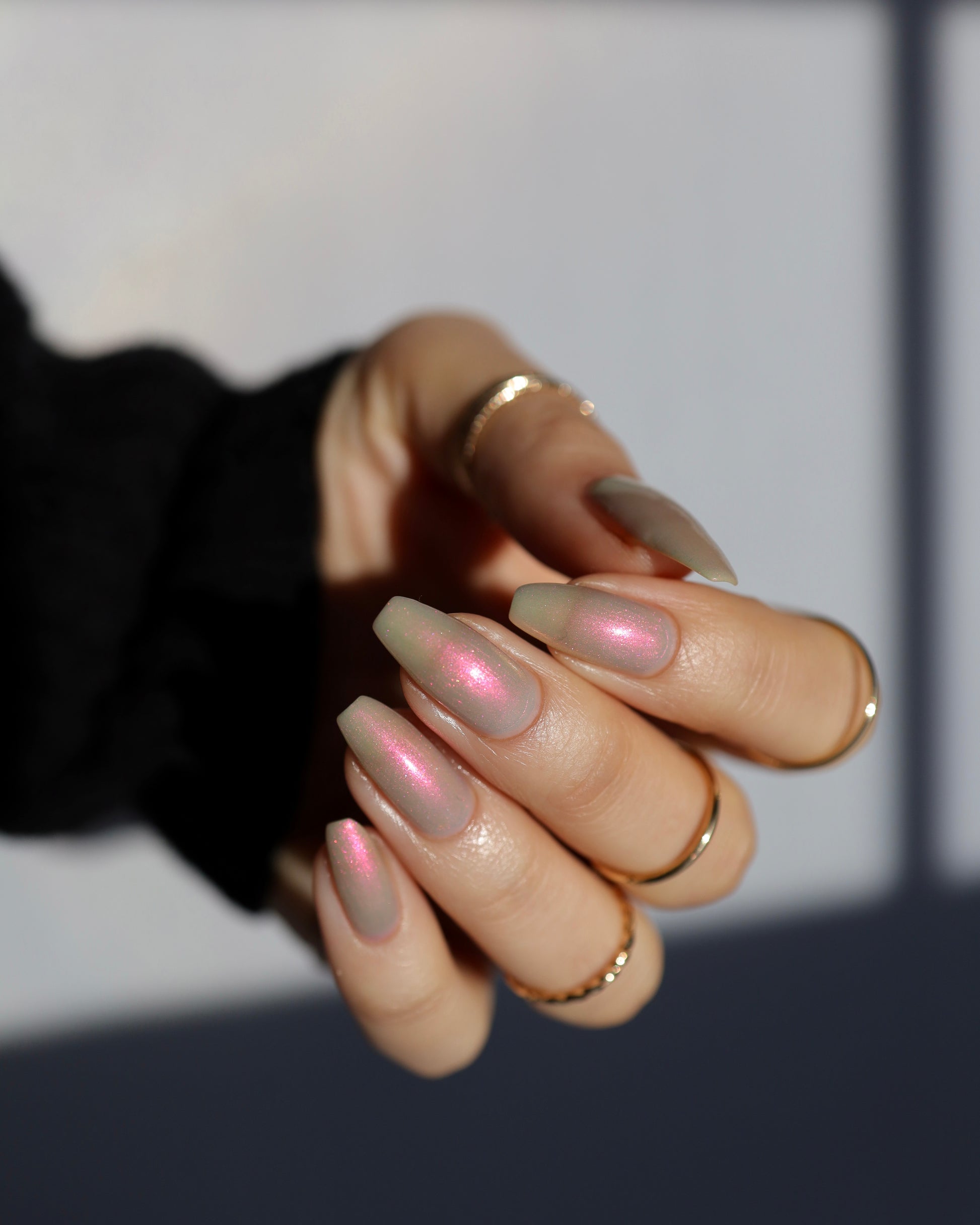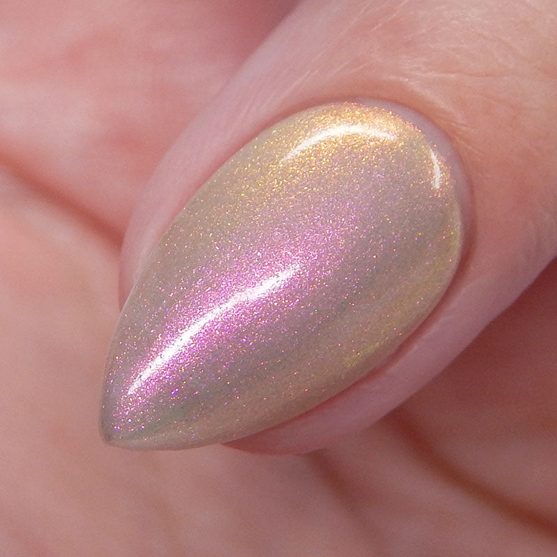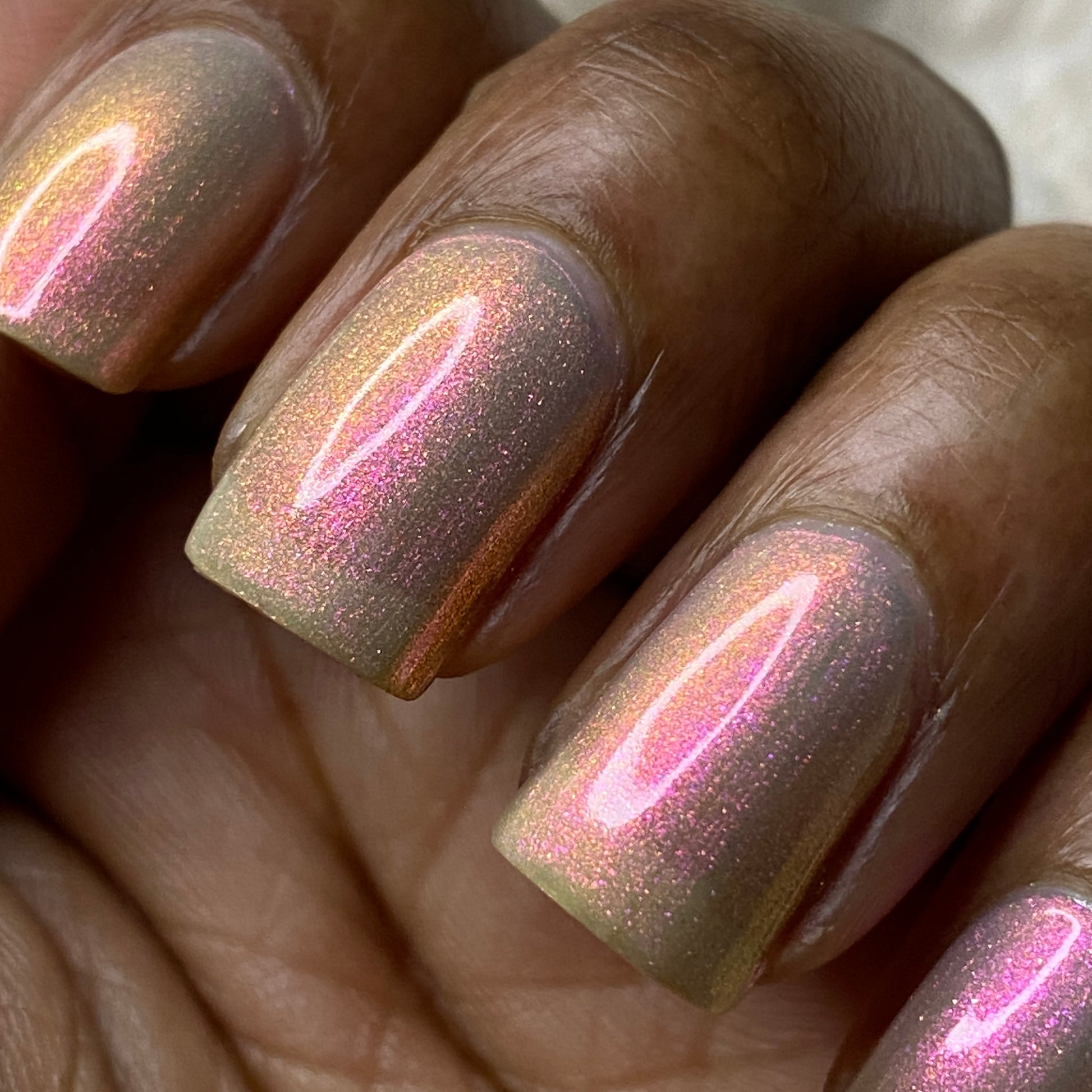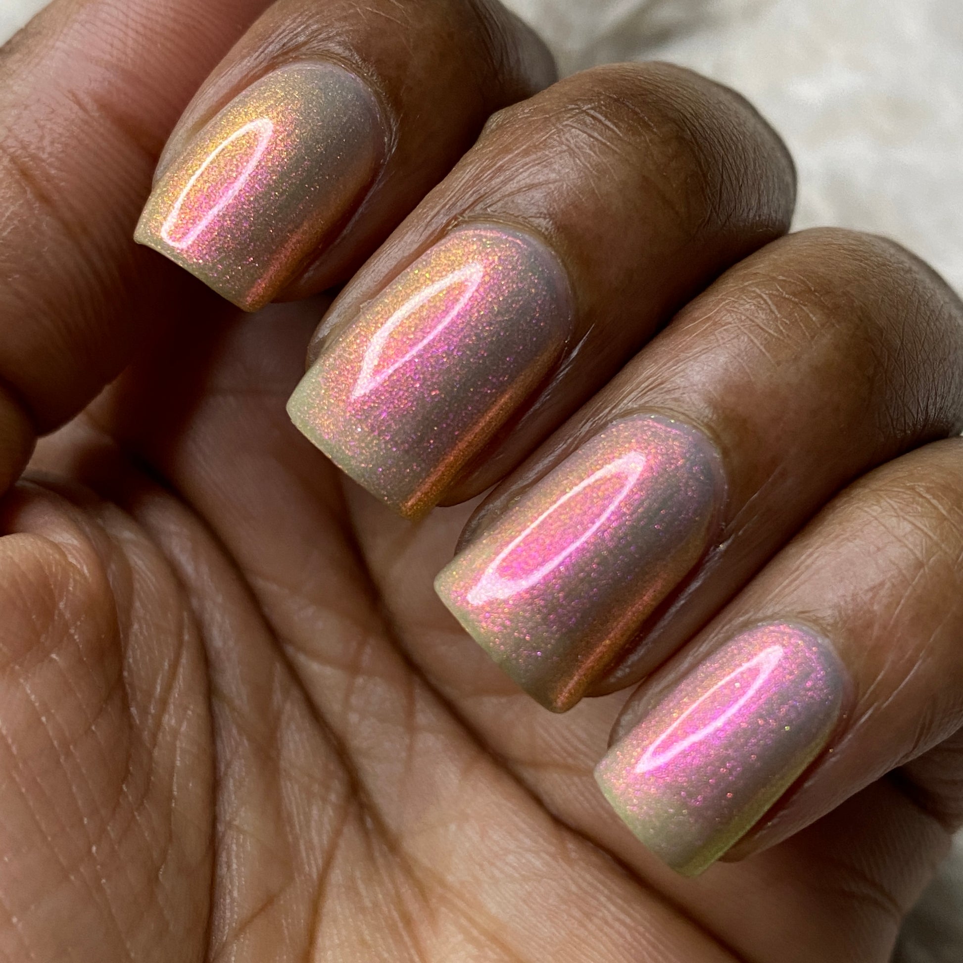 A taupe-gray base with vibrant pink to orange to gold to green shimmer