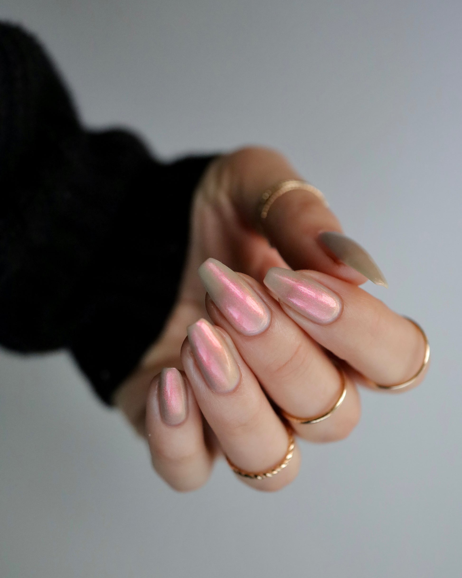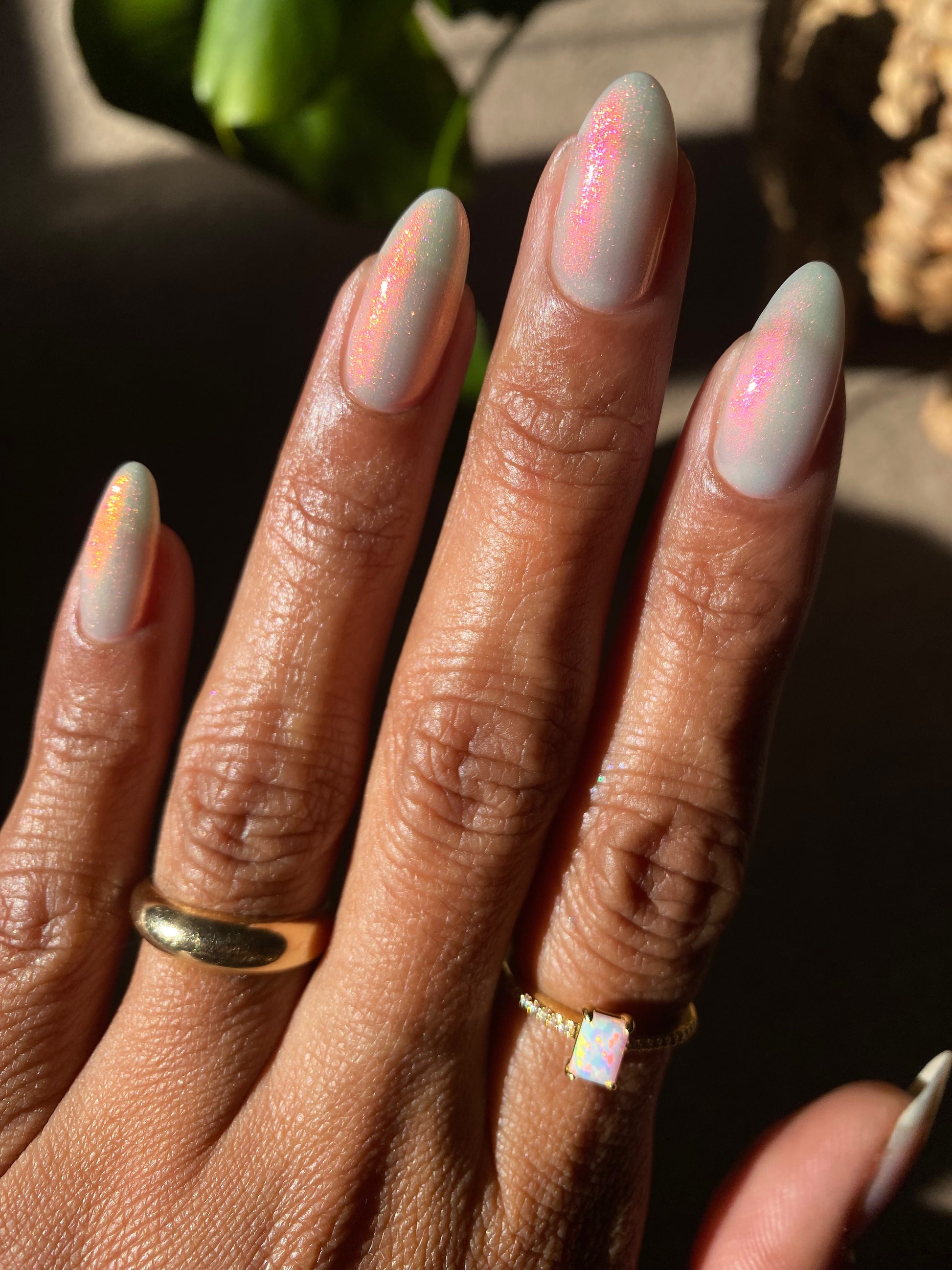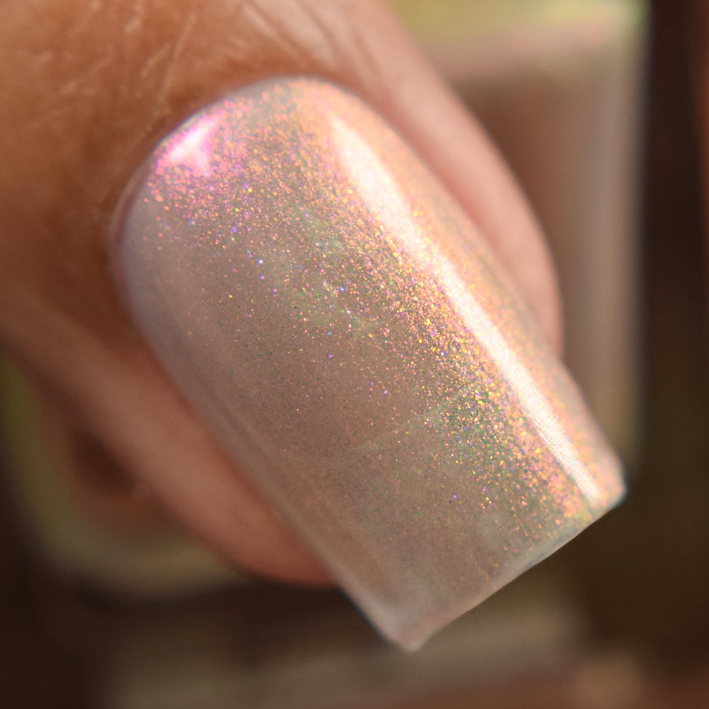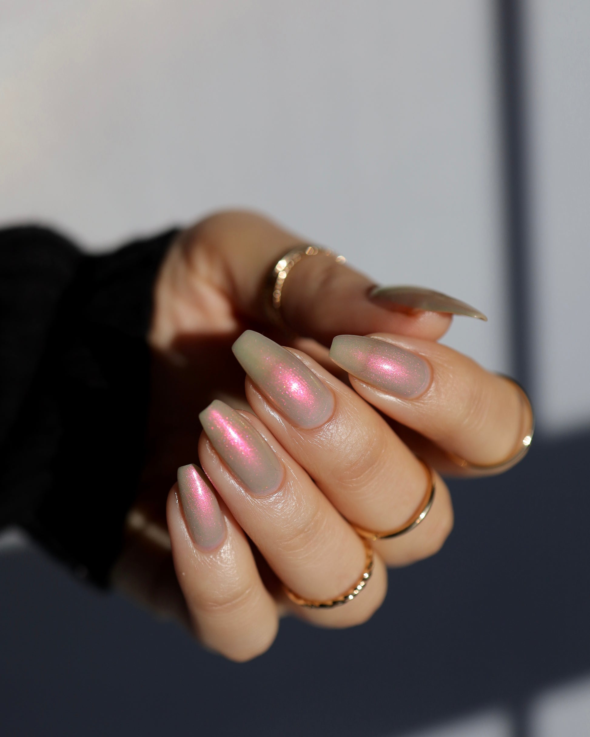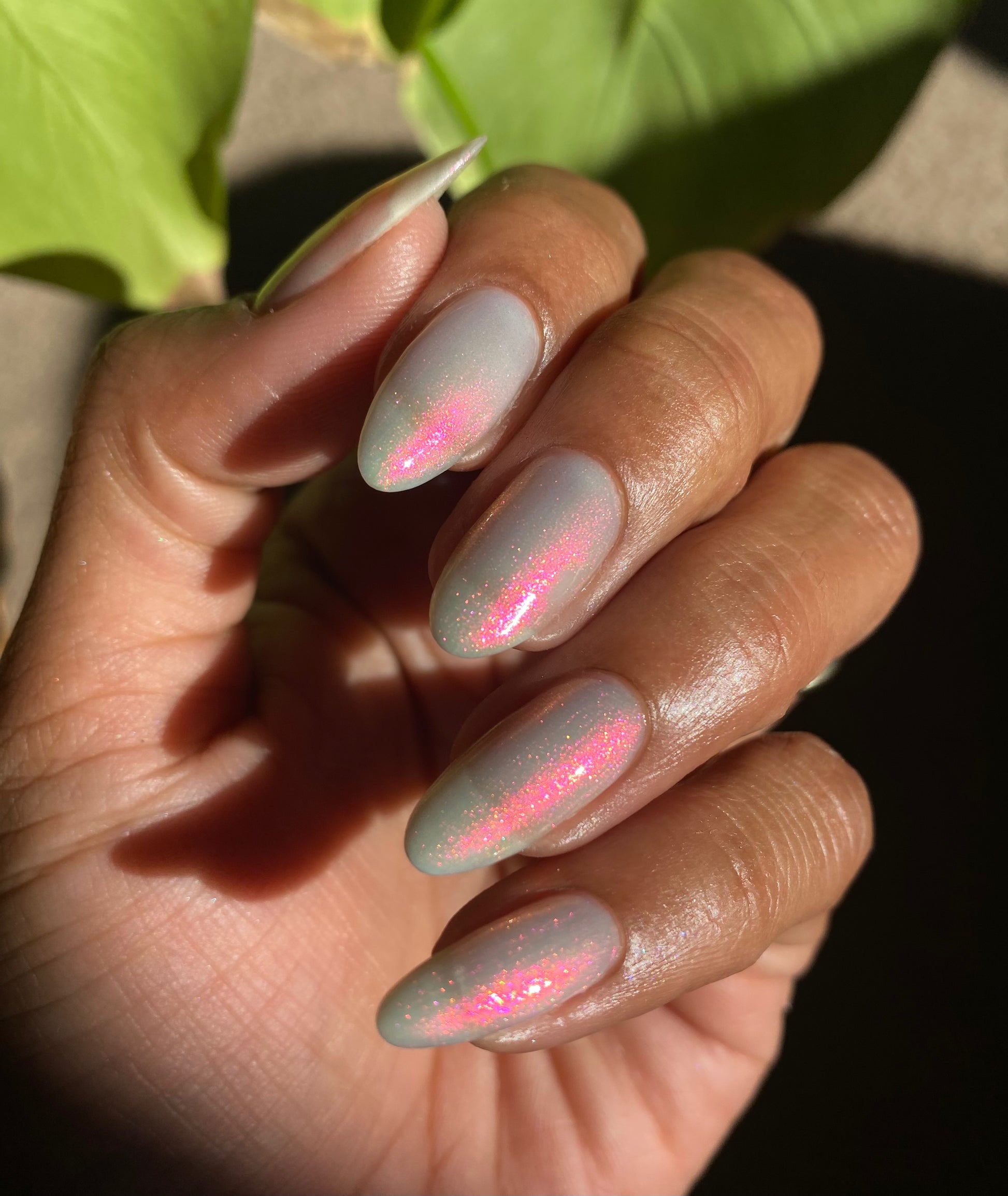 A taupe-gray base with vibrant pink to orange to gold to green shimmer