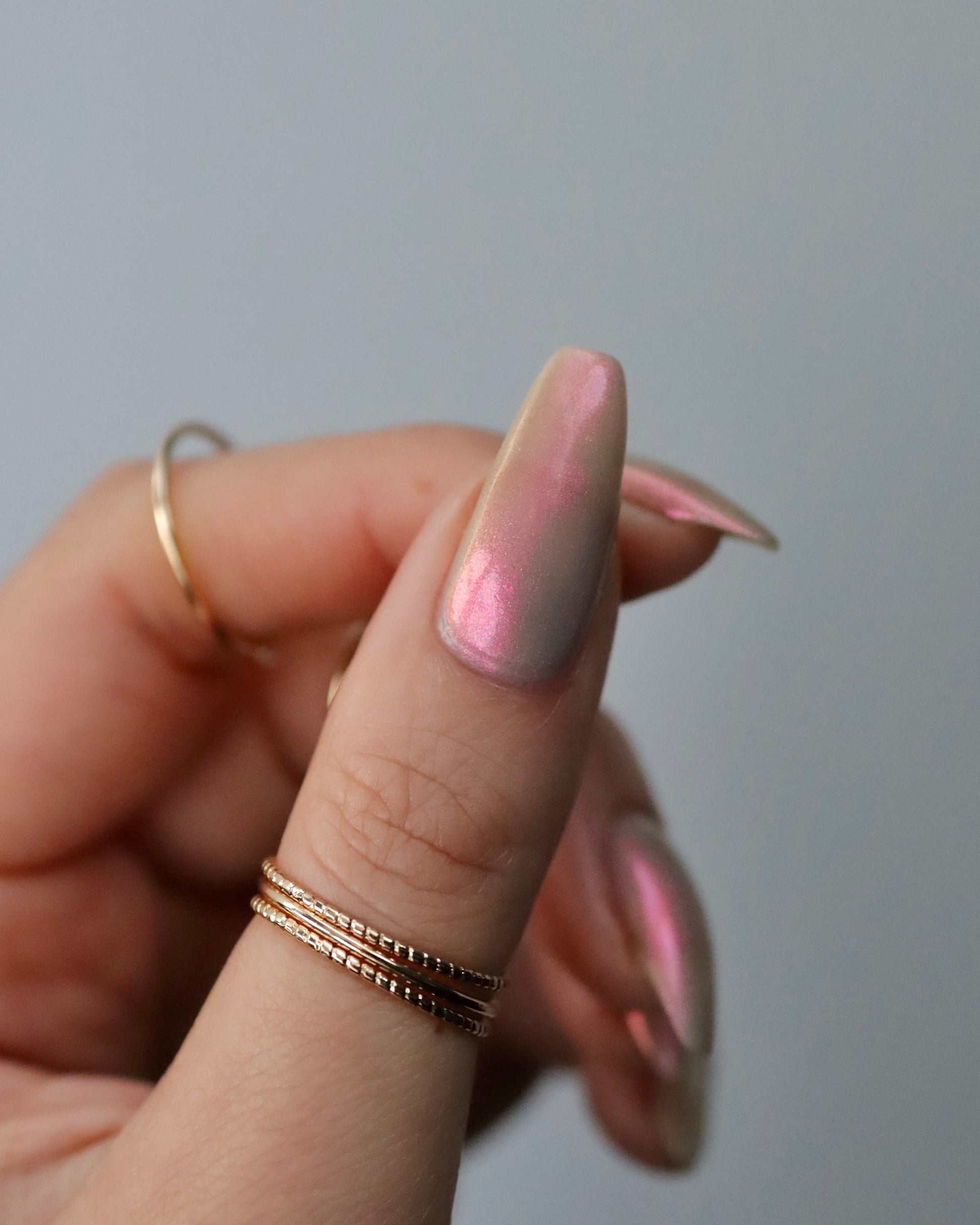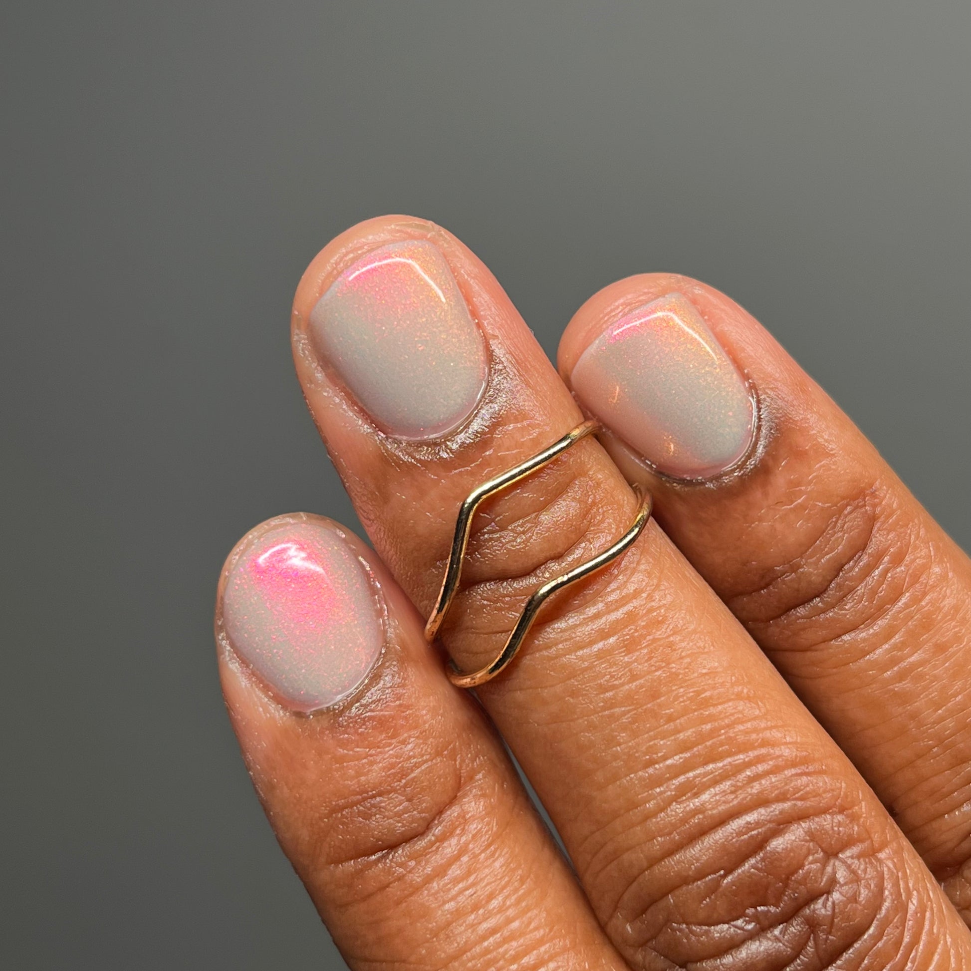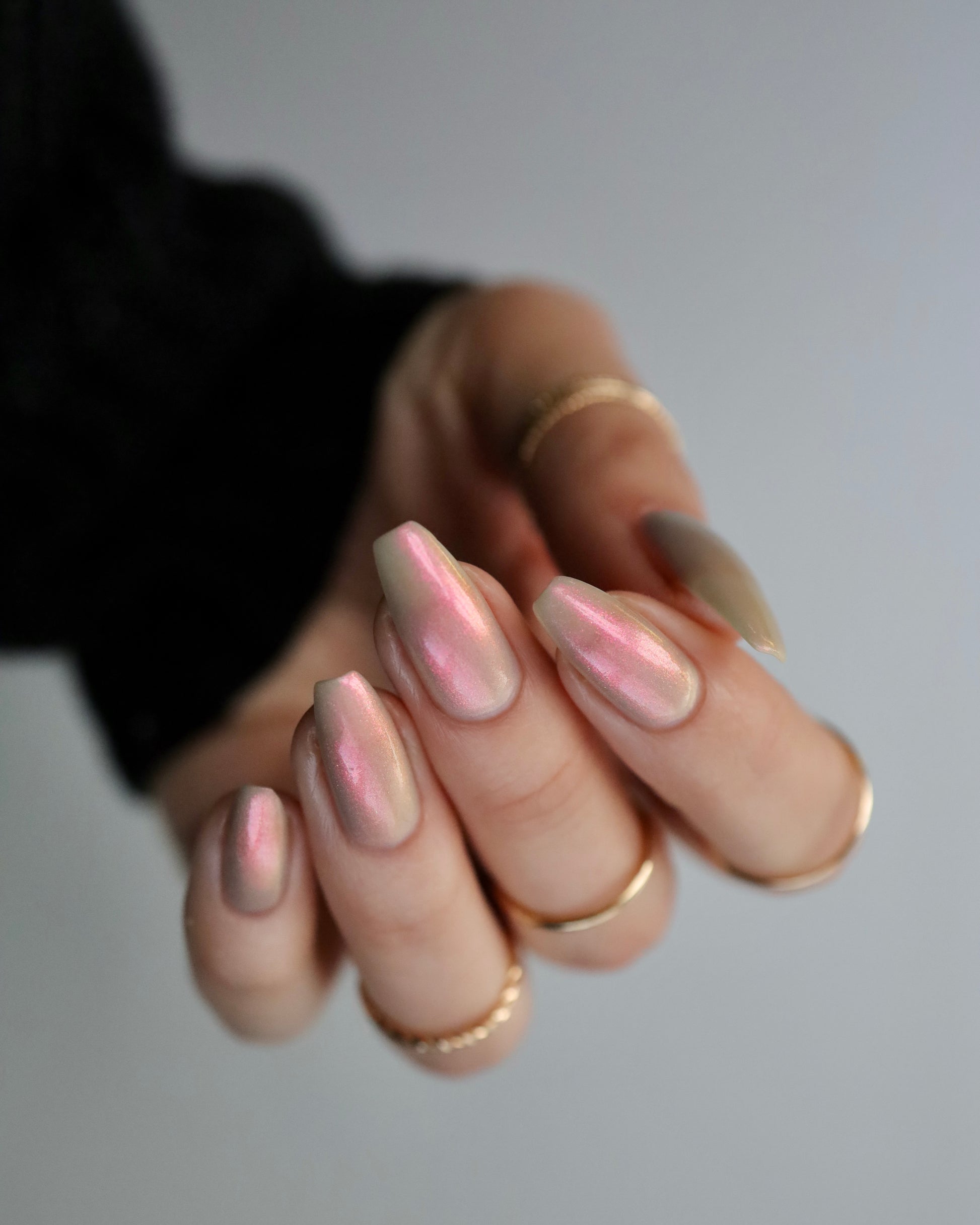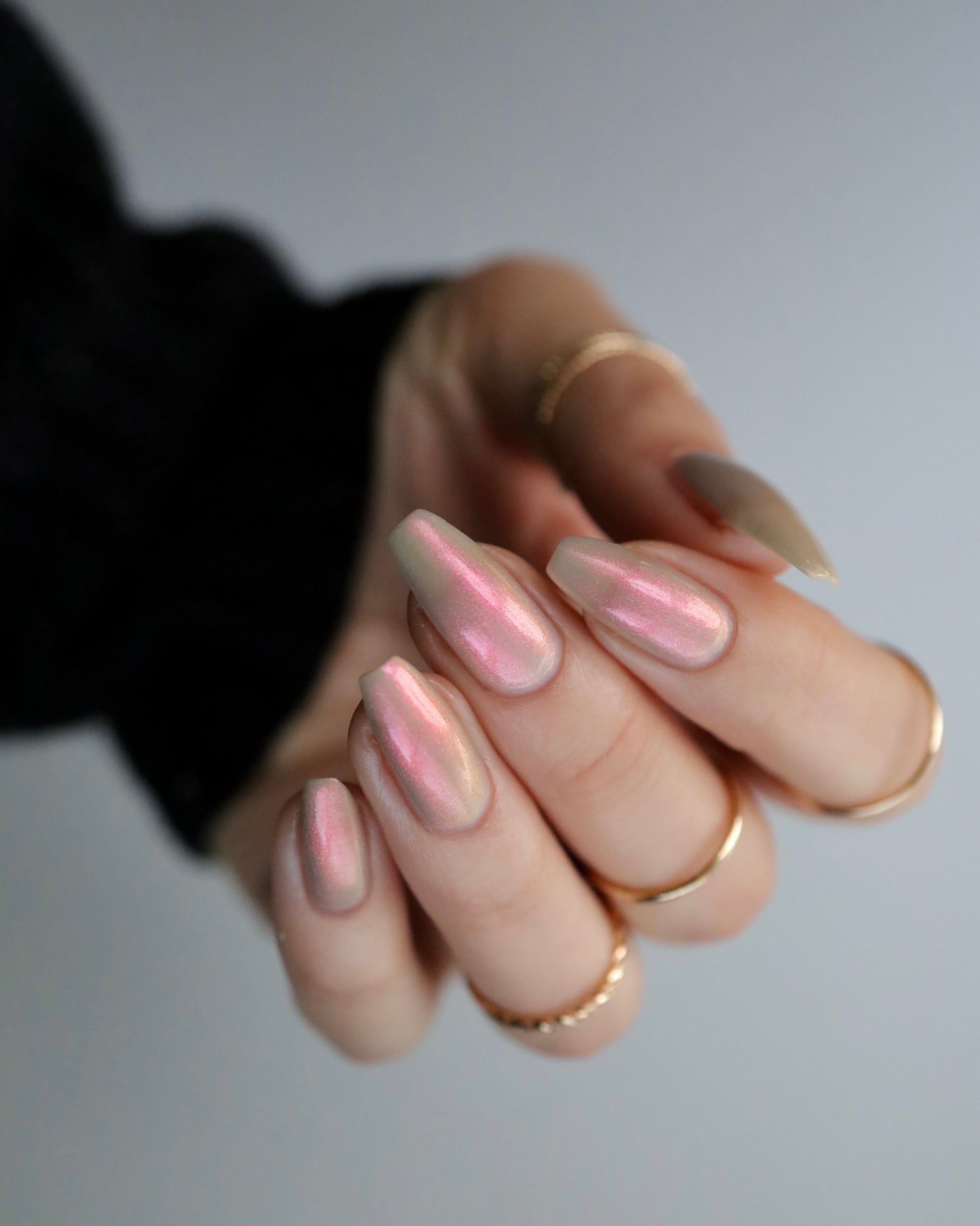 A taupe-gray base with vibrant pink to orange to gold to green shimmer
