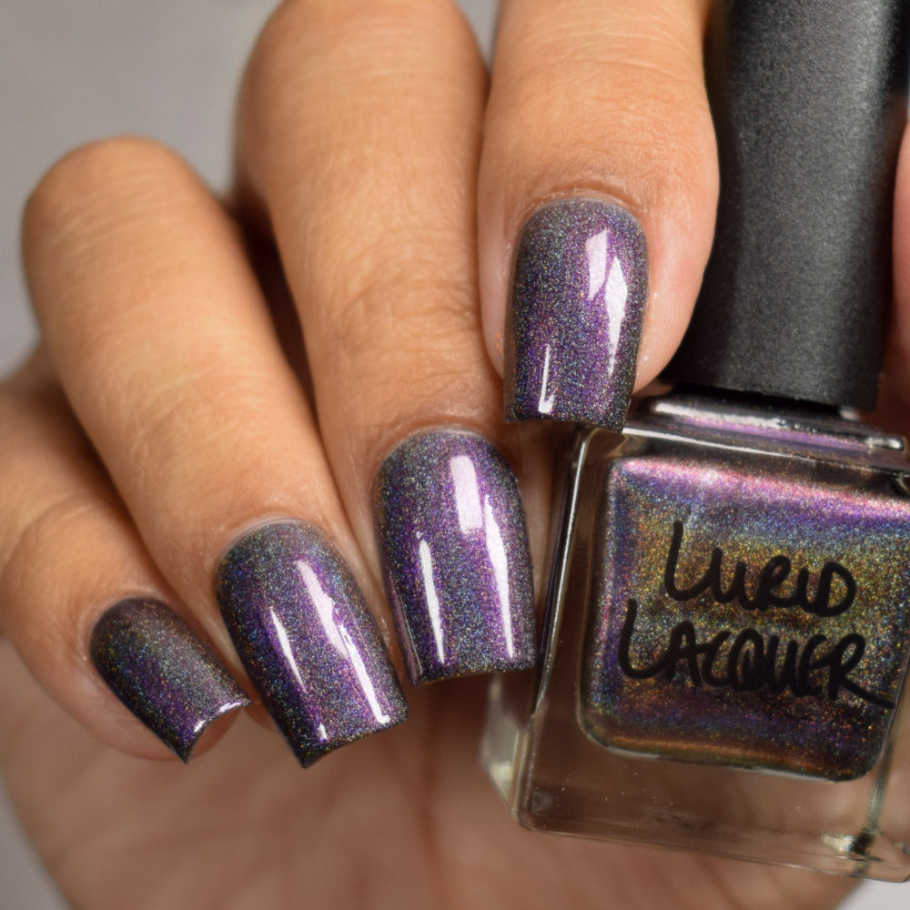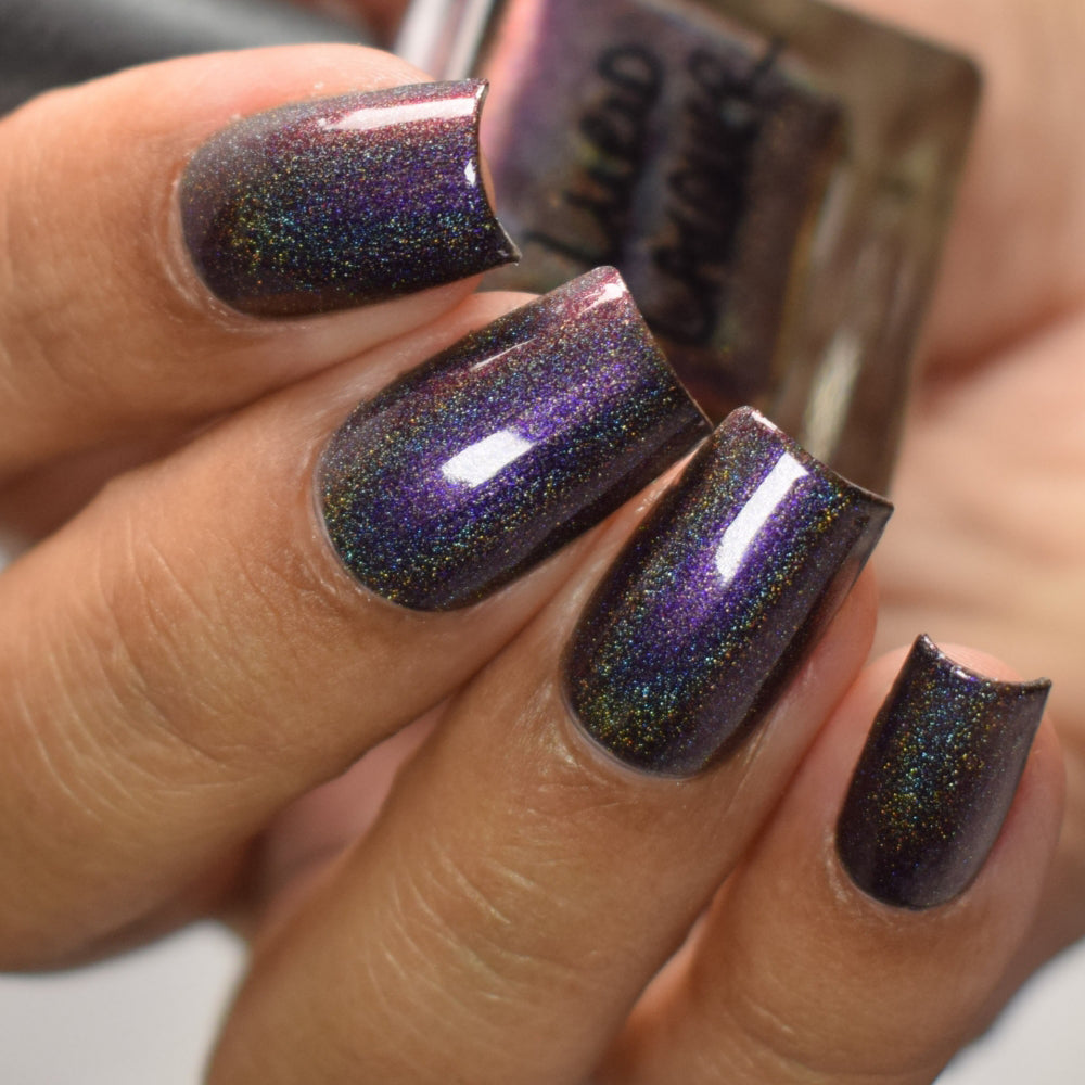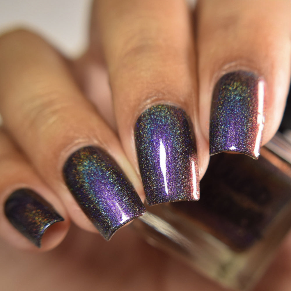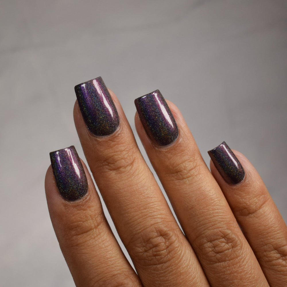 A black jelly base with linear holographic pigment and aurora shimmer that shifts from purple to pink to red. (On the nail, this polish has a deep charcoal gray appearance.)
