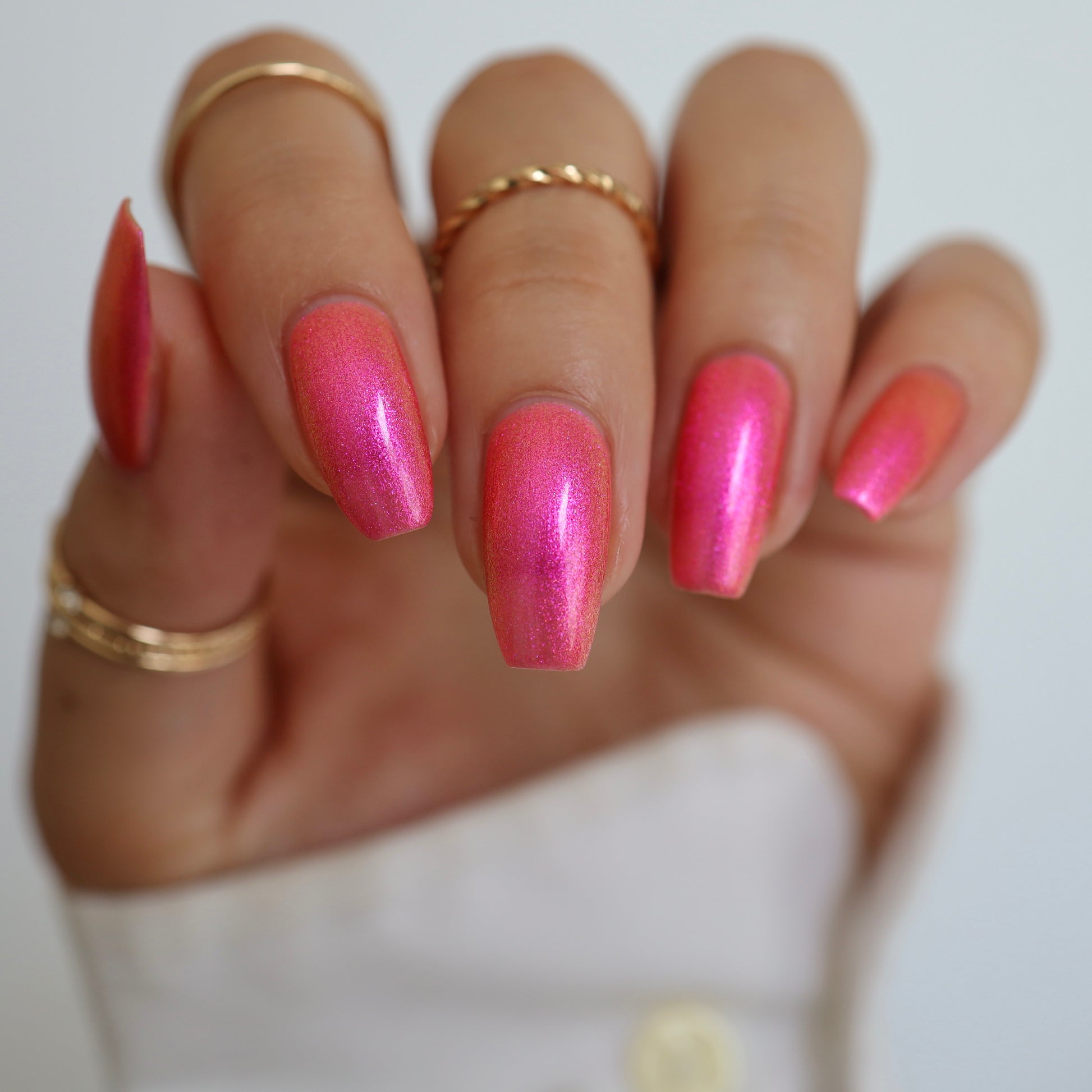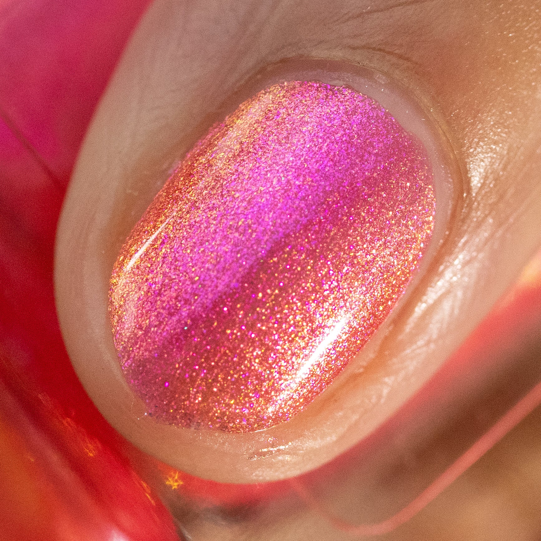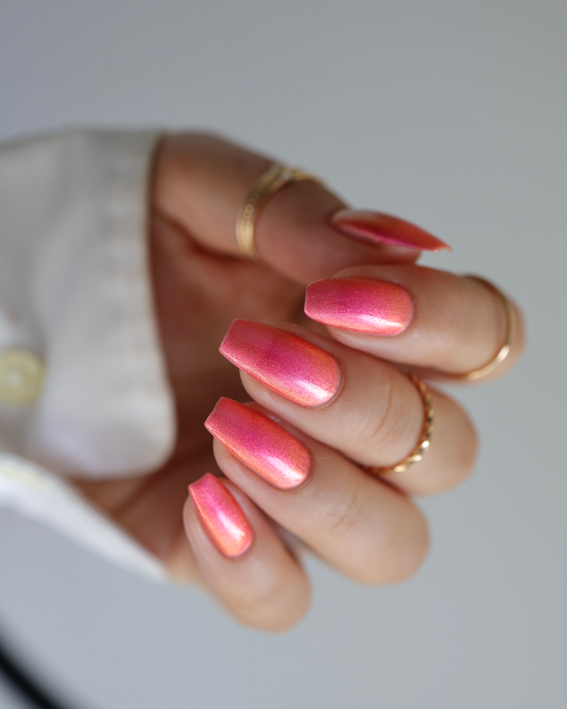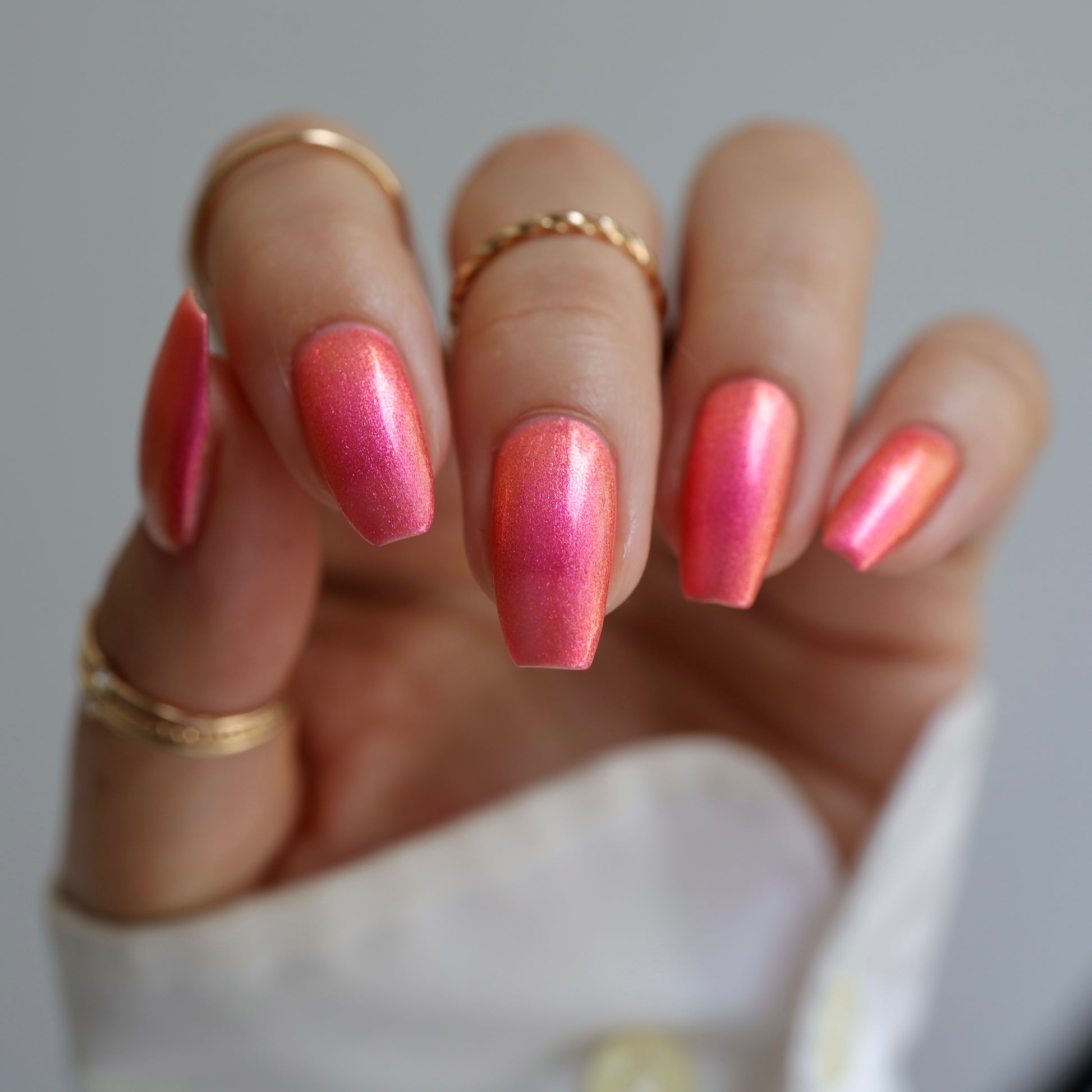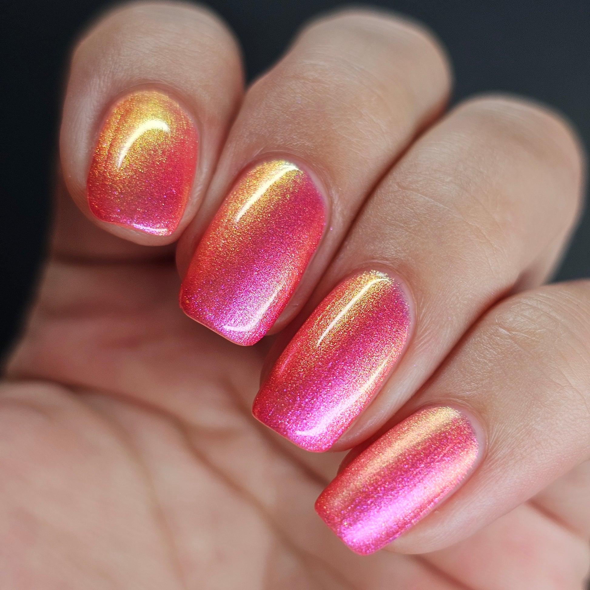 A coral jelly base with aurora shimmer that shifts from magenta to orange to gold to green