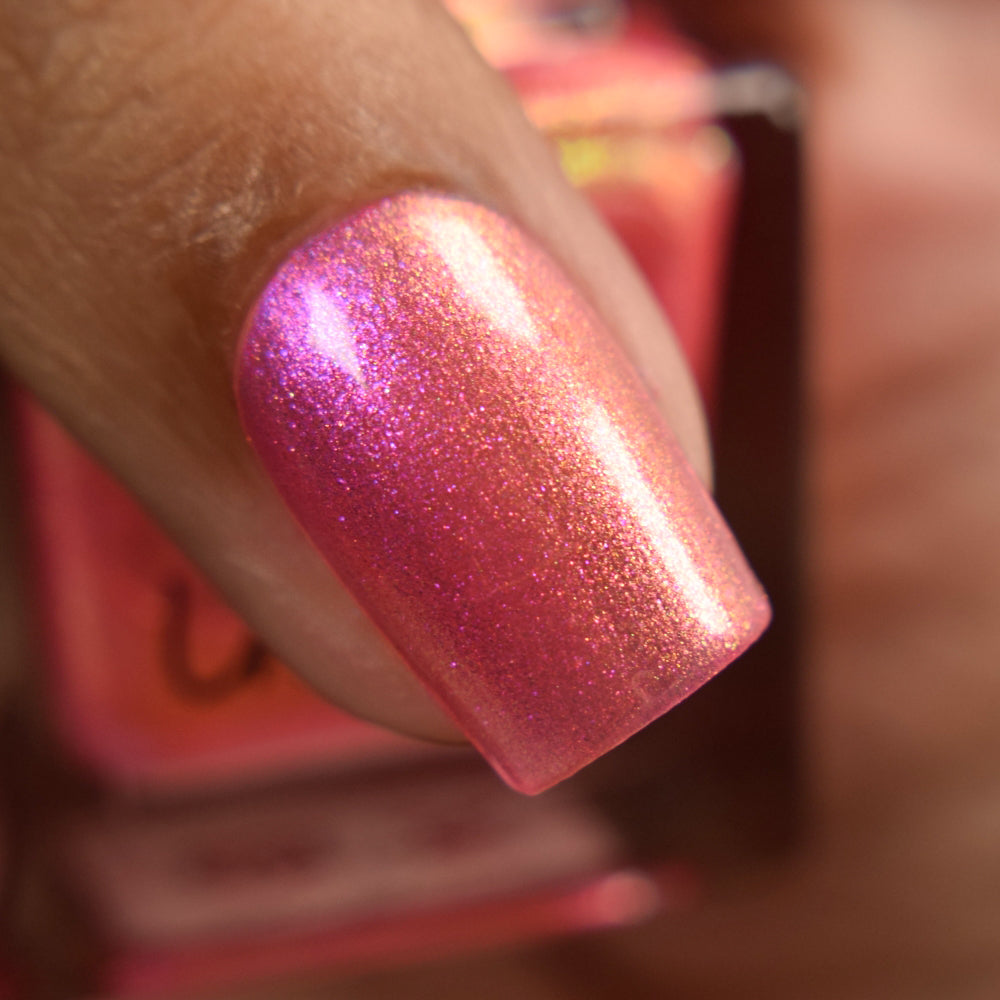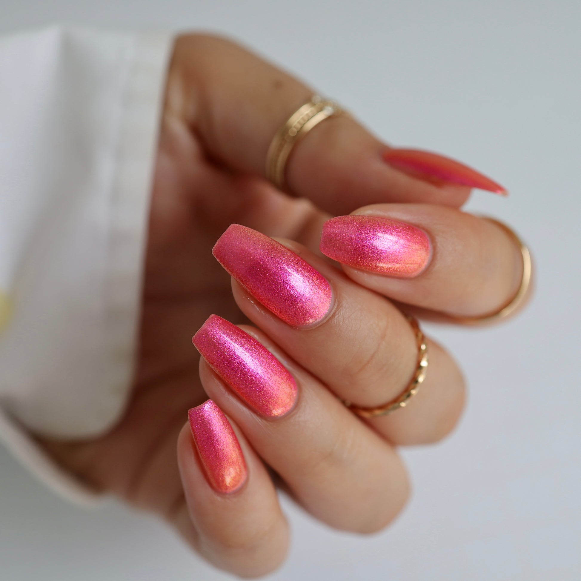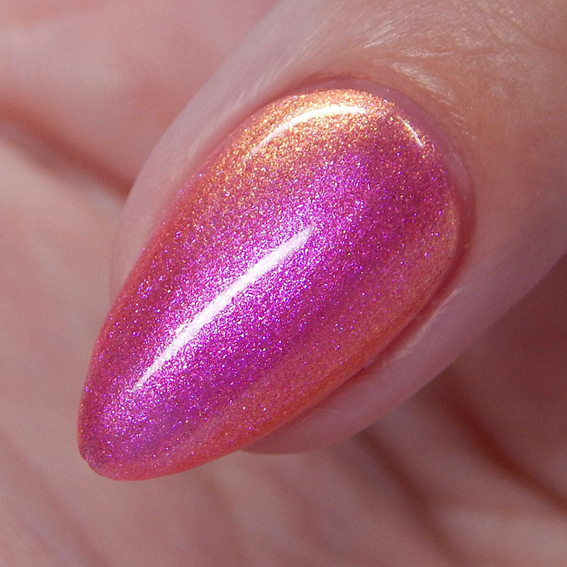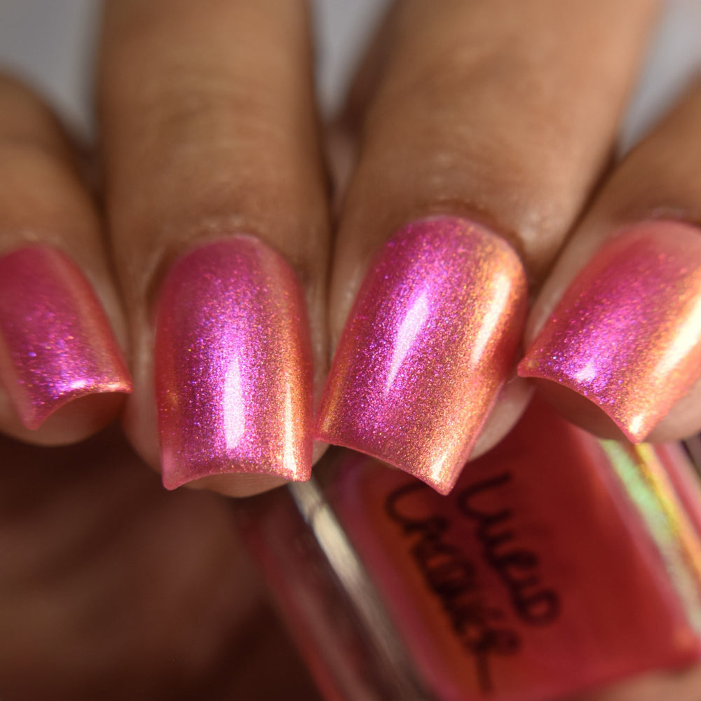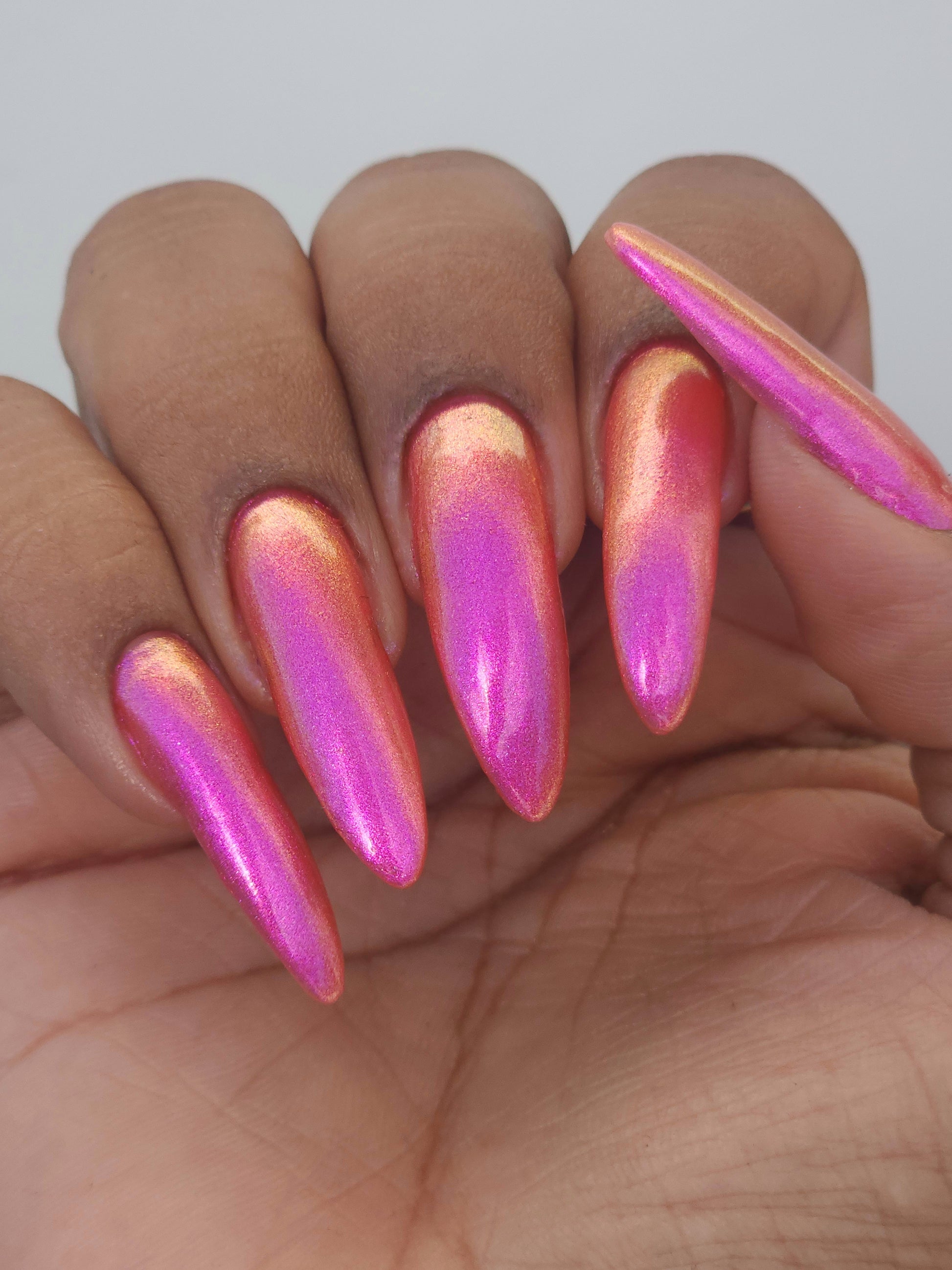 A coral jelly base with aurora shimmer that shifts from magenta to orange to gold to green