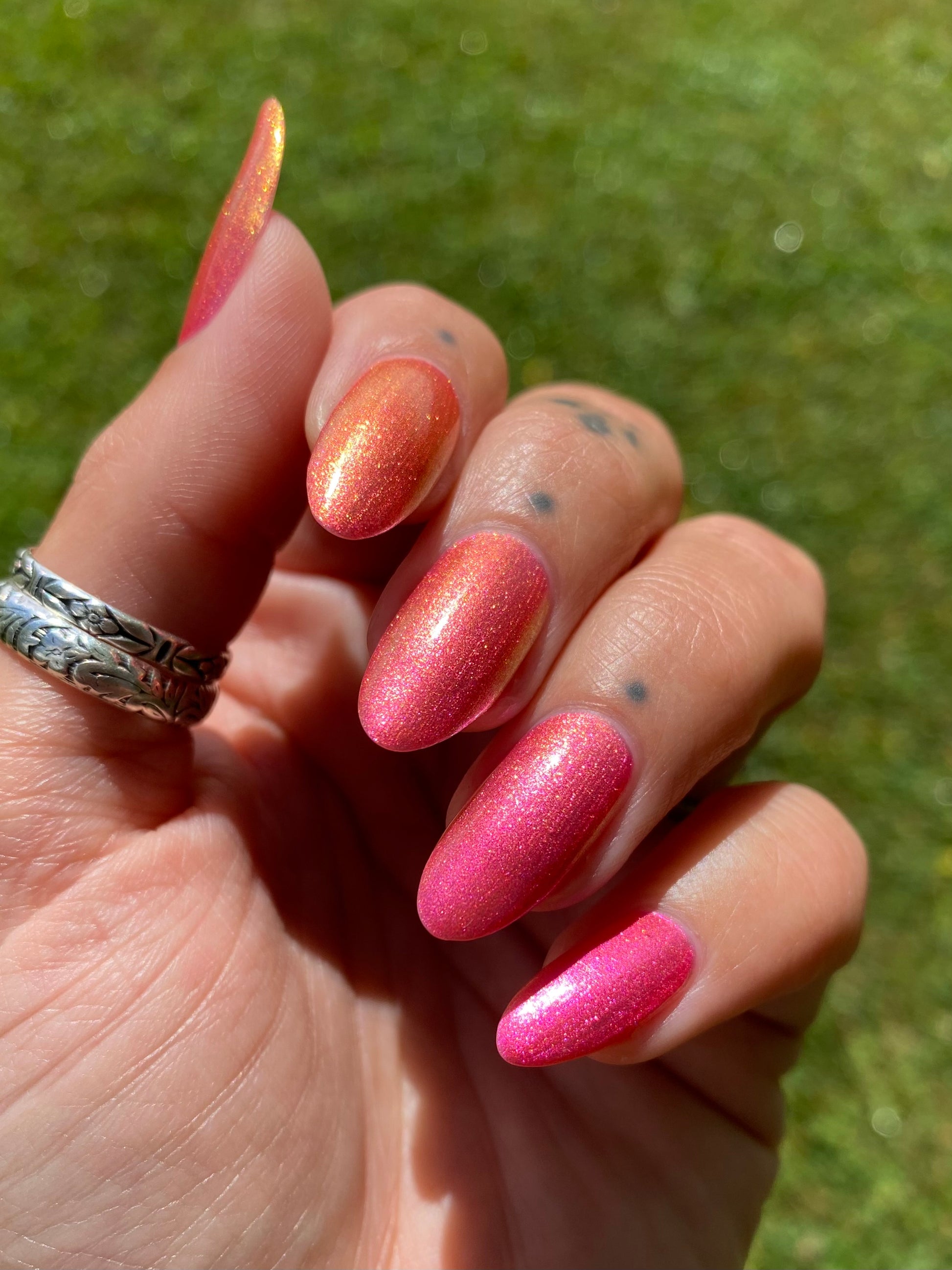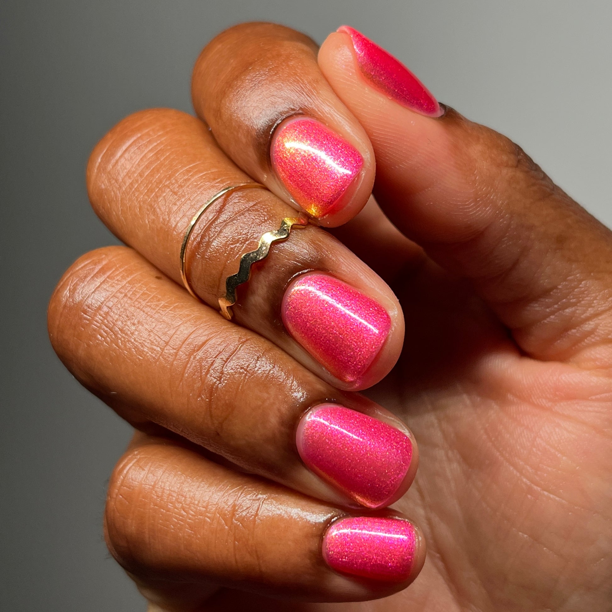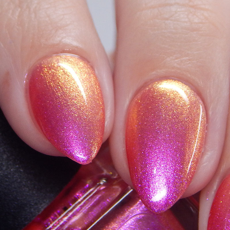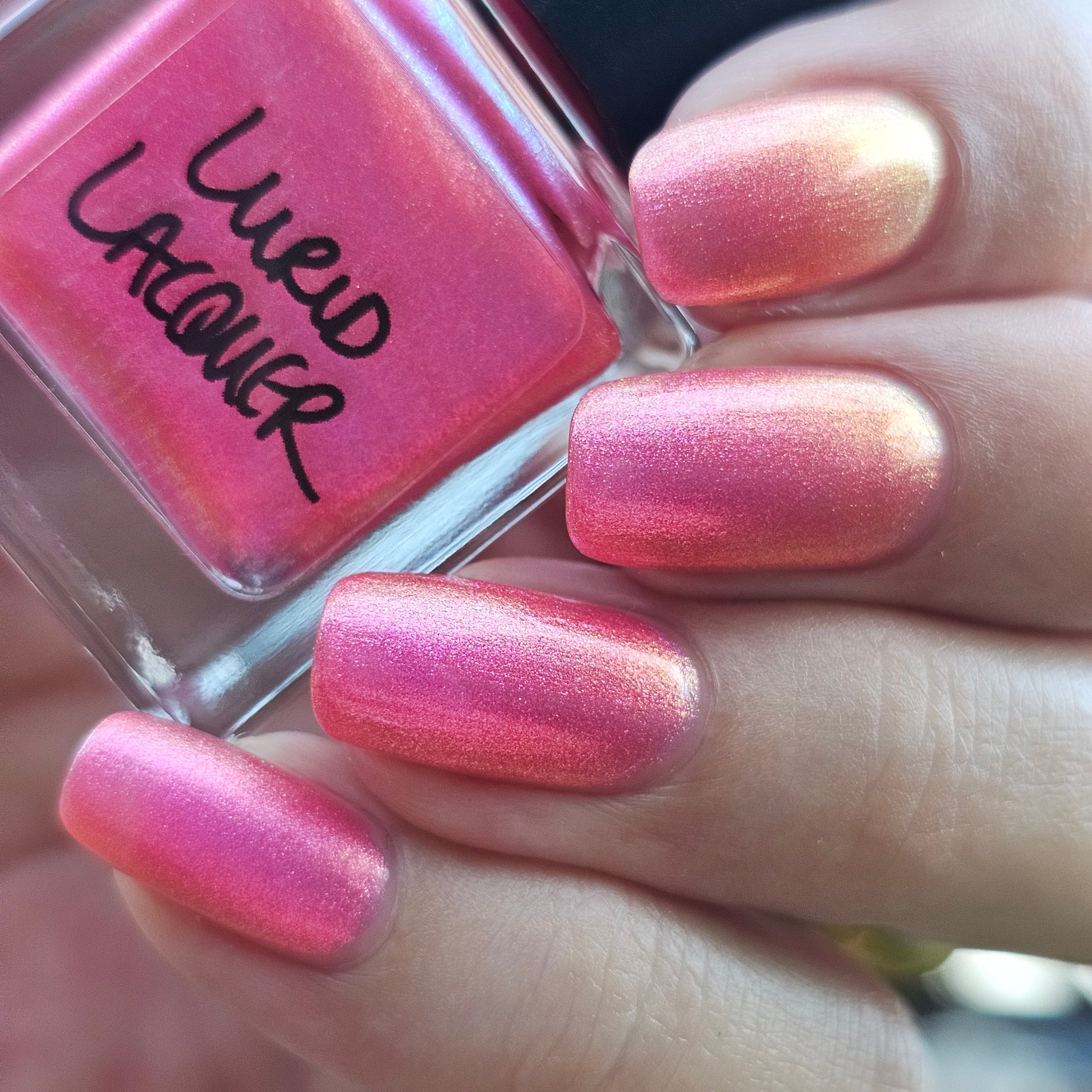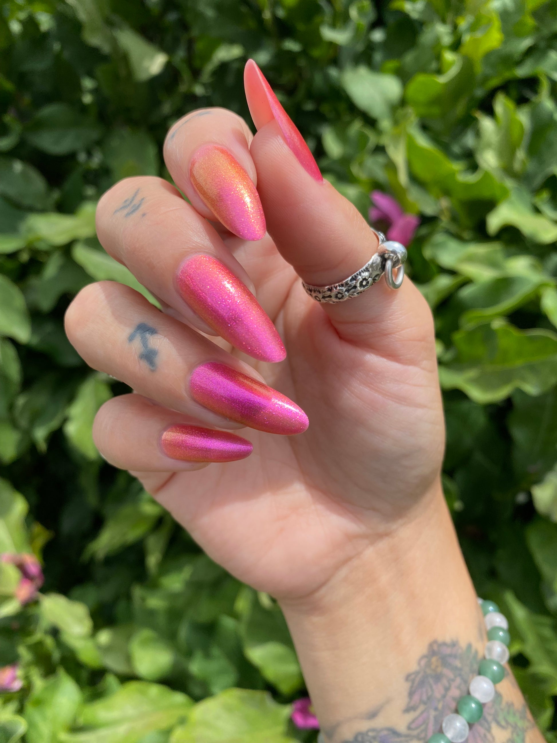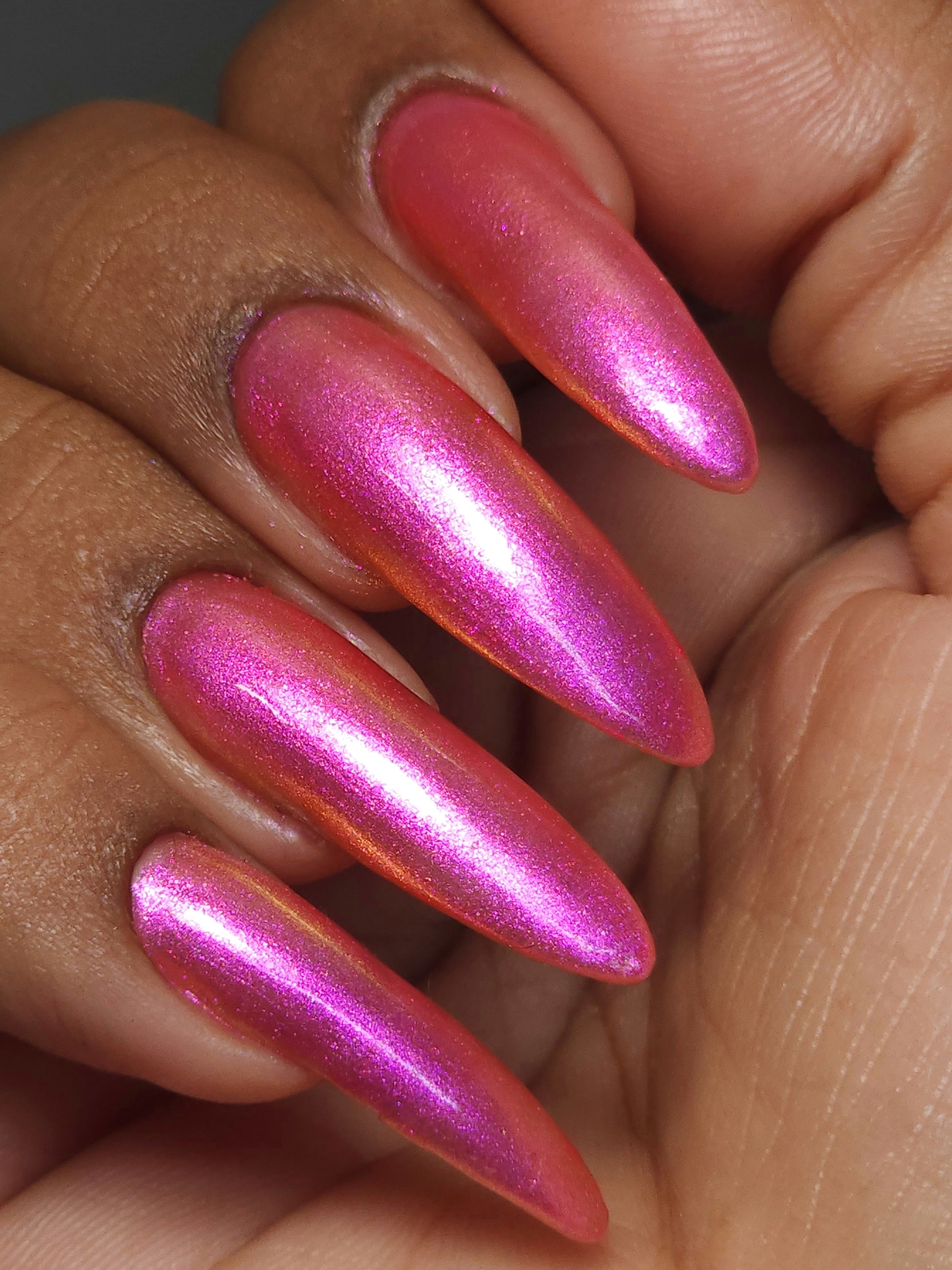A coral jelly base with aurora shimmer that shifts from magenta to orange to gold to green