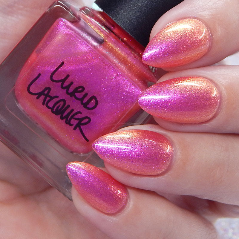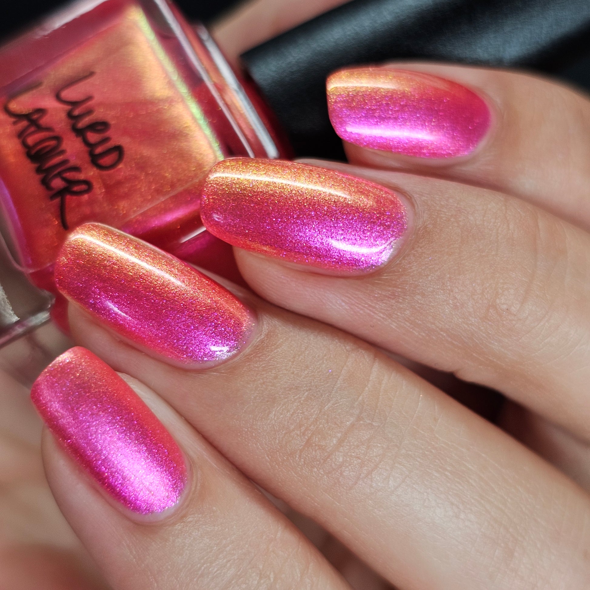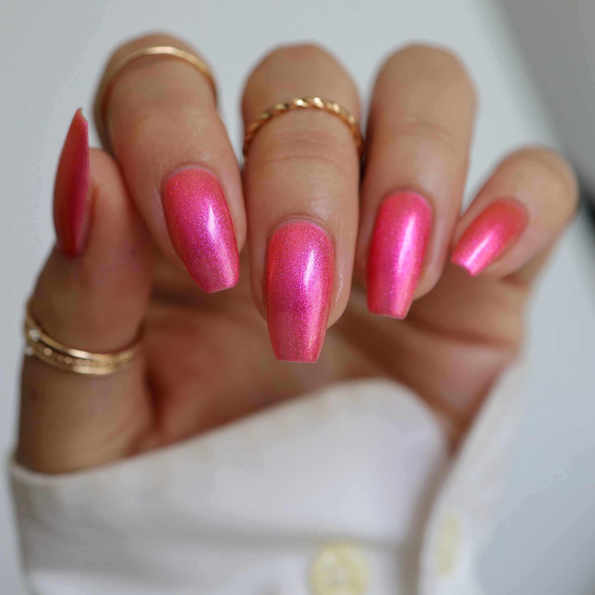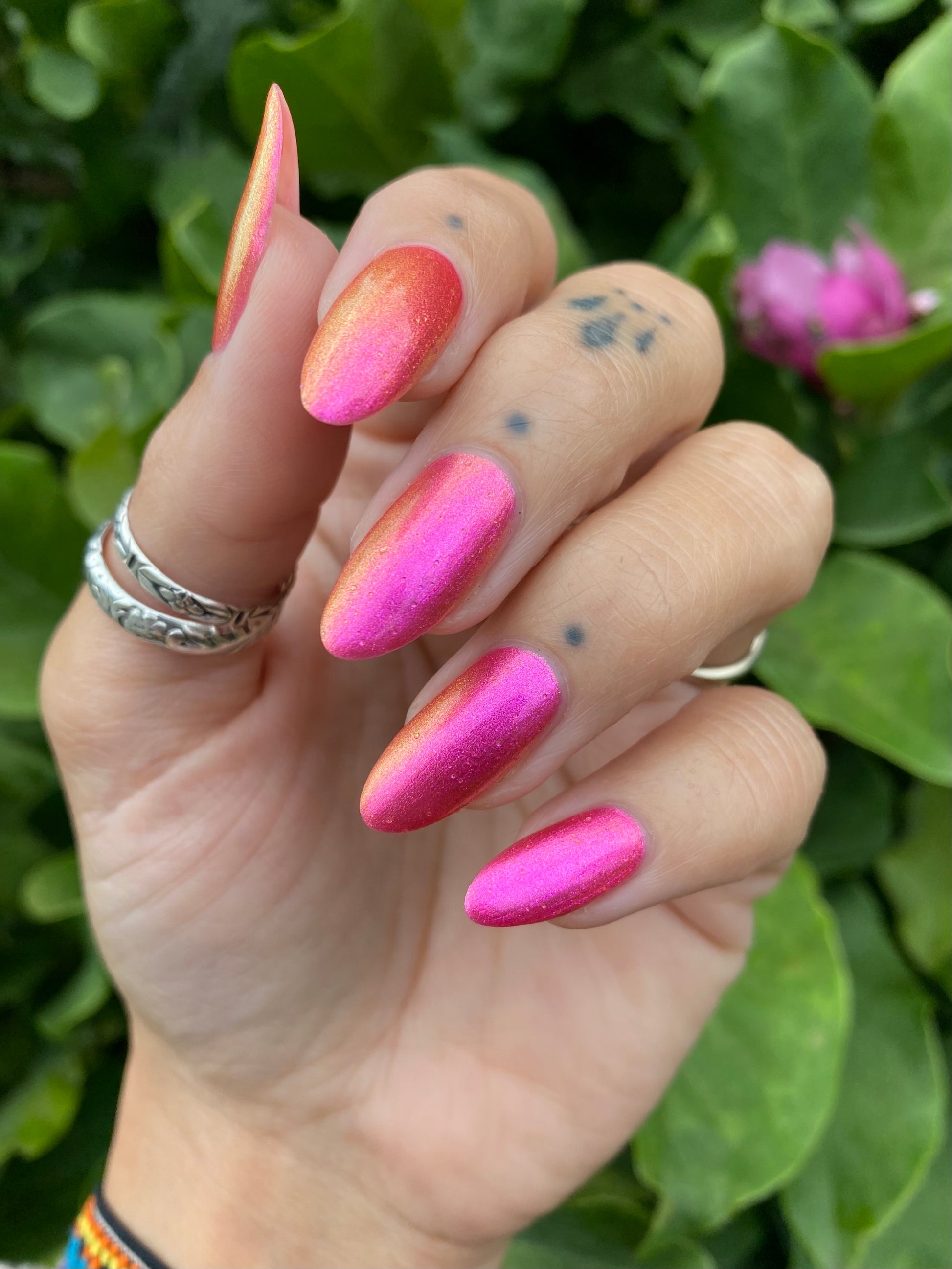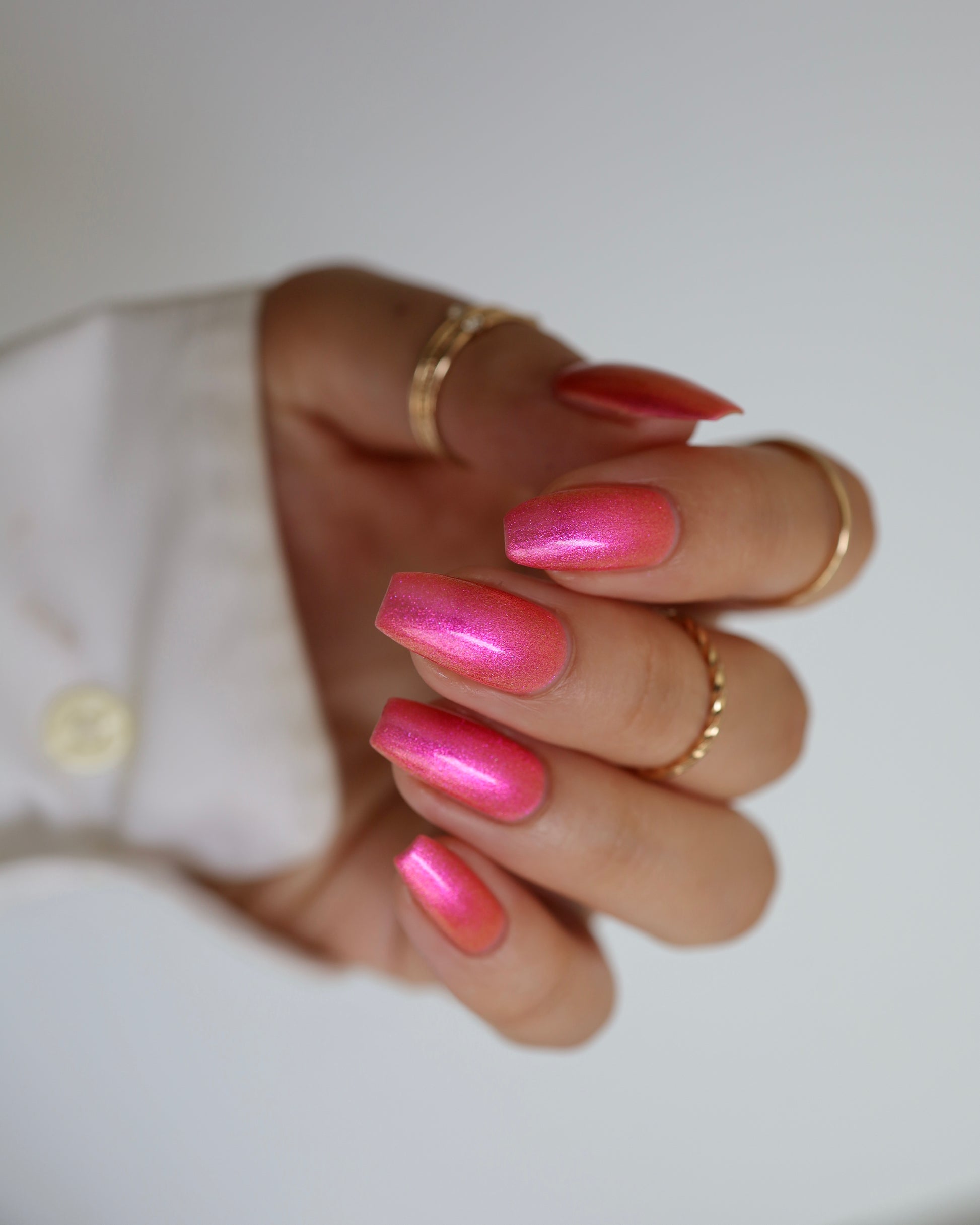 A coral jelly base with aurora shimmer that shifts from magenta to orange to gold to green