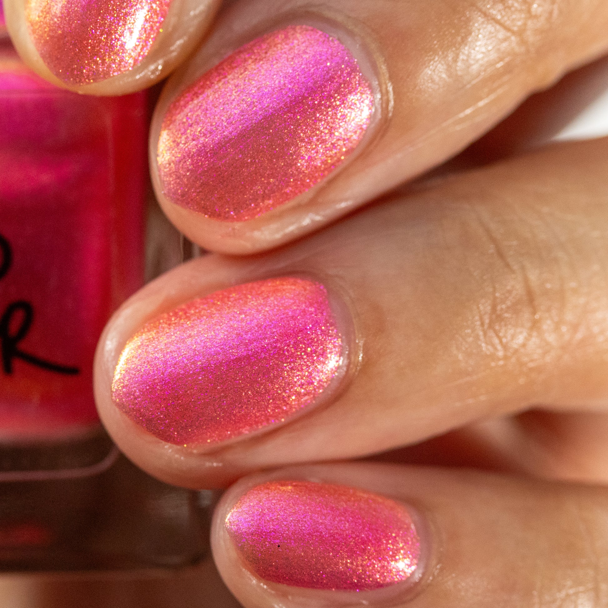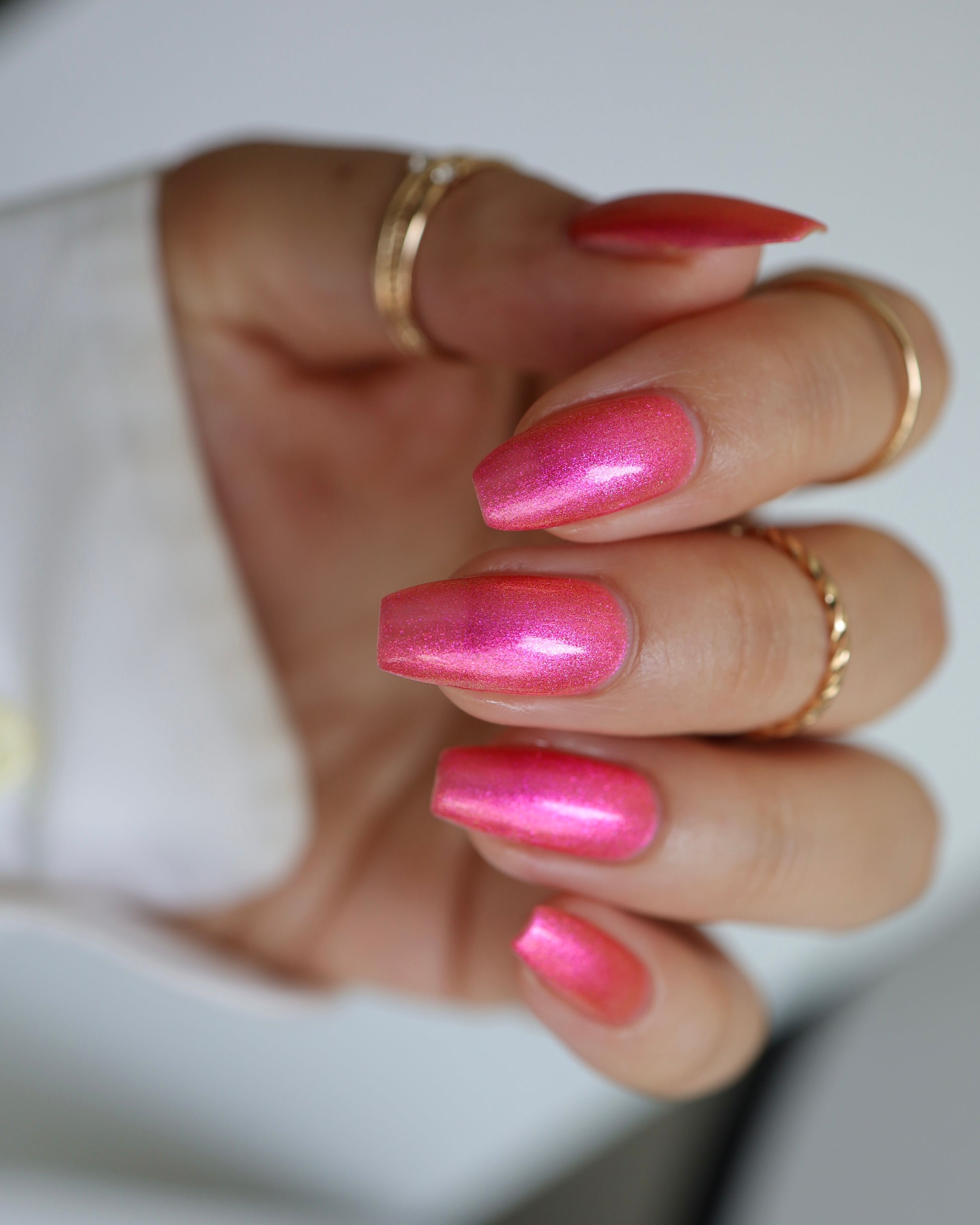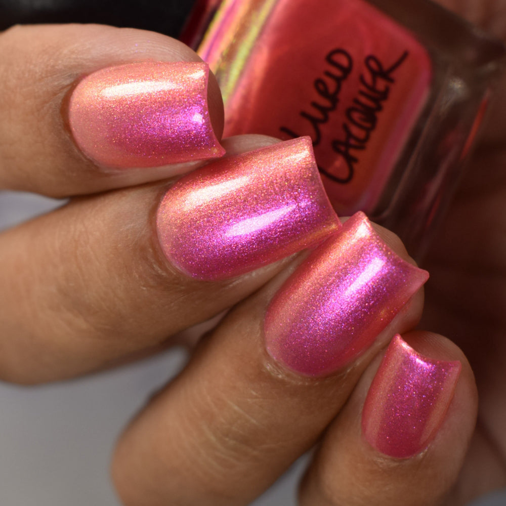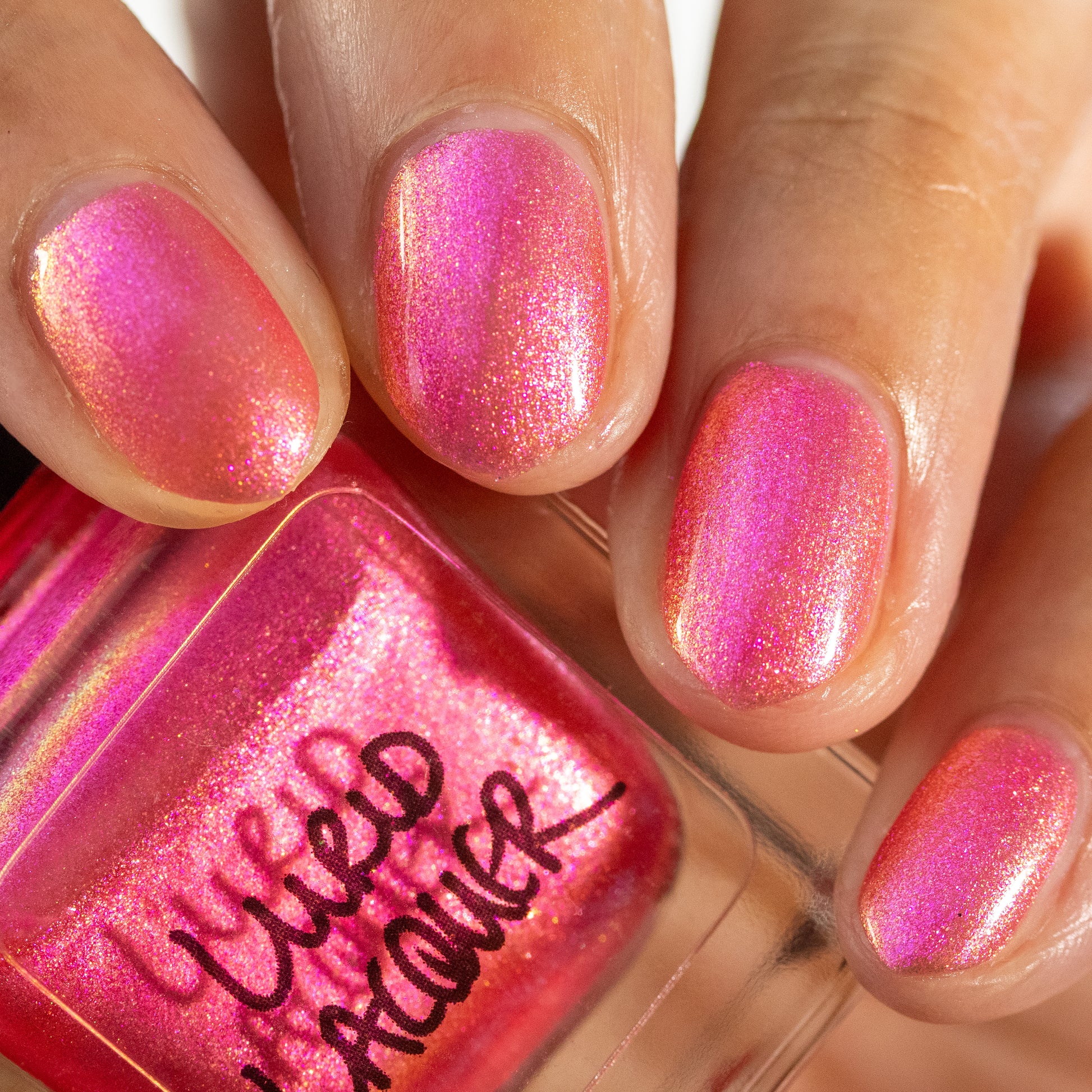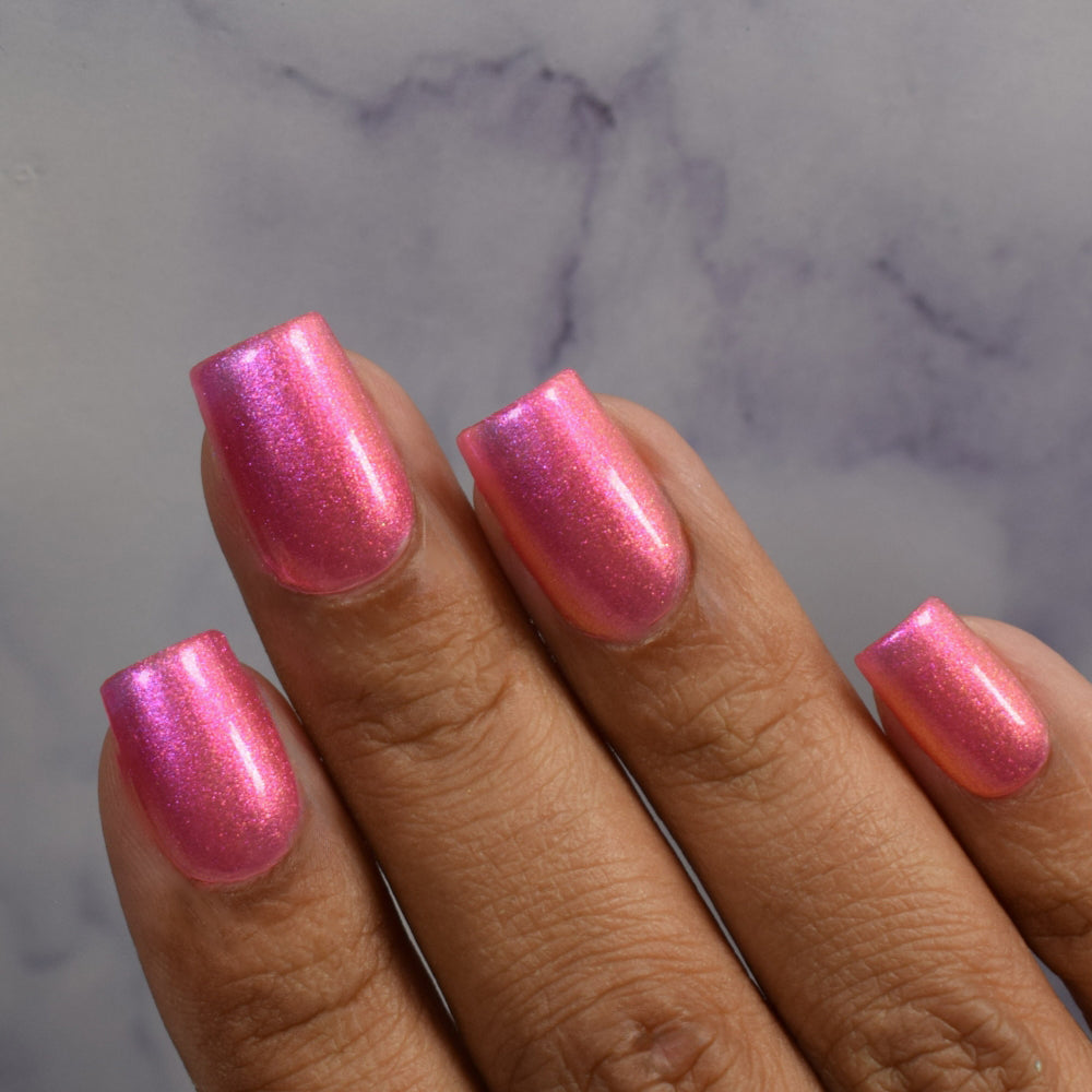 A coral jelly base with aurora shimmer that shifts from magenta to orange to gold to green