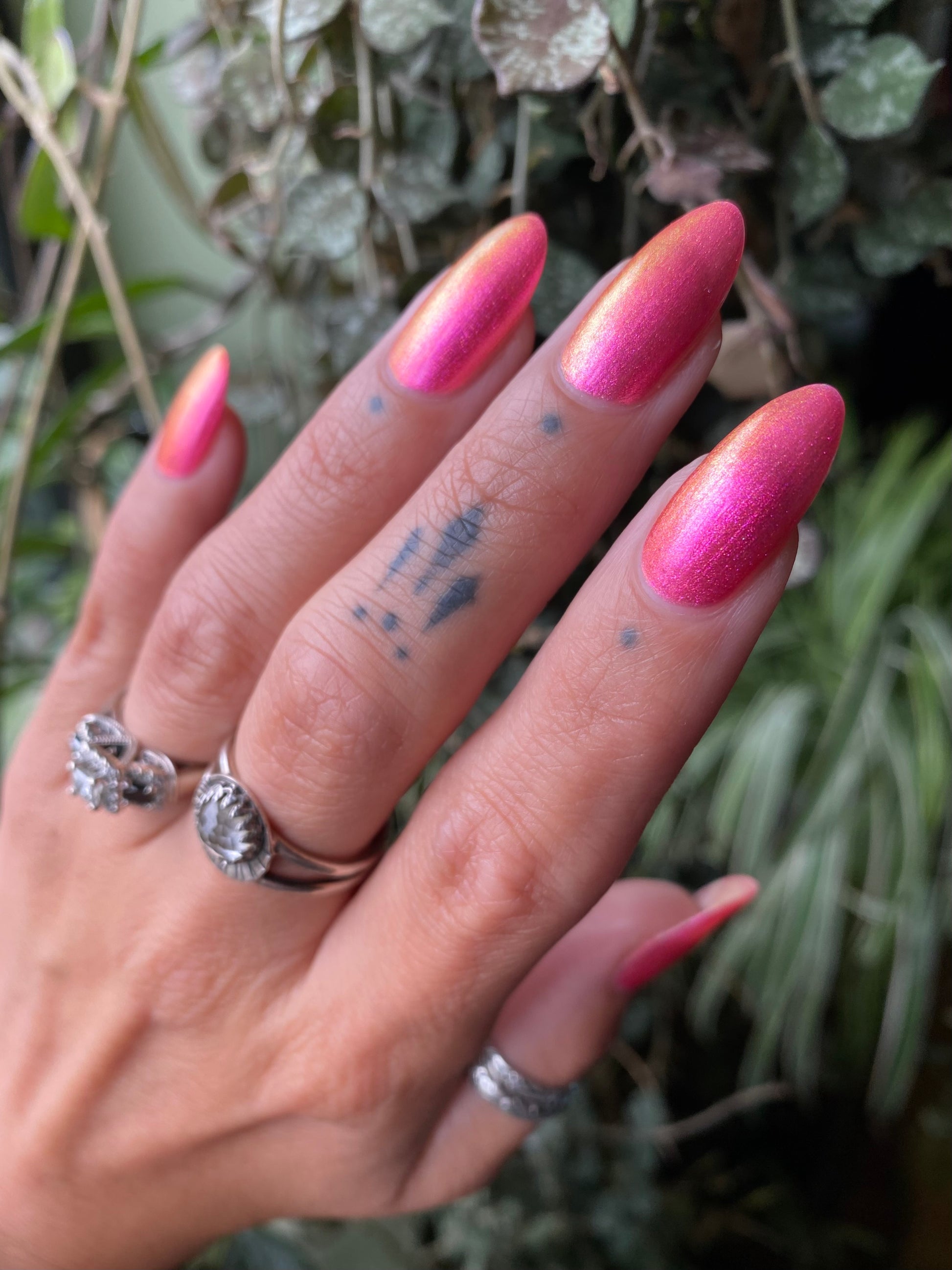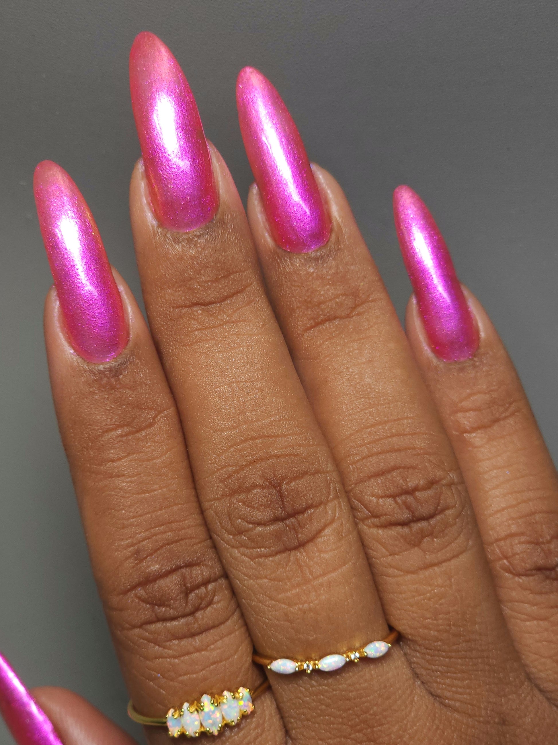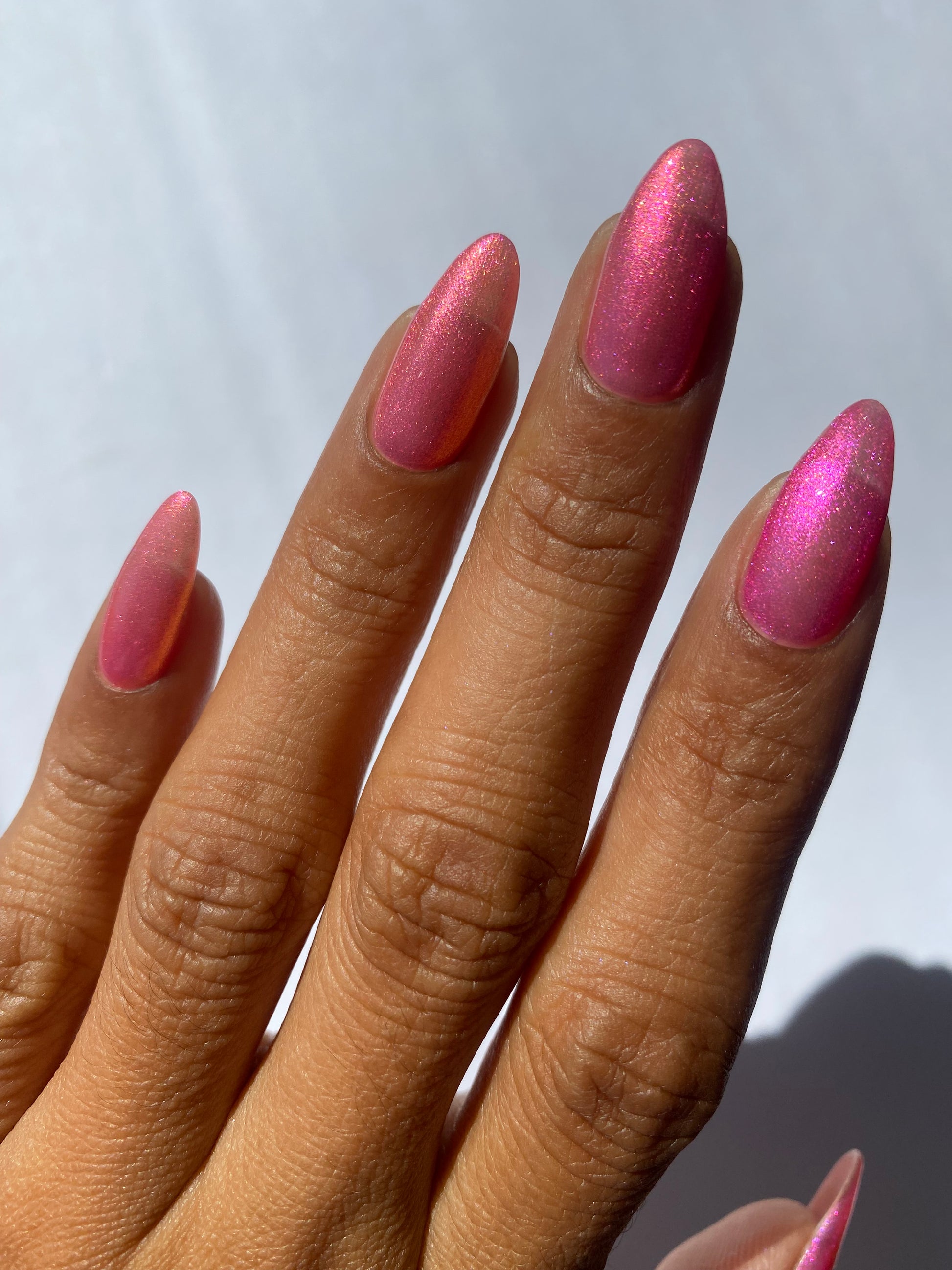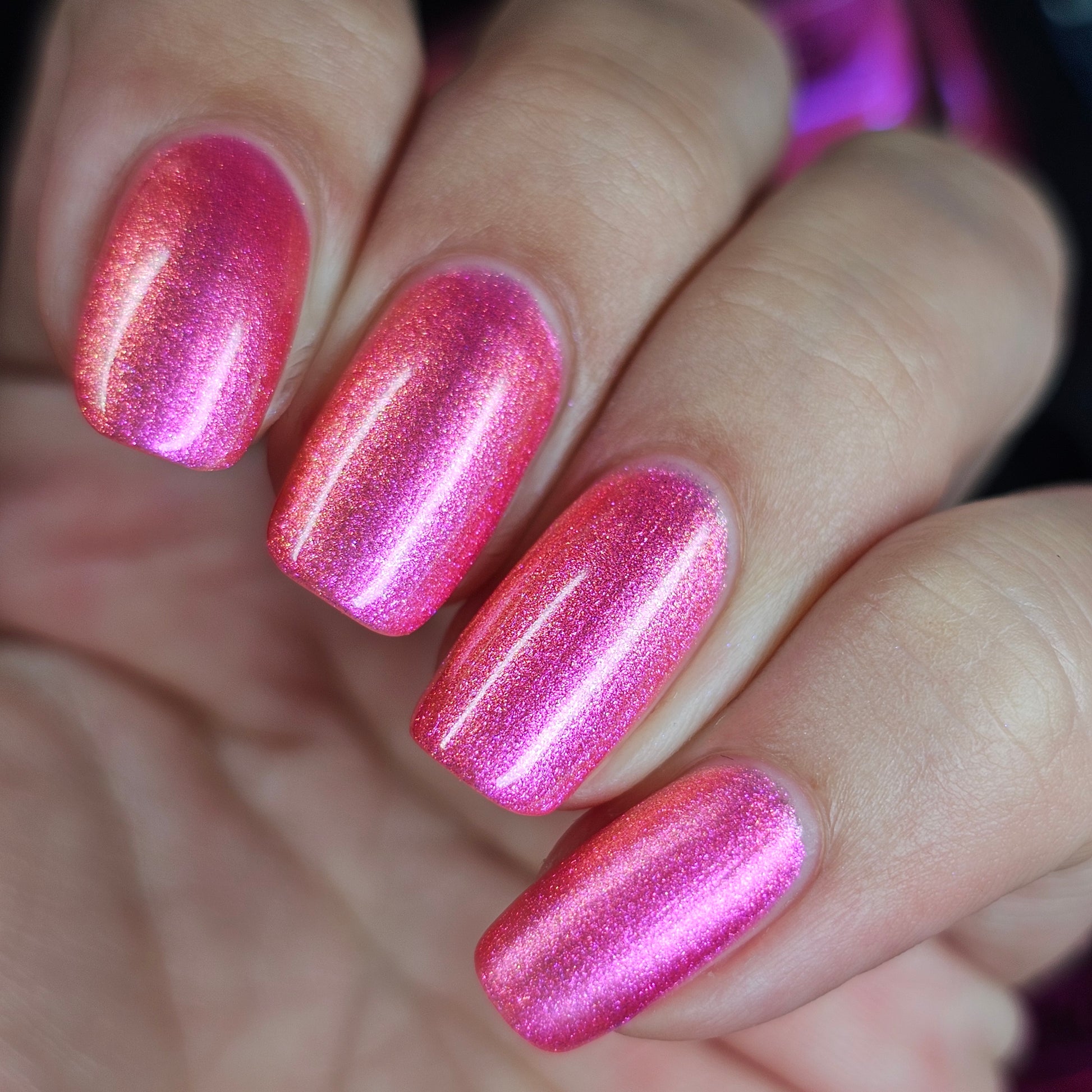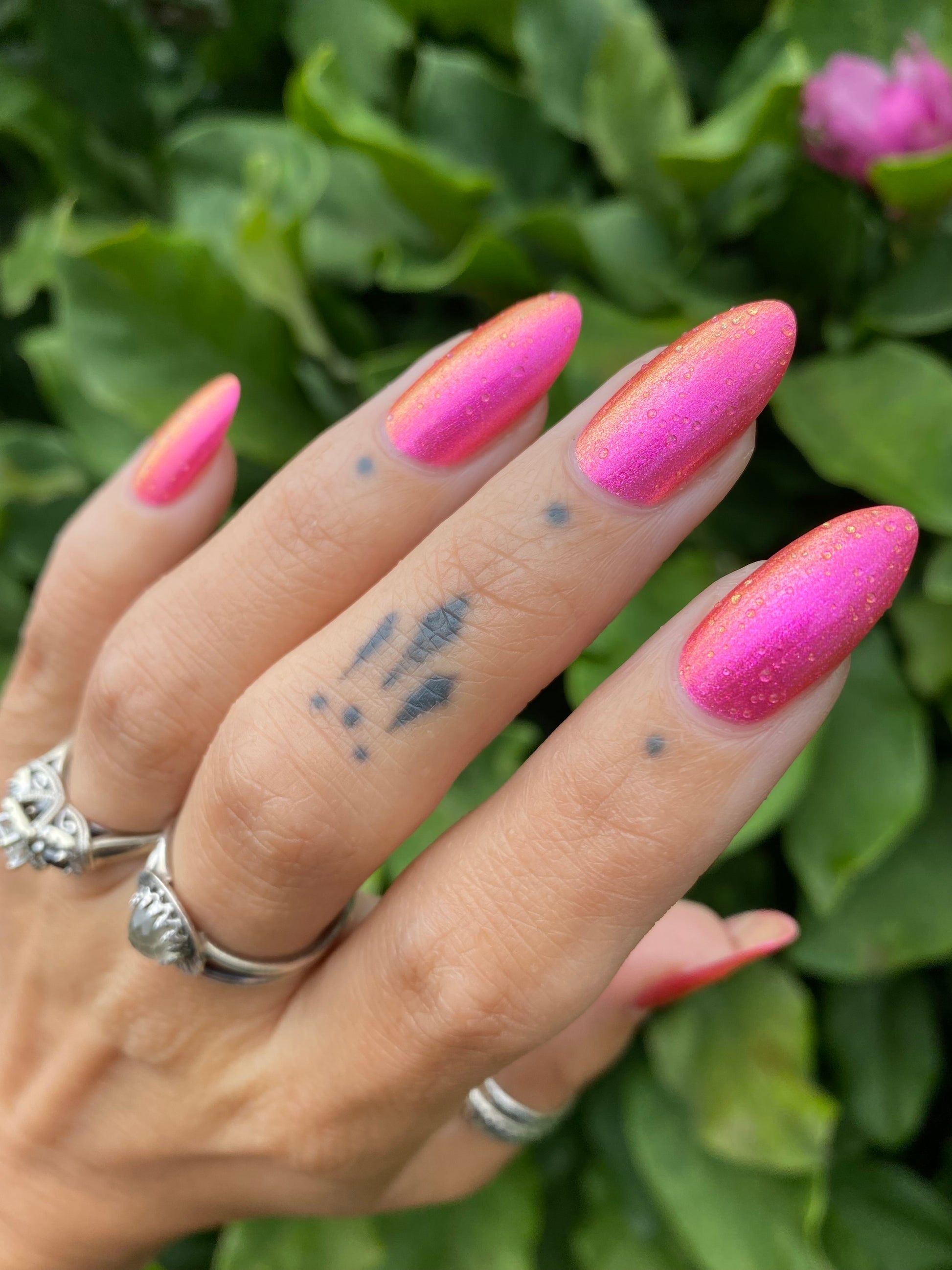 A coral jelly base with aurora shimmer that shifts from magenta to orange to gold to green